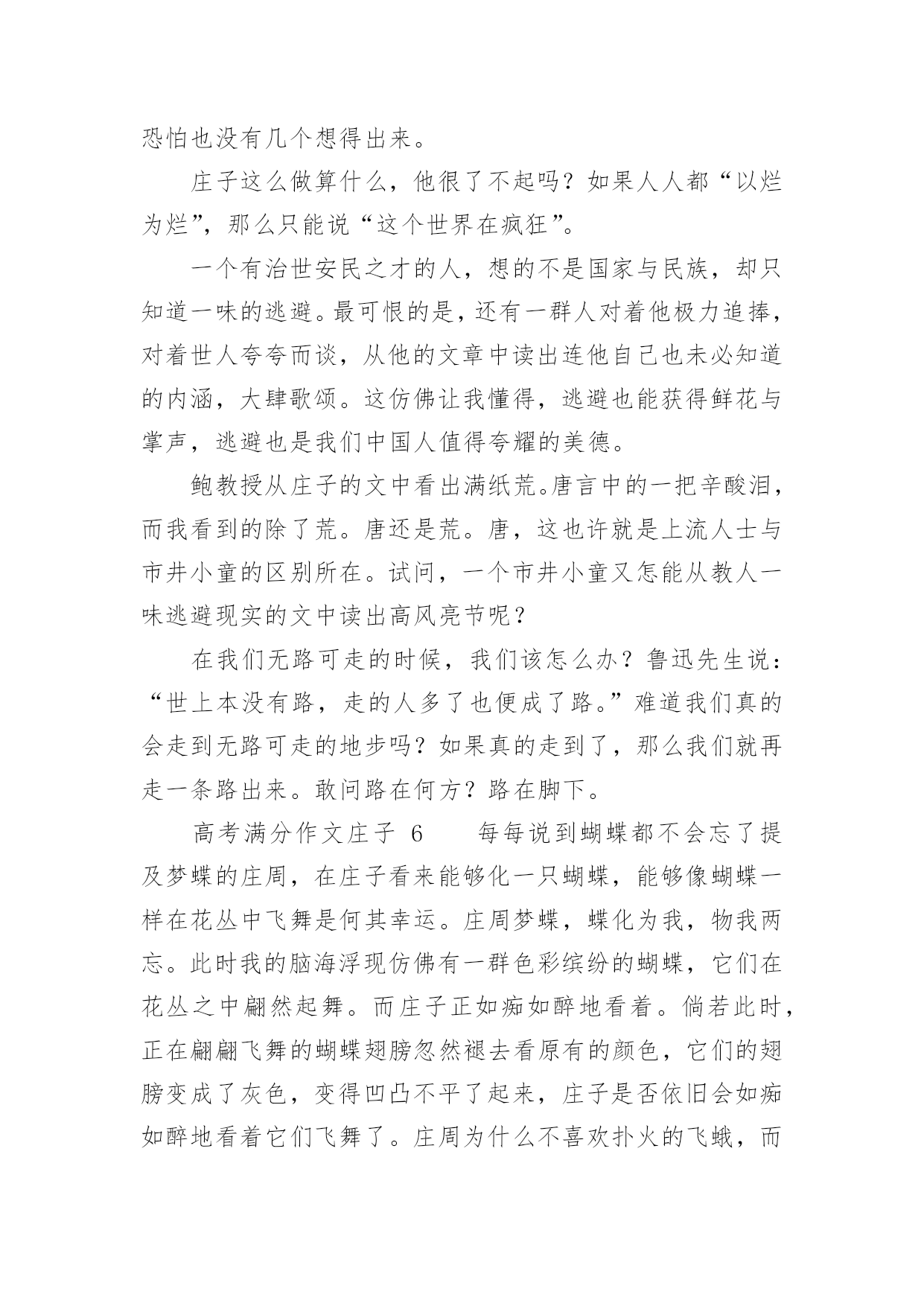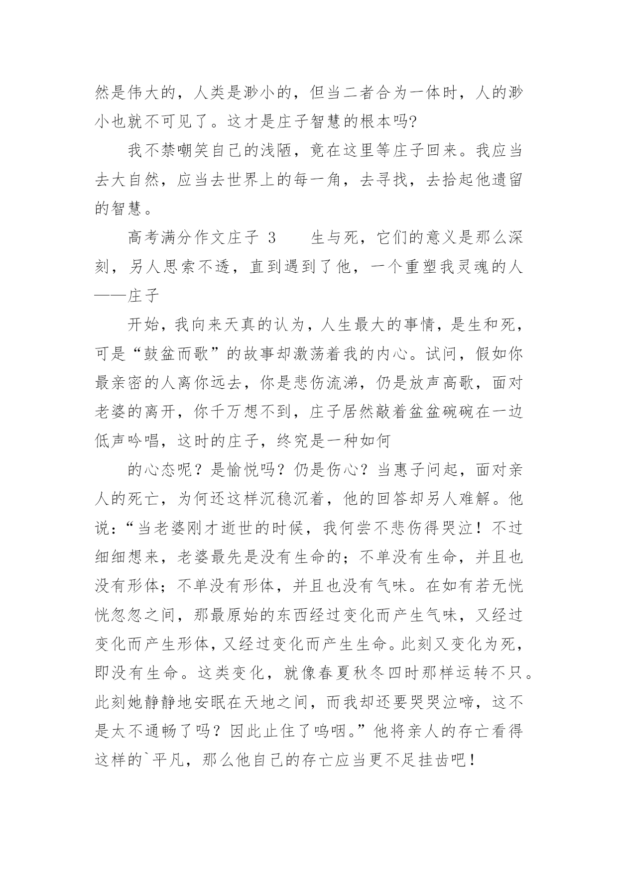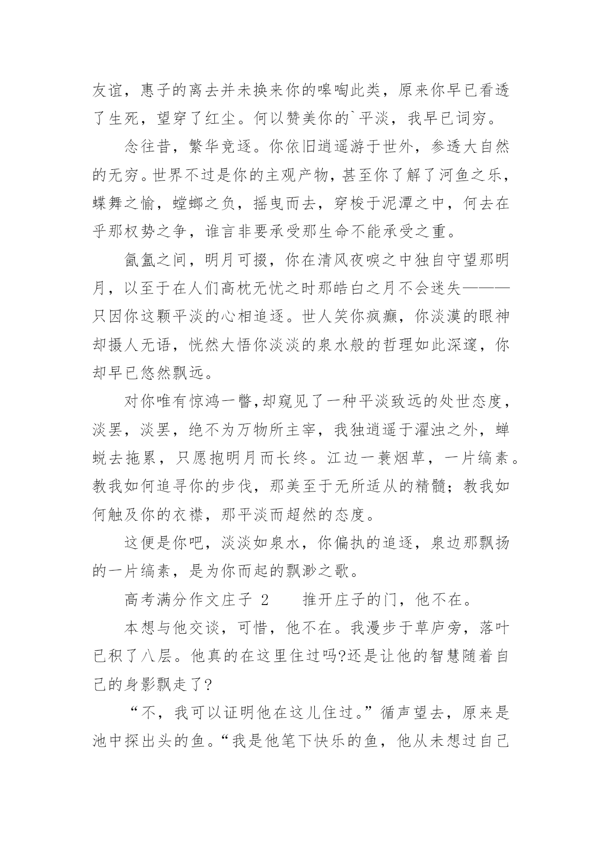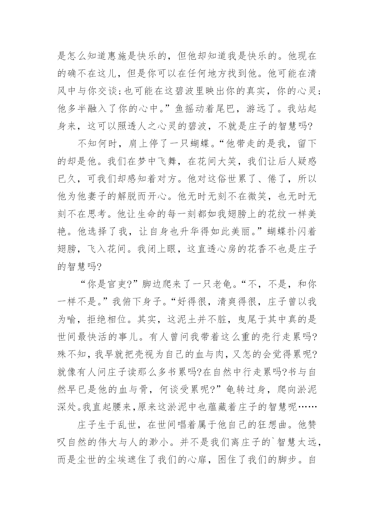 高考满分作文庄子高考满分作文庄子(通用35篇)在学习、工作乃至生活中,大家都写过作文,肯定对各类作文都很熟悉吧,借助作文人们可以实现文化交流的目的。作文的注意事项有许多,你确定会写吗?下面是小编整理的高考满分作文庄子,欢迎大家分享。高考满分作文庄子1时间的流逝,淡涤旧迹,仅留下微漠的平淡与悲哀。濮水之边,你翩然而去,仅留下楚使的瞠目与叹息。或喜甜甘之味,或爱亦苦亦甜的刺激,谁人如你———庄子,淡泊一切,与道合而为一,只偏执着那淡淡的清白。当一种美,美得让人无所适从,也只好手之舞之,足之蹈之;当一种平淡,淡得让人无从品味,也只好叹之惜之,赞之赏之。你甘于淡泊,乐于平淡,自得于平淡,只愿在梦中化蝶而逍遥,只愿随那盘旋而上的鹏者浮游于天地,不愿累于国事,不愿牵绊于尘世,你就如同那甘之如饴的淡淡而香的矿泉之水,给人以绝境逢生,给人以平静致远,给人以超脱外物,我想要触及你的衣襟,却在指尖碰触了清而澈,凉而柔的泉水,原是这般滋味。无奈我摆脱不了那甜的诱惑,忘却不了那或苦或甜的香醇,只好在无路可走之时,望见你那平静如水的双眸,澄澈至极,悠悠远远,望断天涯路。我以为你是孤独的,你却告诉我“君子之交淡如水”的友谊,惠子的离去并未换来你的嗥啕此类,原来你早已看透了生死,望穿了红尘。何以赞美你的`平淡,我早已词穷。念往昔,繁华竞逐。你依旧逍遥游于世外,参透大自然的无穷。世界不过是你的主观产物,甚至你了解了河鱼之乐,蝶舞之愉,螳螂之负,摇曳而去,穿梭于泥潭之中,何去在乎那权势之争,谁言非要承受那生命不能承受之重。氤氲之间,明月可掇,你在清风夜唳之中独自守望那明月,以至于在人们高枕无忧之时那皓白之月不会迷失———只因你这颗平淡的心相追逐。世人笑你疯癫,你淡漠的眼神却摄人无语,恍然大悟你淡淡的泉水般的哲理如此深邃,你却早已悠然飘远。对你唯有惊鸿一瞥,却窥见了一种平淡致远的处世态度,淡罢,淡罢,绝不为万物所主宰,我独逍遥于濯浊之外,蝉蜕去拖累,只愿抱明月而长终。江边一蓑烟草,一片缟素。教我如何追寻你的步伐,那美至于无所适从的精髓;教我如何触及你的衣襟,那平淡而超然的态度。这便是你吧,淡淡如泉水,你偏执的追逐,泉边那飘扬的一片缟素,是为你而起的飘渺之歌。高考满分作文庄子2推开庄子的门,他不在。本想与他交谈,可惜,他不在。我漫步于草庐旁,落叶已积了八层。他真的在这里住过吗?还是让他的智慧随着自己的身影飘走了?“不,我可以证明他在这儿住过。”循声望去,原来是池中探出头的鱼。“我是他笔下快乐的鱼,他从未想过自己是怎么知道惠施是快乐的,但他却知道我是快乐的。他现在的确不在这儿,但是你可以在任何地方找到他。他可能在清风中与你交谈;也可能在这碧波里映出你的真实,你的心灵;他多半融入了你的心中。”鱼摇动着尾巴,游远了。我站起身来,这可以照透人之心灵的碧波,不就是庄子的智慧吗?不知何时,肩上停了一只蝴蝶。“他带走的是我,留下的却是他。我们在梦中飞舞,在花间大笑,我们让后人疑惑已久,可我们却感知着对方。他对这俗世累了、倦了,所以他为他妻子的解脱而开心。他无时无刻不在微笑,也无时无刻不在思考。他让生命的每一刻都如我翅膀上的花纹一样美艳。他选择了我,让自身也升华得如此美丽。”蝴蝶扑闪着翅膀,飞入花间。我闭上眼,这直透心房的花香不也是庄子的智慧吗?“你是官吏?”脚边爬来了一只老龟。“不,不是,和你一样不是。”我俯下身子。“好得很,清爽得很,庄子曾以我为喻,拒绝相位。其实,这泥土并不脏,曳尾于其中真的是世间最快活的事儿。有人曾问我带着这么重的壳行走累吗?殊不知,我早就把壳视为自己的血与肉,又怎的会觉得累呢?就像有人问庄子读那么多书累吗?在自然中行走累吗?书与自然早已是他的血与骨,何谈受累呢?”龟转过身,爬向淤泥深处。我直起腰来,原来这淤泥中也蕴藏着庄子的智慧呢……庄子生于乱世,在世间唱着属于他自己的狂想曲。他赞叹自然的伟大与人的渺小。并不是我们离庄子的`智慧太远,而是尘世的尘埃遮住了我们的心扉,困住了我们的脚步。自然是伟大的,人类是渺小的,但当二者合为一体时,人的渺小也就不可见了。这才是庄子智慧的根本吗?我不禁嘲笑自己的浅陋,竟在这里等庄子回来。我应当去大自然,应当去世界上的每一角,去寻找,去拾起他遗留的智慧。高考满分作文庄子3生与死,它们的意义是那么深刻,另人思索不透,直到遇到了他,一个重塑我灵魂的人——庄子开始,我向来天真的认为,人生最大的事情,是生和死,可是“鼓盆而歌”的故事却激荡着我的内心。试问,假如你最亲密的人离你远去,你是悲伤流涕,仍是放声高歌,面对老婆的离开,你千万想不到,庄子居然敲着盆盆碗碗在一边低声吟唱,这时的庄子,终究是一种如何的心态呢?是愉悦吗?仍是伤心?当惠子问起,面对亲人的死亡,为何还这样沉稳沉着,他的回答却另人难解。他说:“当老婆刚才逝世的时候,我何尝