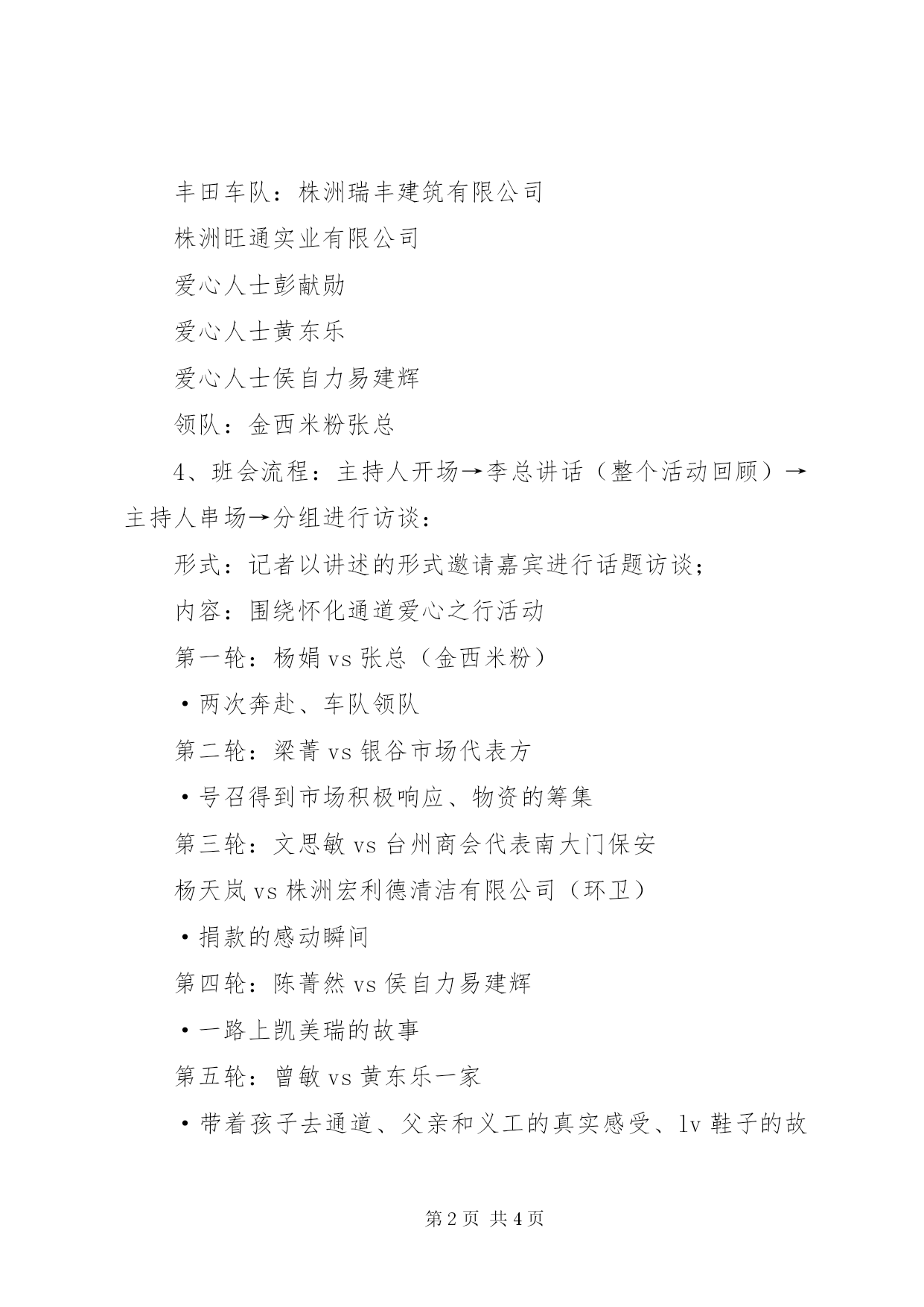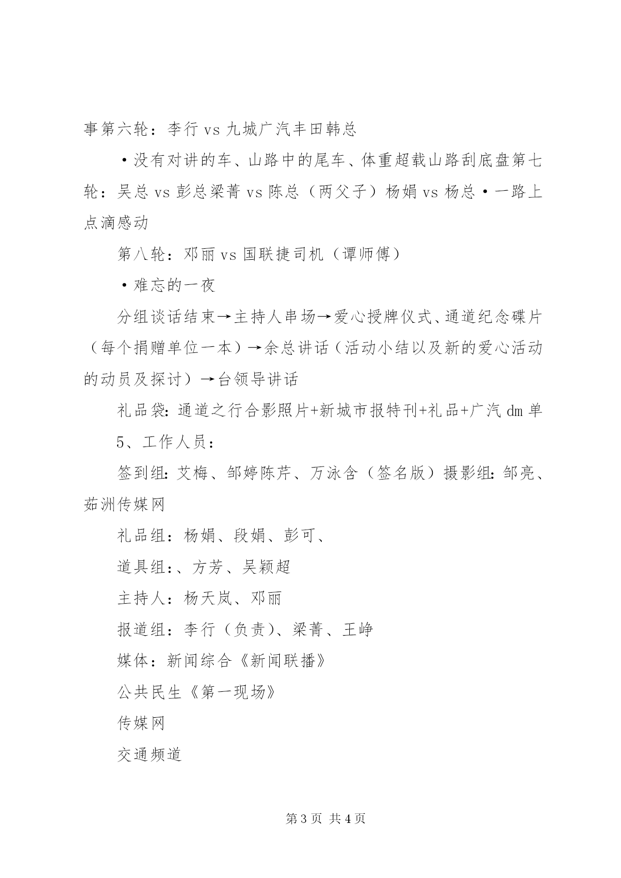 第PAGE\*Arabic\*MERGEFORMAT4页共NUMPAGES\*MERGEFORMAT4页爱心哨活动方案株洲有爱情暖侗寨——怀化通道爱心班会活动总策划:余总指挥:李总、吴总执行策划:邓丽总协调:文思敏具体活动方案:1、时间:3月12日15:00(预计一个半小时)2、地点:艾华酒窖3、参与人员:市委宣传部领导台领导经视主持人:马可株洲红十字会芦淞市场管理局九城广汽丰田XX市义工联株洲传媒网安利公司市场方:银谷服饰商业广场健民实业有限公司大地精品内衣市场南大门市场满江红农贸市场XX市源盛物业管理有限公司(保安)台州商会华丽市场金帝女装城爱心企业:株洲宏利德清洁有限公司(环卫)天下赢裤业株洲国联捷物流有限公司美克服饰丰田车队:株洲瑞丰建筑有限公司株洲旺通实业有限公司爱心人士彭献勋爱心人士黄东乐爱心人士侯自力易建辉领队:金西米粉张总4、班会流程:主持人开场→李总讲话(整个活动回顾)→主持人串场→分组进行访谈:形式:记者以讲述的形式邀请嘉宾进行话题访谈;内容:围绕怀化通道爱心之行活动第一轮:杨娟vs张总(金西米粉)·两次奔赴、车队领队第二轮:梁菁vs银谷市场代表方·号召得到市场积极响应、物资的筹集第三轮:文思敏vs台州商会代表南大门保安杨天岚vs株洲宏利德清洁有限公司(环卫)·捐款的感动瞬间第四轮:陈菁然vs侯自力易建辉·一路上凯美瑞的故事第五轮:曾敏vs黄东乐一家·带着孩子去通道、父亲和义工的真实感受、lv鞋子的故事第六轮:李行vs九城广汽丰田韩总·没有对讲的车、山路中的尾车、体重超载山路刮底盘第七轮:吴总vs彭总梁菁vs陈总(两父子)杨娟vs杨总·一路上点滴感动第八轮:邓丽vs国联捷司机(谭师傅)·难忘的一夜分组谈话结束→主持人串场→爱心授牌仪式、通道纪念碟片(每个捐赠单位一本)→余总讲话(活动小结以及新的爱心活动的动员及探讨)→台领导讲话礼品袋:通道之行合影照片+新城市报特刊+礼品+广汽dm单5、工作人员:签到组:艾梅、邹婷陈芹、万泳含(签名版)摄影组:邹亮、茹洲传媒网礼品组:杨娟、段娟、彭可、道具组:、方芳、吴颖超主持人:杨天岚、邓丽报道组:李行(负责)、梁菁、王峥媒体:新闻综合《新闻联播》公共民生《第一现场》传媒网交通频道金鹰955新城市报包装组:曾敏(负责)邹婷、邹亮(环保袋、爱心牌、vcr、签名版等制作)现场音响、视频:罗敏、罗军(线路和设备安装、现场音乐、视频播放)
