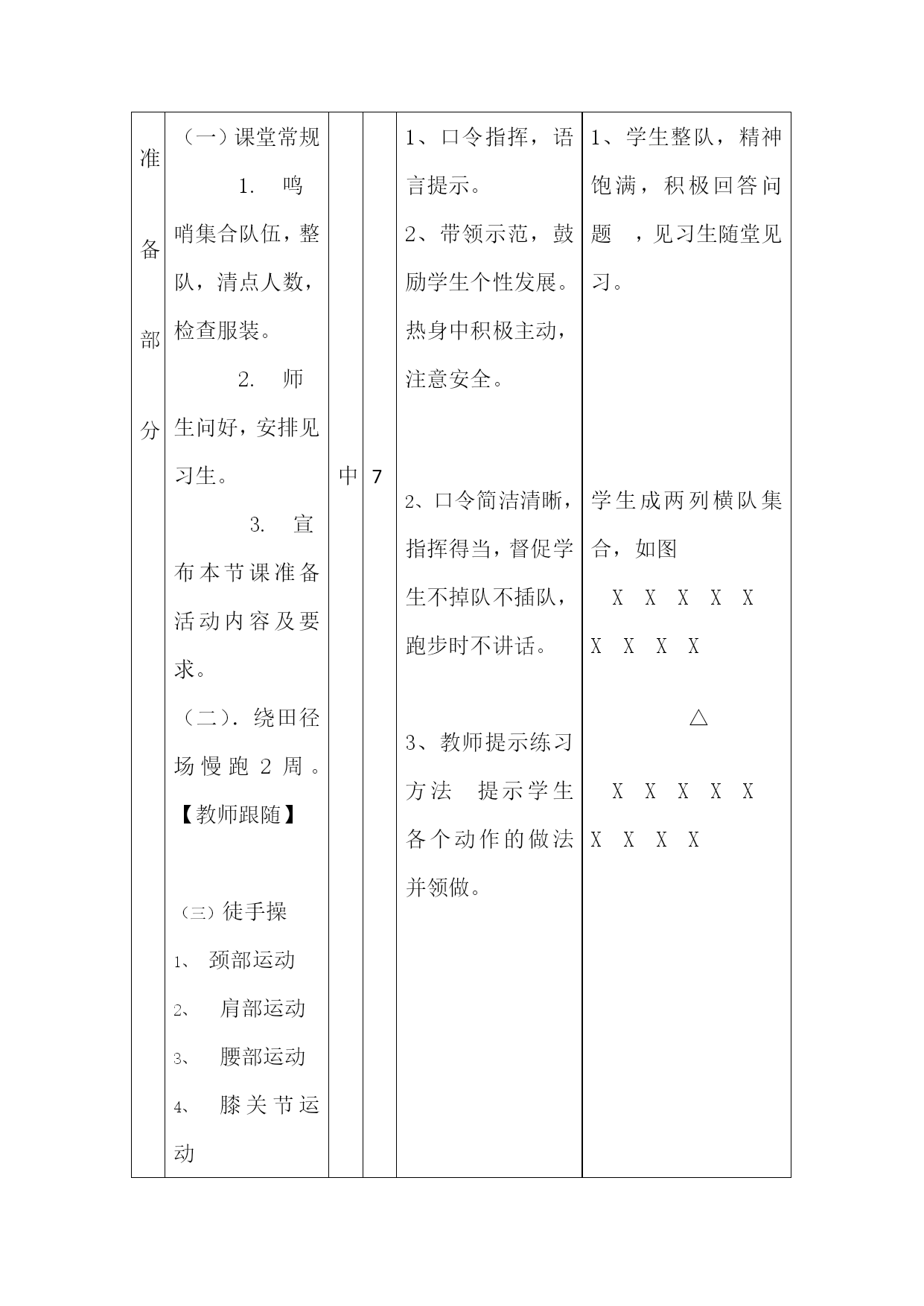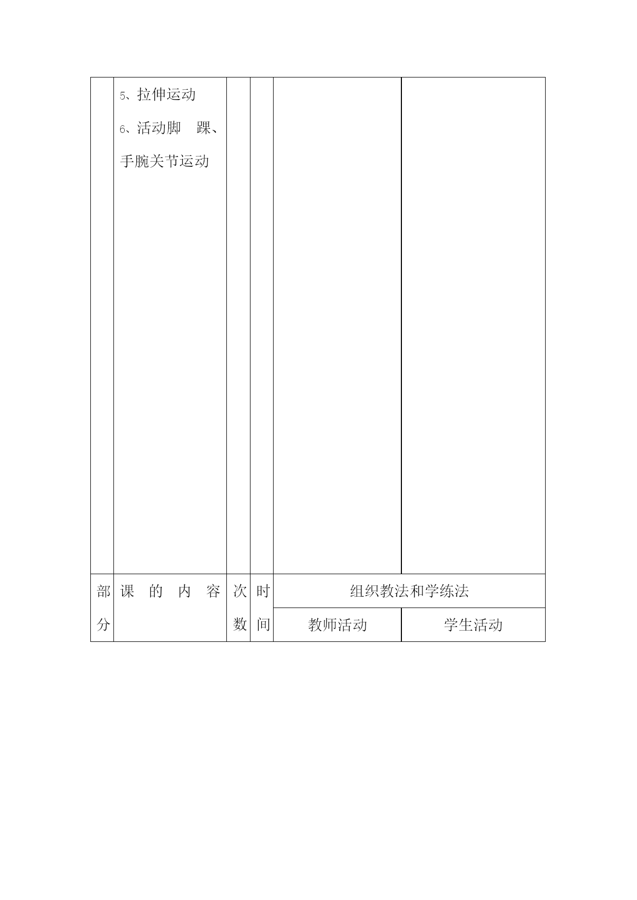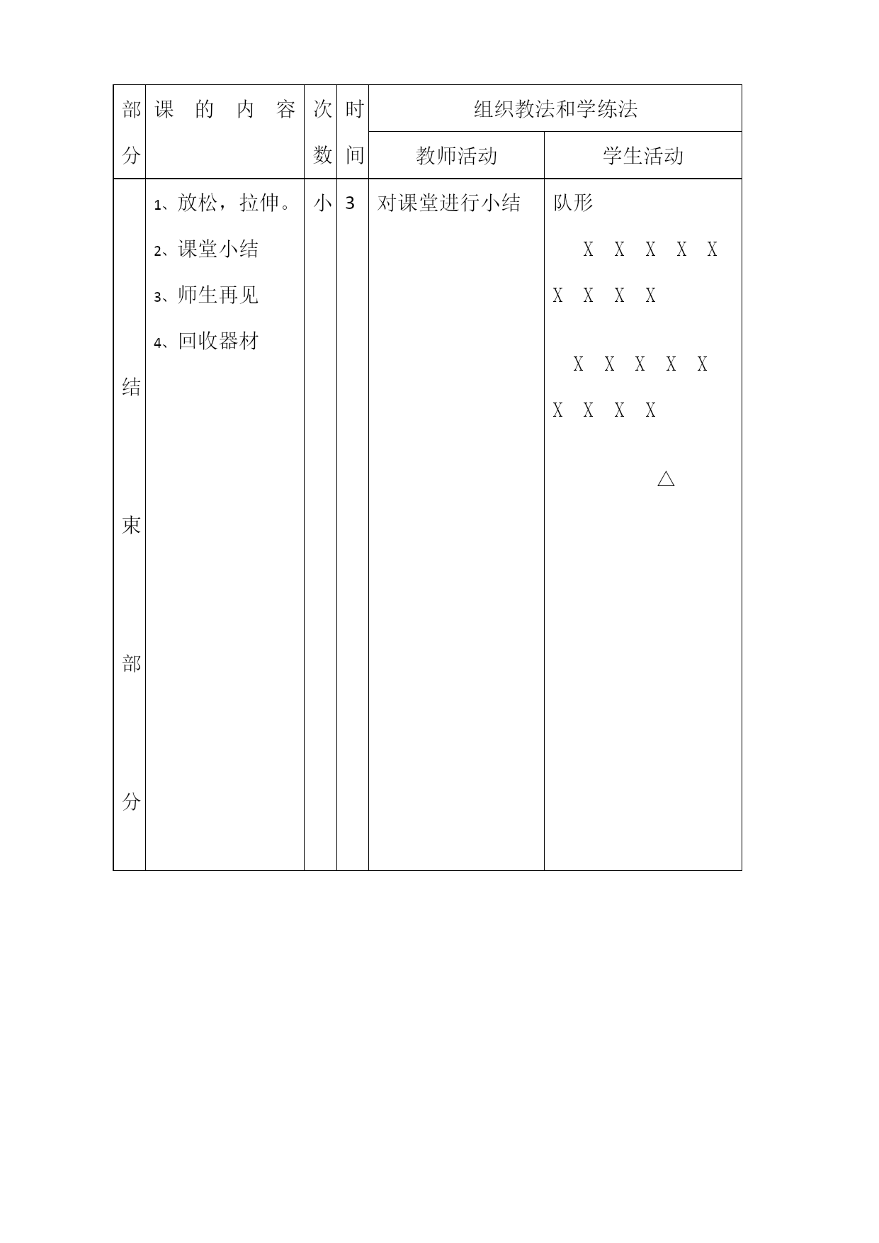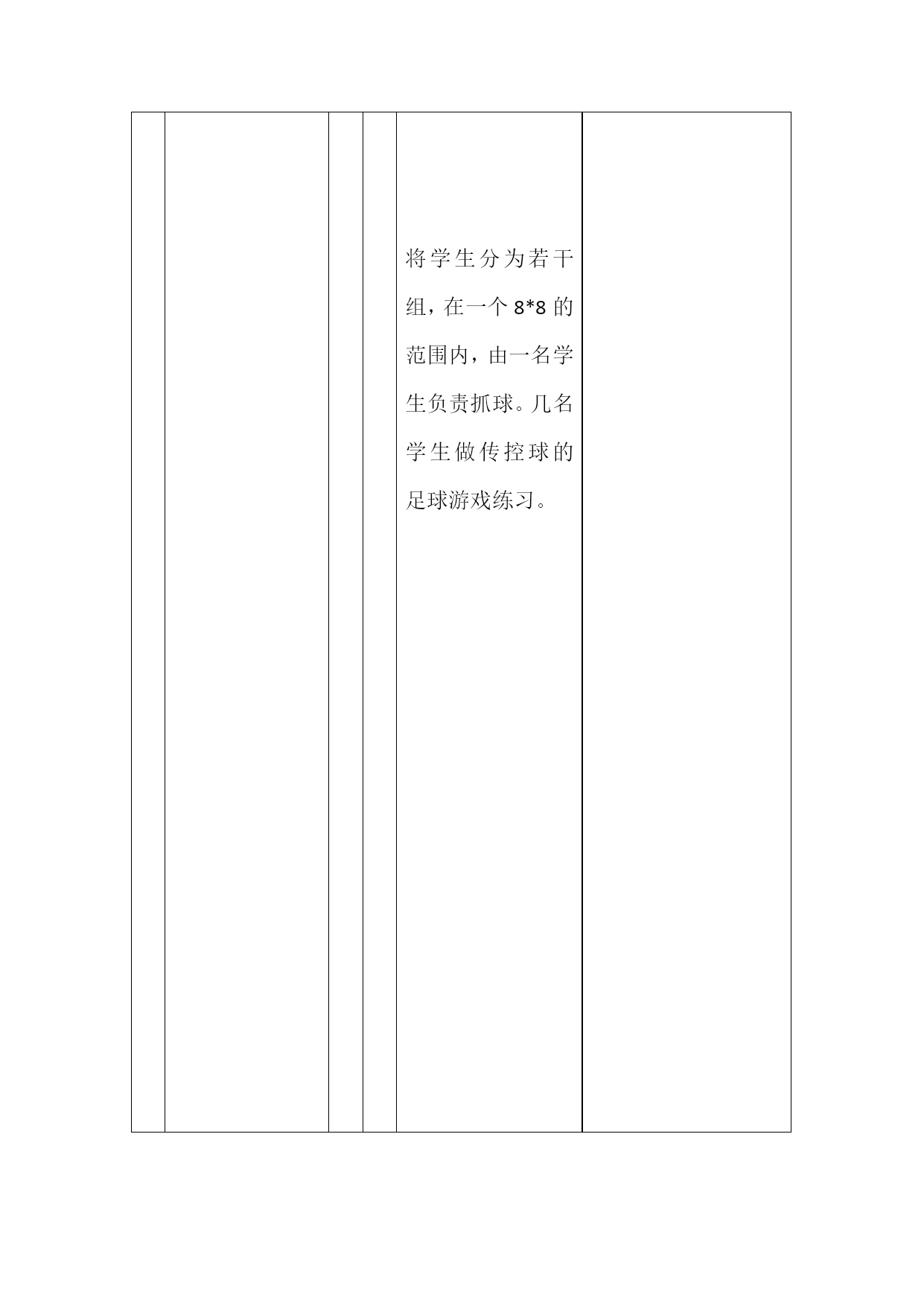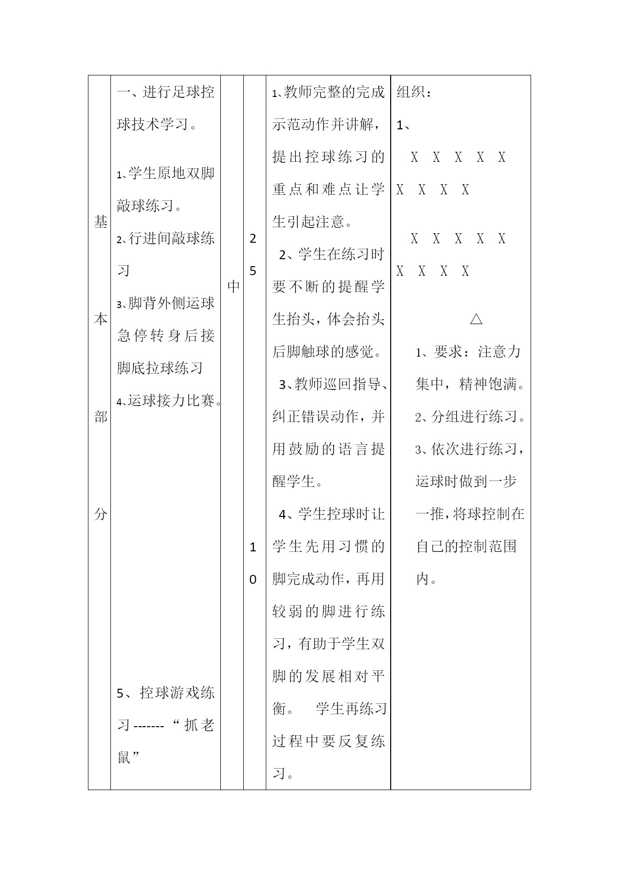 授课班级六年级人数日期授课教师***教材内容足球---控球技术教学课程目标认知目标:让学生认识到控球技术是比赛重要的环节。技能目标:通过学习使80%的学生掌握本节课控球的2基本技术。情感目标:通过教学发掘学生的创造能力,培养学生竞争和团队合住的精神。重、难点重点:控球过程中注意抬头,观察场上的变化。难点:支撑腿的位置以及触球瞬间的触球点和触球部位。部分教学内容强度时间组织教法和学练法教师活动学生活动准备部分(一)课堂常规 1. 鸣哨集合队伍,整队,清点人数,检查服装。2. 师生问好,安排见习生。 3. 宣布本节课准备活动内容及要求。 (二).绕田径场慢跑2周。【教师跟随】徒手操颈部运动 肩部运动 腰部运动 膝关节运动 拉伸运动 活动脚 踝、手腕关节运动中71、口令指挥,语言提示。 2、带领示范,鼓励学生个性发展。 热身中积极主动,注意安全。口令简洁清晰,指挥得当,督促学生不掉队不插队,跑步时不讲话。3、教师提示练习方法 提示学生各个动作的做法并领做。1、学生整队,精神饱满,积极回答问题 ,见习生随堂见习。学生成两列横队集合,如图 X X X X X X X X X △ X X X X X X X X X 部分课的内容次数时间组织教法和学练法教师活动学生活动基本部分一、进行足球控球技术学习。学生原地双脚敲球练习。行进间敲球练习脚背外侧运球急停转身后接脚底拉球练习运球接力比赛。5、控球游戏练习-------“抓老鼠”中2510教师完整的完成示范动作并讲解,提出控球练习的重点和难点让学生引起注意。 2、学生在练习时要不断的提醒学生抬头,体会抬头后脚触球的感觉。 3、教师巡回指导、纠正错误动作,并用鼓励的语言提醒学生。 4、学生控球时让学生先用习惯的脚完成动作,再用较弱的脚进行练习,有助于学生双脚的发展相对平衡。 学生再练习过程中要反复练习。将学生分为若干组,在一个8*8的范围内,由一名学生负责抓球。几名学生做传控球的足球游戏练习。组织:1、X X X X X X X X X X X X X X X X X X△要求:注意力集中,精神饱满。分组进行练习。依次进行练习,运球时做到一步一推,将球控制在自己的控制范围内。部分课的内容次数时间组织教法和学练法教师活动学生活动结束部分放松,拉伸。课堂小结师生再见回收器材小3对课堂进行小结队形X X X X X X X X X X X X X X X X X X△