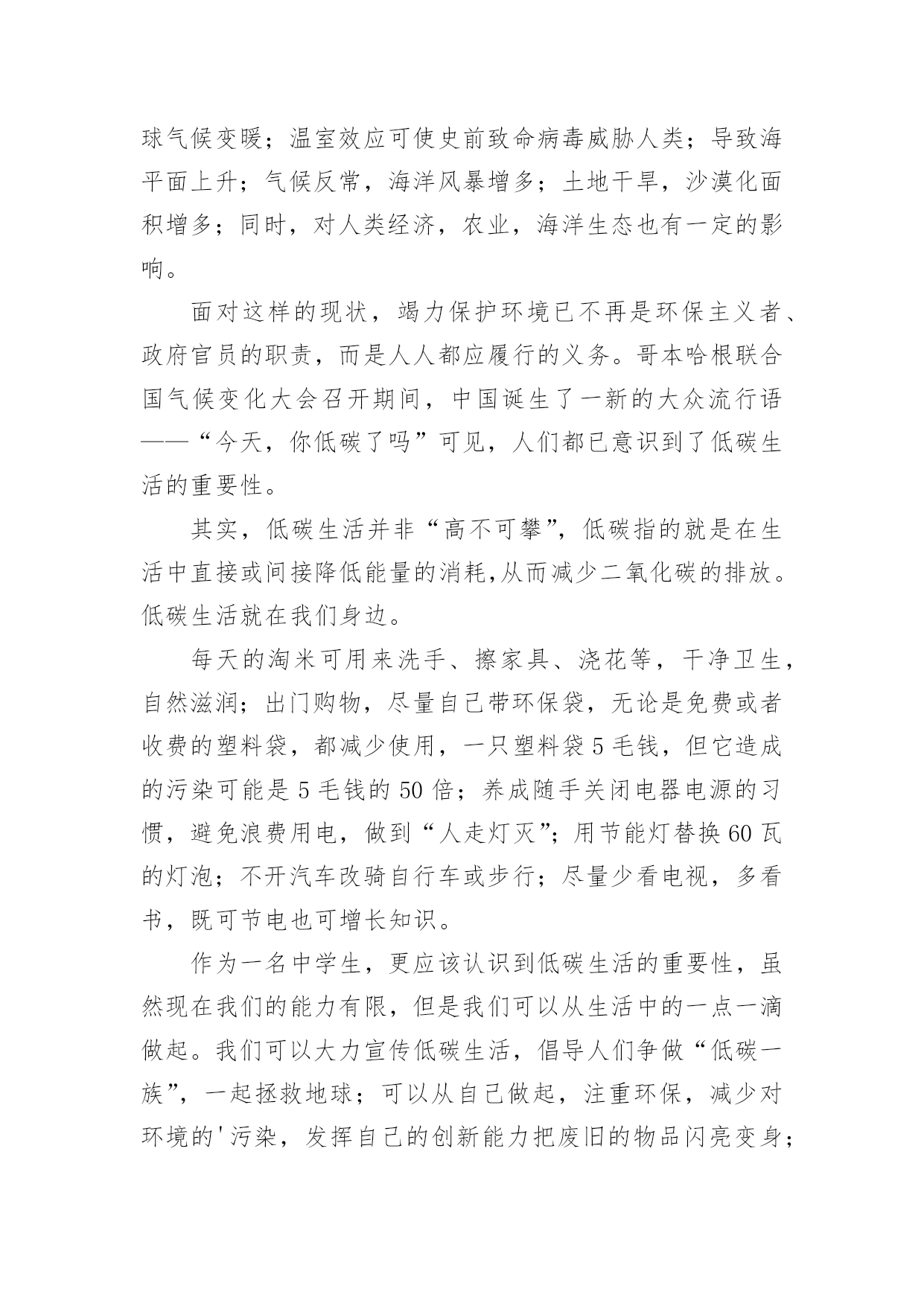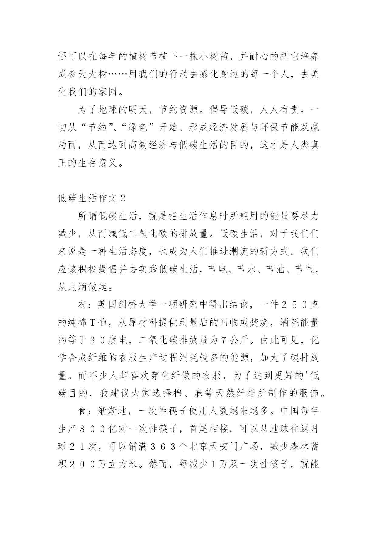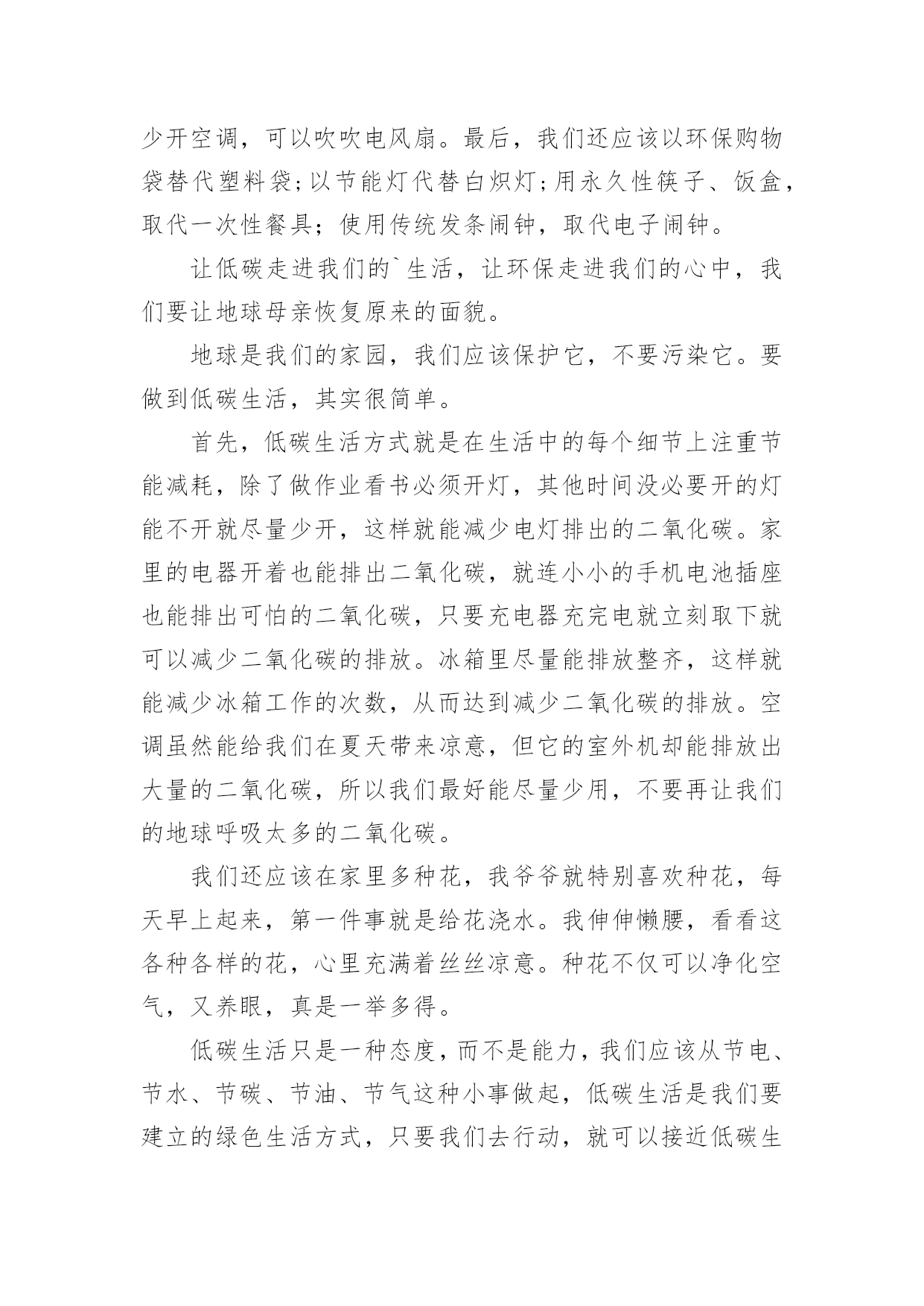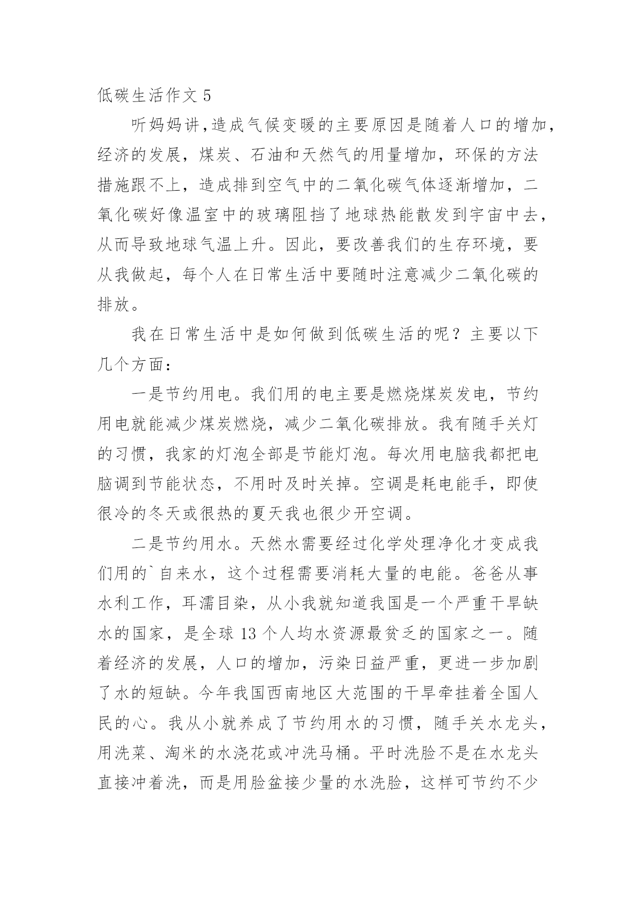 低碳生活作文低碳生活作文15篇[热]无论是在学校还是在社会中,大家都不可避免地要接触到作文吧,作文是人们以书面形式表情达意的言语活动。作文的注意事项有许多,你确定会写吗?下面是小编整理的低碳生活作文,希望对大家有所帮助。低碳生活作文1我们伟大的地球母亲赋予了人类美好的生活环境,而人类似乎并不满足这一切,也不懂得珍惜和保护。因此,如今的地球妈妈已是伤痕累累。随着现代社会的不断进步与发展,人们的生活条件也得到了提高和改善。小汽车等现代交通工具也代替了以往的交通方式;工业发展,大量工业废气的排放;大量开采煤,以煤为主要燃料;砍伐森林,减少了森林对二氧化碳的吸收等诸多因素都导致了全球二氧化碳增多,使其环境受到严重破坏。二氧化碳也被称为温室气体。它的产生主要是由于现代工业化,社会过多燃烧煤炭、石油和天然气,大量排放尾气,这些燃料燃烧后放出大量的二氧化碳气体进入大气造成的。温室气体的不断增多,对环境有着极大的影响。温室气体浓度的增多会减少红外线辐射放射到太空外,地球的气候因此需转变来使吸取和释放辐射的分量达至新的平衡,也就是全球气候变暖;温室效应可使史前致命病毒威胁人类;导致海平面上升;气候反常,海洋风暴增多;土地干旱,沙漠化面积增多;同时,对人类经济,农业,海洋生态也有一定的影响。面对这样的现状,竭力保护环境已不再是环保主义者、政府官员的职责,而是人人都应履行的义务。哥本哈根联合国气候变化大会召开期间,中国诞生了一新的大众流行语——“今天,你低碳了吗”可见,人们都已意识到了低碳生活的重要性。其实,低碳生活并非“高不可攀”,低碳指的就是在生活中直接或间接降低能量的消耗,从而减少二氧化碳的排放。低碳生活就在我们身边。每天的淘米可用来洗手、擦家具、浇花等,干净卫生,自然滋润;出门购物,尽量自己带环保袋,无论是免费或者收费的塑料袋,都减少使用,一只塑料袋5毛钱,但它造成的污染可能是5毛钱的50倍;养成随手关闭电器电源的习惯,避免浪费用电,做到“人走灯灭”;用节能灯替换60瓦的灯泡;不开汽车改骑自行车或步行;尽量少看电视,多看书,既可节电也可增长知识。作为一名中学生,更应该认识到低碳生活的重要性,虽然现在我们的能力有限,但是我们可以从生活中的一点一滴做起。我们可以大力宣传低碳生活,倡导人们争做“低碳一族”,一起拯救地球;可以从自己做起,注重环保,减少对环境的'污染,发挥自己的创新能力把废旧的物品闪亮变身;还可以在每年的植树节植下一株小树苗,并耐心的把它培养成参天大树……用我们的行动去感化身边的每一个人,去美化我们的家园。为了地球的明天,节约资源。倡导低碳,人人有责。一切从“节约”、“绿色”开始。形成经济发展与环保节能双赢局面,从而达到高效经济与低碳生活的目的,这才是人类真正的生存意义。低碳生活作文2所谓低碳生活,就是指生活作息时所耗用的能量要尽力减少,从而减低二氧化碳的排放量。低碳生活,对于我们们来说是一种生活态度,也成为人们推进潮流的新方式。我们应该积极提倡并去实践低碳生活,节电、节水、节油、节气,从点滴做起。衣:英国剑桥大学一项研究中得出结论,一件250克的纯棉T恤,从原材料提供到最后的回收或焚烧,消耗能量约等于30度电,二氧化碳排放量为7公斤。由此可见,化学合成纤维的衣服生产过程消耗较多的能源,加大了碳排放量。而不少人却喜欢穿化纤做的衣服,为了达到更好的'低碳目的,我建议大家选择棉、麻等天然纤维所制作的服饰。食:渐渐地,一次性筷子使用人数越来越多。中国每年生产800亿对一次性筷子,首尾相接,可以从地球往返月球21次,可以铺满363个北京天安门广场,减少森林蓄积200万立方米。然而,每减少1万双一次性筷子,就能少砍掉0。32棵树,减碳3。7公斤。所以,外出用餐携带环保筷子,不再使用一次性筷子,是多么重要的一件事!抽烟的人数迅速上升,这也是加剧温室效应的一个原因。减少抽烟,只要1天少抽1支烟,每人每年减排二氧化碳0。37千克,如果中国3。5亿烟民都这么做,那么每年可节能约5万吨标准煤,减排二氧化碳13万吨。多么庞大的数字!住:近几年来,很多居民在装修方面很讲究,很奢华,但简约的设计风格更低碳环保。减少装修材料的使用量,充分利用可循环材料,可以减少二氧化碳的排放量。多使用竹制、藤制的家具,这些材料可再生性强,也能减少对森林资源的消耗。炎热的夏季,空调能带给人清凉的感觉。但是,空调是耗电量较大的电器。我们要合理使用空调,选用节能空调。一台节能空调比普通空调每小时少耗电0。24度,按一年使用100小时估计,可节电24度,相应减排二氧化碳23千克。如果全国每年10%的空调更新为节能空调,那么可节电约3。6亿度,减排二氧化碳35万吨。行:私家车越来越受欢迎。据调查,一辆1。6升的汽车,一年行驶里程约为1万公里,按1000升汽油使用量来算,那么二氧化碳