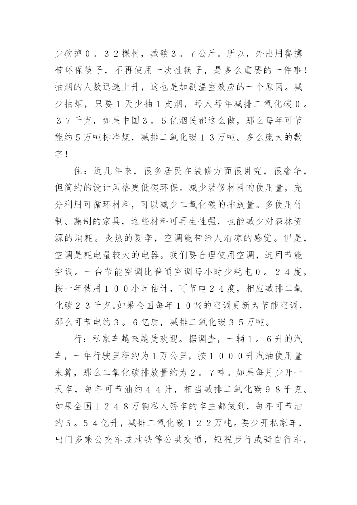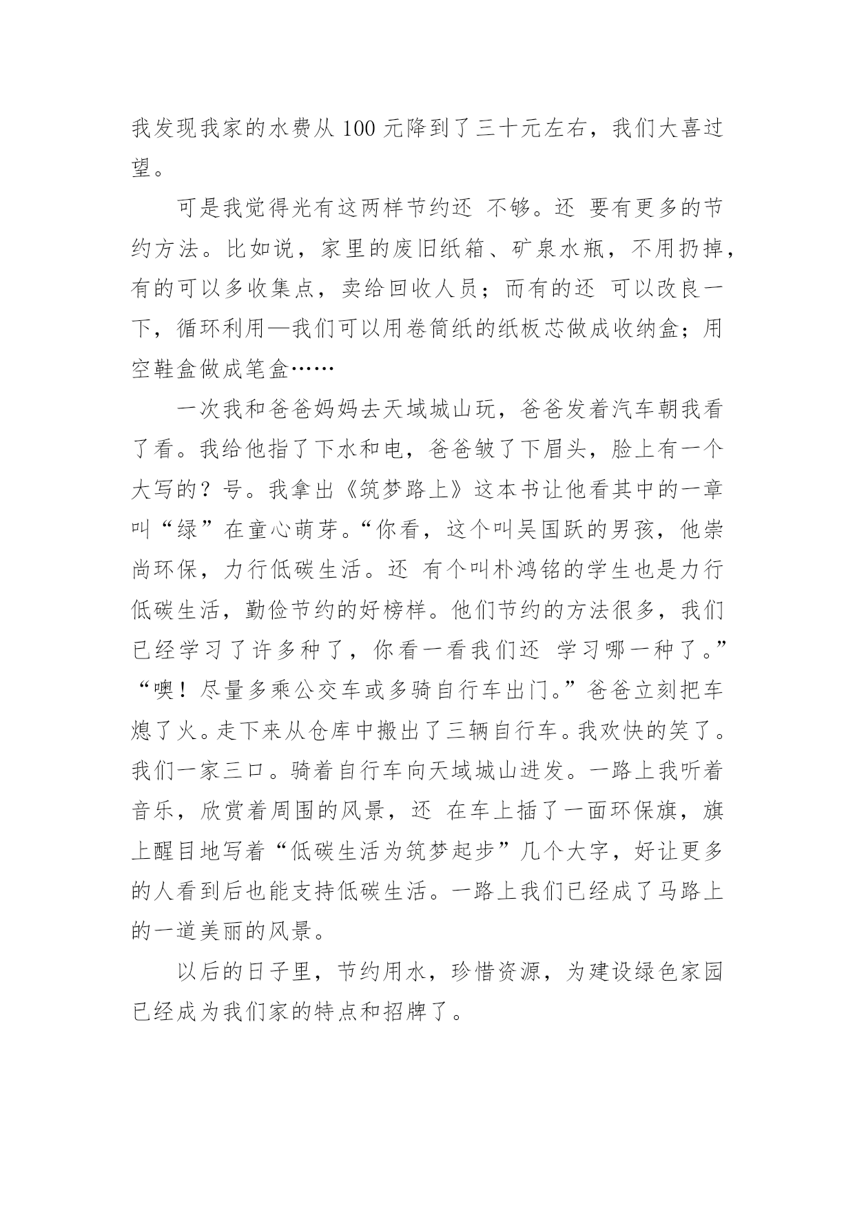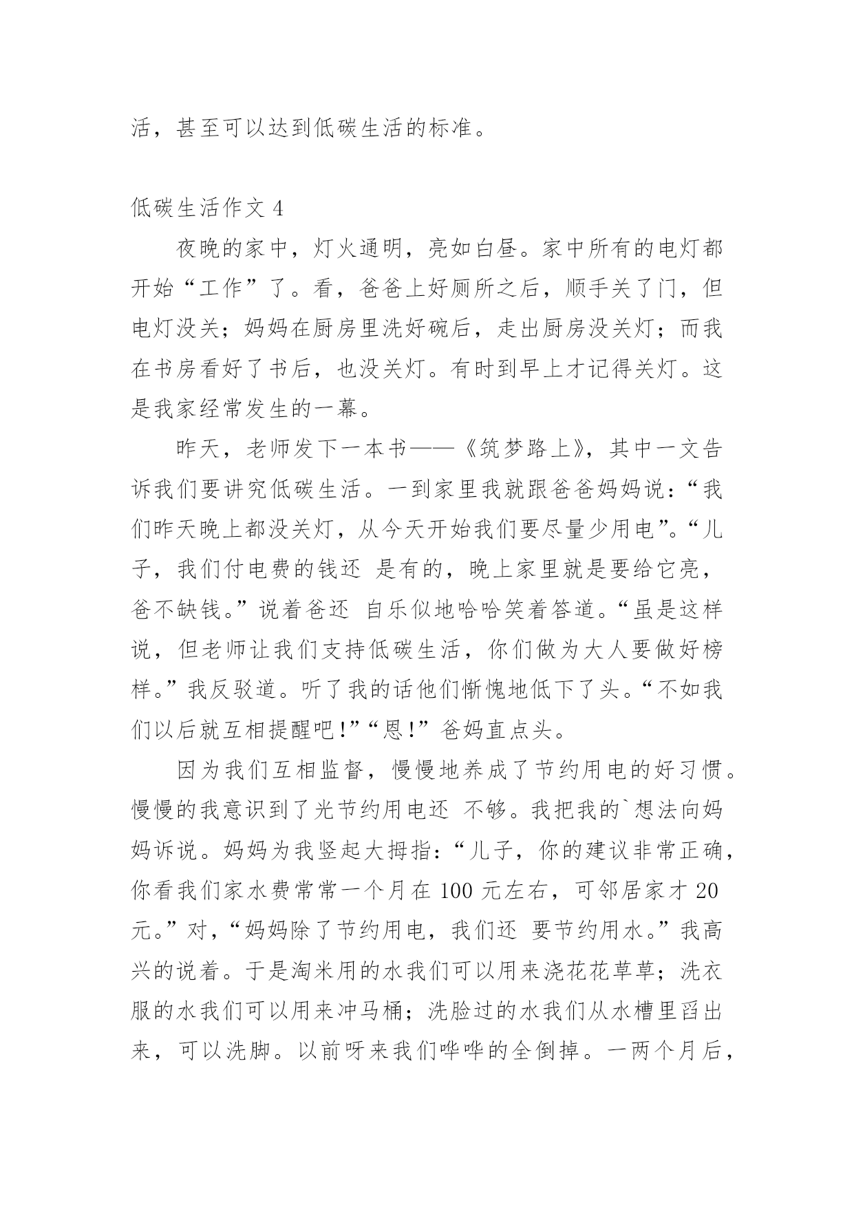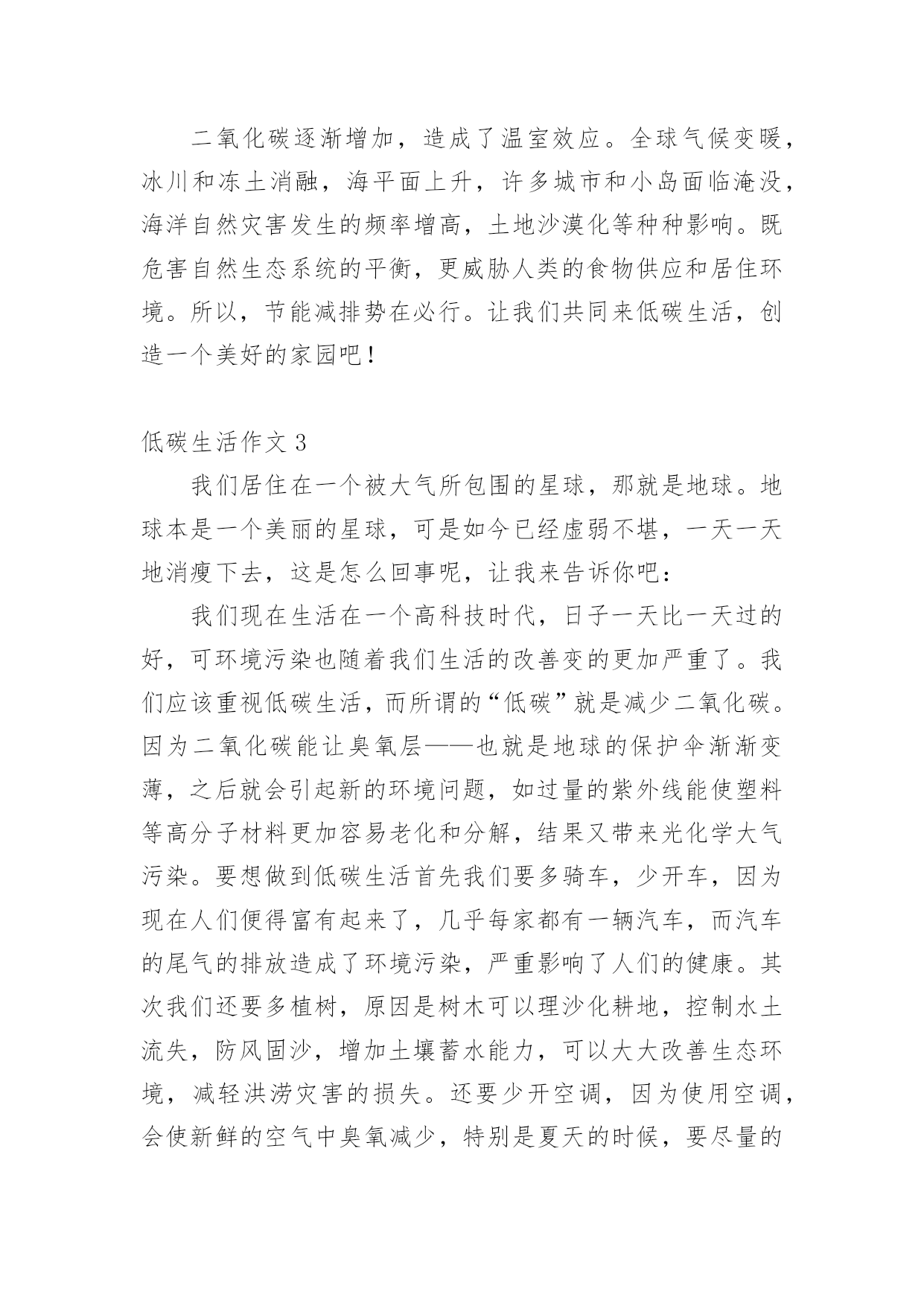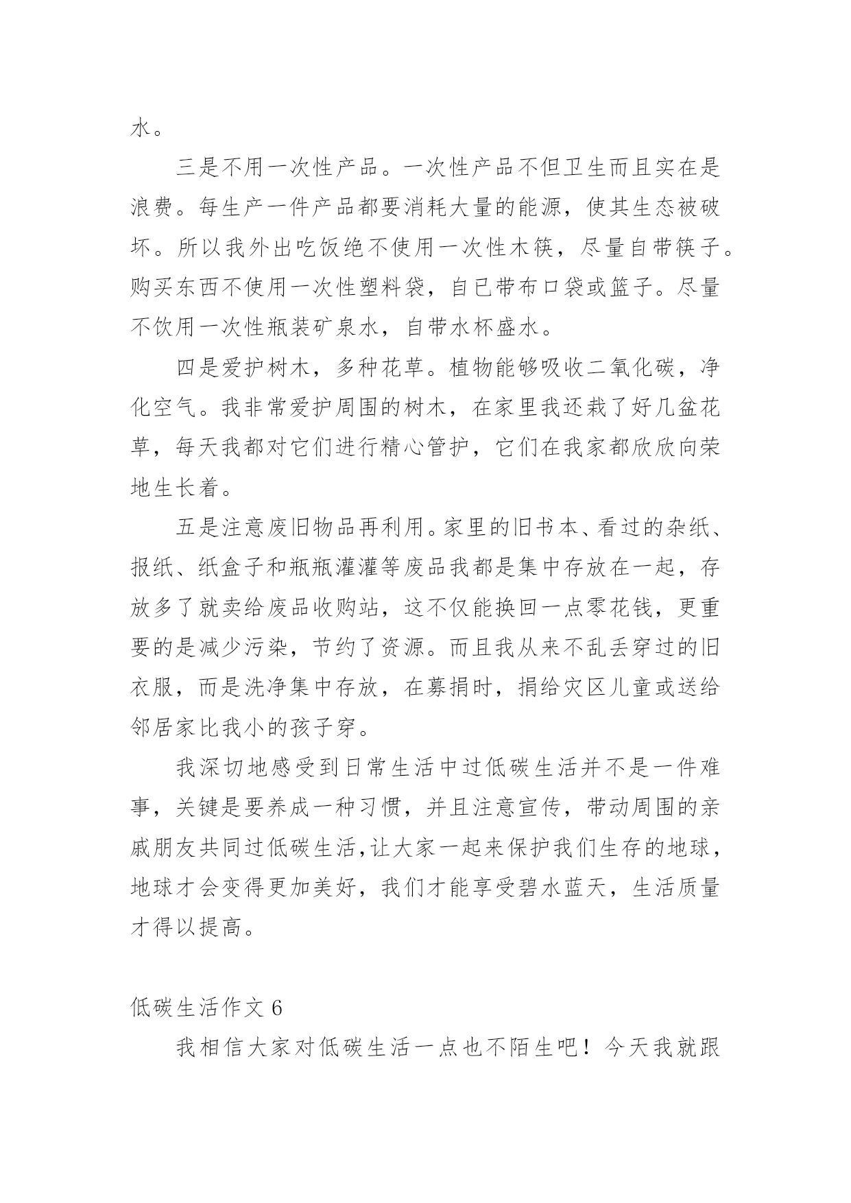 低碳生活作文低碳生活作文15篇[热]无论是在学校还是在社会中,大家都不可避免地要接触到作文吧,作文是人们以书面形式表情达意的言语活动。作文的注意事项有许多,你确定会写吗?下面是小编整理的低碳生活作文,希望对大家有所帮助。低碳生活作文1我们伟大的地球母亲赋予了人类美好的生活环境,而人类似乎并不满足这一切,也不懂得珍惜和保护。因此,如今的地球妈妈已是伤痕累累。随着现代社会的不断进步与发展,人们的生活条件也得到了提高和改善。小汽车等现代交通工具也代替了以往的交通方式;工业发展,大量工业废气的排放;大量开采煤,以煤为主要燃料;砍伐森林,减少了森林对二氧化碳的吸收等诸多因素都导致了全球二氧化碳增多,使其环境受到严重破坏。二氧化碳也被称为温室气体。它的产生主要是由于现代工业化,社会过多燃烧煤炭、石油和天然气,大量排放尾气,这些燃料燃烧后放出大量的二氧化碳气体进入大气造成的。温室气体的不断增多,对环境有着极大的影响。温室气体浓度的增多会减少红外线辐射放射到太空外,地球的气候因此需转变来使吸取和释放辐射的分量达至新的平衡,也就是全球气候变暖;温室效应可使史前致命病毒威胁人类;导致海平面上升;气候反常,海洋风暴增多;土地干旱,沙漠化面积增多;同时,对人类经济,农业,海洋生态也有一定的影响。面对这样的现状,竭力保护环境已不再是环保主义者、政府官员的职责,而是人人都应履行的义务。哥本哈根联合国气候变化大会召开期间,中国诞生了一新的大众流行语——“今天,你低碳了吗”可见,人们都已意识到了低碳生活的重要性。其实,低碳生活并非“高不可攀”,低碳指的就是在生活中直接或间接降低能量的消耗,从而减少二氧化碳的排放。低碳生活就在我们身边。每天的淘米可用来洗手、擦家具、浇花等,干净卫生,自然滋润;出门购物,尽量自己带环保袋,无论是免费或者收费的塑料袋,都减少使用,一只塑料袋5毛钱,但它造成的污染可能是5毛钱的50倍;养成随手关闭电器电源的习惯,避免浪费用电,做到“人走灯灭”;用节能灯替换60瓦的灯泡;不开汽车改骑自行车或步行;尽量少看电视,多看书,既可节电也可增长知识。作为一名中学生,更应该认识到低碳生活的重要性,虽然现在我们的能力有限,但是我们可以从生活中的一点一滴做起。我们可以大力宣传低碳生活,倡导人们争做“低碳一族”,一起拯救地球;可以从自己做起,注重环保,减少对环境的'污染,发挥自己的创新能力把废旧的物品闪亮变身;还可以在每年的植树节植下一株小树苗,并耐心的把它培养成参天大树……用我们的行动去感化身边的每一个人,去美化我们的家园。为了地球的明天,节约资源。倡导低碳,人人有责。一切从“节约”、“绿色”开始。形成经济发展与环保节能双赢局面,从而达到高效经济与低碳生活的目的,这才是人类真正的生存意义。低碳生活作文2所谓低碳生活,就是指生活作息时所耗用的能量要尽力减少,从而减低二氧化碳的排放量。低碳生活,对于我们们来说是一种生活态度,也成为人们推进潮流的新方式。我们应该积极提倡并去实践低碳生活,节电、节水、节油、节气,从点滴做起。衣:英国剑桥大学一项研究中得出结论,一件250克的纯棉T恤,从原材料提供到最后的回收或焚烧,消耗能量约等于30度电,二氧化碳排放量为7公斤。由此可见,化学合成纤维的衣服生产过程消耗较多的能源,加大了碳排放量。而不少人却喜欢穿化纤做的衣服,为了达到更好的'低碳目的,我建议大家选择棉、麻等天然纤维所制作的服饰。食:渐渐地,一次性筷子使用人数越来越多。中国每年生产800亿对一次性筷子,首尾相接,可以从地球往返月球21次,可以铺满363个北京天安门广场,减少森林蓄积200万立方米。然而,每减少1万双一次性筷子,就能少砍掉0。32棵树,减碳3。7公斤。所以,外出用餐携带环保筷子,不再使用一次性筷子,是多么重要的一件事!抽烟的人数迅速上升,这也是加剧温室效应的一个原因。减少抽烟,只要1天少抽1支烟,每人每年减排二氧化碳0。37千克,如果中国3。5亿烟民都这么做,那么每年可节能约5万吨标准煤,减排二氧化碳13万吨。多么庞大的数字!住:近几年来,很多居民在装修方面很讲究,很奢华,但简约的设计风格更低碳环保。减少装修材料的使用量,充分利用可循环材料,可以减少二氧化碳的排放量。多使用竹制、藤制的家具,这些材料可再生性强,也能减少对森林资源的消耗。炎热的夏季,空调能带给人清凉的感觉。但是,空调是耗电量较大的电器。我们要合理使用空调,选用节能空调。一台节能空调比普通空调每小时少耗电0。24度,按一年使用100小时估计,可节电24度,相应减排二氧化碳23千克。如果全国每年10%的空调更新为节能空调,那么可节电约3。6亿度,减排二氧化碳35万吨。行:私家车越来越受欢迎。据调查,一辆1。6升的汽车,一年行驶里程约为1万公里,按1000升汽油使用量来算,那么二氧化碳