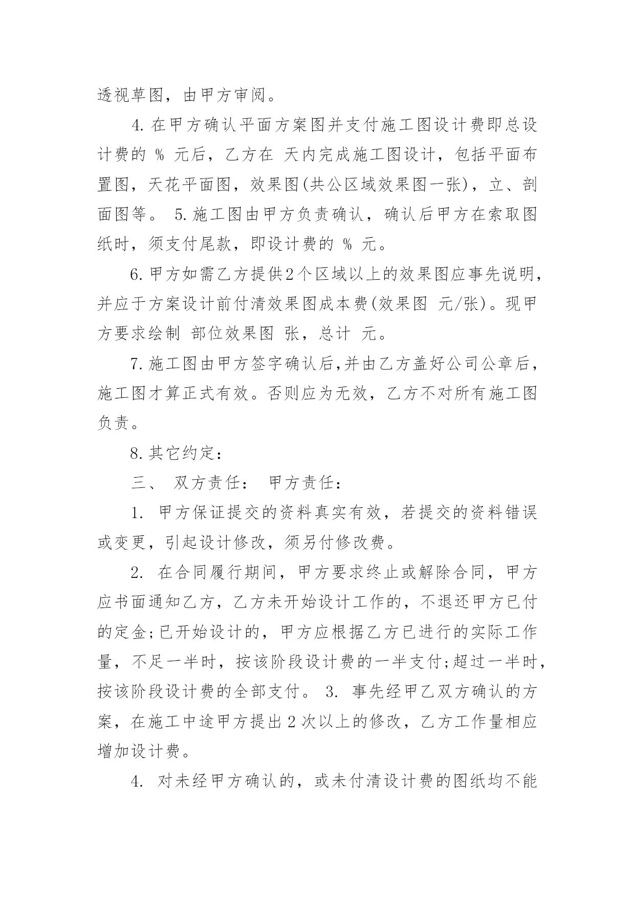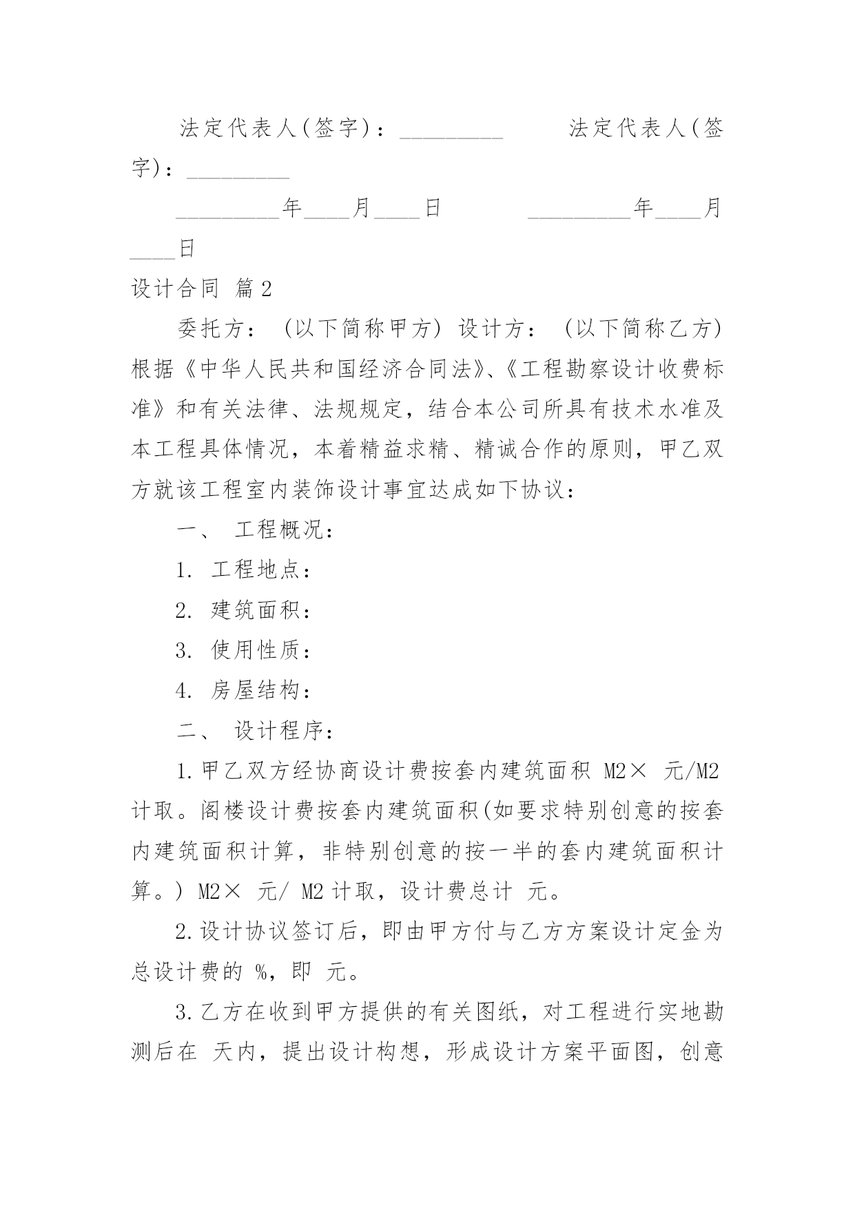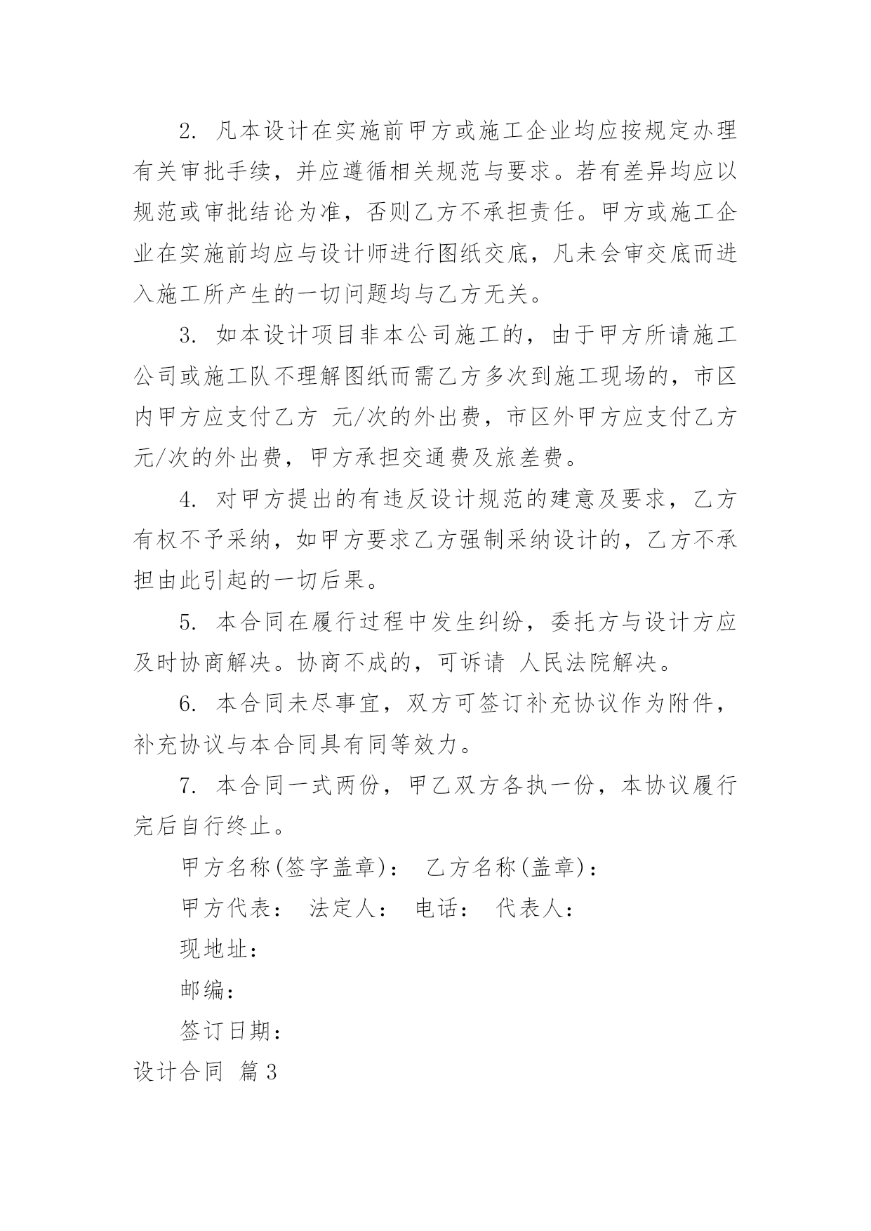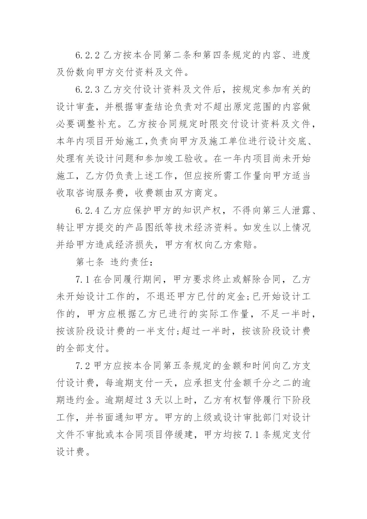 设计合同【热门】设计合同范文集合7篇在人们愈发重视契约的社会中,合同出现在我们生活中的次数越来越多,签订合同是为了保障双方的利益,避免不必要的争端。那么制定合同书有什么需要注意的呢?下面是小编帮大家整理的设计合同7篇,仅供参考,欢迎大家阅读。设计合同篇1甲方:(以上简称甲方)乙方:(以上简称甲方)甲方主要负责工程施工,现联合体已与兰州新区城投公司签订了市政道路工程项目合同。现经甲乙双方协商一致,甲方将承包施工的市政道路工程的沥青分项部分交与乙方施工,为明确各自的权力和义务,签订本合同。1、在同等价格,相同质量的前提下,甲方将沥青分项业务交与乙方施工,并由乙方负责沥青搅拌、摊铺等工作。2、质量要求:符合国家祥光标准要求和设计要求及新区管委会、新区城投公司的相关要求。必须使用克拉玛依沥青,不得偷工减料。3、分项工程费用:粗粒料、中粒料1200元/立方米、含全部所需机械、人工、燃油(煤)、水电费及摊铺、压实等费用,透层油、粘层油、纤维、清扫基层等费用包括在沥青费等用中,不另计算。工程量按设计量计算(不含税、不含施工资料)。4、付款方式:在甲方要求施工前10天付预计工程费用的20%,每完成一层,付完成工程的70%,余款待工程全部完成后年底前付90%,剩余5%保证金扣留时间为6个月,5%待BT模式到期全部付清。如甲方不能按约定付款,每延期一天支付乙方违约部分的万分之二违约金。沥青由甲方采购的,则沥青付款抵扣工程款。5、乙方应保证加工的`沥青混凝土质量和摊铺质量,如发生质量问题(加工质量、摊铺质量)均由乙方负责,并无条件返工至合格。所造成的损失全部由乙方承担。6、乙方应合理安排沥青施工工序,保证施工能按甲方的要求按时完成,如遇二家单位同时施工时,乙方应保证优先满足甲方的要求。因乙方原因不能满足甲方时间要求,乙方应承担由此给甲方造成的损失。同时甲方将选择其他单位施工沥青项。7、工程实际施工时,因原材料价格发生变动,分项价格由甲乙双方本平等互利的原则协商确定。如有其他单位在同等条件下价格低于本协议书约定价格,甲方应先征求乙方是否同意以同等价格施工。如乙方不同意,甲方可将工作交与其他单位施工。同时不承担由此给乙方造成的损失。8、其它未尽事宜,双方应本着平等、互利的原则协商处理。本合同一式两分,双方各执一份。甲方(公章):_________乙方(公章):_________法定代表人(签字):_________法定代表人(签字):__________________年____月____日_________年____月____日设计合同篇2委托方:(以下简称甲方)设计方:(以下简称乙方)根据《中华人民共和国经济合同法》、《工程勘察设计收费标准》和有关法律、法规规定,结合本公司所具有技术水准及本工程具体情况,本着精益求精、精诚合作的原则,甲乙双方就该工程室内装饰设计事宜达成如下协议:一、工程概况:1.工程地点:2.建筑面积:3.使用性质:4.房屋结构:二、设计程序:1.甲乙双方经协商设计费按套内建筑面积M2×元/M2计取。阁楼设计费按套内建筑面积(如要求特别创意的按套内建筑面积计算,非特别创意的按一半的套内建筑面积计算。)M2×元/M2计取,设计费总计元。2.设计协议签订后,即由甲方付与乙方方案设计定金为总设计费的%,即元。3.乙方在收到甲方提供的有关图纸,对工程进行实地勘测后在天内,提出设计构想,形成设计方案平面图,创意透视草图,由甲方审阅。4.在甲方确认平面方案图并支付施工图设计费即总设计费的%元后,乙方在天内完成施工图设计,包括平面布置图,天花平面图,效果图(共公区域效果图一张),立、剖面图等。5.施工图由甲方负责确认,确认后甲方在索取图纸时,须支付尾款,即设计费的%元。6.甲方如需乙方提供2个区域以上的效果图应事先说明,并应于方案设计前付清效果图成本费(效果图元/张)。现甲方要求绘制部位效果图张,总计元。7.施工图由甲方签字确认后,并由乙方盖好公司公章后,施工图才算正式有效。否则应为无效,乙方不对所有施工图负责。8.其它约定:三、双方责任:甲方责任:1.甲方保证提交的资料真实有效,若提交的资料错误或变更,引起设计修改,须另付修改费。2.在合同履行期间,甲方要求终止或解除合同,甲方应书面通知乙方,乙方未开始设计工作的,不退还甲方已付的定金;已开始设计的,甲方应根据乙方已进行的实际工作量,不足一半时,按该阶段设计费的一半支付;超过一半时,按该阶段设计费的全部支付。3.事先经甲乙双方确认的方案,在施工中途甲方提出2次以上的修改,乙方工作量相应增加设计费。4.对未经甲方确认的,或未付清设计费的图纸均不能外带。5.施工中,甲方要求更改设计图纸必须经乙方同意。如甲方提出的修改图纸影响房屋结构或装修内部结构,乙方不同意修改,而甲方执意要改的,其一切后果均