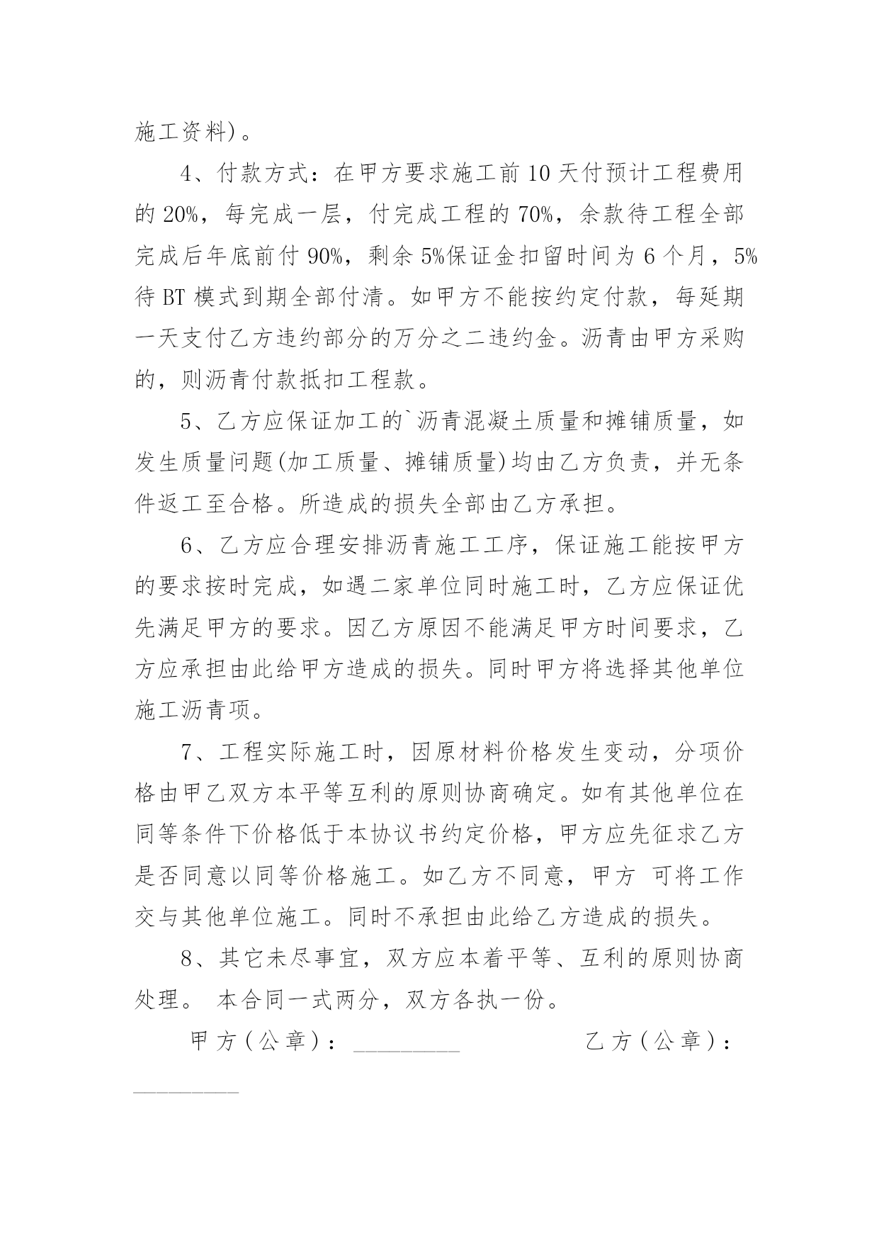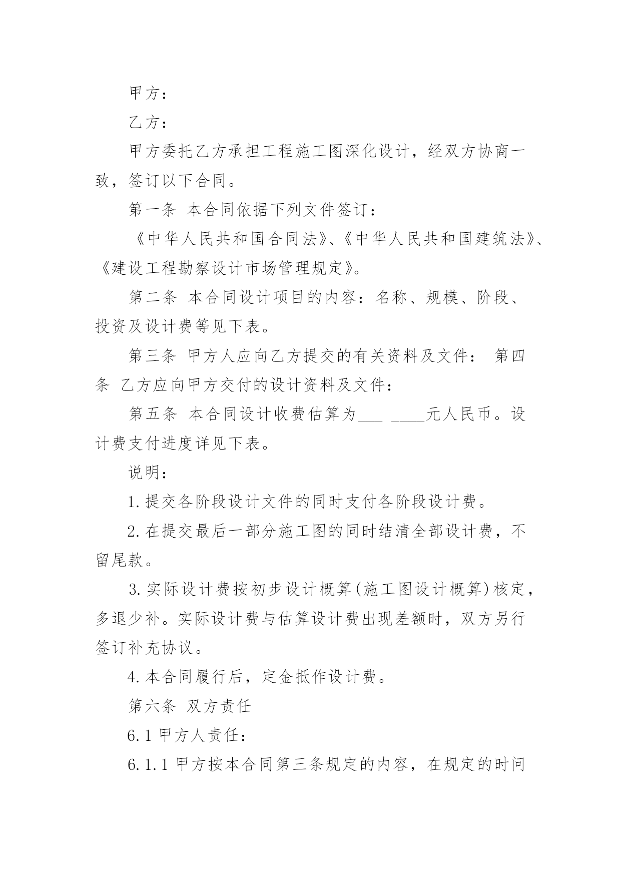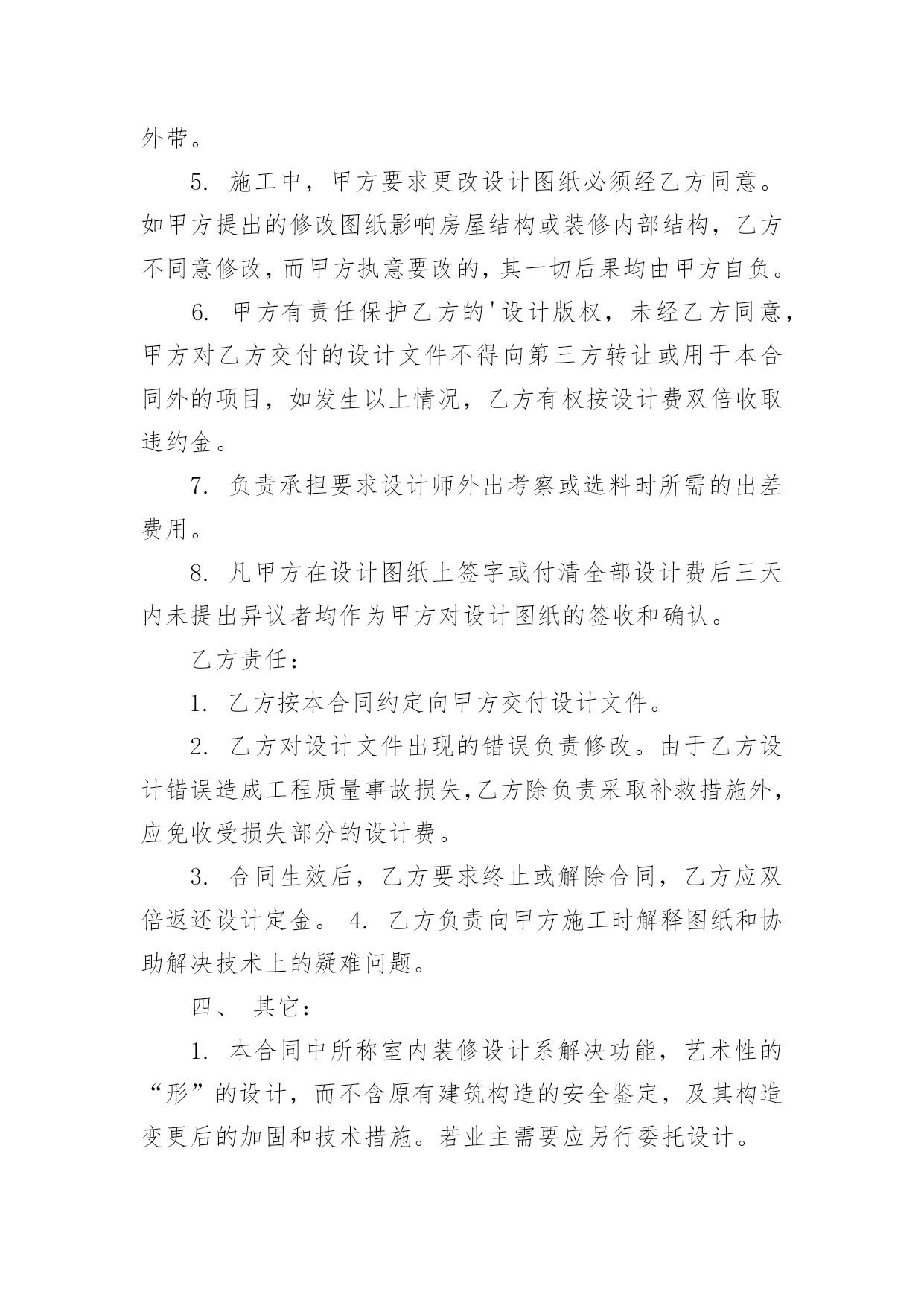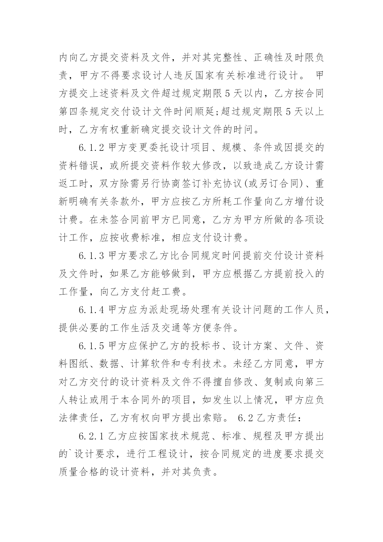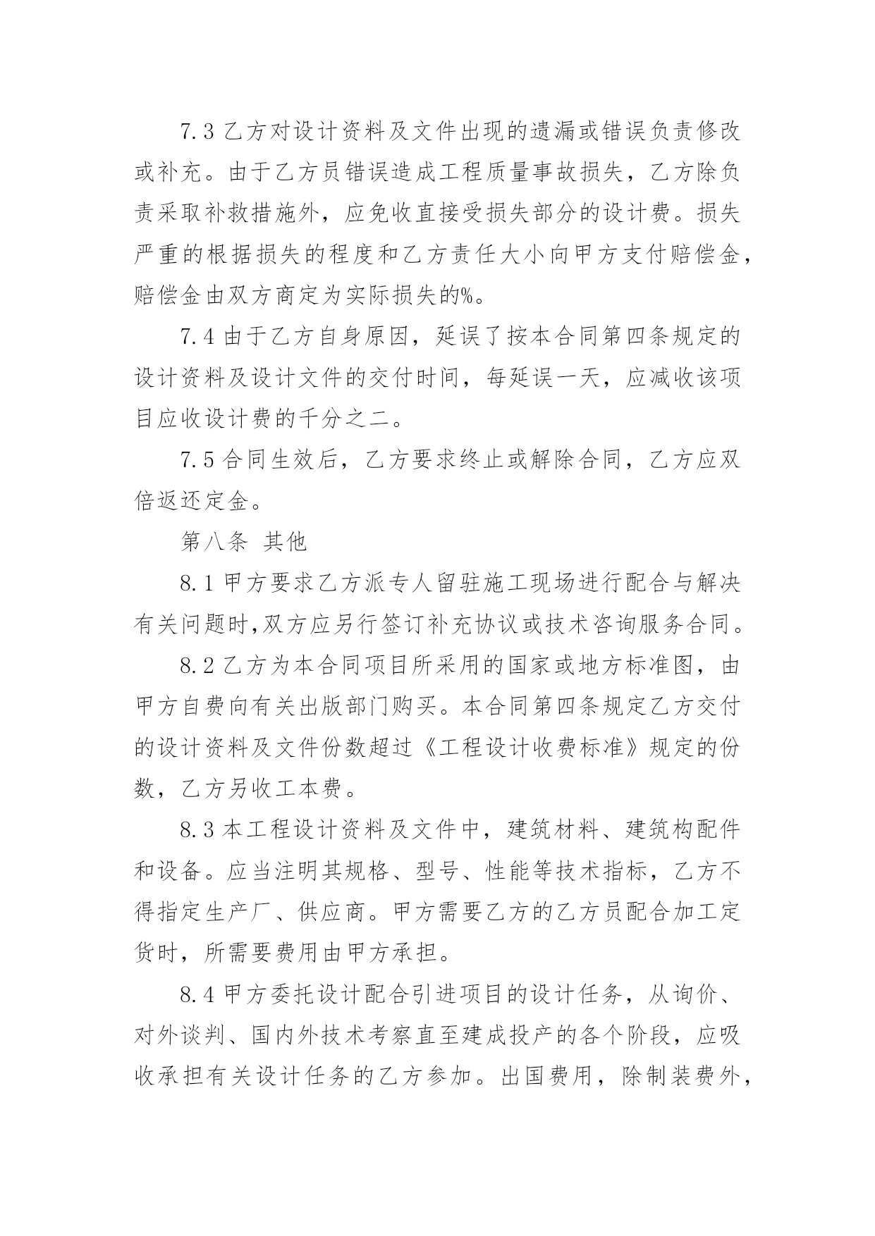 设计合同【热门】设计合同范文集合7篇在人们愈发重视契约的社会中,合同出现在我们生活中的次数越来越多,签订合同是为了保障双方的利益,避免不必要的争端。那么制定合同书有什么需要注意的呢?下面是小编帮大家整理的设计合同7篇,仅供参考,欢迎大家阅读。设计合同篇1甲方:(以上简称甲方)乙方:(以上简称甲方)甲方主要负责工程施工,现联合体已与兰州新区城投公司签订了市政道路工程项目合同。现经甲乙双方协商一致,甲方将承包施工的市政道路工程的沥青分项部分交与乙方施工,为明确各自的权力和义务,签订本合同。1、在同等价格,相同质量的前提下,甲方将沥青分项业务交与乙方施工,并由乙方负责沥青搅拌、摊铺等工作。2、质量要求:符合国家祥光标准要求和设计要求及新区管委会、新区城投公司的相关要求。必须使用克拉玛依沥青,不得偷工减料。3、分项工程费用:粗粒料、中粒料1200元/立方米、含全部所需机械、人工、燃油(煤)、水电费及摊铺、压实等费用,透层油、粘层油、纤维、清扫基层等费用包括在沥青费等用中,不另计算。工程量按设计量计算(不含税、不含施工资料)。4、付款方式:在甲方要求施工前10天付预计工程费用的20%,每完成一层,付完成工程的70%,余款待工程全部完成后年底前付90%,剩余5%保证金扣留时间为6个月,5%待BT模式到期全部付清。如甲方不能按约定付款,每延期一天支付乙方违约部分的万分之二违约金。沥青由甲方采购的,则沥青付款抵扣工程款。5、乙方应保证加工的`沥青混凝土质量和摊铺质量,如发生质量问题(加工质量、摊铺质量)均由乙方负责,并无条件返工至合格。所造成的损失全部由乙方承担。6、乙方应合理安排沥青施工工序,保证施工能按甲方的要求按时完成,如遇二家单位同时施工时,乙方应保证优先满足甲方的要求。因乙方原因不能满足甲方时间要求,乙方应承担由此给甲方造成的损失。同时甲方将选择其他单位施工沥青项。7、工程实际施工时,因原材料价格发生变动,分项价格由甲乙双方本平等互利的原则协商确定。如有其他单位在同等条件下价格低于本协议书约定价格,甲方应先征求乙方是否同意以同等价格施工。如乙方不同意,甲方可将工作交与其他单位施工。同时不承担由此给乙方造成的损失。8、其它未尽事宜,双方应本着平等、互利的原则协商处理。本合同一式两分,双方各执一份。甲方(公章):_________乙方(公章):_________法定代表人(签字):_________法定代表人(签字):__________________年____月____日_________年____月____日设计合同篇2委托方:(以下简称甲方)设计方:(以下简称乙方)根据《中华人民共和国经济合同法》、《工程勘察设计收费标准》和有关法律、法规规定,结合本公司所具有技术水准及本工程具体情况,本着精益求精、精诚合作的原则,甲乙双方就该工程室内装饰设计事宜达成如下协议:一、工程概况:1.工程地点:2.建筑面积:3.使用性质:4.房屋结构:二、设计程序:1.甲乙双方经协商设计费按套内建筑面积M2×元/M2计取。阁楼设计费按套内建筑面积(如要求特别创意的按套内建筑面积计算,非特别创意的按一半的套内建筑面积计算。)M2×元/M2计取,设计费总计元。2.设计协议签订后,即由甲方付与乙方方案设计定金为总设计费的%,即元。3.乙方在收到甲方提供的有关图纸,对工程进行实地勘测后在天内,提出设计构想,形成设计方案平面图,创意透视草图,由甲方审阅。4.在甲方确认平面方案图并支付施工图设计费即总设计费的%元后,乙方在天内完成施工图设计,包括平面布置图,天花平面图,效果图(共公区域效果图一张),立、剖面图等。5.施工图由甲方负责确认,确认后甲方在索取图纸时,须支付尾款,即设计费的%元。6.甲方如需乙方提供2个区域以上的效果图应事先说明,并应于方案设计前付清效果图成本费(效果图元/张)。现甲方要求绘制部位效果图张,总计元。7.施工图由甲方签字确认后,并由乙方盖好公司公章后,施工图才算正式有效。否则应为无效,乙方不对所有施工图负责。8.其它约定:三、双方责任:甲方责任:1.甲方保证提交的资料真实有效,若提交的资料错误或变更,引起设计修改,须另付修改费。2.在合同履行期间,甲方要求终止或解除合同,甲方应书面通知乙方,乙方未开始设计工作的,不退还甲方已付的定金;已开始设计的,甲方应根据乙方已进行的实际工作量,不足一半时,按该阶段设计费的一半支付;超过一半时,按该阶段设计费的全部支付。3.事先经甲乙双方确认的方案,在施工中途甲方提出2次以上的修改,乙方工作量相应增加设计费。4.对未经甲方确认的,或未付清设计费的图纸均不能外带。5.施工中,甲方要求更改设计图纸必须经乙方同意。如甲方提出的修改图纸影响房屋结构或装修内部结构,乙方不同意修改,而甲方执意要改的,其一切后果均