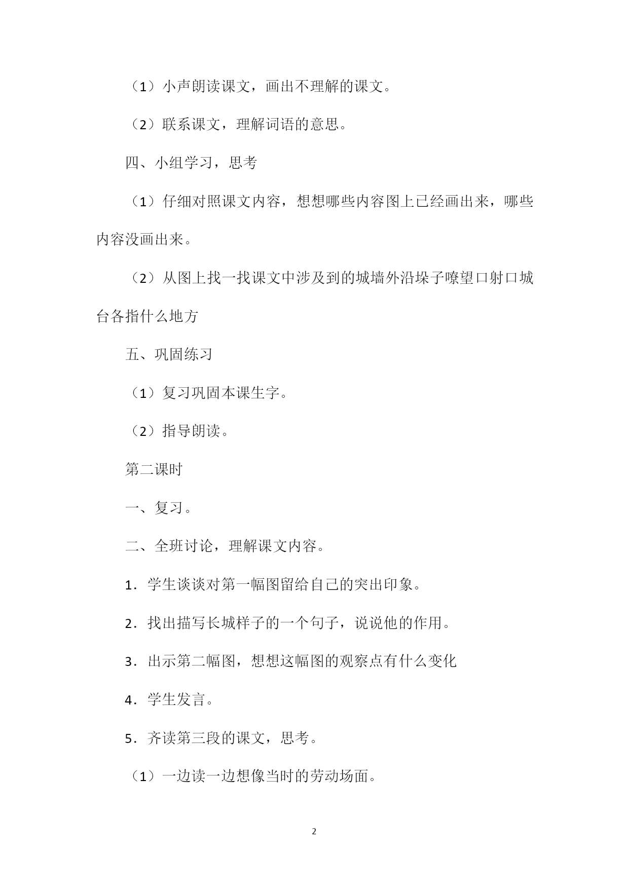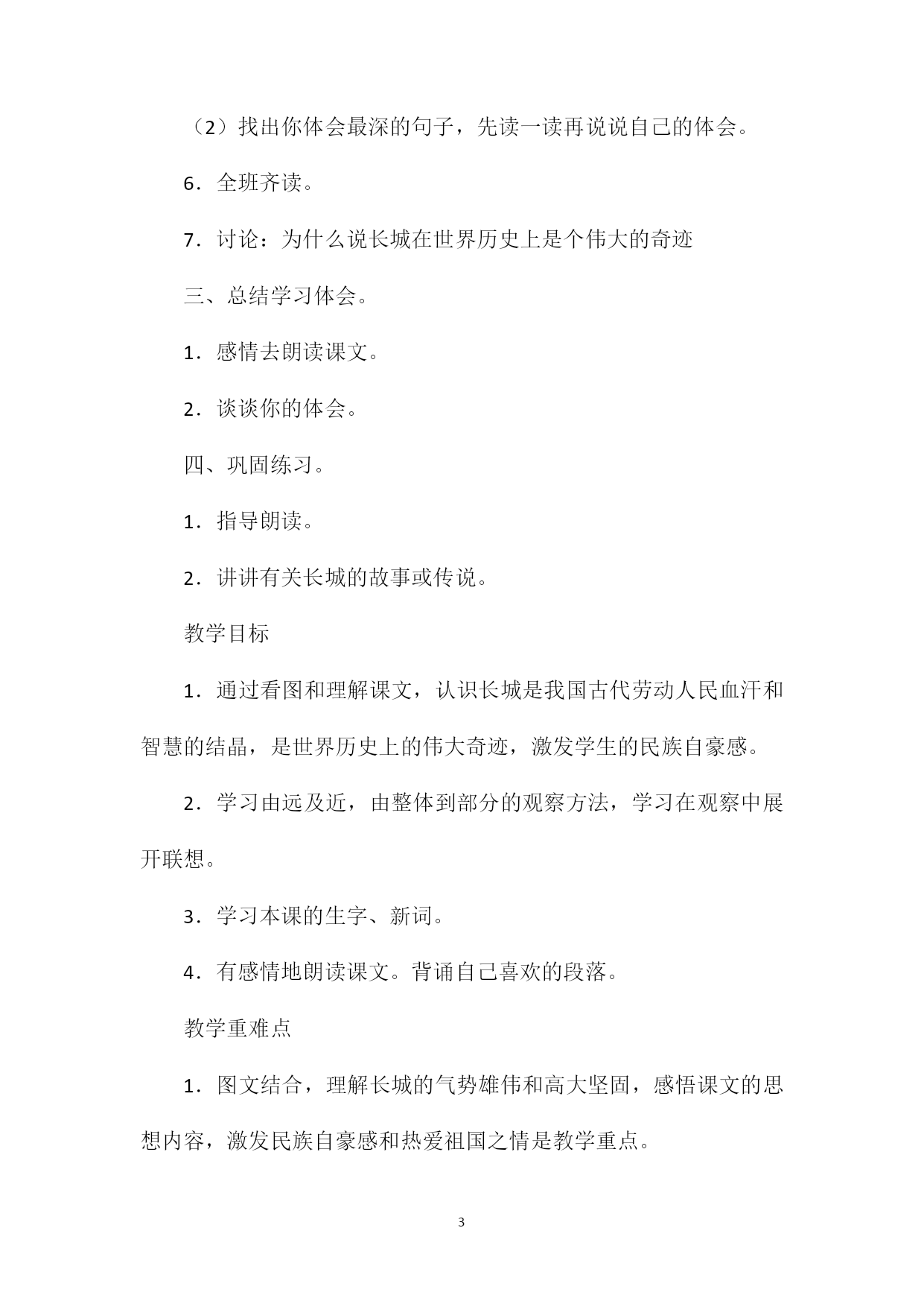 PAGEPAGE4《长城》教学第一课时一、导入新课1.学生谈谈对长城的认识。2.学生自由补充。3.老师给以肯定。二、学习生字1.学习会认的字。2.学习会写的字。3.学生书写。三、出示图画,边看边说(1)说说这幅图是从什么地方观察长城的看到的景物是什么(2)从图上你还看到什么(3)小组讨论,并说说。2.出示第二幅图(1)这幅图与第一幅图有什么不同(2)从图上你看到了什么3.对照课文,读课文。(1)小声朗读课文,画出不理解的课文。(2)联系课文,理解词语的意思。四、小组学习,思考(1)仔细对照课文内容,想想哪些内容图上已经画出来,哪些内容没画出来。(2)从图上找一找课文中涉及到的城墙外沿垛子嘹望口射口城台各指什么地方五、巩固练习(1)复习巩固本课生字。(2)指导朗读。第二课时一、复习。二、全班讨论,理解课文内容。1.学生谈谈对第一幅图留给自己的突出印象。2.找出描写长城样子的一个句子,说说他的作用。3.出示第二幅图,想想这幅图的观察点有什么变化4.学生发言。5.齐读第三段的课文,思考。(1)一边读一边想像当时的劳动场面。(2)找出你体会最深的句子,先读一读再说说自己的体会。6.全班齐读。7.讨论:为什么说长城在世界历史上是个伟大的奇迹三、总结学习体会。1.感情去朗读课文。2.谈谈你的体会。四、巩固练习。1.指导朗读。2.讲讲有关长城的故事或传说。教学目标1.通过看图和理解课文,认识长城是我国古代劳动人民血汗和智慧的结晶,是世界历史上的伟大奇迹,激发学生的民族自豪感。2.学习由远及近,由整体到部分的观察方法,学习在观察中展开联想。3.学习本课的生字、新词。4.有感情地朗读课文。背诵自己喜欢的段落。教学重难点1.图文结合,理解长城的气势雄伟和高大坚固,感悟课文的思想内容,激发民族自豪感和热爱祖国之情是教学重点。2.展开想象,体会作者所表达的思想感情是教学难点。