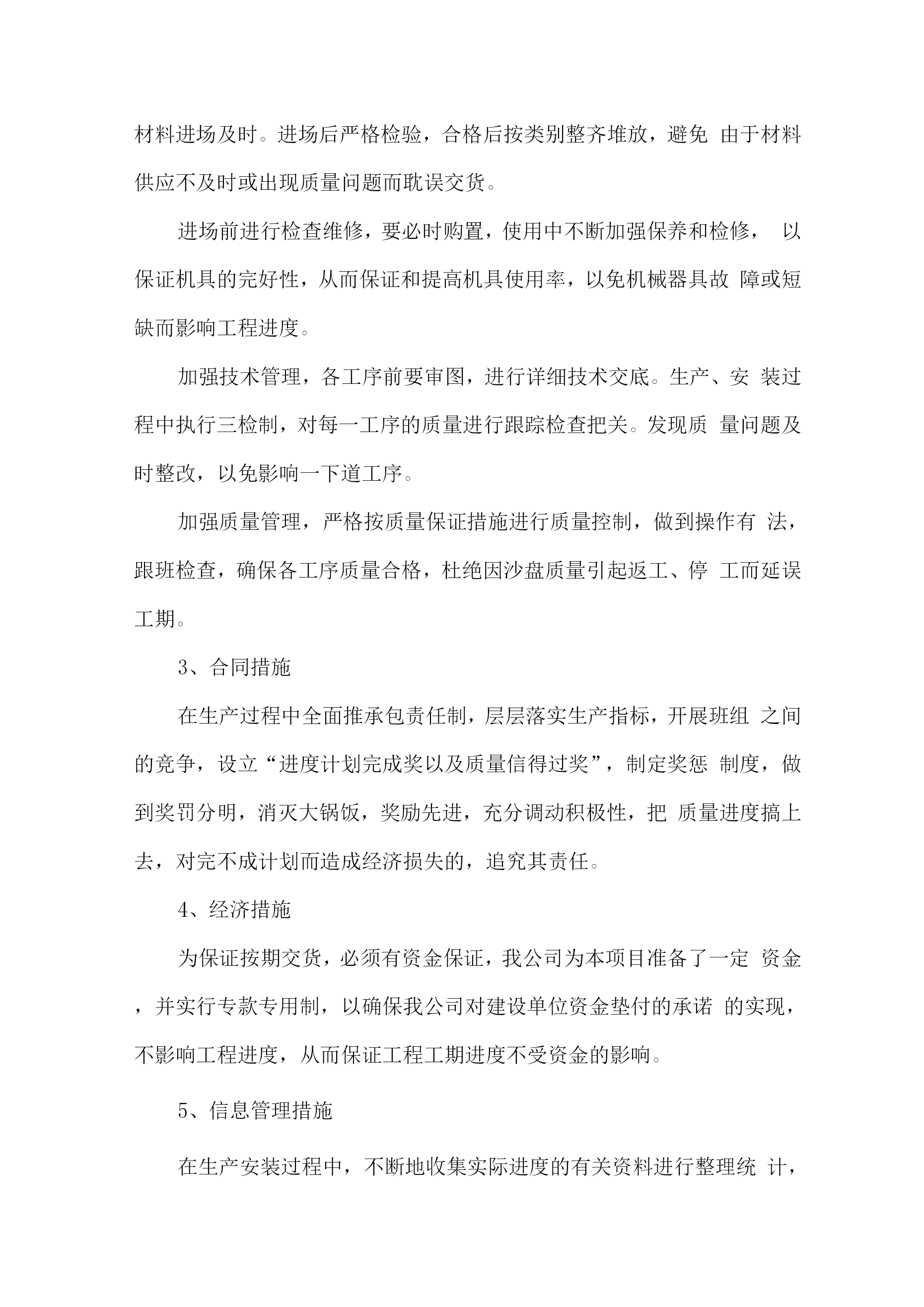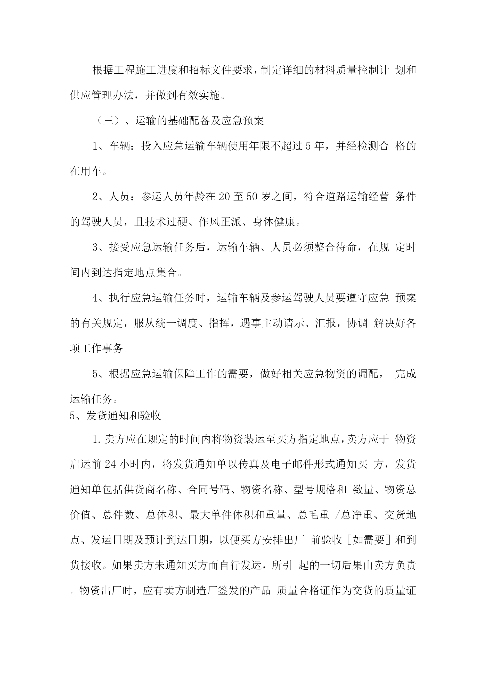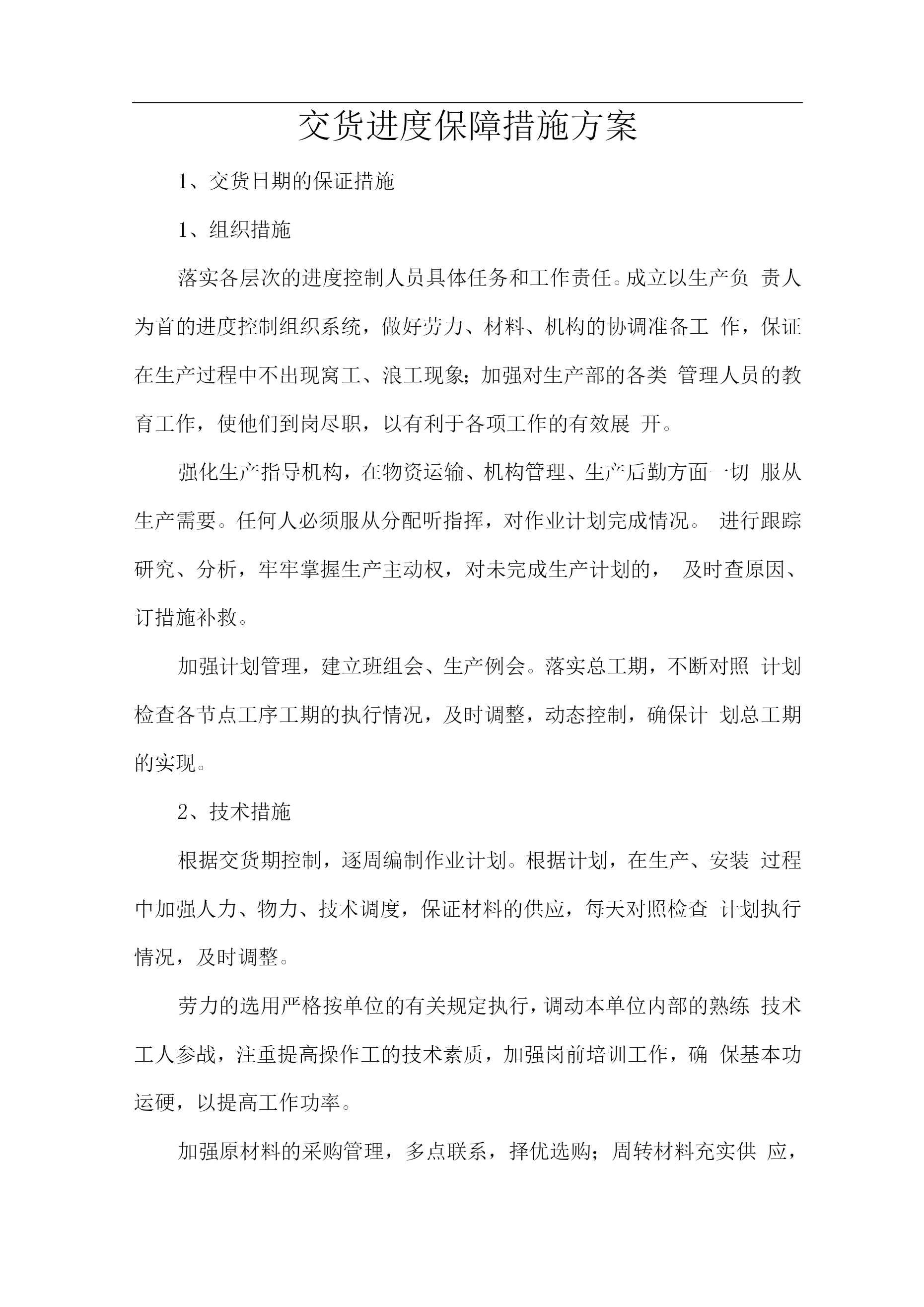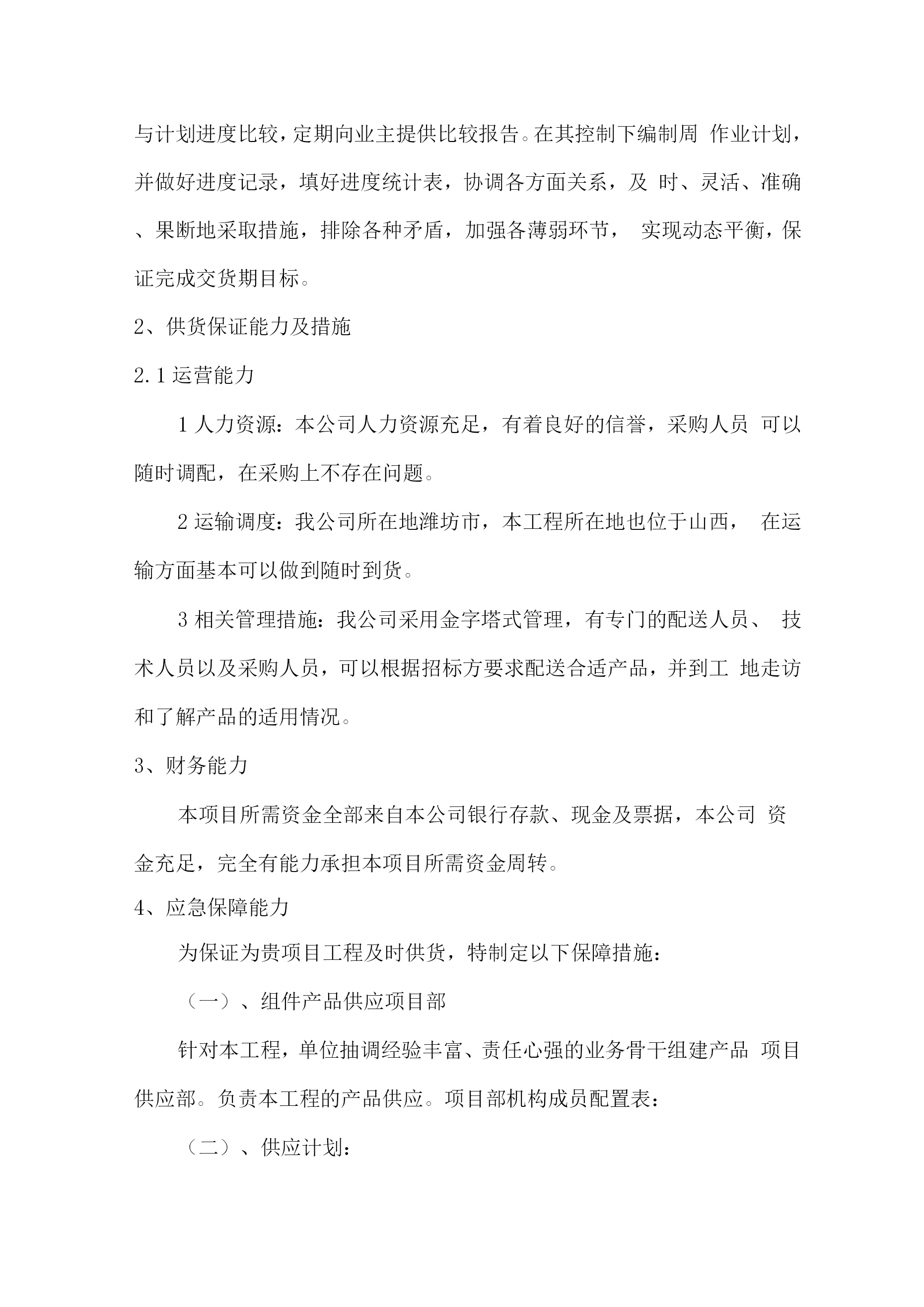 交货进度保障措施方案1、交货日期的保证措施1、组织措施落实各层次的进度控制人员具体任务和工作责任。成立以生产负责人为首的进度控制组织系统,做好劳力、材料、机构的协调准备工作,保证在生产过程中不出现窝工、浪工现象;加强对生产部的各类管理人员的教育工作,使他们到岗尽职,以有利于各项工作的有效展开。强化生产指导机构,在物资运输、机构管理、生产后勤方面一切服从生产需要。任何人必须服从分配听指挥,对作业计划完成情况。进行跟踪研究、分析,牢牢掌握生产主动权,对未完成生产计划的,及时查原因、订措施补救。加强计划管理,建立班组会、生产例会。落实总工期,不断对照计划检查各节点工序工期的执行情况,及时调整,动态控制,确保计划总工期的实现。2、技术措施根据交货期控制,逐周编制作业计划。根据计划,在生产、安装过程中加强人力、物力、技术调度,保证材料的供应,每天对照检查计划执行情况,及时调整。劳力的选用严格按单位的有关规定执行,调动本单位内部的熟练技术工人参战,注重提高操作工的技术素质,加强岗前培训工作,确保基本功运硬,以提高工作功率。加强原材料的采购管理,多点联系,择优选购;周转材料充实供应,材料进场及时。进场后严格检验,合格后按类别整齐堆放,避免由于材料供应不及时或出现质量问题而耽误交货。进场前进行检查维修,要必时购置,使用中不断加强保养和检修,以保证机具的完好性,从而保证和提高机具使用率,以免机械器具故障或短缺而影响工程进度。加强技术管理,各工序前要审图,进行详细技术交底。生产、安装过程中执行三检制,对每一工序的质量进行跟踪检查把关。发现质量问题及时整改,以免影响一下道工序。加强质量管理,严格按质量保证措施进行质量控制,做到操作有法,跟班检查,确保各工序质量合格,杜绝因沙盘质量引起返工、停工而延误工期。3、合同措施在生产过程中全面推承包责任制,层层落实生产指标,开展班组之间的竞争,设立“进度计划完成奖以及质量信得过奖”,制定奖惩制度,做到奖罚分明,消灭大锅饭,奖励先进,充分调动积极性,把质量进度搞上去,对完不成计划而造成经济损失的,追究其责任。4、经济措施为保证按期交货,必须有资金保证,我公司为本项目准备了一定资金,并实行专款专用制,以确保我公司对建设单位资金垫付的承诺的实现,不影响工程进度,从而保证工程工期进度不受资金的影响。5、信息管理措施在生产安装过程中,不断地收集实际进度的有关资料进行整理统计,与计划进度比较,定期向业主提供比较报告。在其控制下编制周作业计划,并做好进度记录,填好进度统计表,协调各方面关系,及时、灵活、准确、果断地采取措施,排除各种矛盾,加强各薄弱环节,实现动态平衡,保证完成交货期目标。2、供货保证能力及措施2.1运营能力1人力资源:本公司人力资源充足,有着良好的信誉,采购人员可以随时调配,在采购上不存在问题。2运输调度:我公司所在地潍坊市,本工程所在地也位于山西,在运输方面基本可以做到随时到货。3相关管理措施:我公司采用金字塔式管理,有专门的配送人员、技术人员以及采购人员,可以根据招标方要求配送合适产品,并到工地走访和了解产品的适用情况。3、财务能力本项目所需资金全部来自本公司银行存款、现金及票据,本公司资金充足,完全有能力承担本项目所需资金周转。4、应急保障能力为保证为贵项目工程及时供货,特制定以下保障措施:(一)、组件产品供应项目部针对本工程,单位抽调经验丰富、责任心强的业务骨干组建产品项目供应部。负责本工程的产品供应。项目部机构成员配置表:(二)、供应计划:根据工程施工进度和招标文件要求,制定详细的材料质量控制计划和供应管理办法,并做到有效实施。(三)、运输的基础配备及应急预案1、车辆:投入应急运输车辆使用年限不超过5年,并经检测合格的在用车。2、人员:参运人员年龄在20至50岁之间,符合道路运输经营条件的驾驶人员,且技术过硬、作风正派、身体健康。3、接受应急运输任务后,运输车辆、人员必须整合待命,在规定时间内到达指定地点集合。4、执行应急运输任务时,运输车辆及参运驾驶人员要遵守应急预案的有关规定,服从统一调度、指挥,遇事主动请示、汇报,协调解决好各项工作事务。5、根据应急运输保障工作的需要,做好相关应急物资的调配,完成运输任务。5、发货通知和验收卖方应在规定的时间内将物资装运至买方指定地点,卖方应于物资启运前24小时内,将发货通知单以传真及电子邮件形式通知买方,发货通知单包括供货商名称、合同号码、物资名称、型号规格和数量、物资总价值、总件数、总体积、最大单件体积和重量、总毛重/总净重、交货地点、发运日期及预计到达日期,以便买方安排出厂前验收[如需要]和到货接收。如果卖方未通知买方而自行发运,所引起的一切后果由卖方负责。物资出厂时,应有卖