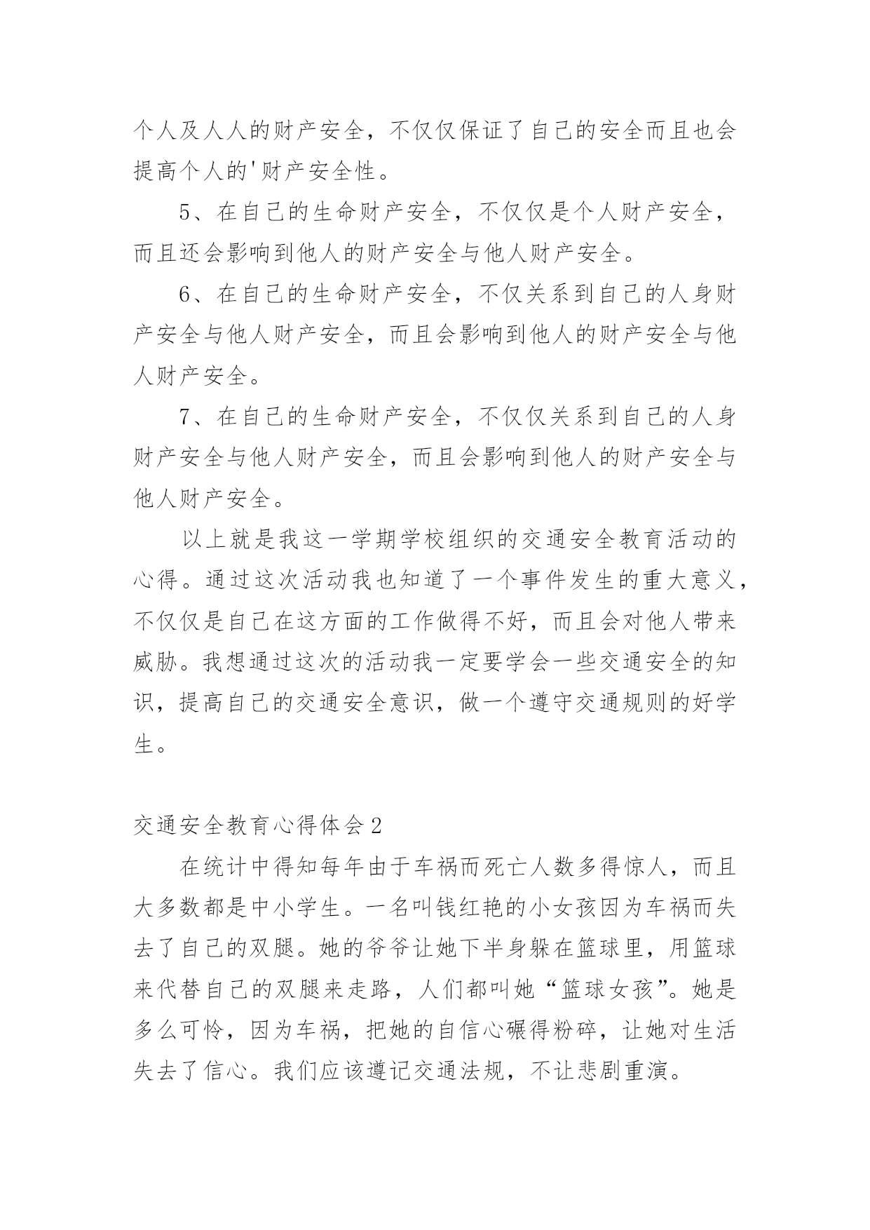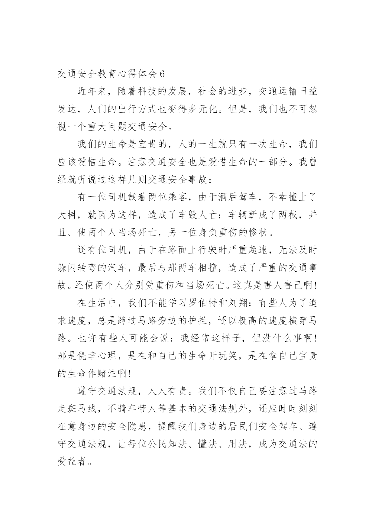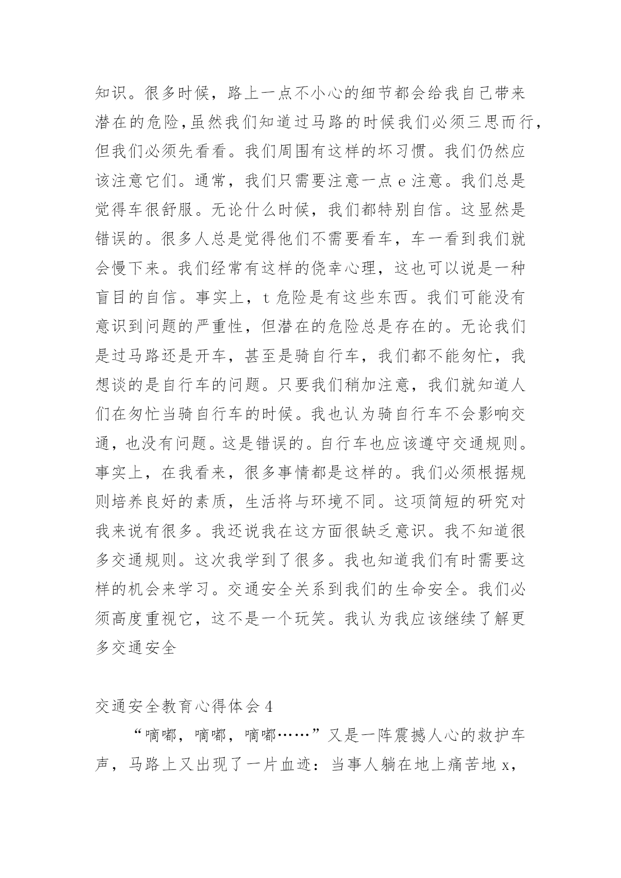 交通安全教育心得体会交通安全教育心得体会集锦15篇当我们备受启迪时,就很有必要写一篇心得体会,这样就可以通过不断总结,丰富我们的思想。那么写心得体会要注意的内容有什么呢?以下是小编为大家整理的交通安全教育心得体会,欢迎大家分享。交通安全教育心得体会1当我们走出校园,来到社会大集体中工作时,就意识到交通安全是一件非常重要的事情了。这是一个关系人生命的重大事情,同时也是一项十分有意义的活动。我觉得学生在交通安全中的主要任务是学会自我保护。1、在交通事故中的交通安全,不仅关系到自己的人身财产安全,同样也会给他带来威胁,对他们而言,这是极不利的。2、在安全的前提条件下,交通工具的正确用法律保护个人及人人的财产安全,不仅仅关系到自身的安全,也会关系到他人的财产安全与他人的财产安全。3、在安全的前提条件下,交通工具的正确用法律保护个人及人的财产安全,不但保证了个人的财产安全,而且还可以提高个人的财产安全性。4、在安全的前提条件下,交通工具的正确用法律保护个人及人人的财产安全,不仅仅保证了自己的安全而且也会提高个人的'财产安全性。5、在自己的生命财产安全,不仅仅是个人财产安全,而且还会影响到他人的财产安全与他人财产安全。6、在自己的生命财产安全,不仅关系到自己的人身财产安全与他人财产安全,而且会影响到他人的财产安全与他人财产安全。7、在自己的生命财产安全,不仅仅关系到自己的人身财产安全与他人财产安全,而且会影响到他人的财产安全与他人财产安全。以上就是我这一学期学校组织的交通安全教育活动的心得。通过这次活动我也知道了一个事件发生的重大意义,不仅仅是自己在这方面的工作做得不好,而且会对他人带来威胁。我想通过这次的活动我一定要学会一些交通安全的知识,提高自己的交通安全意识,做一个遵守交通规则的好学生。交通安全教育心得体会2在统计中得知每年由于车祸而死亡人数多得惊人,而且大多数都是中小学生。一名叫钱红艳的小女孩因为车祸而失去了自己的双腿。她的爷爷让她下半身躲在篮球里,用篮球来代替自己的双腿来走路,人们都叫她“篮球女孩”。她是多么可怜,因为车祸,把她的自信心碾得粉碎,让她对生活失去了信心。我们应该遵记交通法规,不让悲剧重演。在夏天游泳是中小学生最喜爱的活动之一了。而溺水身亡的人数等于每天一个个班级里的一位学生不见。在游泳中我们不能在没有大人的看护下进行比赛,在遇到有人落水时要呼喊大人来帮助,我们还要学会对溺水者进行抢救。只要学会做到这些要求,我们就能在夏天游泳时有保障。不给陌生人开门,也是我们所要牢记的。影片中的小主人公是聪明的,当自家停电陌生人冒充修电工人时,他打给同学电话得知没有停电。又假装和爸爸打,说他马上回家来下走陌生人。我们都应该学习小主人公,当陌生人来时从容镇定,不慌不忙地来应付。我们只要做到遵守交通法规,了解游泳常识,不随便给陌生人开门,我们一定可以拥有安全,更好的来面对崭新的每一天。上帝是公平的也是吝啬的,他只赐予每个人一次生命,所以我们必须珍惜。生活中交通安全与我们的关系是非常密切的,它就像我们的朋友。日日夜夜都守在我们的身边,教育我们,劝戒我们。随着经济的日益发展,马路上车辆川流不息的景象随处可见。然而由于有些人交通安全意识的淡薄,在车水马龙的马路上演了一幕幕不可挽回的悲剧。尤其是今天早上看电影时说到一个六岁的小女孩儿在模仿妈妈横穿马路出事时,作为母亲的我触动很大。想起有时为了所谓的赶时间,闯红灯而孩子还不断的提醒我妈妈要遵守交通规则不能闯红灯,我的.心都缩成一团了。孩子现在安全意识都很强了,但孩子又有很强的模仿能力,我一定不在孩子幼小的心灵上有丝毫投机取巧的意识啊。孩子是社会未来的接班人,他们能否健康成长,关系到民族的兴衰和社会的进步。育人不仅要进行智力教育,还要进行道德、纪律教育。十年树木,百年树人,交通安全宣传教育工作从幼儿学生抓起,使学生从小就接受交通安全知识教育,达到自己教育自己,自己管理自己,养成自觉遵守交通法规的良好习惯,是能达到一代人和一个社会的良好秩序的百年大计。交通安全教育心得体会3交通安全一直是我们必须关注的事情。另一件事是人们对交通安全意识不太敏感。事实上,它与我们的生活密切相关。我们一直都愿意处理这个问题。事实上,我们应该有这样的交通安全意识,这次我学到了很多关于交通的知识安全。我以前没有注意到或不理解的东西正在慢慢加深我的理解。这项研究非常有意义和富有成果。我也希望更多的人学习和理解交通安全,因为当我们学习和理解时,我们会有所收获,通过这种方式,更多的人学习,以及导致交通事故的可能性外国金融机构的安全事故要少得多。三天的学习对我来说意义重大。我缺乏这方面的'知识。当然,我从这次机会中受益匪浅。另一件事是,仍然有很多人缺乏这种交通安全意识,很多时候,我觉得我不知道有那么多事情我需要注意,包括过马路。”