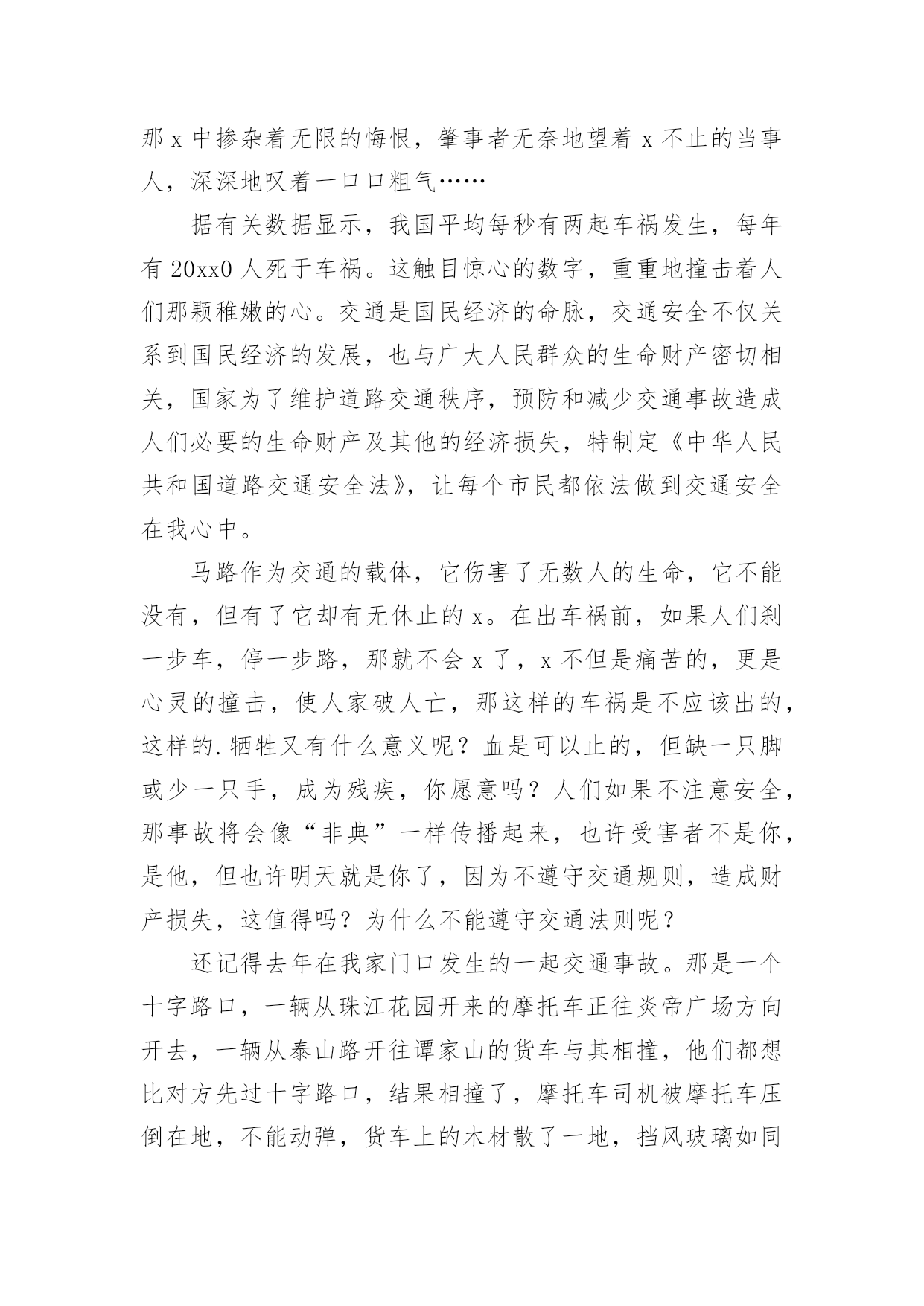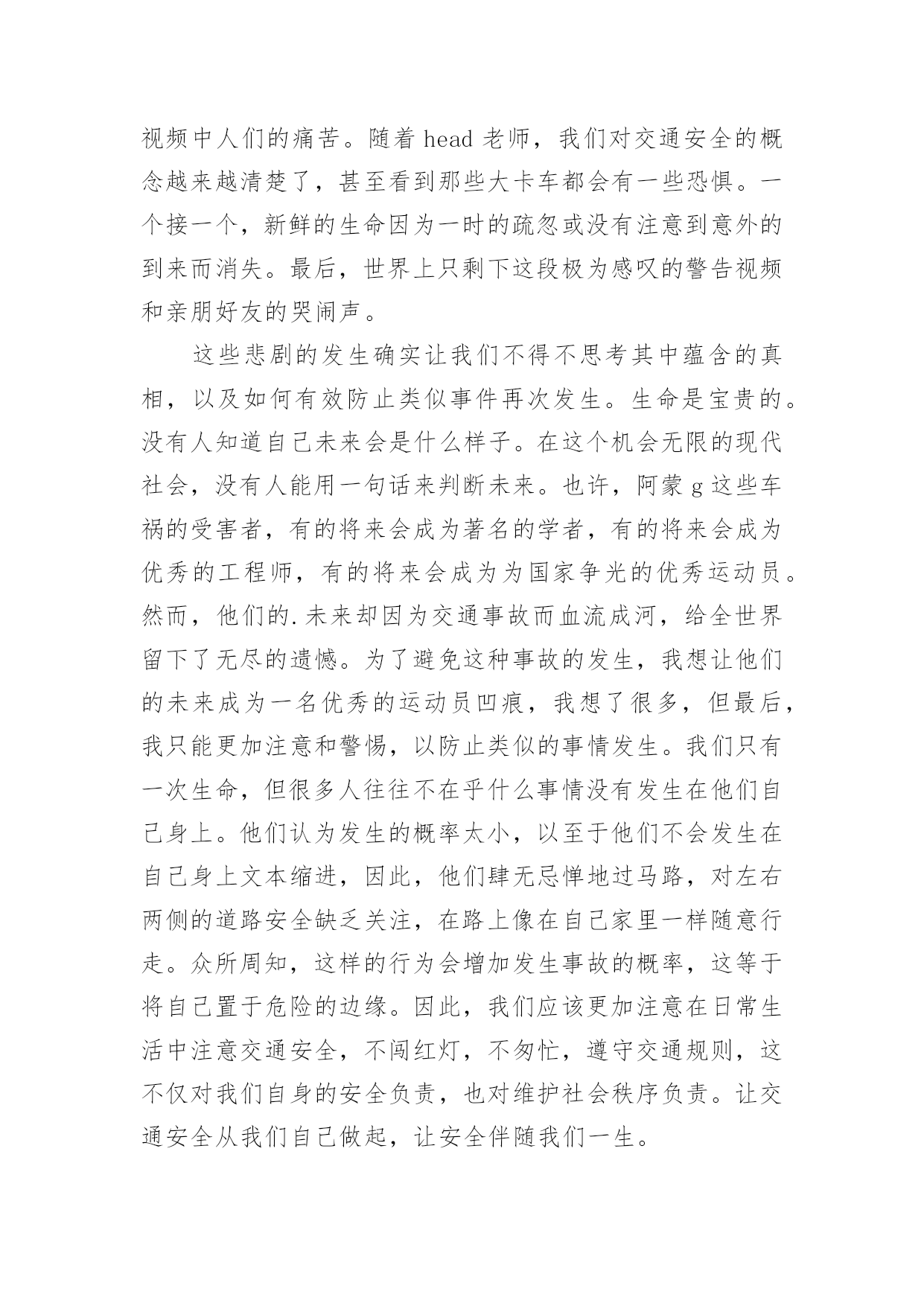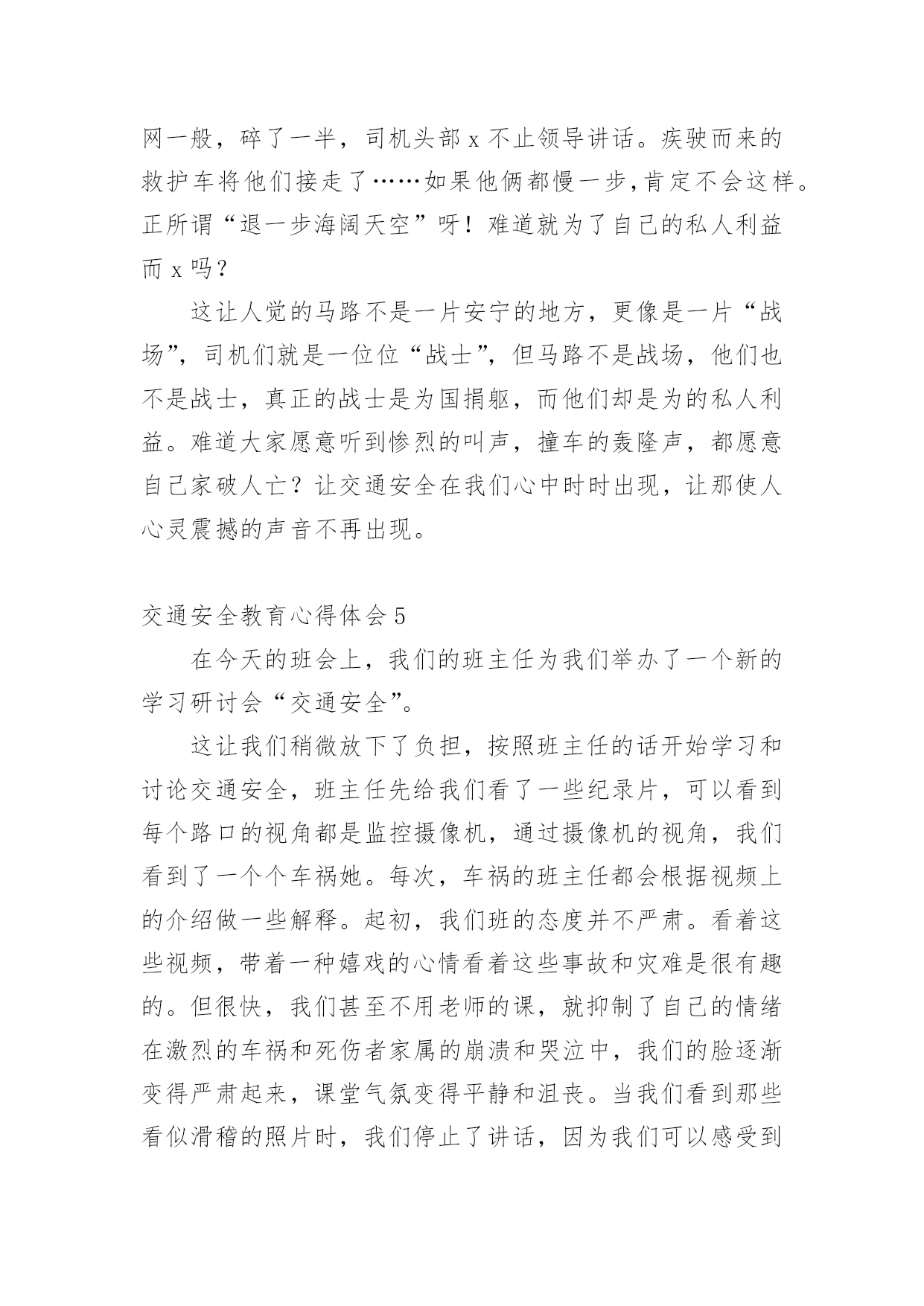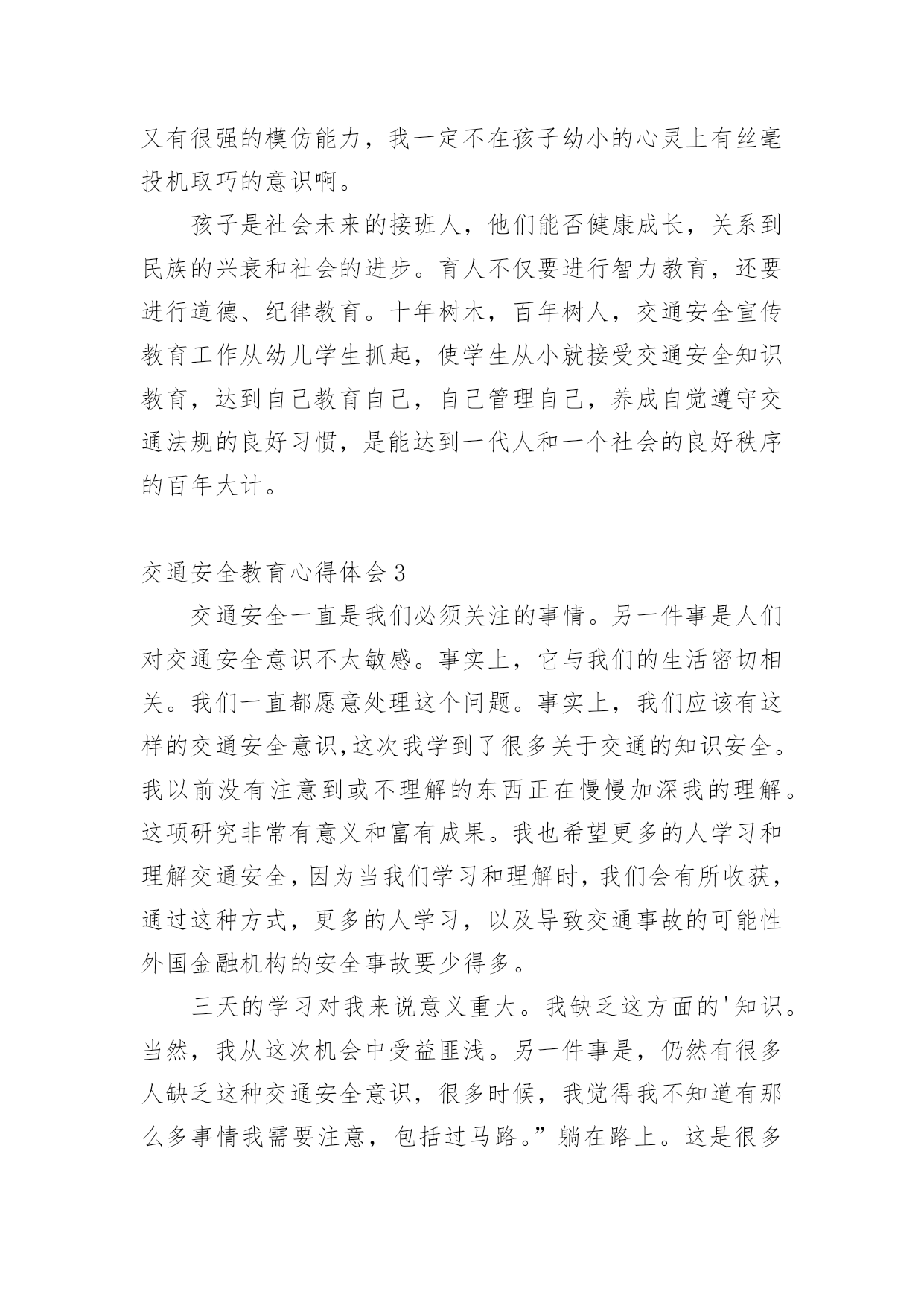 交通安全教育心得体会交通安全教育心得体会集锦15篇当我们备受启迪时,就很有必要写一篇心得体会,这样就可以通过不断总结,丰富我们的思想。那么写心得体会要注意的内容有什么呢?以下是小编为大家整理的交通安全教育心得体会,欢迎大家分享。交通安全教育心得体会1当我们走出校园,来到社会大集体中工作时,就意识到交通安全是一件非常重要的事情了。这是一个关系人生命的重大事情,同时也是一项十分有意义的活动。我觉得学生在交通安全中的主要任务是学会自我保护。1、在交通事故中的交通安全,不仅关系到自己的人身财产安全,同样也会给他带来威胁,对他们而言,这是极不利的。2、在安全的前提条件下,交通工具的正确用法律保护个人及人人的财产安全,不仅仅关系到自身的安全,也会关系到他人的财产安全与他人的财产安全。3、在安全的前提条件下,交通工具的正确用法律保护个人及人的财产安全,不但保证了个人的财产安全,而且还可以提高个人的财产安全性。4、在安全的前提条件下,交通工具的正确用法律保护个人及人人的财产安全,不仅仅保证了自己的安全而且也会提高个人的'财产安全性。5、在自己的生命财产安全,不仅仅是个人财产安全,而且还会影响到他人的财产安全与他人财产安全。6、在自己的生命财产安全,不仅关系到自己的人身财产安全与他人财产安全,而且会影响到他人的财产安全与他人财产安全。7、在自己的生命财产安全,不仅仅关系到自己的人身财产安全与他人财产安全,而且会影响到他人的财产安全与他人财产安全。以上就是我这一学期学校组织的交通安全教育活动的心得。通过这次活动我也知道了一个事件发生的重大意义,不仅仅是自己在这方面的工作做得不好,而且会对他人带来威胁。我想通过这次的活动我一定要学会一些交通安全的知识,提高自己的交通安全意识,做一个遵守交通规则的好学生。交通安全教育心得体会2在统计中得知每年由于车祸而死亡人数多得惊人,而且大多数都是中小学生。一名叫钱红艳的小女孩因为车祸而失去了自己的双腿。她的爷爷让她下半身躲在篮球里,用篮球来代替自己的双腿来走路,人们都叫她“篮球女孩”。她是多么可怜,因为车祸,把她的自信心碾得粉碎,让她对生活失去了信心。我们应该遵记交通法规,不让悲剧重演。在夏天游泳是中小学生最喜爱的活动之一了。而溺水身亡的人数等于每天一个个班级里的一位学生不见。在游泳中我们不能在没有大人的看护下进行比赛,在遇到有人落水时要呼喊大人来帮助,我们还要学会对溺水者进行抢救。只要学会做到这些要求,我们就能在夏天游泳时有保障。不给陌生人开门,也是我们所要牢记的。影片中的小主人公是聪明的,当自家停电陌生人冒充修电工人时,他打给同学电话得知没有停电。又假装和爸爸打,说他马上回家来下走陌生人。我们都应该学习小主人公,当陌生人来时从容镇定,不慌不忙地来应付。我们只要做到遵守交通法规,了解游泳常识,不随便给陌生人开门,我们一定可以拥有安全,更好的来面对崭新的每一天。上帝是公平的也是吝啬的,他只赐予每个人一次生命,所以我们必须珍惜。生活中交通安全与我们的关系是非常密切的,它就像我们的朋友。日日夜夜都守在我们的身边,教育我们,劝戒我们。随着经济的日益发展,马路上车辆川流不息的景象随处可见。然而由于有些人交通安全意识的淡薄,在车水马龙的马路上演了一幕幕不可挽回的悲剧。尤其是今天早上看电影时说到一个六岁的小女孩儿在模仿妈妈横穿马路出事时,作为母亲的我触动很大。想起有时为了所谓的赶时间,闯红灯而孩子还不断的提醒我妈妈要遵守交通规则不能闯红灯,我的.心都缩成一团了。孩子现在安全意识都很强了,但孩子又有很强的模仿能力,我一定不在孩子幼小的心灵上有丝毫投机取巧的意识啊。孩子是社会未来的接班人,他们能否健康成长,关系到民族的兴衰和社会的进步。育人不仅要进行智力教育,还要进行道德、纪律教育。十年树木,百年树人,交通安全宣传教育工作从幼儿学生抓起,使学生从小就接受交通安全知识教育,达到自己教育自己,自己管理自己,养成自觉遵守交通法规的良好习惯,是能达到一代人和一个社会的良好秩序的百年大计。交通安全教育心得体会3交通安全一直是我们必须关注的事情。另一件事是人们对交通安全意识不太敏感。事实上,它与我们的生活密切相关。我们一直都愿意处理这个问题。事实上,我们应该有这样的交通安全意识,这次我学到了很多关于交通的知识安全。我以前没有注意到或不理解的东西正在慢慢加深我的理解。这项研究非常有意义和富有成果。我也希望更多的人学习和理解交通安全,因为当我们学习和理解时,我们会有所收获,通过这种方式,更多的人学习,以及导致交通事故的可能性外国金融机构的安全事故要少得多。三天的学习对我来说意义重大。我缺乏这方面的'知识。当然,我从这次机会中受益匪浅。另一件事是,仍然有很多人缺乏这种交通安全意识,很多时候,我觉得我不知道有那么多事情我需要注意,包括过马路。”