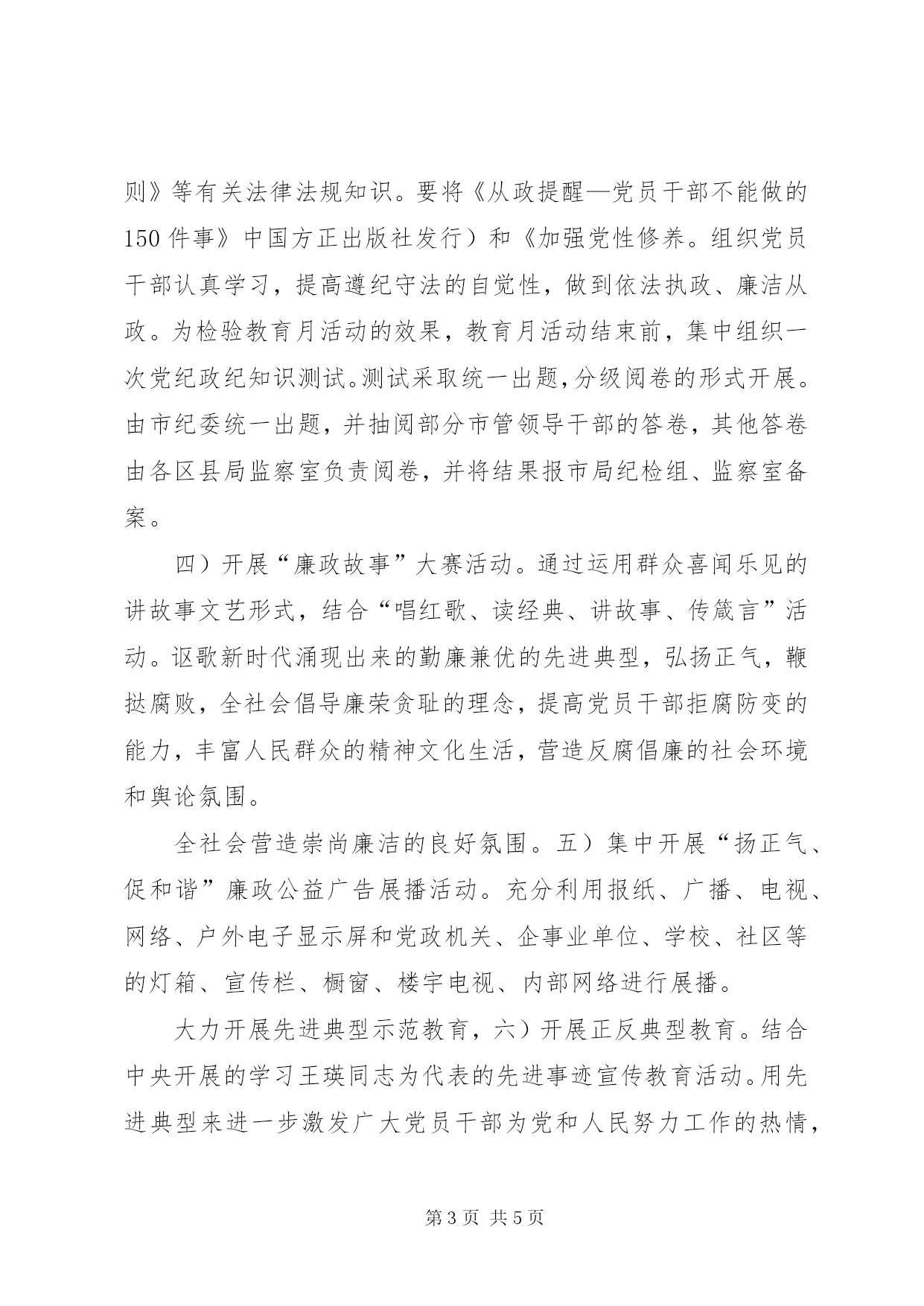 第PAGE\*Arabic\*MERGEFORMAT5页共NUMPAGES\*MERGEFORMAT5页工商局开展党性修养教育方案继续推进党风廉政建设和反腐败斗争,为认真贯彻落实总书记在第中央纪委第三次全会上发表的重要讲话精神。按照市纪委、市委组织部、市委宣传部《关于在全市开展“加强党性修养,弘扬优良作风”主题教育月活动的通知》渝纪发〔〕21号)要求,结合全市工商系统工作实际,特制定本方案。一、指导思想通过开展“加强党性修养,坚持以邓小平理论和“三个代表”重要思想为指导。弘扬优良作风”主题教育月活动,进一步加强领导干部党性党风党纪教育,使各级领导干部牢固树立和弘扬党的优良作风,始终保持共产党人的政治本色,发扬党的光荣传统,树立和坚持正确的事业观、工作观、政绩观,以优良作风带领广大党员、群众迎难而上、锐意改革、共克时艰,为深入贯彻落实科学发展观、夺取全面建设小康社会新胜利、开创中国特色社会主义事业新局面提供有力保证。二、活动时间年6月。三、活动主体区县(自治县)延伸到科级党员领导干部。重点是副处级以上党员领导干部。四、活动内容一)进一步把思想和行动统一到同志重要讲话精神上来,学习总书记在第中央纪委第三次全会上的重要讲话。各级党组织要集中组织广大党员干部认真学习总书记在第中央纪委第三次全会上的重要讲话。通过学习。进一步提高做好工作的自觉性和责任感,以党风廉政建设和反腐败斗争的新成效取信于民,为全面落实“314总体部署、贯彻《国务院关于推进市统筹城乡改革和发展的若干意见》国发〔〕3号)加快“五个”建设提供有力思想政治保证。二)以“做党的忠诚卫士、当群众的贴心人”为主题,全市纪检监察系统进一步开展“做党的忠诚卫士、当群众的贴心人”主题实践活动。各级纪检监察组织要结合教育月活动的开展。统一思想、乘势而上,扎扎实实把主题实践活动推向深入。要围绕中心任务、紧扣业务工作,紧密联系工作实际和干部队伍建设实际,进一步提出加强自身建设的办法和措施,把“做党的忠诚卫士、当群众的贴心人”和“四个对”要求真正落实到纪检监察工作各个方面、转化为每个纪检监察干部的自觉追求和实际行动。三)弘扬优良作风”主题教育学习读本》由市纪委编印配发)作为主要教材,开展党纪政纪知识的学习教育活动并集中组织一次党纪政纪知识测试。组织广大党员干部特别是党员领导干部重点学习《中国共产党党章》公务员法》中国共产党纪律处分条例》中国共产党党内监督条例(试行)和《领导干部廉洁从政若干准则》等有关法律法规知识。要将《从政提醒—党员干部不能做的150件事》中国方正出版社发行)和《加强党性修养。组织党员干部认真学习,提高遵纪守法的自觉性,做到依法执政、廉洁从政。为检验教育月活动的效果,教育月活动结束前,集中组织一次党纪政纪知识测试。测试采取统一出题,分级阅卷的形式开展。由市纪委统一出题,并抽阅部分市管领导干部的答卷,其他答卷由各区县局监察室负责阅卷,并将结果报市局纪检组、监察室备案。四)开展“廉政故事”大赛活动。通过运用群众喜闻乐见的讲故事文艺形式,结合“唱红歌、读经典、讲故事、传箴言”活动。讴歌新时代涌现出来的勤廉兼优的先进典型,弘扬正气,鞭挞腐败,全社会倡导廉荣贪耻的理念,提高党员干部拒腐防变的能力,丰富人民群众的精神文化生活,营造反腐倡廉的社会环境和舆论氛围。全社会营造崇尚廉洁的良好氛围。五)集中开展“扬正气、促和谐”廉政公益广告展播活动。充分利用报纸、广播、电视、网络、户外电子显示屏和党政机关、企事业单位、学校、社区等的灯箱、宣传栏、橱窗、楼宇电视、内部网络进行展播。大力开展先进典型示范教育,六)开展正反典型教育。结合中央开展的学习王瑛同志为代表的先进事迹宣传教育活动。用先进典型来进一步激发广大党员干部为党和人民努力工作的热情,形成学先进、讲奉献、创佳绩的良好风尚。充分利用我市近年来的大案要案开展警示教育,以案明纪、鞭挞腐恶,警钟长鸣、引以为戒,促使领导干部增强道德约束力,树立正确的权力观、地位观和利益观。并取得有效成果,七)开展领导干部“加强党性修养、弘扬优良作风”主题征文评选活动。为确保教育月活动的深入开展。活动期间,市纪委等单位将在全市各级党政机关、人民团体、大型企业和高等院校开展领导干部“加强党性修养,弘扬优良作风”主题征文评选活动。市局监察室将在全系统选送25篇优秀作品参评。市纪委将邀请有关专家组成评审组负责征文评选工作。评选工作将对参评作品按照预审、初评、集中评议、评定的程序进行,逐级淘汰。征文评选设置一等奖10名、二等奖20名、三等奖30名、组织奖10名。优秀作品将在有关媒体上选登并由市纪委结集成册。五、组织领导弘扬优良作风”主题教育月活动是推进党风廉政建设和反腐败斗争的一项重要工作。王兴华组长负责,加强党性修养。人事处、宣教处、监察室按职责分