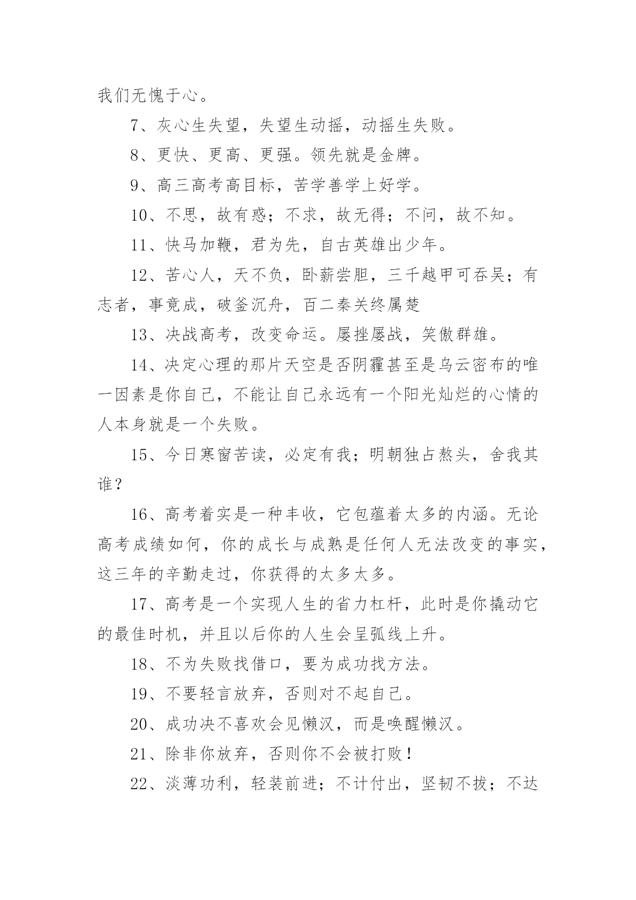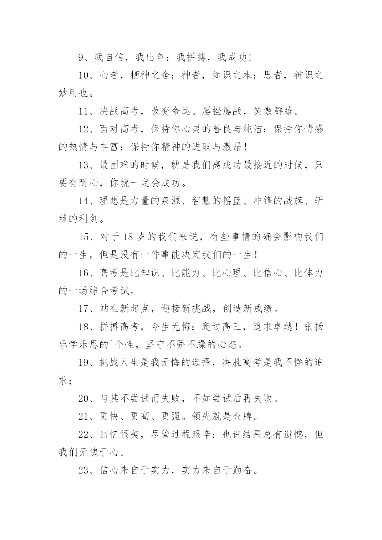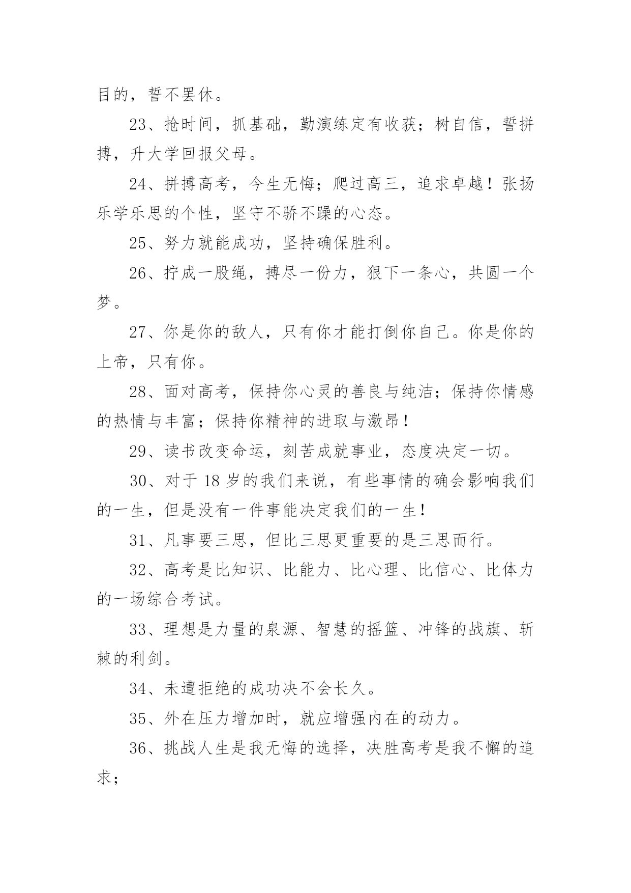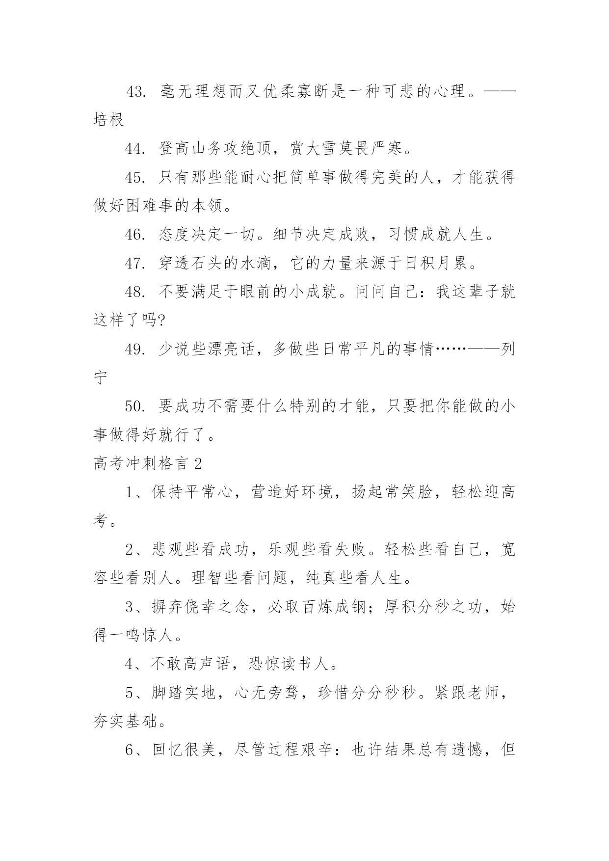 高考冲刺格言高考冲刺格言(6篇)高考冲刺格言11.成大事不在于力量的大小,而在于能坚持多久。——约翰逊2.长命也许不够好,但是美好的生命却够长。——富兰克林3.不作什么决定的意志不是现实的意志;无性格的人从来不做出决定。——黑格尔4.我之所以能在科学上成功,最重要的一点就是对科学的热爱,坚持长期探索。——(英国)达尔文5.一个人即使已登上顶峰,也仍要自强不息。——罗素·贝克6.要在这个世界上获得成功,就必须坚持到底:至死都不能放手。——伏尔泰7.眉毛上的汗水和眉毛下的泪水,你必须选择一样!8.我之所以能,是因为我相信能。9.人类心灵深处,有许多沉睡的力量。唤醒这些人们从未梦想过的力量,巧妙运用,便能彻底改变一生。10.在茫茫沙漠,唯有前时进的脚步才是希望的象征。11.如果一个人不知道他要驶向哪个码头,那么任何风都不会是顺风。12.勤奋的含义是今天的热血,而不是明天的决心,后天的保证。13.我觉得坦途在前,人又何必因了一点小障碍而不走路呢?——鲁迅14.没有人能改变你,别人只能影响你,能改变你的只有你自己。15.生活的道路一旦选定,就要勇敢地走到底,决不回头。16.遇到困难时不要抱怨,既然改变不了过去,那么就努力改变未来。17.每一日你所付出的代价都比前一日高,因为你的生命又消短了一天,所以每一日你都要更积极。18.山高路遥不足惧,最怕贪图安逸心。19.生活的理想,就是为了理想的生活。——张闻天20.拼一个春夏秋冬,换一生无怨无悔。21.言必行,行必果。——《论语》22.美丽的蓝图,落在懒汉手里,也不过是一页废纸。23.人生有世,事业为重。一息尚存,绝不松劲。东风得势,时代更新,趁此机,奋勇前进。——吴玉章24.无论个人环境有何不同,有一点,他们所生活的世界都是由他们自己造成的。25.应该记住,我们的事业,需要的是手,而不是嘴。——童第周26.不举步,越不过栅栏;不迈腿,登不上高山。27.相信就是强大,怀疑只会抑制能力,而信仰就是力量。28.环境永远不会十全十美,消极的人受环境控制,积极的人却控制环境。29.勤奋可以弥补聪明的不足,但聪明无法弥补懒惰的缺陷。30.生命不是要超越别人,而是要超越自己。31.只有满怀自信的人,才能在任何地方都怀有自信地沉浸在生活中,并实现自己的意志。32.不渴望能够一跃千里,只希望每天能够前进一步。33.不参加变革社会的斗争,理想望永远是一种幻影。——吴运铎:《让植根于现实的理想闪闪发光》34.因为有悔,所以披星戴月;因为有梦,所以奋不顾身。35.没有天生的信心,只有不断培养的信心。36.别让过去的失败捆住你的手脚,否则永远难成大事。37.驾驭命运的舵是奋斗。不抱有一丝幻想,不放弃一点机会,不停止一日努力。38.为人类的幸福而劳动,这是多麽壮丽的事业,这个目的有多麽伟大!——圣西门39.当今之世,舍我其谁!40.要成就一件大事业,必须从小事做起。——列宁41.山路曲折盘旋,但毕竟朝着顶峰延伸。42.没有等出来的辉煌;只有走出来的美丽。43.毫无理想而又优柔寡断是一种可悲的心理。——培根44.登高山务攻绝顶,赏大雪莫畏严寒。45.只有那些能耐心把简单事做得完美的人,才能获得做好困难事的本领。46.态度决定一切。细节决定成败,习惯成就人生。47.穿透石头的水滴,它的力量来源于日积月累。48.不要满足于眼前的小成就。问问自己:我这辈子就这样了吗?49.少说些漂亮话,多做些日常平凡的事情……——列宁50.要成功不需要什么特别的才能,只要把你能做的小事做得好就行了。高考冲刺格言21、保持平常心,营造好环境,扬起常笑脸,轻松迎高考。2、悲观些看成功,乐观些看失败。轻松些看自己,宽容些看别人。理智些看问题,纯真些看人生。3、摒弃侥幸之念,必取百炼成钢;厚积分秒之功,始得一鸣惊人。4、不敢高声语,恐惊读书人。5、脚踏实地,心无旁骛,珍惜分分秒秒。紧跟老师,夯实基础。6、回忆很美,尽管过程艰辛:也许结果总有遗憾,但我们无愧于心。7、灰心生失望,失望生动摇,动摇生失败。8、更快、更高、更强。领先就是金牌。9、高三高考高目标,苦学善学上好学。10、不思,故有惑;不求,故无得;不问,故不知。11、快马加鞭,君为先,自古英雄出少年。12、苦心人,天不负,卧薪尝胆,三千越甲可吞吴;有志者,事竟成,破釜沉舟,百二秦关终属楚13、决战高考,改变命运。屡挫屡战,笑傲群雄。14、决定心理的那片天空是否阴霾甚至是乌云密布的唯一因素是你自己,不能让自己永远有一个阳光灿烂的心情的人本身就是一个失败。15、今日寒窗苦读,必定有我;明朝独占熬头,舍我其谁?16、高考着实是一种丰收,它包蕴着太多的内涵。无论高考成绩如何,你的成长与成熟是任何人无法改变的事实,这三年的辛勤走过,你获得的太多太多。17、高考是一个实现人生的省力杠杆,此时是你撬动它