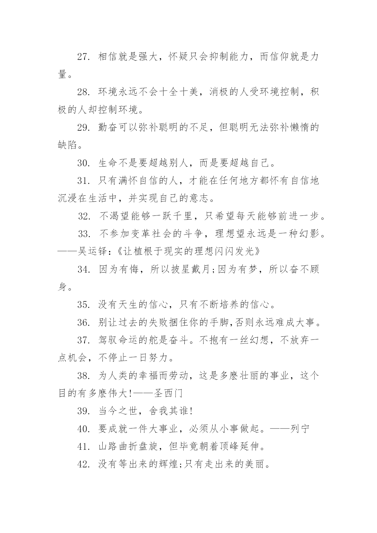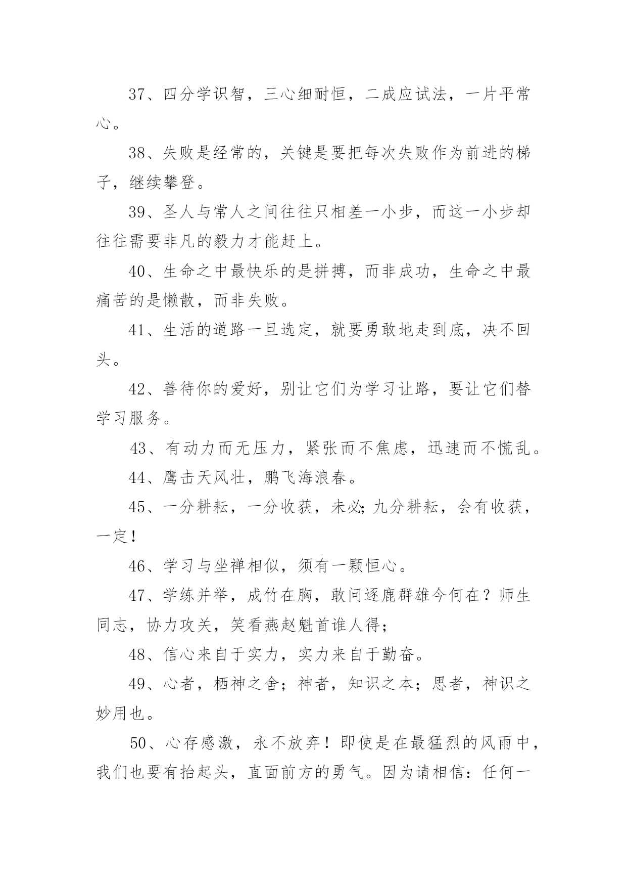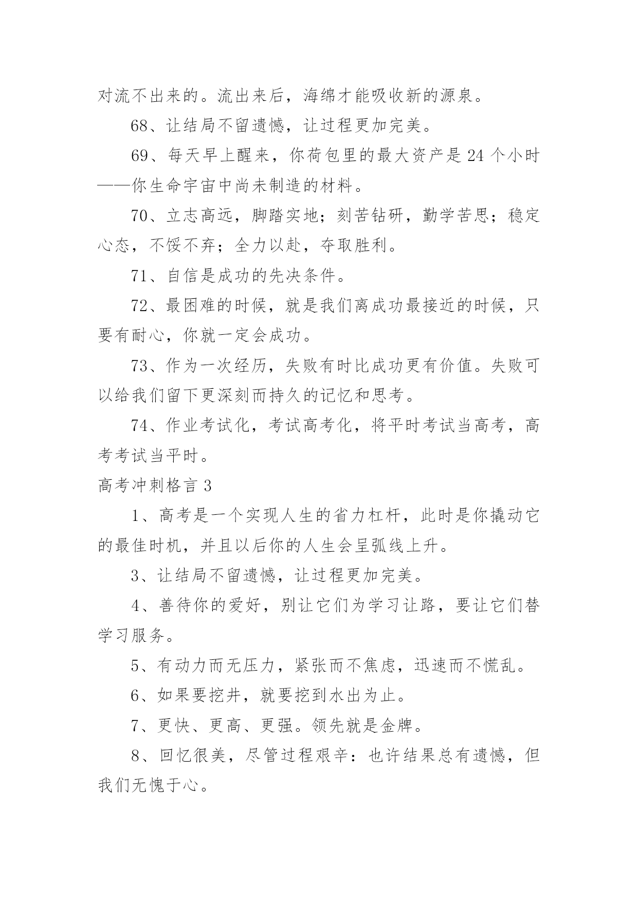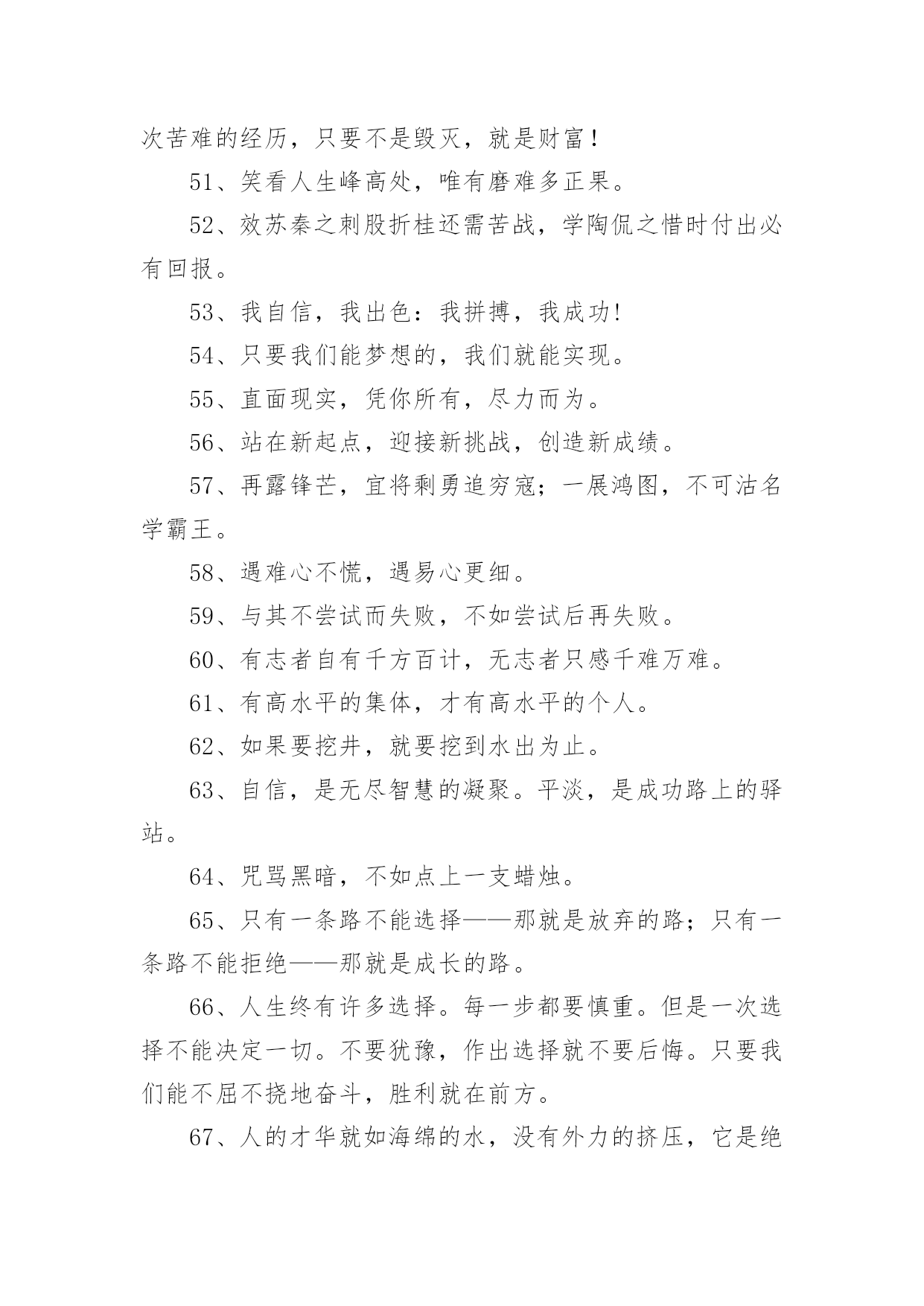 高考冲刺格言高考冲刺格言(6篇)高考冲刺格言11.成大事不在于力量的大小,而在于能坚持多久。——约翰逊2.长命也许不够好,但是美好的生命却够长。——富兰克林3.不作什么决定的意志不是现实的意志;无性格的人从来不做出决定。——黑格尔4.我之所以能在科学上成功,最重要的一点就是对科学的热爱,坚持长期探索。——(英国)达尔文5.一个人即使已登上顶峰,也仍要自强不息。——罗素·贝克6.要在这个世界上获得成功,就必须坚持到底:至死都不能放手。——伏尔泰7.眉毛上的汗水和眉毛下的泪水,你必须选择一样!8.我之所以能,是因为我相信能。9.人类心灵深处,有许多沉睡的力量。唤醒这些人们从未梦想过的力量,巧妙运用,便能彻底改变一生。10.在茫茫沙漠,唯有前时进的脚步才是希望的象征。11.如果一个人不知道他要驶向哪个码头,那么任何风都不会是顺风。12.勤奋的含义是今天的热血,而不是明天的决心,后天的保证。13.我觉得坦途在前,人又何必因了一点小障碍而不走路呢?——鲁迅14.没有人能改变你,别人只能影响你,能改变你的只有你自己。15.生活的道路一旦选定,就要勇敢地走到底,决不回头。16.遇到困难时不要抱怨,既然改变不了过去,那么就努力改变未来。17.每一日你所付出的代价都比前一日高,因为你的生命又消短了一天,所以每一日你都要更积极。18.山高路遥不足惧,最怕贪图安逸心。19.生活的理想,就是为了理想的生活。——张闻天20.拼一个春夏秋冬,换一生无怨无悔。21.言必行,行必果。——《论语》22.美丽的蓝图,落在懒汉手里,也不过是一页废纸。23.人生有世,事业为重。一息尚存,绝不松劲。东风得势,时代更新,趁此机,奋勇前进。——吴玉章24.无论个人环境有何不同,有一点,他们所生活的世界都是由他们自己造成的。25.应该记住,我们的事业,需要的是手,而不是嘴。——童第周26.不举步,越不过栅栏;不迈腿,登不上高山。27.相信就是强大,怀疑只会抑制能力,而信仰就是力量。28.环境永远不会十全十美,消极的人受环境控制,积极的人却控制环境。29.勤奋可以弥补聪明的不足,但聪明无法弥补懒惰的缺陷。30.生命不是要超越别人,而是要超越自己。31.只有满怀自信的人,才能在任何地方都怀有自信地沉浸在生活中,并实现自己的意志。32.不渴望能够一跃千里,只希望每天能够前进一步。33.不参加变革社会的斗争,理想望永远是一种幻影。——吴运铎:《让植根于现实的理想闪闪发光》34.因为有悔,所以披星戴月;因为有梦,所以奋不顾身。35.没有天生的信心,只有不断培养的信心。36.别让过去的失败捆住你的手脚,否则永远难成大事。37.驾驭命运的舵是奋斗。不抱有一丝幻想,不放弃一点机会,不停止一日努力。38.为人类的幸福而劳动,这是多麽壮丽的事业,这个目的有多麽伟大!——圣西门39.当今之世,舍我其谁!40.要成就一件大事业,必须从小事做起。——列宁41.山路曲折盘旋,但毕竟朝着顶峰延伸。42.没有等出来的辉煌;只有走出来的美丽。43.毫无理想而又优柔寡断是一种可悲的心理。——培根44.登高山务攻绝顶,赏大雪莫畏严寒。45.只有那些能耐心把简单事做得完美的人,才能获得做好困难事的本领。46.态度决定一切。细节决定成败,习惯成就人生。47.穿透石头的水滴,它的力量来源于日积月累。48.不要满足于眼前的小成就。问问自己:我这辈子就这样了吗?49.少说些漂亮话,多做些日常平凡的事情……——列宁50.要成功不需要什么特别的才能,只要把你能做的小事做得好就行了。高考冲刺格言21、保持平常心,营造好环境,扬起常笑脸,轻松迎高考。2、悲观些看成功,乐观些看失败。轻松些看自己,宽容些看别人。理智些看问题,纯真些看人生。3、摒弃侥幸之念,必取百炼成钢;厚积分秒之功,始得一鸣惊人。4、不敢高声语,恐惊读书人。5、脚踏实地,心无旁骛,珍惜分分秒秒。紧跟老师,夯实基础。6、回忆很美,尽管过程艰辛:也许结果总有遗憾,但我们无愧于心。7、灰心生失望,失望生动摇,动摇生失败。8、更快、更高、更强。领先就是金牌。9、高三高考高目标,苦学善学上好学。10、不思,故有惑;不求,故无得;不问,故不知。11、快马加鞭,君为先,自古英雄出少年。12、苦心人,天不负,卧薪尝胆,三千越甲可吞吴;有志者,事竟成,破釜沉舟,百二秦关终属楚13、决战高考,改变命运。屡挫屡战,笑傲群雄。14、决定心理的那片天空是否阴霾甚至是乌云密布的唯一因素是你自己,不能让自己永远有一个阳光灿烂的心情的人本身就是一个失败。15、今日寒窗苦读,必定有我;明朝独占熬头,舍我其谁?16、高考着实是一种丰收,它包蕴着太多的内涵。无论高考成绩如何,你的成长与成熟是任何人无法改变的事实,这三年的辛勤走过,你获得的太多太多。17、高考是一个实现人生的省力杠杆,此时是你撬动它