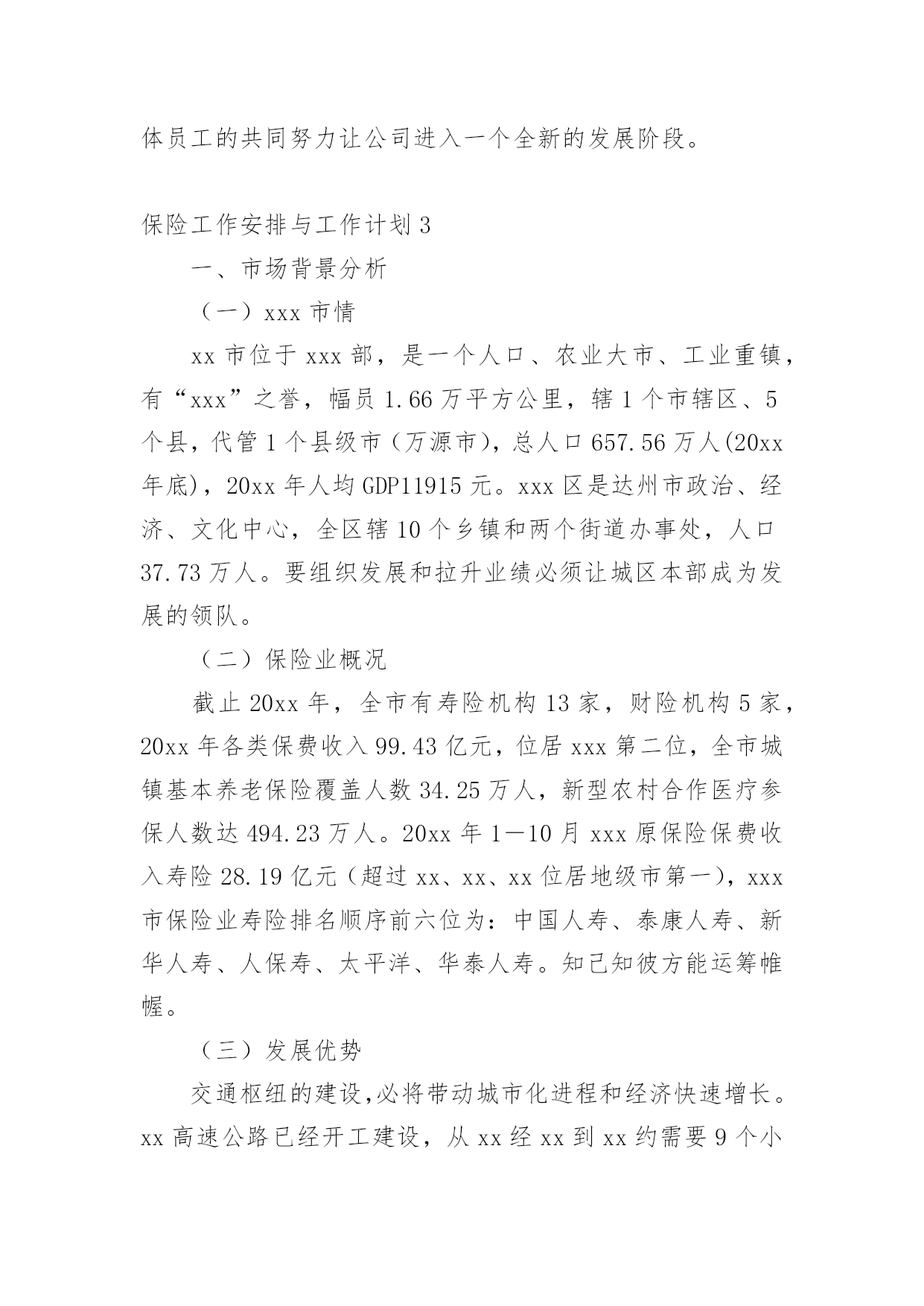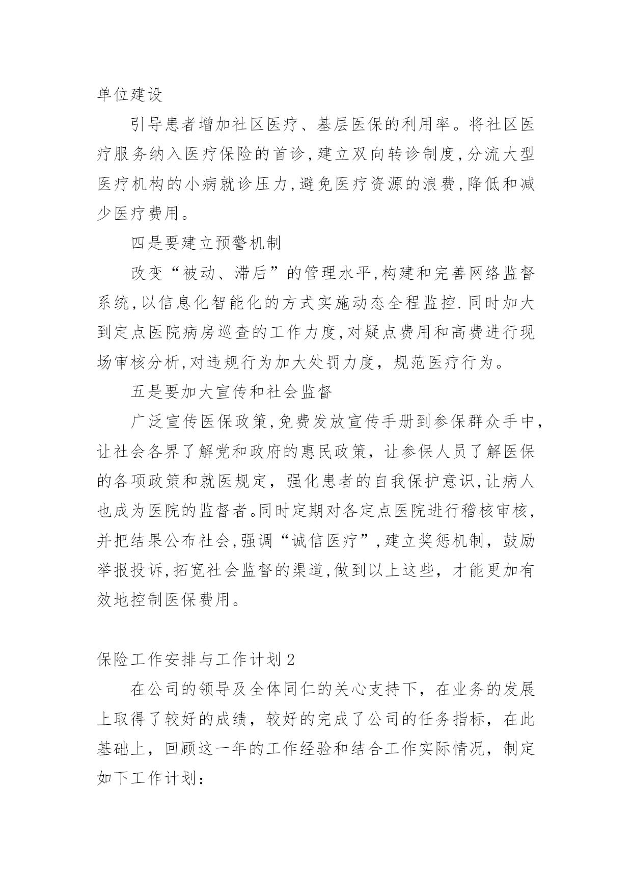 保险工作安排与工作计划保险工作安排与工作计划精选8篇时光飞逝,时间在慢慢推演,我们的工作又进入新的阶段,为了在工作中有更好的成长,来为以后的工作做一份计划吧。什么样的计划才是有效的呢?以下是小编为大家收集的保险工作安排与工作计划,欢迎阅读,希望大家能够喜欢。保险工作安排与工作计划1我局坚持稳步推进与积极探索并重,提高经办能力,全力推进我县医保工作取得新发展,为构建和谐蓬溪做出了积极的贡献。20xx年,医疗保险工作要将扩大覆盖、完善政策与改进管理服务结合起来,加强医院的日常管理和对定点医院费用增长过快的管理措施,在贯彻好医保政策的同时,处理好医、保、患三方的利益,同时又能将医保费用降低,使得我局20xx年的医疗保险工作更上一个台阶。医疗保险管理服务的关键在医院如何作为,要管好医院,我们主要做了以下几点工作:一、定点医院的医保管理人员培训找准加强定点医院管理的切入点,配备专兼职医保管理人员,确定一名院领导分管医保工作,充分发挥其纽带和桥梁作用,不断完善费用管理与结算方式.实行年度考评和平时稽查制度,不断促进定点医院的优质服务和规范管理。二、是搭建医保网络平台20xx年4月1日按市委.市政府的统一安排,全县正式启动实施城镇居民基本医疗保险,到目前为止参保率达50%,参保人数达38275人,完成市委.市政府下达目标任务37900人的101%,征收基金99.5万元。到现在的医保网络系统不断完善,及时建立医保病人的就医情况、治疗情况、费用控制情况等,增强了动态管理,方便参保人员就医及医保部门的管理。三、下阶段工作建议为了加强“两定”管理,与21家定点医院,57家药店签定了服务协议,并不断完善协议,细化量化协议内容。但是医院作为一个独立的经济主体,追求利益最大化,对医保费用控制要求抵触较大,所以导致费用增长过快,关于定点医院费用增长过快的管理措施:一是要严格管理,确保医保费用收支平衡对入院、住院、转院、费用结算、审核实行定期与不定期核查、监督。发现问题及时进行处理;严格医保基金支付的审核、审批程序,确保基金的安全使用。二是要深化、强化医保定点医院准入制度扩大总量,优化结构,促进充分竞争,降低医疗服务成本,方便参保人员就医选择,以协议为依据,规范医疗服务和管理。建立更加合理的费用分担机制,调整和完善医保结算管理办法,改变医保为第三方买单而产生的医患均追求利益最大化的问题。三是要完善社区医疗机构和基层医疗机构的.医保定点单位建设引导患者增加社区医疗、基层医保的利用率。将社区医疗服务纳入医疗保险的首诊,建立双向转诊制度,分流大型医疗机构的小病就诊压力,避免医疗资源的浪费,降低和减少医疗费用。四是要建立预警机制改变“被动、滞后”的管理水平,构建和完善网络监督系统,以信息化智能化的方式实施动态全程监控.同时加大到定点医院病房巡查的工作力度,对疑点费用和高费进行现场审核分析,对违规行为加大处罚力度,规范医疗行为。五是要加大宣传和社会监督广泛宣传医保政策,免费发放宣传手册到参保群众手中,让社会各界了解党和政府的惠民政策,让参保人员了解医保的各项政策和就医规定,强化患者的自我保护意识,让病人也成为医院的监督者。同时定期对各定点医院进行稽核审核,并把结果公布社会,强调“诚信医疗”,建立奖惩机制,鼓励举报投诉,拓宽社会监督的渠道,做到以上这些,才能更加有效地控制医保费用。保险工作安排与工作计划2在公司的领导及全体同仁的关心支持下,在业务的发展上取得了较好的成绩,较好的完成了公司的任务指标,在此基础上,回顾这一年的工作经验和结合工作实际情况,制定如下工作计划:一、严格落实公司各项条款,加强业务管理工作,构建优质、规范的承保服务体系。承保是公司经营的源头,是风险管控、实现效益的重要基础,是公司生存的基础保障。因此,在13年,公司将狠抓业务管理工作,提高风险管控能力。二、规范和落实公司的服务条款,提高服务工作质量,建设一流的服务平台。我们经营的不是有形产品,而是一种规避风险或风险投资的服务。在市场逐步透明,竞争激烈的今天,服务已经成为我们公司的核心竞争力,纳入我们公司的`价值观。客服工作是这一理念的具体体现。在20xx年里将严格规范客服工作,建立一流的客户服务体系,真正把优质服务送给每一位公司的客户。三、加快业务发展,巩固郑州市场占有率,扩大河南市场占有面。根据20xx年支公司保费收入万元为依据,公司计划20xx年实现全年保费收入万元,其中:计划将从以下几个方面去实施完成。1、精心组织策划、坚决完成计划指标,为全年目标打下坚实的基础。2、大力发展渠道业务,深度拓展郑州市场,打好河南地市业务的攻坚战,有序推进,扩大和巩固河南市场占有面。3、机动车辆险是我司业务的重中之重,因此,大力发展机动车辆险业务,充分发挥公司的车险优势,打好车险业务的攻坚战,还是我们工作的重点