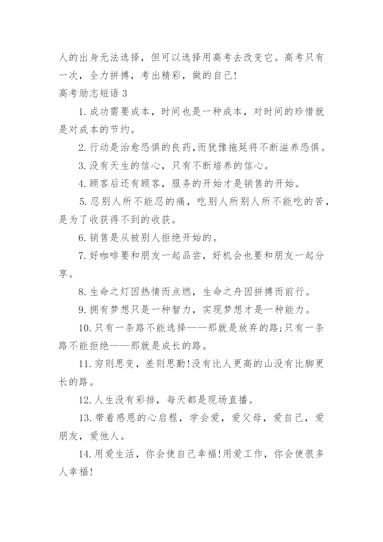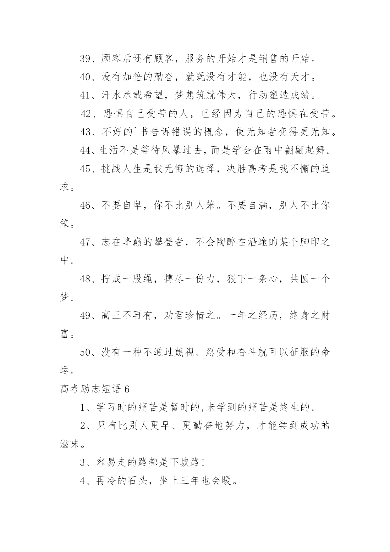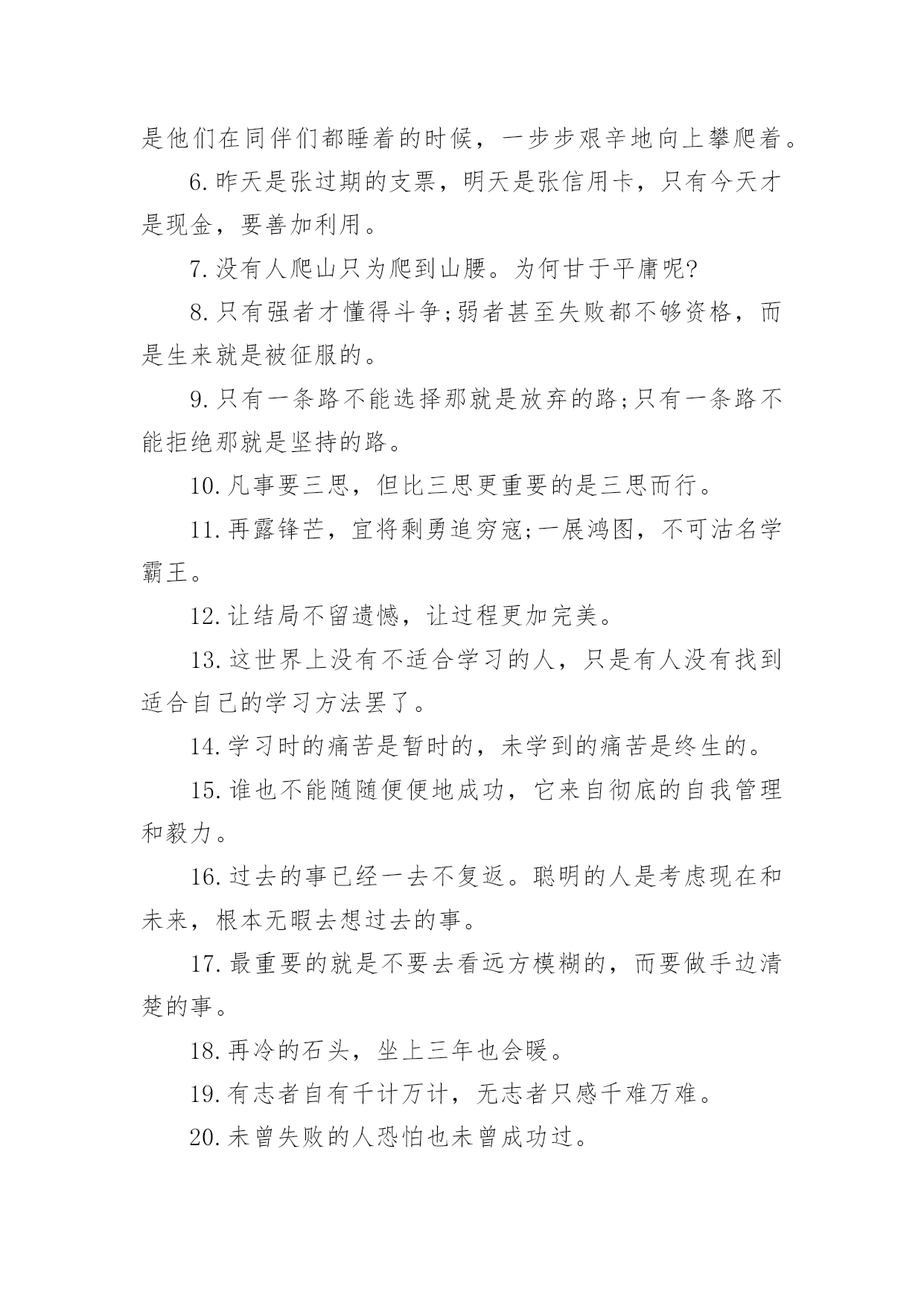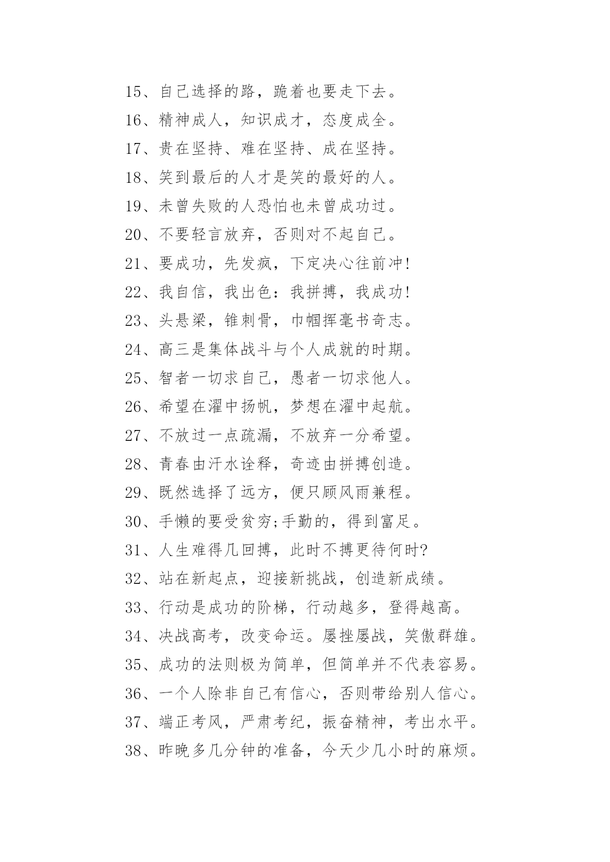 高考励志短语高考励志短语高考励志短语11.含泪播种的人一定能含笑收获。2.人生伟业的建立,不在能知,乃在能行。3.一个人最大的破产是绝望,最大的资产是希望。4.行动是成功的阶梯,行动越多,登得越高。5.昨晚多几分钟的准备,今天少几小时的麻烦。6.心者,栖神之舍;神者,知识之本;思者,神识之妙用也。7.不思,故有惑;不求,故无得;不问,故不知。8.让我们将事前的考虑,换为事前的思考和计划吧。9.不大可能的事也许今天实现,根本不可能的事也许明天会实现。10.即使爬到最高的山上,一次也只能脚踏实地地迈一步。高考励志短语21、没有比脚更长的路,没有比人更高的山。2、面临大考,心态要好;摆正身心,价值千金;只要努力,总有天地!3、乐学实学,挑战高考;勤勉向上,成就自我。4、美好生活属于善抓机会的人;精彩人生属于勇敢向前的人、幸福属于懂得珍惜的人;成功是自信的人的秘笈!选择大于努力,拥抱改变,把握未来!努力吧!5、大胆去考,没必要杞人忧天、患得患失,天生我材必有用!假如有些紧张,就告诉自己:“紧张”实际上也是一种兴奋,也有利于发挥。6、天道酬勤!丰硕的果实永远属于那些坚强不屈自强不息的辛勤耕耘者。7、万物皆空、莫强求,只要努力过又何必在乎得失呢!相信自己,你是最棒的!8、面对高考要有信心,高考之前要能平心,迎战高考要有开心,高考答卷要能细心。相信你一定可以。9、天再热,热不过心;有信心,一切皆有可能。10、高考是一个实现人生的省力杠杆,此时是你撬动它的时机,并且以后你的人生会呈弧线上升。11、成功的花由汗水浇灌,艰苦的挖掘流出甘甜的泉,辛劳的付出必有丰厚回报,紫气东来鸿运通天,孜孜不倦今朝梦圆。12、信心是成功的法宝。13、克服挫折的能力是指路的航标。14、高考像漫漫人生路上的一道坎,无论成败与否,我认为现在都不重要了,重要的是要总结高考的得与失,以便在今后的人生之路上迈好每一个坎!15、人的天分无法选择,但可以选择用勤奋去弥补它;人的出身无法选择,但可以选择用高考去改变它。高考只有一次,全力拼搏,考出精彩,做的自己!高考励志短语31.成功需要成本,时间也是一种成本,对时间的珍惜就是对成本的节约。2.行动是治愈恐惧的良药,而犹豫拖延将不断滋养恐惧。3.没有天生的信心,只有不断培养的信心。4.顾客后还有顾客,服务的开始才是销售的开始。5.忍别人所不能忍的痛,吃别人所别人所不能吃的苦,是为了收获得不到的收获。6.销售是从被别人拒绝开始的。7.好咖啡要和朋友一起品尝,好机会也要和朋友一起分享。8.生命之灯因热情而点燃,生命之舟因拼搏而前行。9.拥有梦想只是一种智力,实现梦想才是一种能力。10.只有一条路不能选择——那就是放弃的路;只有一条路不能拒绝——那就是成长的路。11.穷则思变,差则思勤!没有比人更高的山没有比脚更长的路。12.人生没有彩排,每天都是现场直播。13.带着感恩的心启程,学会爱,爱父母,爱自己,爱朋友,爱他人。14.用爱生活,你会使自己幸福!用爱工作,你会使很多人幸福!15.流过泪的眼睛更明亮,滴过血的心灵更坚强!16.当世界给草籽重压时,它总会用自己的方法破土而出。17.既然人生的幕布已经拉开,就一定要积极的演出;既然脚步已经跨出,风雨坎坷也不能退步;既然我已把希望播在这里,就一定要坚持到胜利的谢幕……18.我们可以失望,但不能盲目。19.自己选择的路跪着也要把它走完。20.业精于勤,荒于嬉;行成于思,毁于随。高考励志短语41、精神成就事业,态度决定一切。2、忘时,忘物,忘我。诚实,朴实,踏实。3、遇难心不慌,遇易心更细。4、站在新起点,迎接新挑战,创造新成绩。5、把汗水变成珍珠,把梦想变成现实!6、人活着要呼吸。呼者,出一口气;吸者,争一口气。7、做一题会一题,一题决定命运。8、有来路,没退路;留退路,是绝路。9、对于世界,我微不足道,但对于我自己,我就是全部。10、因为我不能,所以一定要;因为一定要,所以一定能。11、有大目标,须有大动作;有大追求,须有大改变。12、对命运承诺,对承诺负责13、再苦再累不掉队,再难再险不放弃。14、请老师放心,我是你最骄傲的学子;请父母放心,我是你们最争气的孩子。15、我因一班而自豪,一班因我而骄傲16、拼搏高考,今生无悔;爬过高三,追求卓越!17、高三高考高目标,苦学善学上好学。18、无才无以立足,不苦不能成才。19、乐学实学,挑战高考;勤勉向上,成就自我。20、山高不厌攀,水深不厌潜,学精不厌苦:追求!高考励志短语51、高考得高分的秘诀就是少丢分!2、练习就是高考,高考就是练习。3、积一时之跬步,臻千里之遥程。4、精神成就事业,态度决定一切。5、含泪播种的人一定能含笑收获。6、无才无以立足,不苦不能成才。7、只有千锤百炼,才能成为好钢。8、遵循生活规律,保持良好心态。9、出淤泥而不
