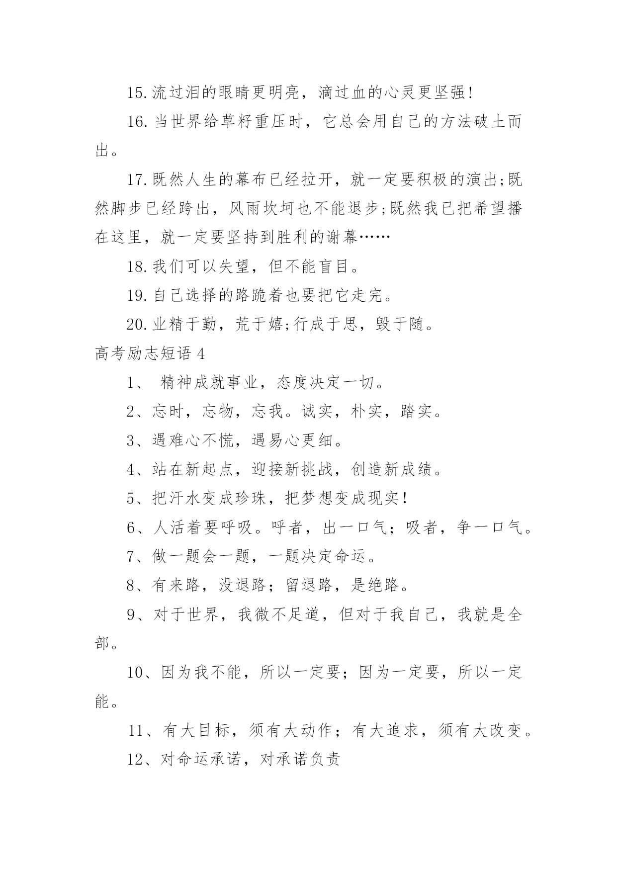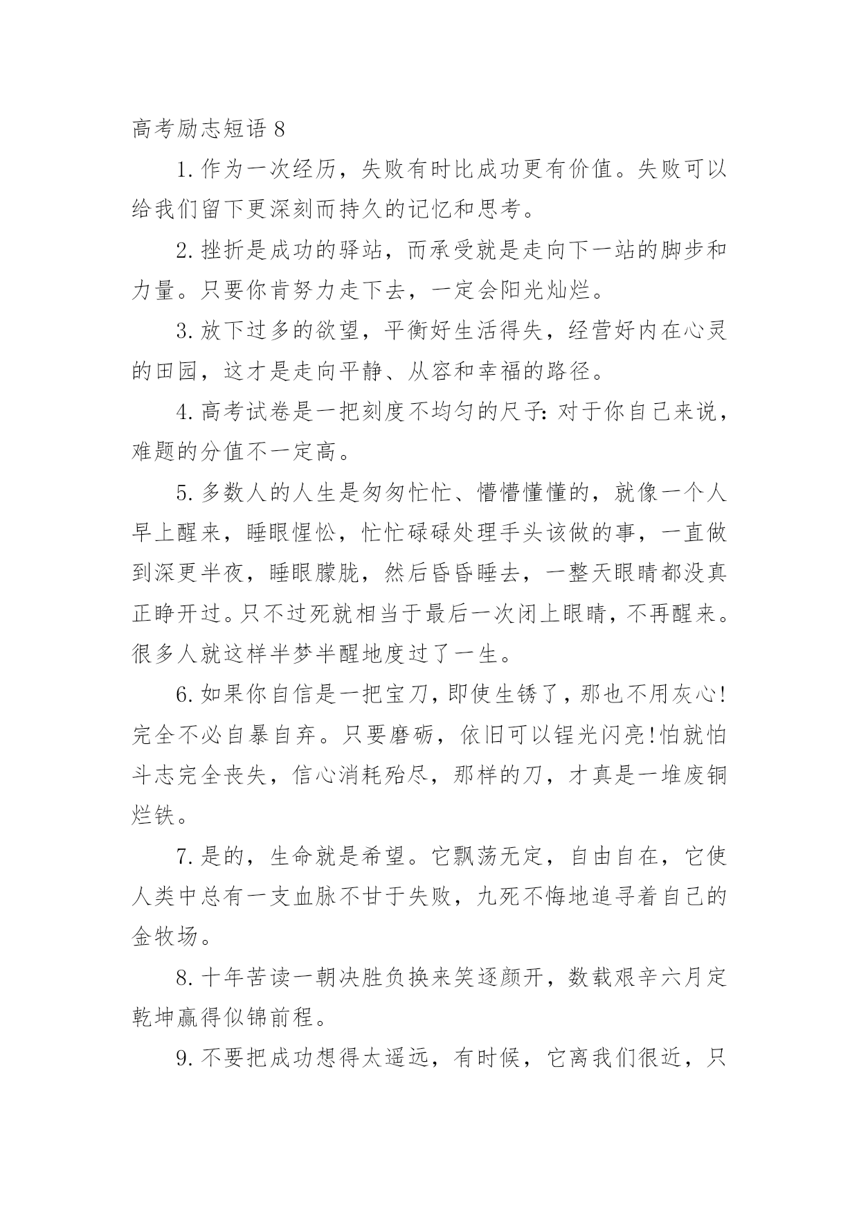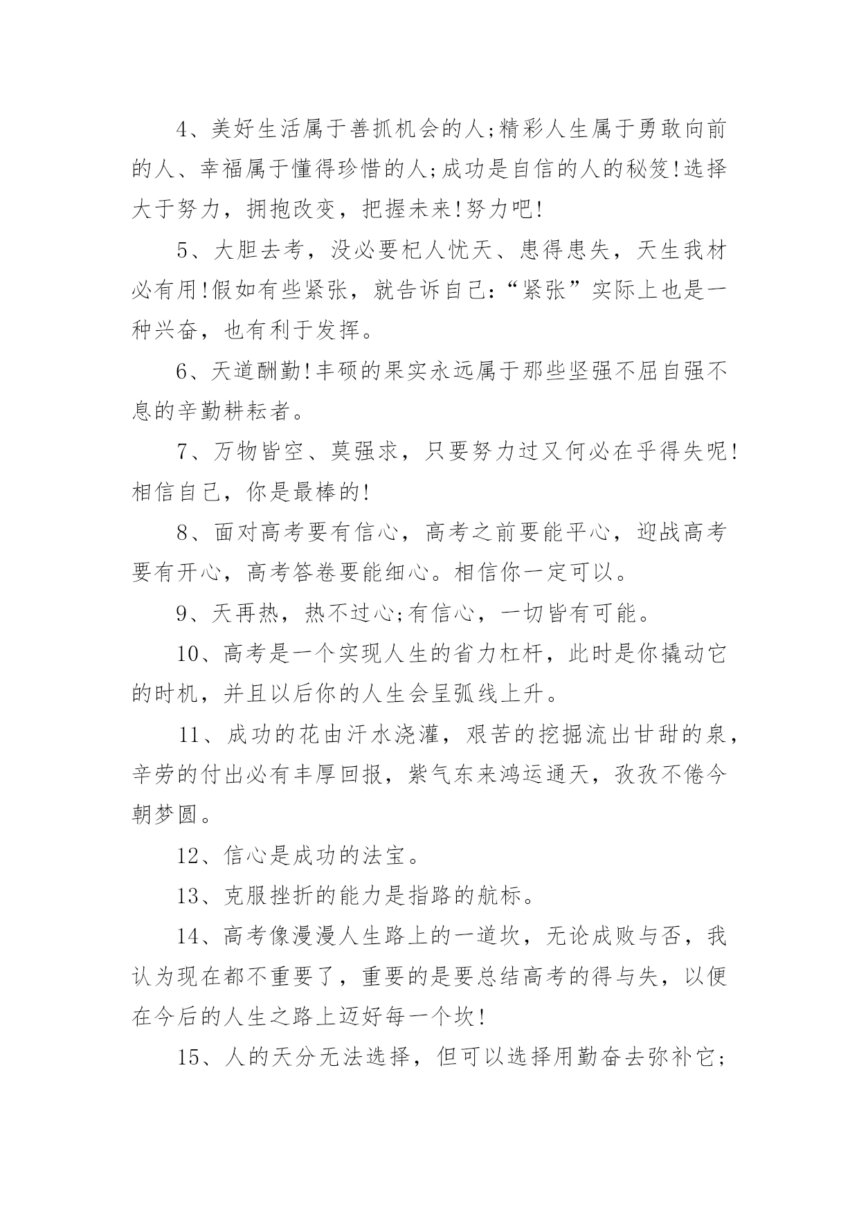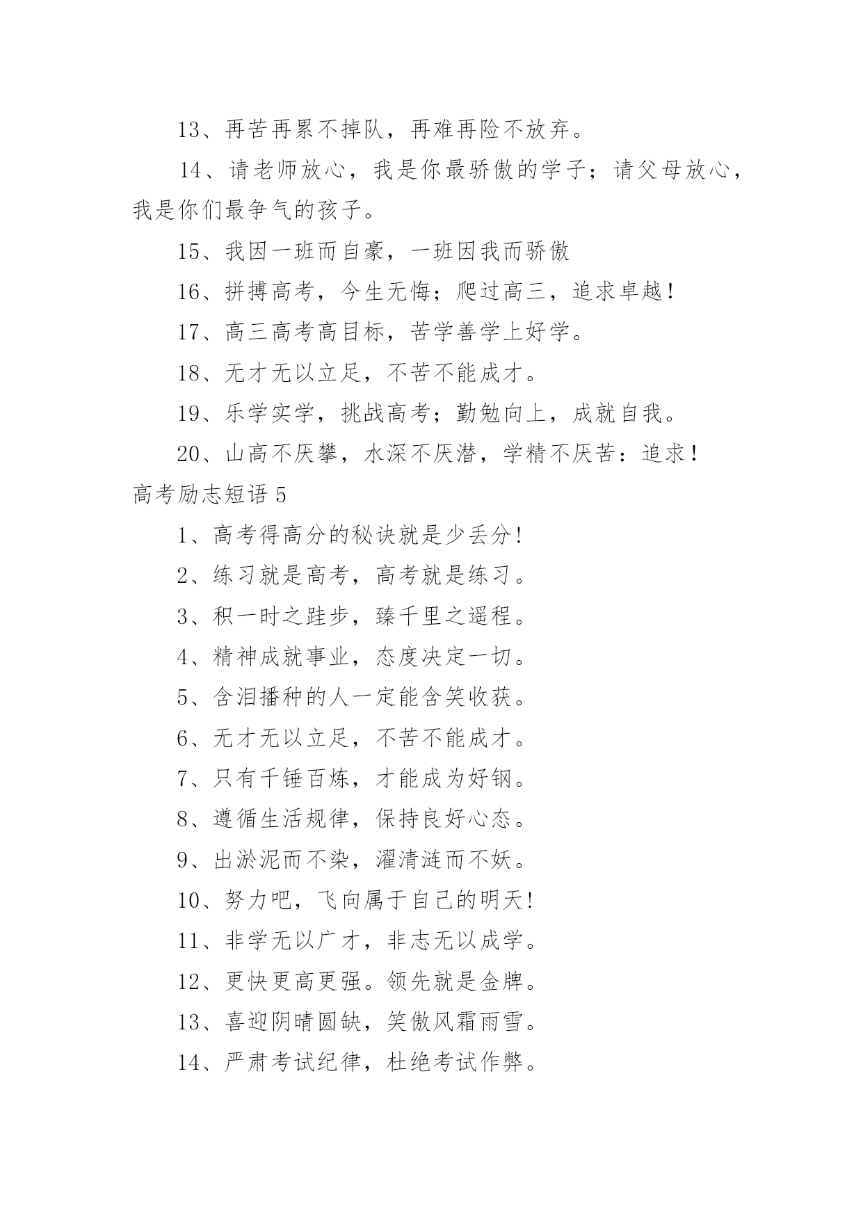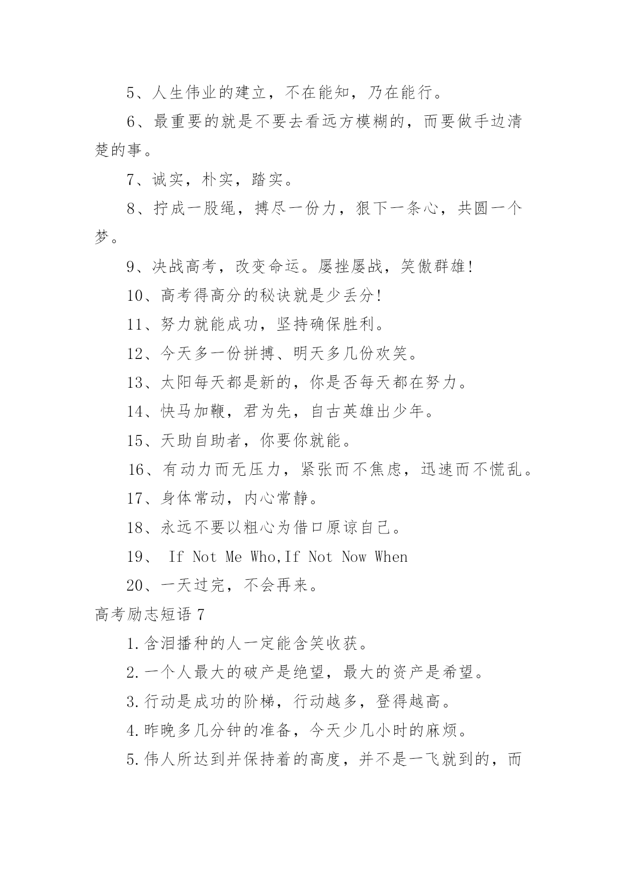高考励志短语高考励志短语高考励志短语11.含泪播种的人一定能含笑收获。2.人生伟业的建立,不在能知,乃在能行。3.一个人最大的破产是绝望,最大的资产是希望。4.行动是成功的阶梯,行动越多,登得越高。5.昨晚多几分钟的准备,今天少几小时的麻烦。6.心者,栖神之舍;神者,知识之本;思者,神识之妙用也。7.不思,故有惑;不求,故无得;不问,故不知。8.让我们将事前的考虑,换为事前的思考和计划吧。9.不大可能的事也许今天实现,根本不可能的事也许明天会实现。10.即使爬到最高的山上,一次也只能脚踏实地地迈一步。高考励志短语21、没有比脚更长的路,没有比人更高的山。2、面临大考,心态要好;摆正身心,价值千金;只要努力,总有天地!3、乐学实学,挑战高考;勤勉向上,成就自我。4、美好生活属于善抓机会的人;精彩人生属于勇敢向前的人、幸福属于懂得珍惜的人;成功是自信的人的秘笈!选择大于努力,拥抱改变,把握未来!努力吧!5、大胆去考,没必要杞人忧天、患得患失,天生我材必有用!假如有些紧张,就告诉自己:“紧张”实际上也是一种兴奋,也有利于发挥。6、天道酬勤!丰硕的果实永远属于那些坚强不屈自强不息的辛勤耕耘者。7、万物皆空、莫强求,只要努力过又何必在乎得失呢!相信自己,你是最棒的!8、面对高考要有信心,高考之前要能平心,迎战高考要有开心,高考答卷要能细心。相信你一定可以。9、天再热,热不过心;有信心,一切皆有可能。10、高考是一个实现人生的省力杠杆,此时是你撬动它的时机,并且以后你的人生会呈弧线上升。11、成功的花由汗水浇灌,艰苦的挖掘流出甘甜的泉,辛劳的付出必有丰厚回报,紫气东来鸿运通天,孜孜不倦今朝梦圆。12、信心是成功的法宝。13、克服挫折的能力是指路的航标。14、高考像漫漫人生路上的一道坎,无论成败与否,我认为现在都不重要了,重要的是要总结高考的得与失,以便在今后的人生之路上迈好每一个坎!15、人的天分无法选择,但可以选择用勤奋去弥补它;人的出身无法选择,但可以选择用高考去改变它。高考只有一次,全力拼搏,考出精彩,做的自己!高考励志短语31.成功需要成本,时间也是一种成本,对时间的珍惜就是对成本的节约。2.行动是治愈恐惧的良药,而犹豫拖延将不断滋养恐惧。3.没有天生的信心,只有不断培养的信心。4.顾客后还有顾客,服务的开始才是销售的开始。5.忍别人所不能忍的痛,吃别人所别人所不能吃的苦,是为了收获得不到的收获。6.销售是从被别人拒绝开始的。7.好咖啡要和朋友一起品尝,好机会也要和朋友一起分享。8.生命之灯因热情而点燃,生命之舟因拼搏而前行。9.拥有梦想只是一种智力,实现梦想才是一种能力。10.只有一条路不能选择——那就是放弃的路;只有一条路不能拒绝——那就是成长的路。11.穷则思变,差则思勤!没有比人更高的山没有比脚更长的路。12.人生没有彩排,每天都是现场直播。13.带着感恩的心启程,学会爱,爱父母,爱自己,爱朋友,爱他人。14.用爱生活,你会使自己幸福!用爱工作,你会使很多人幸福!15.流过泪的眼睛更明亮,滴过血的心灵更坚强!16.当世界给草籽重压时,它总会用自己的方法破土而出。17.既然人生的幕布已经拉开,就一定要积极的演出;既然脚步已经跨出,风雨坎坷也不能退步;既然我已把希望播在这里,就一定要坚持到胜利的谢幕……18.我们可以失望,但不能盲目。19.自己选择的路跪着也要把它走完。20.业精于勤,荒于嬉;行成于思,毁于随。高考励志短语41、精神成就事业,态度决定一切。2、忘时,忘物,忘我。诚实,朴实,踏实。3、遇难心不慌,遇易心更细。4、站在新起点,迎接新挑战,创造新成绩。5、把汗水变成珍珠,把梦想变成现实!6、人活着要呼吸。呼者,出一口气;吸者,争一口气。7、做一题会一题,一题决定命运。8、有来路,没退路;留退路,是绝路。9、对于世界,我微不足道,但对于我自己,我就是全部。10、因为我不能,所以一定要;因为一定要,所以一定能。11、有大目标,须有大动作;有大追求,须有大改变。12、对命运承诺,对承诺负责13、再苦再累不掉队,再难再险不放弃。14、请老师放心,我是你最骄傲的学子;请父母放心,我是你们最争气的孩子。15、我因一班而自豪,一班因我而骄傲16、拼搏高考,今生无悔;爬过高三,追求卓越!17、高三高考高目标,苦学善学上好学。18、无才无以立足,不苦不能成才。19、乐学实学,挑战高考;勤勉向上,成就自我。20、山高不厌攀,水深不厌潜,学精不厌苦:追求!高考励志短语51、高考得高分的秘诀就是少丢分!2、练习就是高考,高考就是练习。3、积一时之跬步,臻千里之遥程。4、精神成就事业,态度决定一切。5、含泪播种的人一定能含笑收获。6、无才无以立足,不苦不能成才。7、只有千锤百炼,才能成为好钢。8、遵循生活规律,保持良好心态。9、出淤泥而不