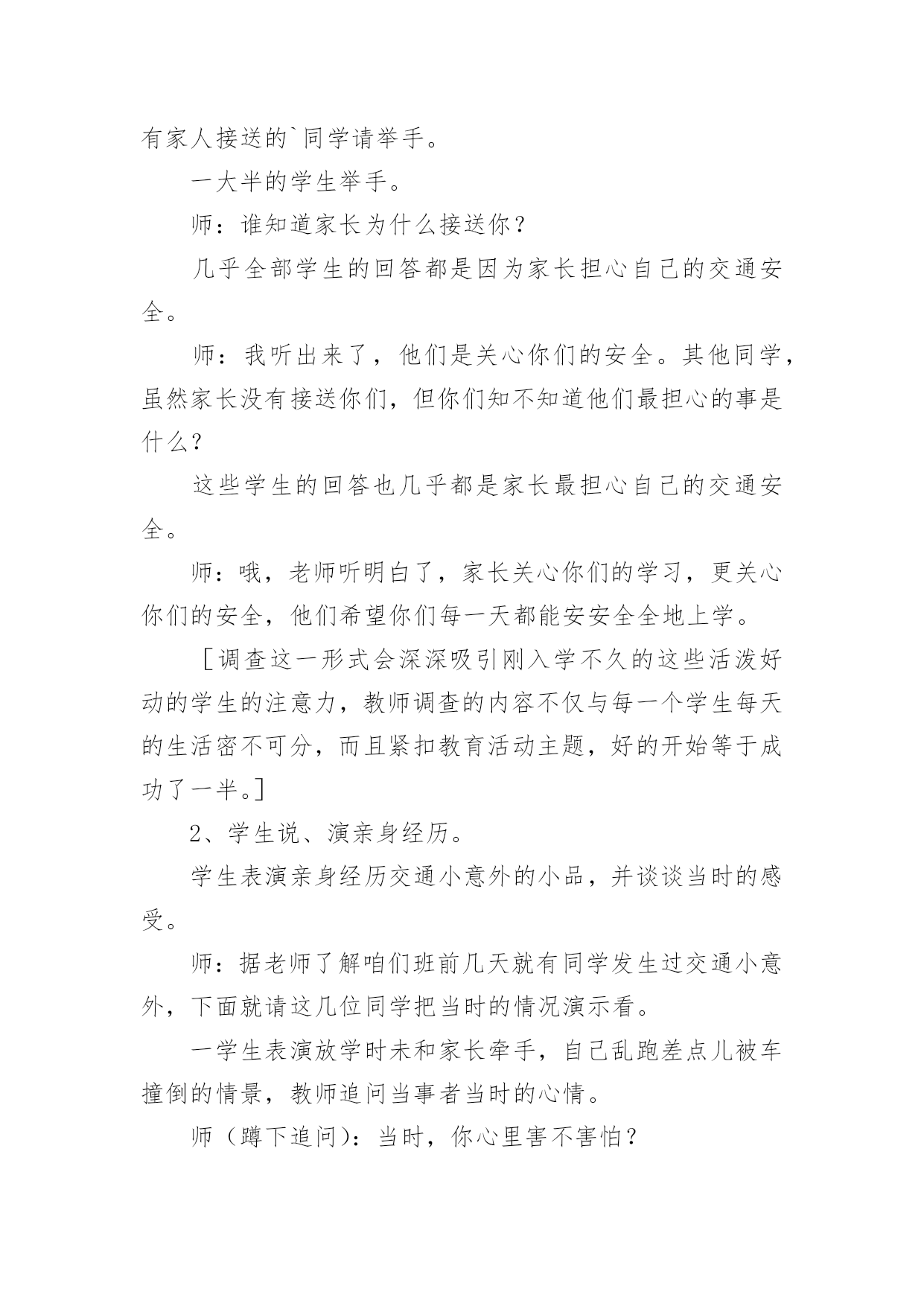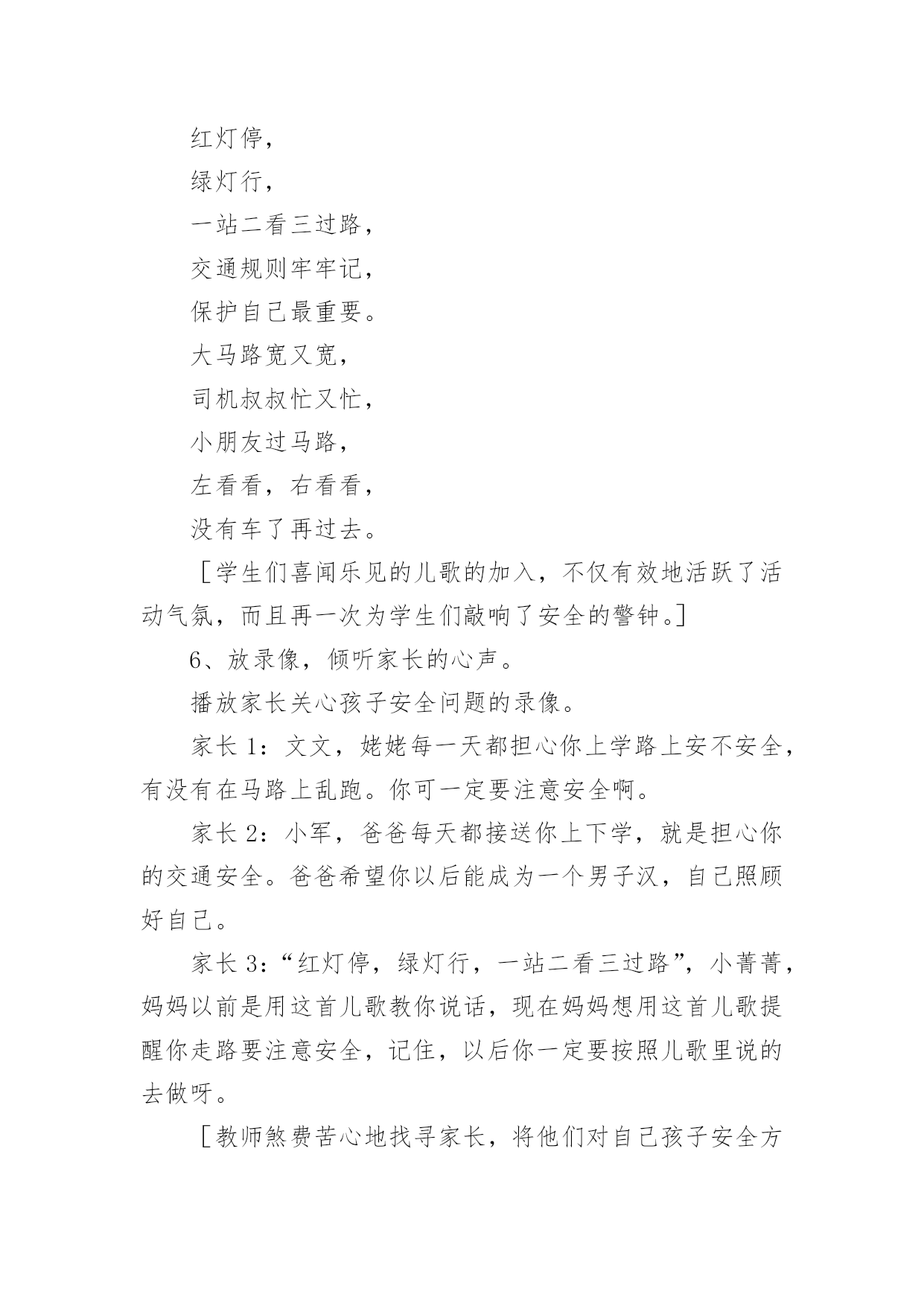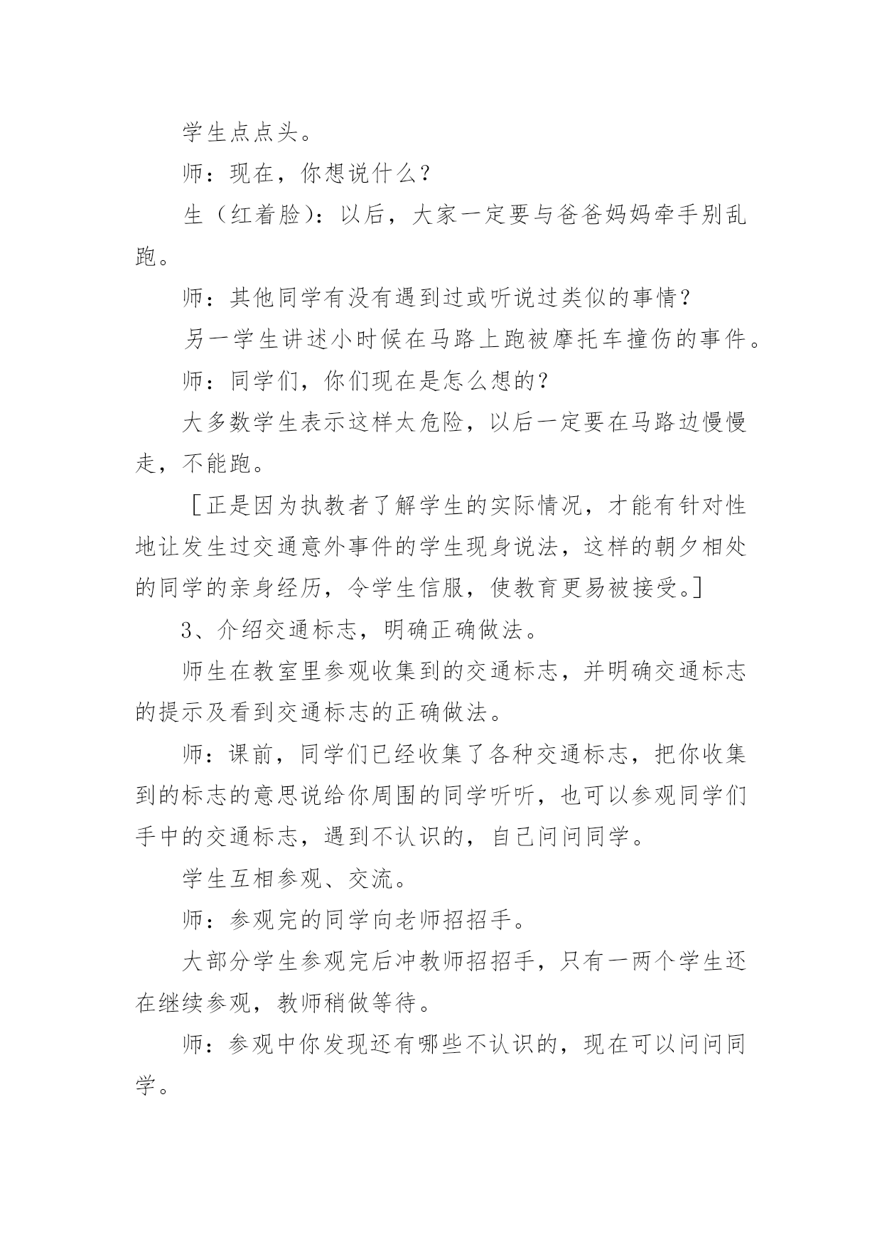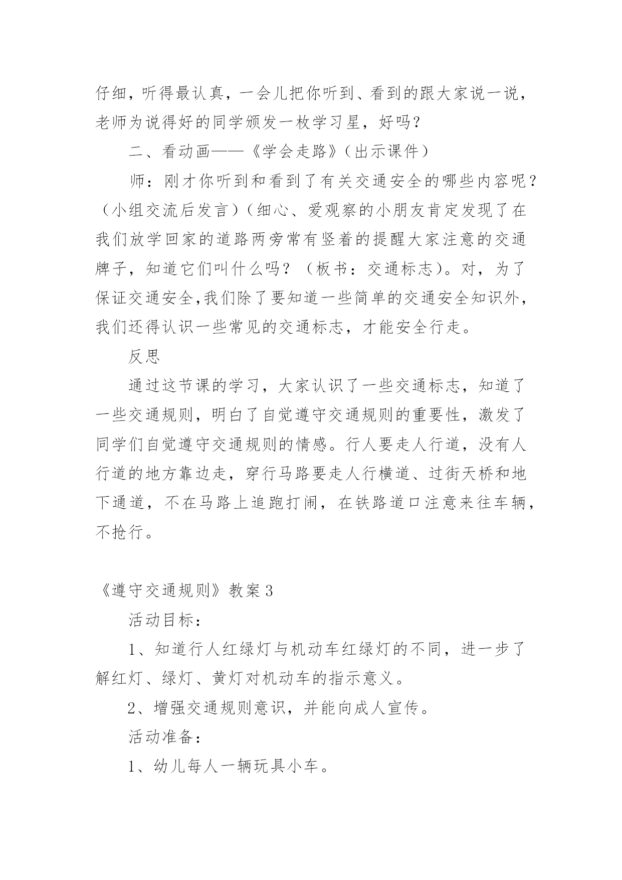 《遵守交通规则》教案作为一名辛苦耕耘的教育工作者,时常需要用到教案,编写教案助于积累教学经验,不断提高教学质量。教案应该怎么写才好呢?以下是小编精心整理的《遵守交通规则》教案,仅供参考,希望能够帮助到大家。《遵守交通规则》教案1活动目标1、用学生亲身经历的交通小意外及上学途中的交通见闻,提高学生的交通安全意识。2、了解红绿灯、走人行天桥等常见的交通标志,培养学生的规则意识,规范学生的社会行为。3、交流上学途中不安全的交通路段和相应的安全做法,发展学生的自我保护能力。活动准备(一)学情分析我们学校附近是一条主干路,来往车辆较多,交通事故时有发生。六七岁的一年级学生缺乏自我保护的意识和能力,出了校门就跑,即使家长来接,往往也是书包一递,撒腿便跑,这很容易发生危险。尽管学校、班级经常就此问题进行教育,家长也每天反复叮嘱,但收效甚微。作为一年级的班主任教师,每天放学前我都要叮嘱学生们路上要注意安全,并亲自将他们送出校门,交到各自的家长手中。可以说,我与家长的担忧是一致的――学生的安全,总想找个适当的机会搞个独特的活动,把学生心中这根安全的弦上得紧一点。(二)物质资料准备1、学生用各种方法收集常见的交通标志,并弄清交通标志的意思。2、学生观察自己上学路上的交通情况,把不安全的地方记录下来(可以画,也可以拍照)。3、学生收集、回忆以前见过的、学过的安全儿歌或自己创编儿歌。活动时间3课时。活动过程(一)活动引发1、教师提前了解学生是否有发生交通意外的亲身经历。2、学生收集常见的交通标志并了解其中的含义。3、引导学生观察自己上学途中的交通情况,把不安全的路况记录下来。4、学生收集、回忆以前见过的、学过的安全儿歌或自己创编的儿歌。(二)活动开展1、现场调查,导入主题。教师作家长接送孩子及原因的调查。师:同学们,老师想搞一个现场调查,每天上学、放学有家人接送的`同学请举手。一大半的学生举手。师:谁知道家长为什么接送你?几乎全部学生的回答都是因为家长担心自己的交通安全。师:我听出来了,他们是关心你们的安全。其他同学,虽然家长没有接送你们,但你们知不知道他们最担心的事是什么?这些学生的回答也几乎都是家长最担心自己的交通安全。师:哦,老师听明白了,家长关心你们的学习,更关心你们的安全,他们希望你们每一天都能安安全全地上学。[调查这一形式会深深吸引刚入学不久的这些活泼好动的学生的注意力,教师调查的内容不仅与每一个学生每天的生活密不可分,而且紧扣教育活动主题,好的开始等于成功了一半。]2、学生说、演亲身经历。学生表演亲身经历交通小意外的小品,并谈谈当时的感受。师:据老师了解咱们班前几天就有同学发生过交通小意外,下面就请这几位同学把当时的情况演示看。一学生表演放学时未和家长牵手,自己乱跑差点儿被车撞倒的情景,教师追问当事者当时的心情。师(蹲下追问):当时,你心里害不害怕?学生点点头。师:现在,你想说什么?生(红着脸):以后,大家一定要与爸爸妈妈牵手别乱跑。师:其他同学有没有遇到过或听说过类似的事情?另一学生讲述小时候在马路上跑被摩托车撞伤的事件。师:同学们,你们现在是怎么想的?大多数学生表示这样太危险,以后一定要在马路边慢慢走,不能跑。[正是因为执教者了解学生的实际情况,才能有针对性地让发生过交通意外事件的学生现身说法,这样的朝夕相处的同学的亲身经历,令学生信服,使教育更易被接受。]3、介绍交通标志,明确正确做法。师生在教室里参观收集到的交通标志,并明确交通标志的提示及看到交通标志的正确做法。师:课前,同学们已经收集了各种交通标志,把你收集到的标志的意思说给你周围的同学听听,也可以参观同学们手中的交通标志,遇到不认识的,自己问问同学。学生互相参观、交流。师:参观完的同学向老师招招手。大部分学生参观完后冲教师招招手,只有一两个学生还在继续参观,教师稍做等待。师:参观中你发现还有哪些不认识的,现在可以问问同学。学生就参观中发现的不认识的交通标志请教同学。师:老师也收集到了几个交通标志想考考你们,看谁最聪明。教师出示红绿灯、步行街、走人行天桥的交通标志。学生回答出交通标志的含义后,教师追问看到这个交通标志应该怎样做,使学生明确交通标志提示的正确做法。[对于六七岁的一年级学生来说,他们对交通方面的认识最直接、最能接受的,恐怕就是交通标志了。教师能够根据学生的特点,让他们在生活中用各种形式(画、写、拍照等)搜集自己见到的各种标志,学生亲身参与记录的过程,本身就是自我教育的过程,同时也为课上活动做好了充分的准备。]4、针对不安全的上学路况,指导学生正确的做法。师生交流收集到的上学路上不安全地方的情况,共同商讨安全的做法。师:课前,同学们都观察了自己上学路上的交通情况,并把发现的不安全的地方记录下来,下面就把你的发现跟组内的同学说说。学生小组交流。师:同学们大多都住在
