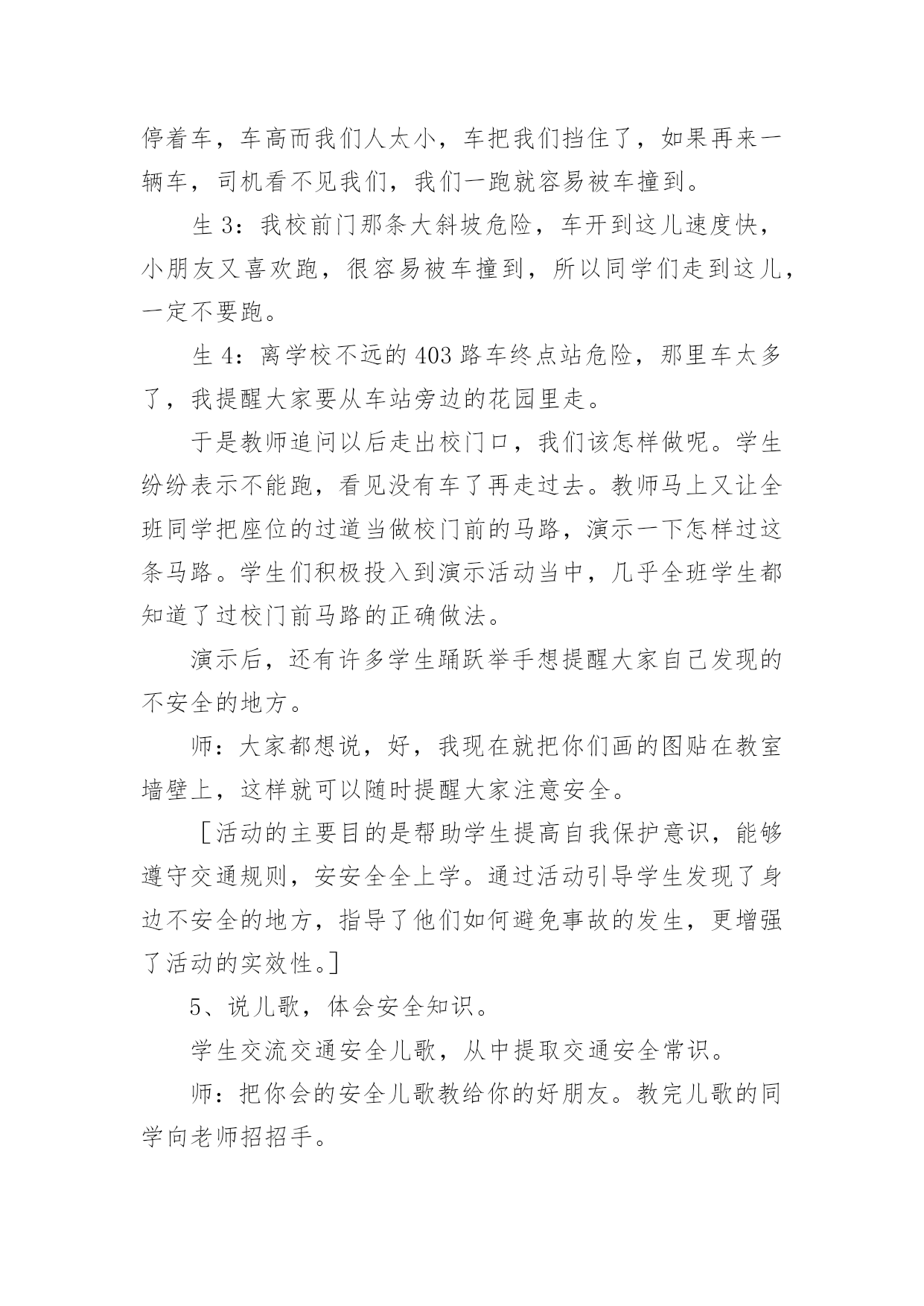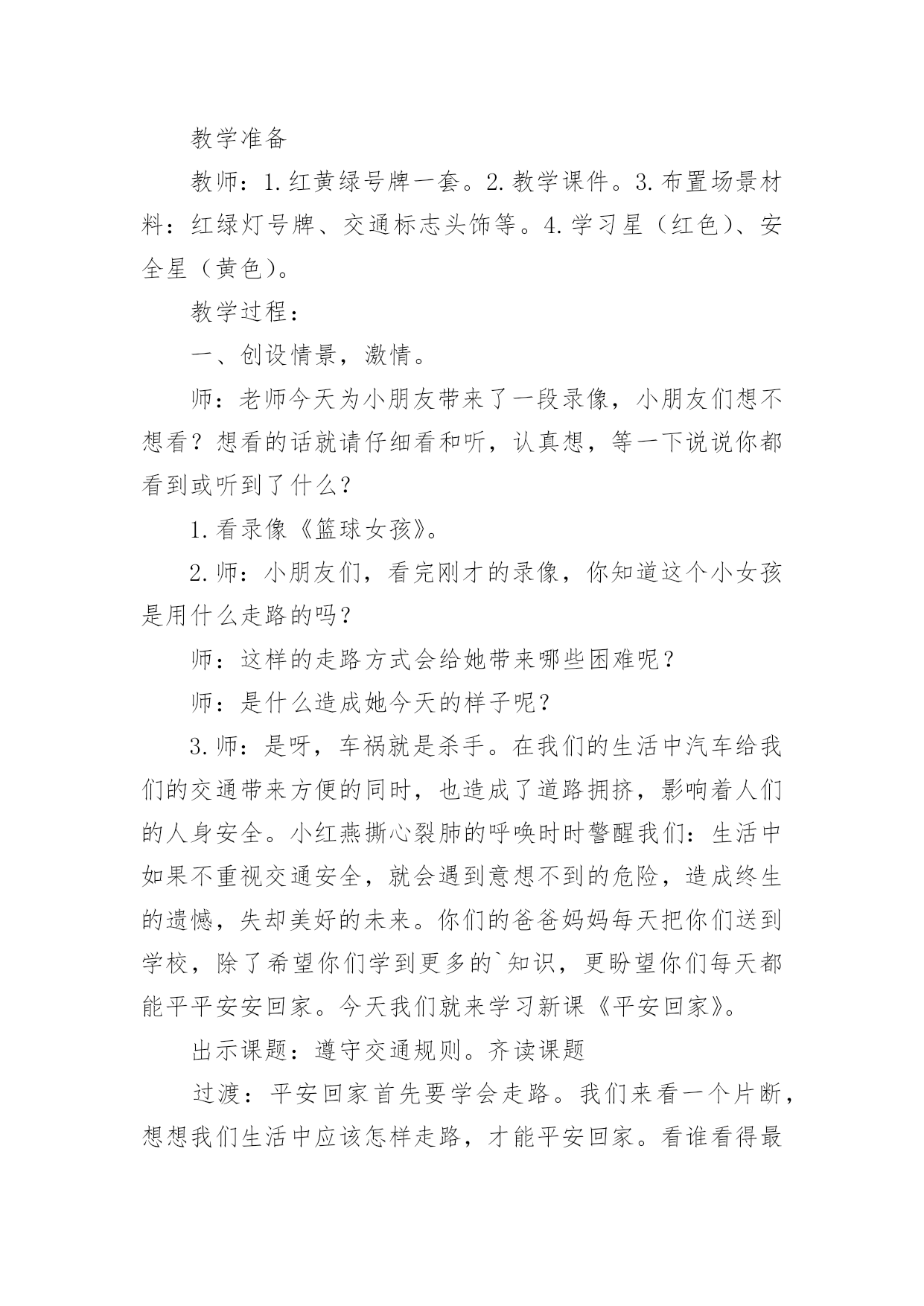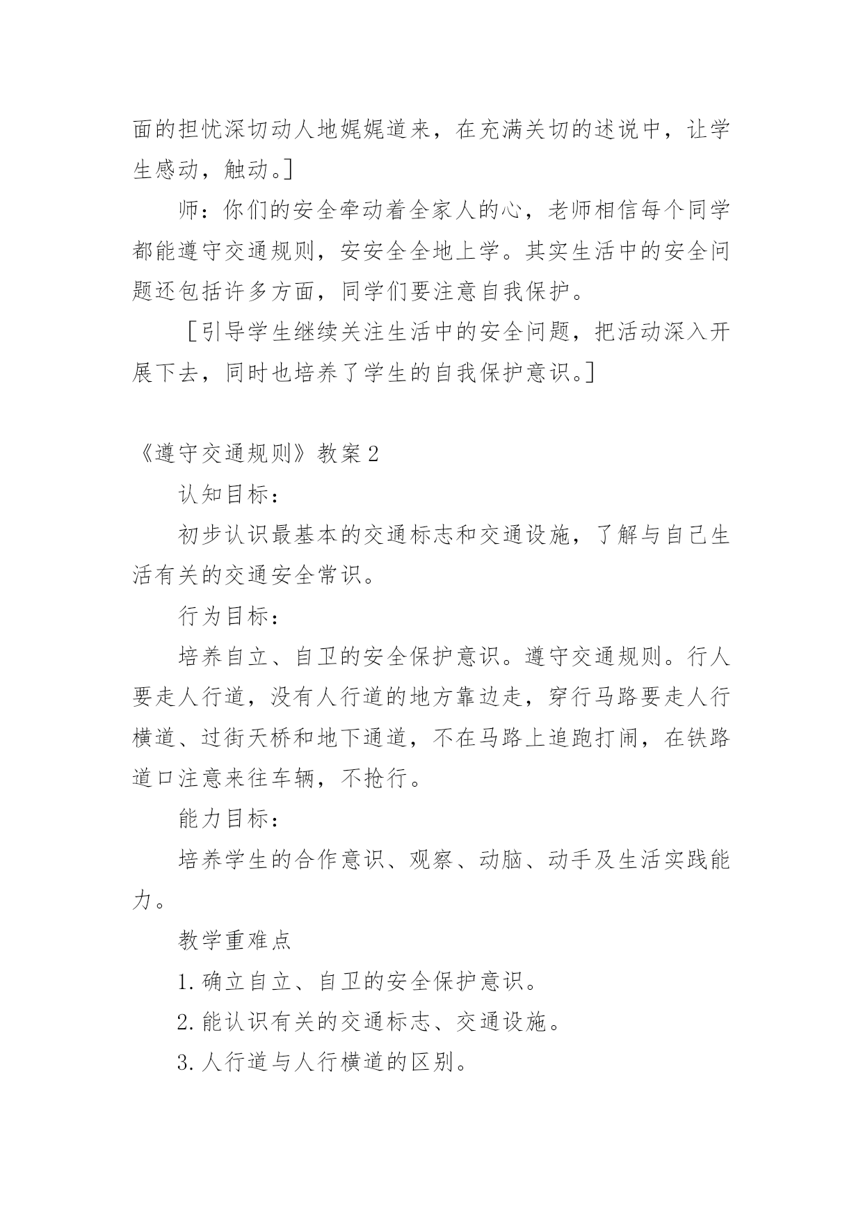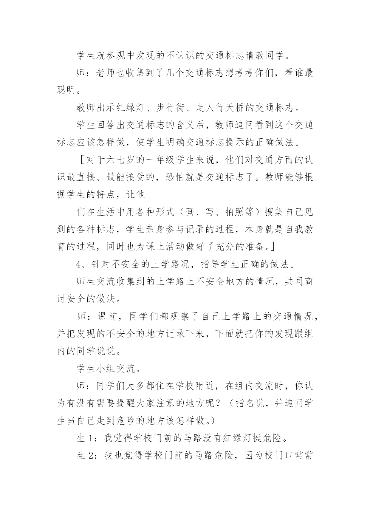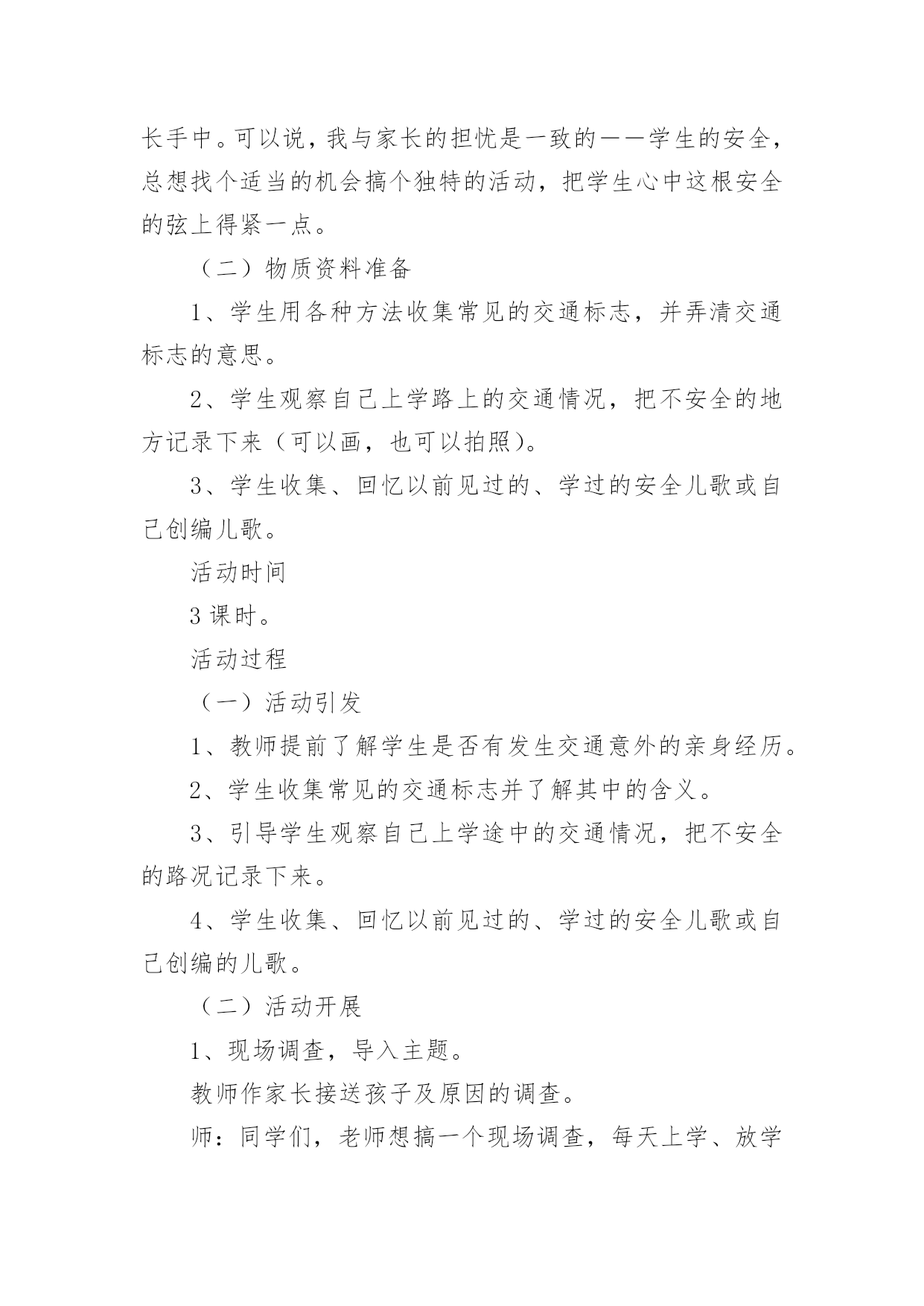 《遵守交通规则》教案作为一名辛苦耕耘的教育工作者,时常需要用到教案,编写教案助于积累教学经验,不断提高教学质量。教案应该怎么写才好呢?以下是小编精心整理的《遵守交通规则》教案,仅供参考,希望能够帮助到大家。《遵守交通规则》教案1活动目标1、用学生亲身经历的交通小意外及上学途中的交通见闻,提高学生的交通安全意识。2、了解红绿灯、走人行天桥等常见的交通标志,培养学生的规则意识,规范学生的社会行为。3、交流上学途中不安全的交通路段和相应的安全做法,发展学生的自我保护能力。活动准备(一)学情分析我们学校附近是一条主干路,来往车辆较多,交通事故时有发生。六七岁的一年级学生缺乏自我保护的意识和能力,出了校门就跑,即使家长来接,往往也是书包一递,撒腿便跑,这很容易发生危险。尽管学校、班级经常就此问题进行教育,家长也每天反复叮嘱,但收效甚微。作为一年级的班主任教师,每天放学前我都要叮嘱学生们路上要注意安全,并亲自将他们送出校门,交到各自的家长手中。可以说,我与家长的担忧是一致的――学生的安全,总想找个适当的机会搞个独特的活动,把学生心中这根安全的弦上得紧一点。(二)物质资料准备1、学生用各种方法收集常见的交通标志,并弄清交通标志的意思。2、学生观察自己上学路上的交通情况,把不安全的地方记录下来(可以画,也可以拍照)。3、学生收集、回忆以前见过的、学过的安全儿歌或自己创编儿歌。活动时间3课时。活动过程(一)活动引发1、教师提前了解学生是否有发生交通意外的亲身经历。2、学生收集常见的交通标志并了解其中的含义。3、引导学生观察自己上学途中的交通情况,把不安全的路况记录下来。4、学生收集、回忆以前见过的、学过的安全儿歌或自己创编的儿歌。(二)活动开展1、现场调查,导入主题。教师作家长接送孩子及原因的调查。师:同学们,老师想搞一个现场调查,每天上学、放学有家人接送的`同学请举手。一大半的学生举手。师:谁知道家长为什么接送你?几乎全部学生的回答都是因为家长担心自己的交通安全。师:我听出来了,他们是关心你们的安全。其他同学,虽然家长没有接送你们,但你们知不知道他们最担心的事是什么?这些学生的回答也几乎都是家长最担心自己的交通安全。师:哦,老师听明白了,家长关心你们的学习,更关心你们的安全,他们希望你们每一天都能安安全全地上学。[调查这一形式会深深吸引刚入学不久的这些活泼好动的学生的注意力,教师调查的内容不仅与每一个学生每天的生活密不可分,而且紧扣教育活动主题,好的开始等于成功了一半。]2、学生说、演亲身经历。学生表演亲身经历交通小意外的小品,并谈谈当时的感受。师:据老师了解咱们班前几天就有同学发生过交通小意外,下面就请这几位同学把当时的情况演示看。一学生表演放学时未和家长牵手,自己乱跑差点儿被车撞倒的情景,教师追问当事者当时的心情。师(蹲下追问):当时,你心里害不害怕?学生点点头。师:现在,你想说什么?生(红着脸):以后,大家一定要与爸爸妈妈牵手别乱跑。师:其他同学有没有遇到过或听说过类似的事情?另一学生讲述小时候在马路上跑被摩托车撞伤的事件。师:同学们,你们现在是怎么想的?大多数学生表示这样太危险,以后一定要在马路边慢慢走,不能跑。[正是因为执教者了解学生的实际情况,才能有针对性地让发生过交通意外事件的学生现身说法,这样的朝夕相处的同学的亲身经历,令学生信服,使教育更易被接受。]3、介绍交通标志,明确正确做法。师生在教室里参观收集到的交通标志,并明确交通标志的提示及看到交通标志的正确做法。师:课前,同学们已经收集了各种交通标志,把你收集到的标志的意思说给你周围的同学听听,也可以参观同学们手中的交通标志,遇到不认识的,自己问问同学。学生互相参观、交流。师:参观完的同学向老师招招手。大部分学生参观完后冲教师招招手,只有一两个学生还在继续参观,教师稍做等待。师:参观中你发现还有哪些不认识的,现在可以问问同学。学生就参观中发现的不认识的交通标志请教同学。师:老师也收集到了几个交通标志想考考你们,看谁最聪明。教师出示红绿灯、步行街、走人行天桥的交通标志。学生回答出交通标志的含义后,教师追问看到这个交通标志应该怎样做,使学生明确交通标志提示的正确做法。[对于六七岁的一年级学生来说,他们对交通方面的认识最直接、最能接受的,恐怕就是交通标志了。教师能够根据学生的特点,让他们在生活中用各种形式(画、写、拍照等)搜集自己见到的各种标志,学生亲身参与记录的过程,本身就是自我教育的过程,同时也为课上活动做好了充分的准备。]4、针对不安全的上学路况,指导学生正确的做法。师生交流收集到的上学路上不安全地方的情况,共同商讨安全的做法。师:课前,同学们都观察了自己上学路上的交通情况,并把发现的不安全的地方记录下来,下面就把你的发现跟组内的同学说说。学生小组交流。师:同学们大多都住在