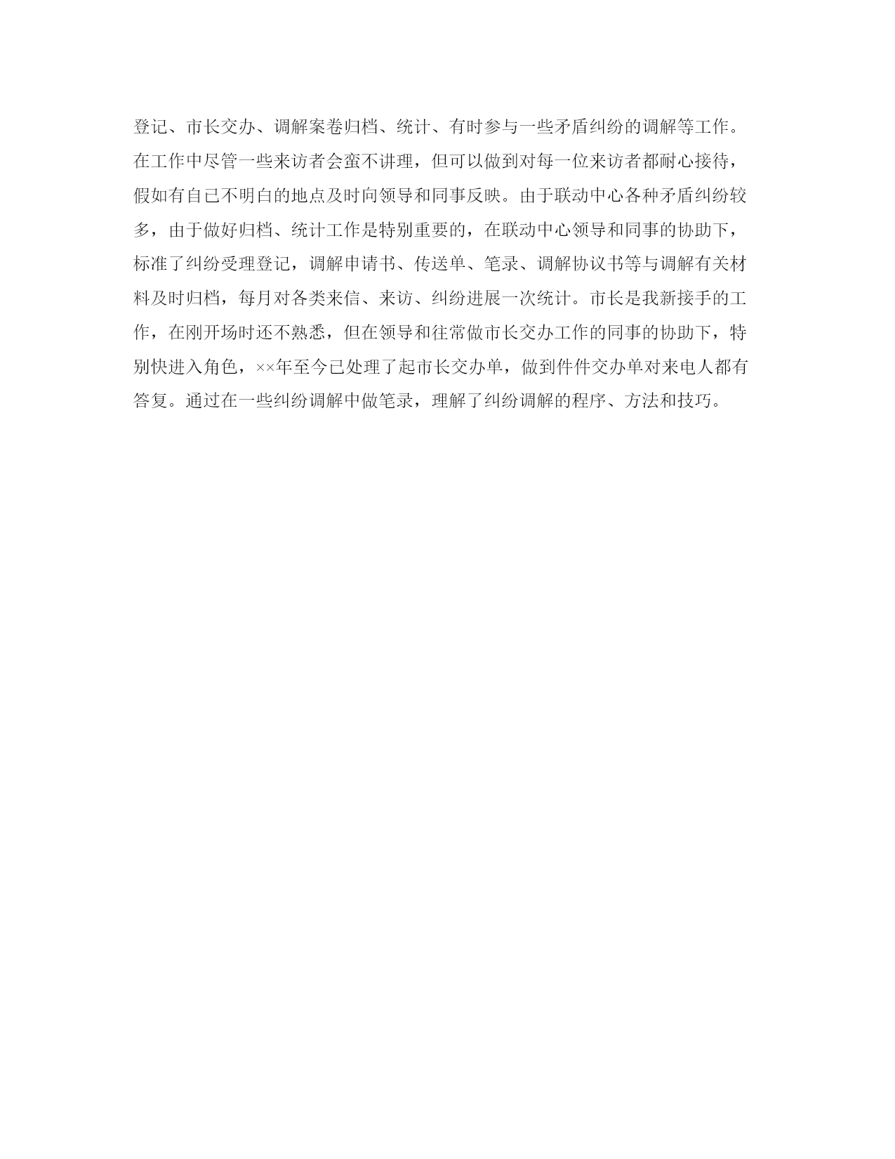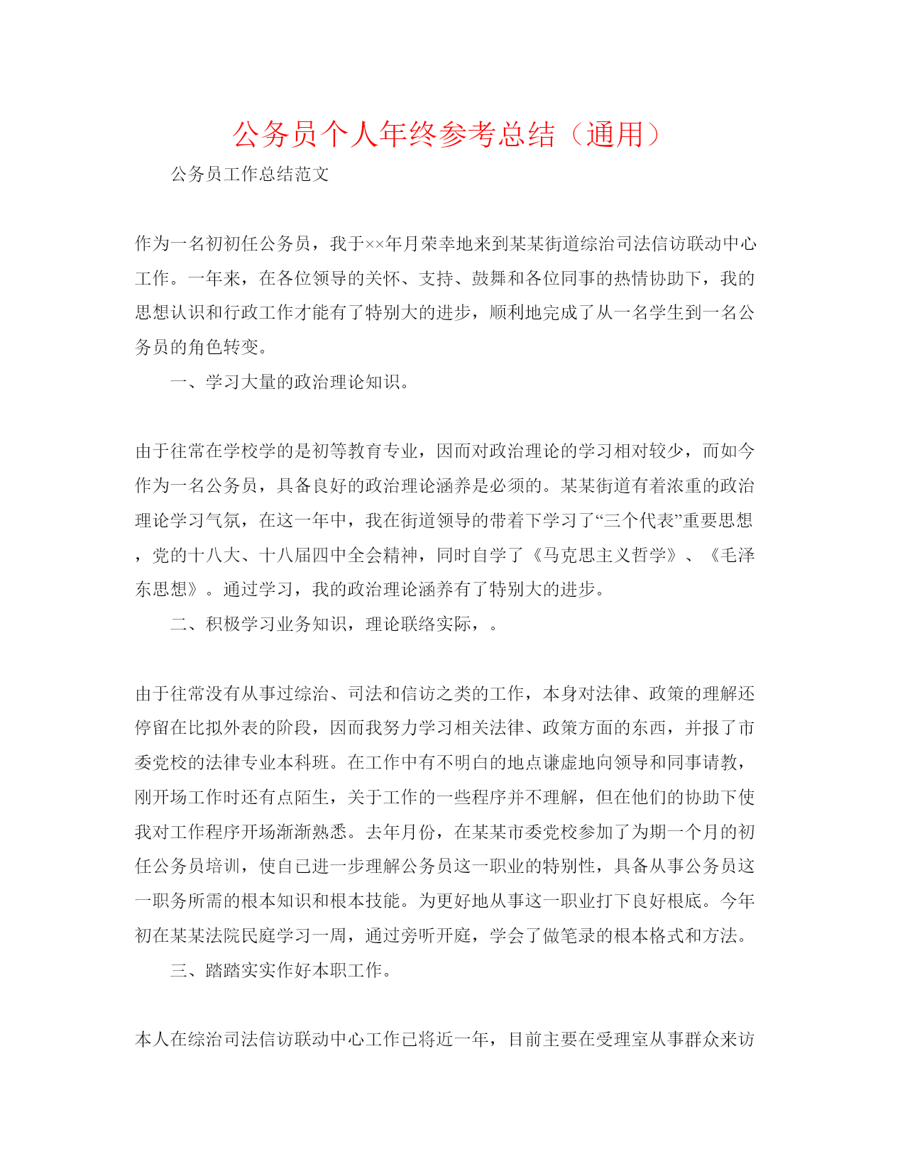 公务员个人年终参考总结(通用)公务员工作总结范文作为一名初初任公务员,我于××年月荣幸地来到某某街道综治司法信访联动中心工作。一年来,在各位领导的关怀、支持、鼓舞和各位同事的热情协助下,我的思想认识和行政工作才能有了特别大的进步,顺利地完成了从一名学生到一名公务员的角色转变。一、学习大量的政治理论知识。由于往常在学校学的是初等教育专业,因而对政治理论的学习相对较少,而如今作为一名公务员,具备良好的政治理论涵养是必须的。某某街道有着浓重的政治理论学习气氛,在这一年中,我在街道领导的带着下学习了“三个代表”重要思想,党的十八大、十八届四中全会精神,同时自学了《马克思主义哲学》、《毛泽东思想》。通过学习,我的政治理论涵养有了特别大的进步。二、积极学习业务知识,理论联络实际,。由于往常没有从事过综治、司法和信访之类的工作,本身对法律、政策的理解还停留在比拟外表的阶段,因而我努力学习相关法律、政策方面的东西,并报了市委党校的法律专业本科班。在工作中有不明白的地点谦虚地向领导和同事请教,刚开场工作时还有点陌生,关于工作的一些程序并不理解,但在他们的协助下使我对工作程序开场渐渐熟悉。去年月份,在某某市委党校参加了为期一个月的初任公务员培训,使自已进一步理解公务员这一职业的特别性,具备从事公务员这一职务所需的根本知识和根本技能。为更好地从事这一职业打下良好根底。今年初在某某法院民庭学习一周,通过旁听开庭,学会了做笔录的根本格式和方法。三、踏踏实实作好本职工作。本人在综治司法信访联动中心工作已将近一年,目前主要在受理室从事群众来访登记、市长交办、调解案卷归档、统计、有时参与一些矛盾纠纷的调解等工作。在工作中尽管一些来访者会蛮不讲理,但可以做到对每一位来访者都耐心接待,假如有自已不明白的地点及时向领导和同事反映。由于联动中心各种矛盾纠纷较多,由于做好归档、统计工作是特别重要的,在联动中心领导和同事的协助下,标准了纠纷受理登记,调解申请书、传送单、笔录、调解协议书等与调解有关材料及时归档,每月对各类来信、来访、纠纷进展一次统计。市长是我新接手的工作,在刚开场时还不熟悉,但在领导和往常做市长交办工作的同事的协助下,特别快进入角色,××年至今已处理了起市长交办单,做到件件交办单对来电人都有答复。通过在一些纠纷调解中做笔录,理解了纠纷调解的程序、方法和技巧。