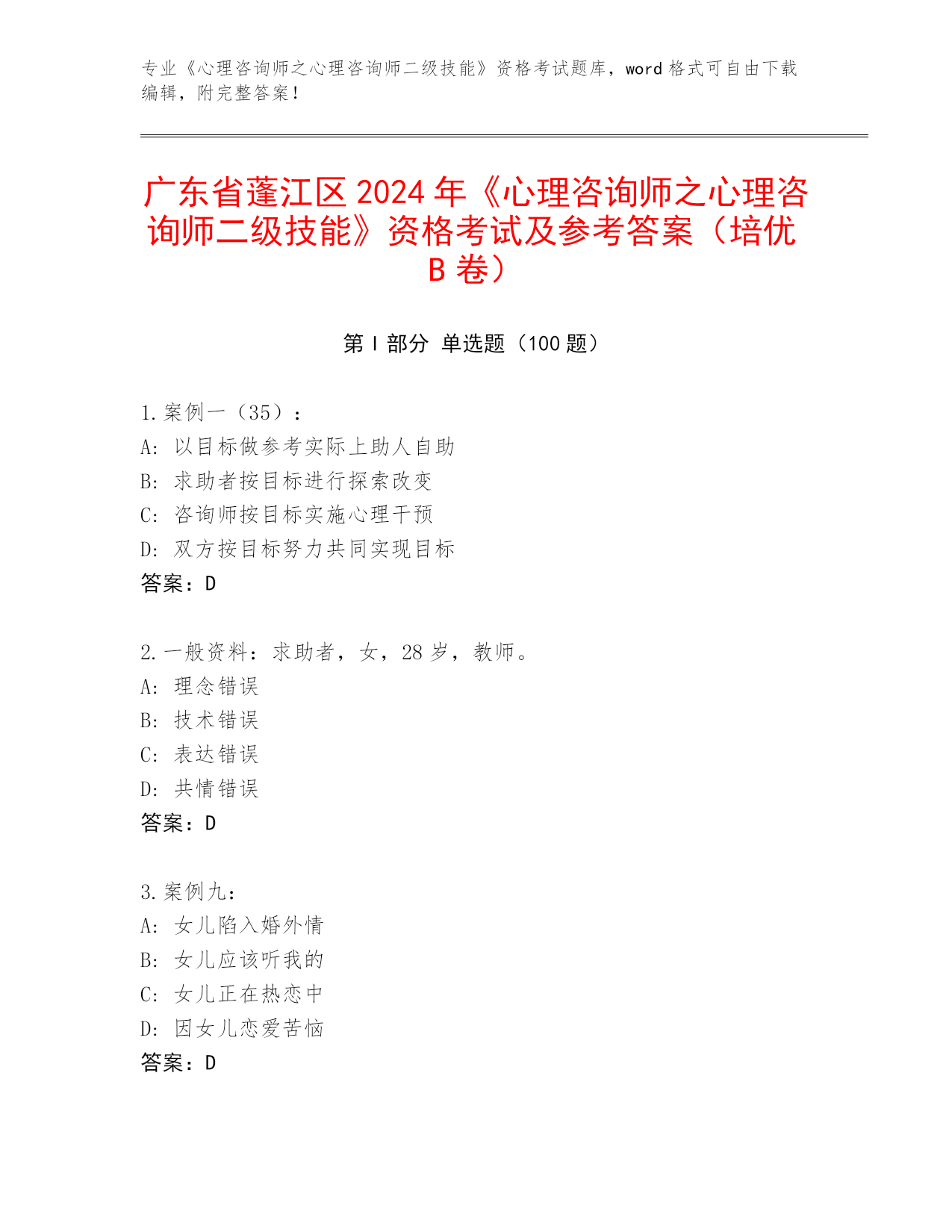 广东省蓬江区2024年《心理咨询师之心理咨询师二级技能》资格考试及参考答案(培优B卷)