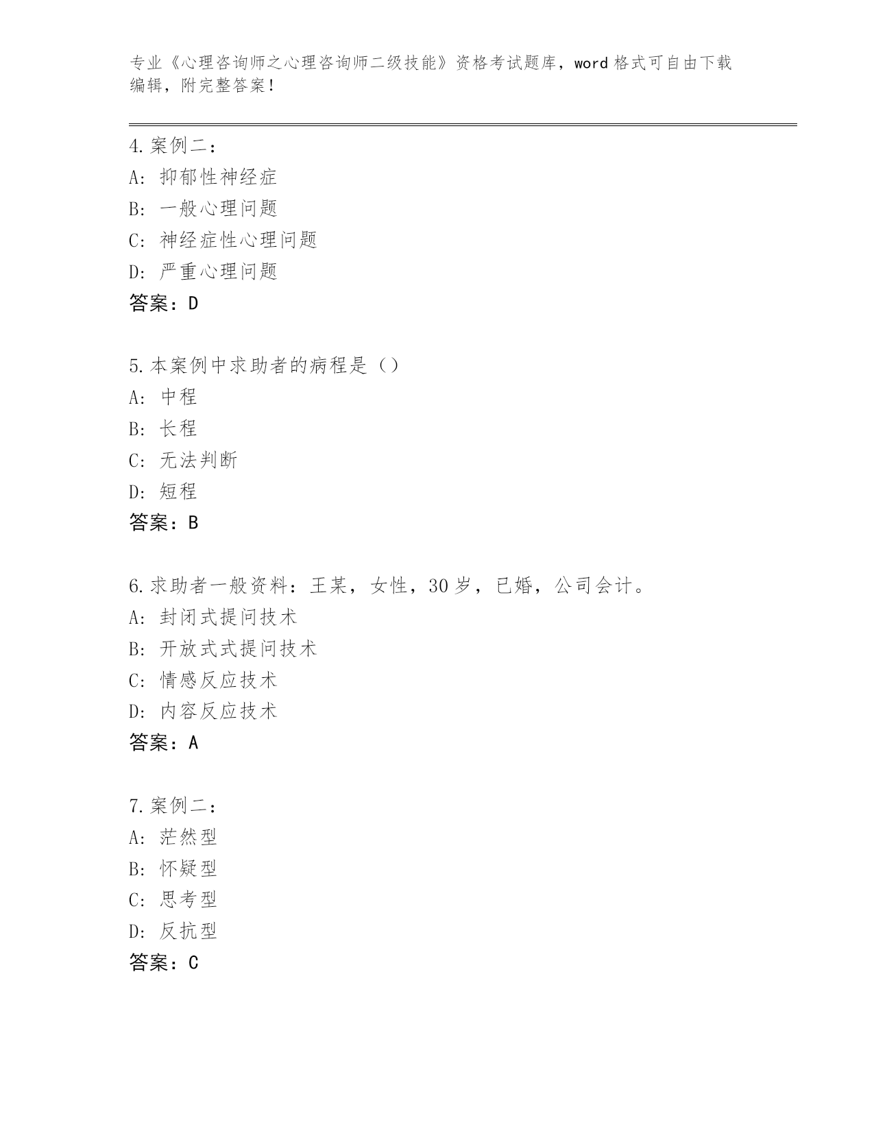 广东省恩平市整理《心理咨询师之心理咨询师二级技能》考试大全含答案(培优B卷)