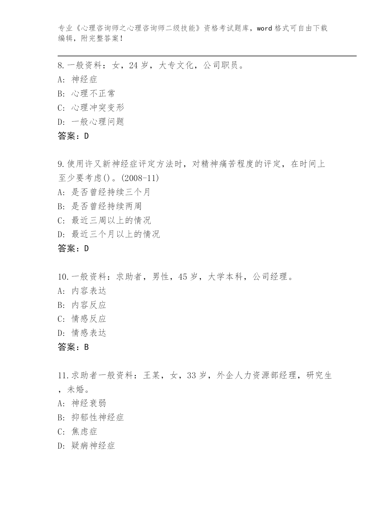 广东省浈江区2024年《心理咨询师之心理咨询师二级技能》资格考试必背200题题库(培优B卷)