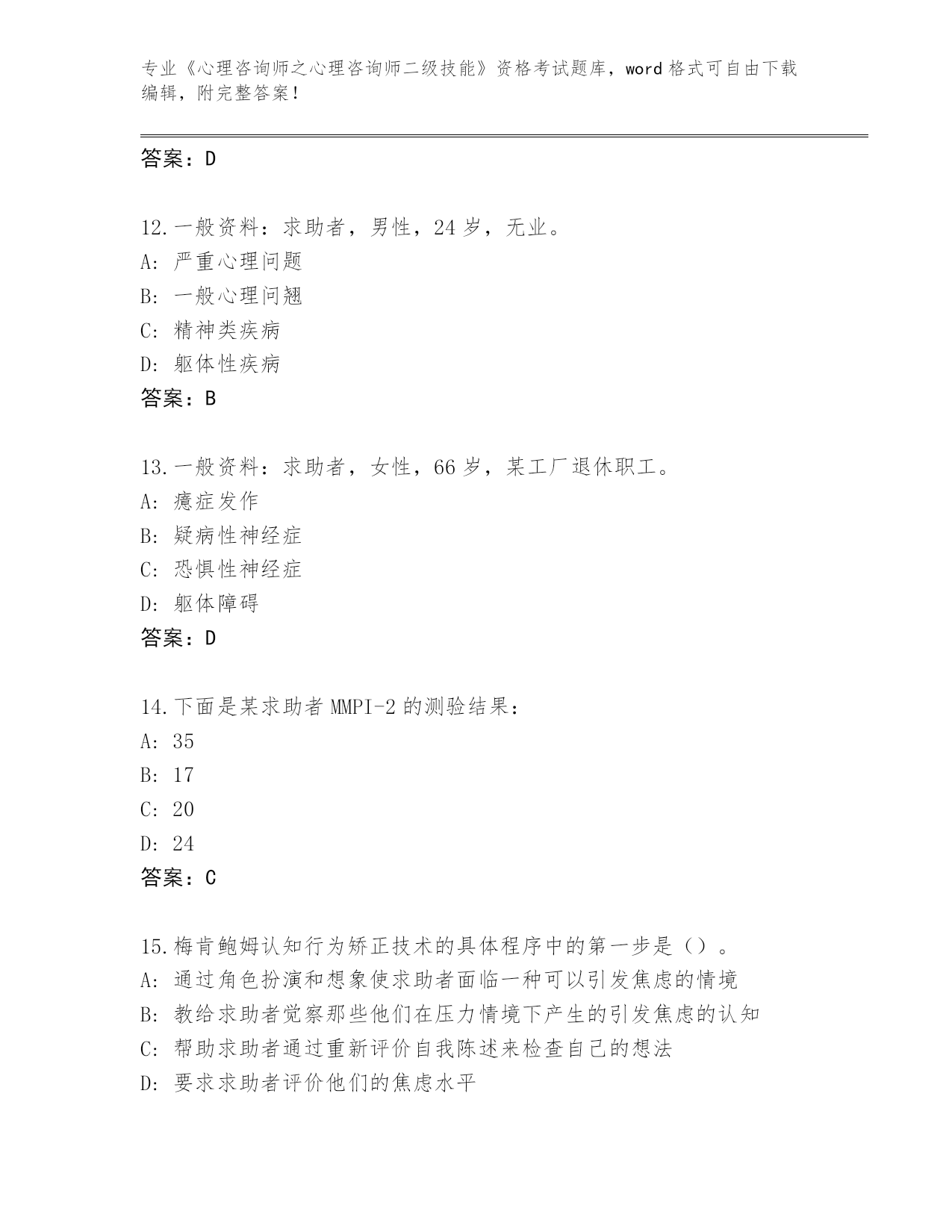 2024广东省《心理咨询师之心理咨询师二级技能》资格考试必背200题真题(培优B卷)