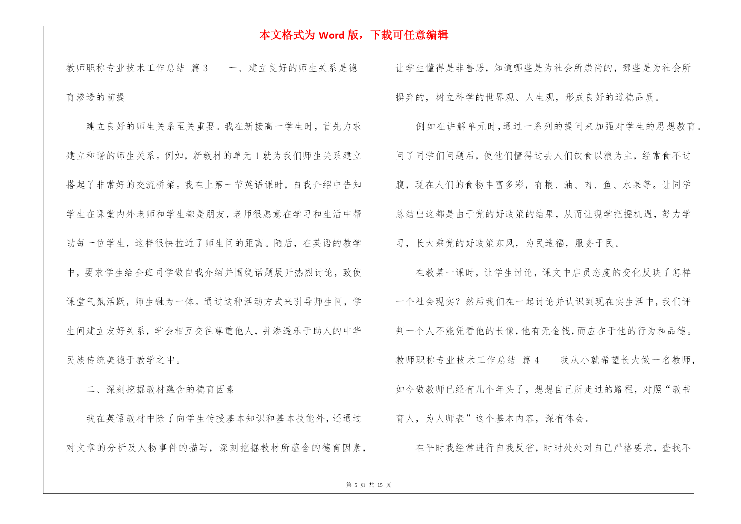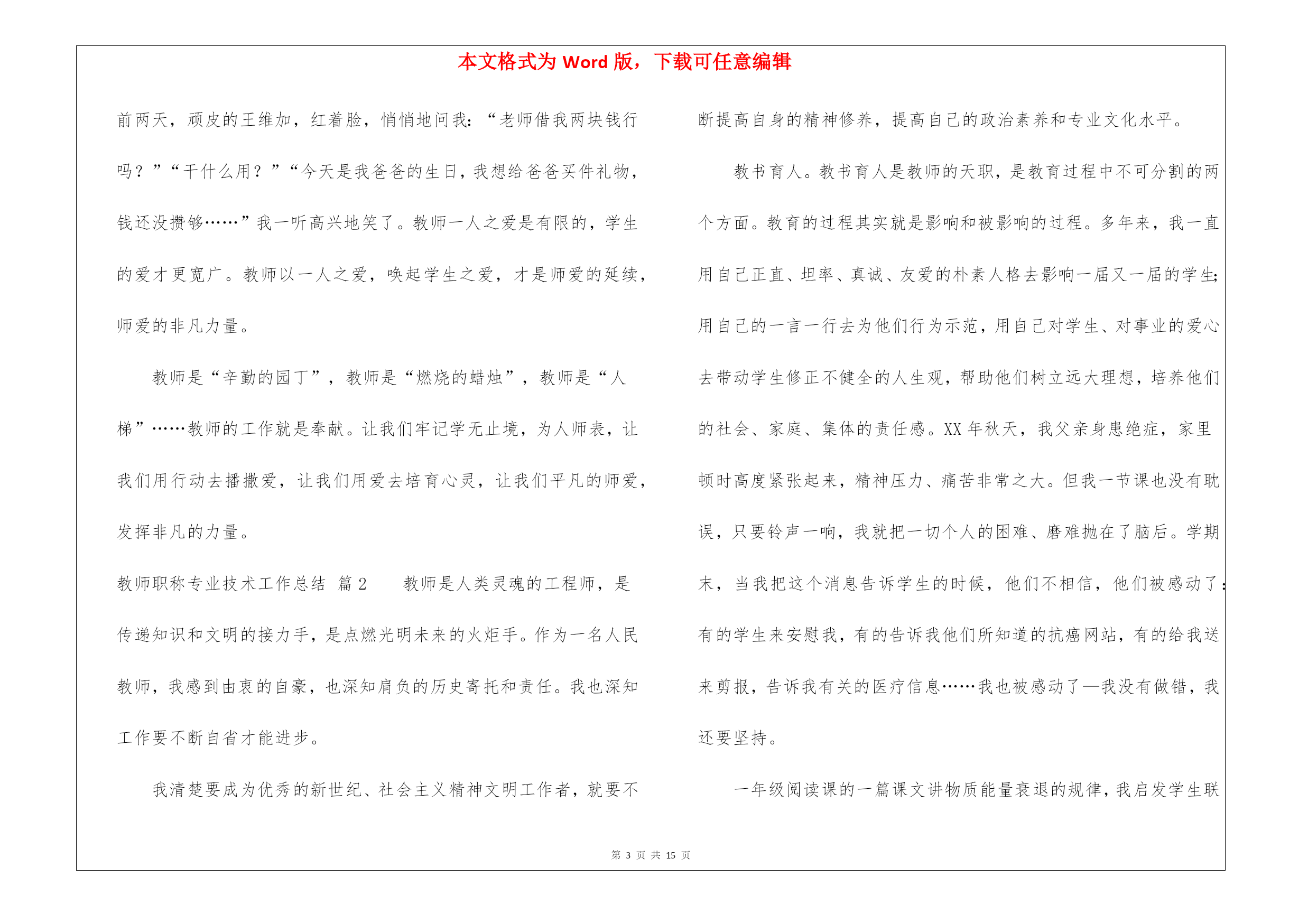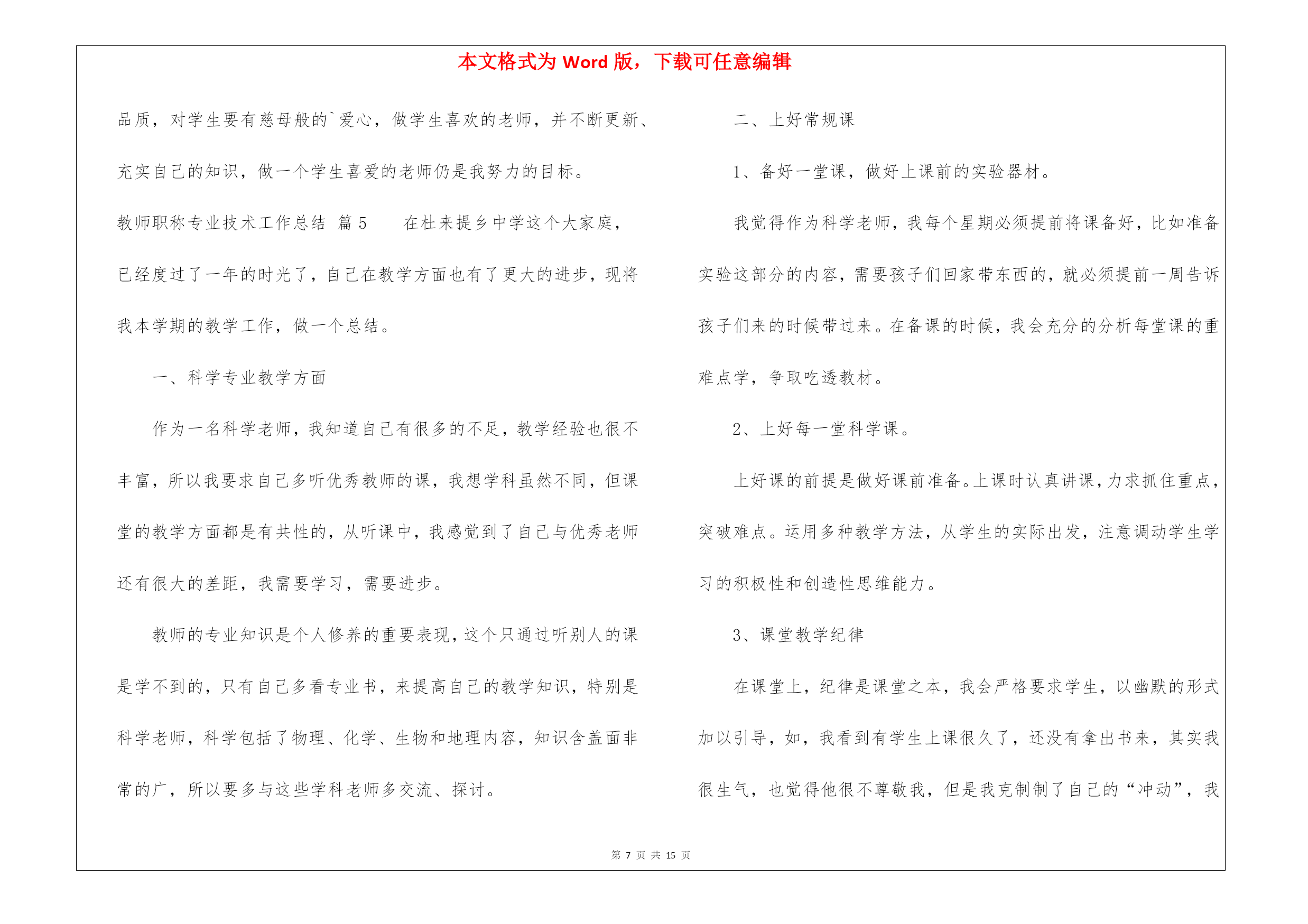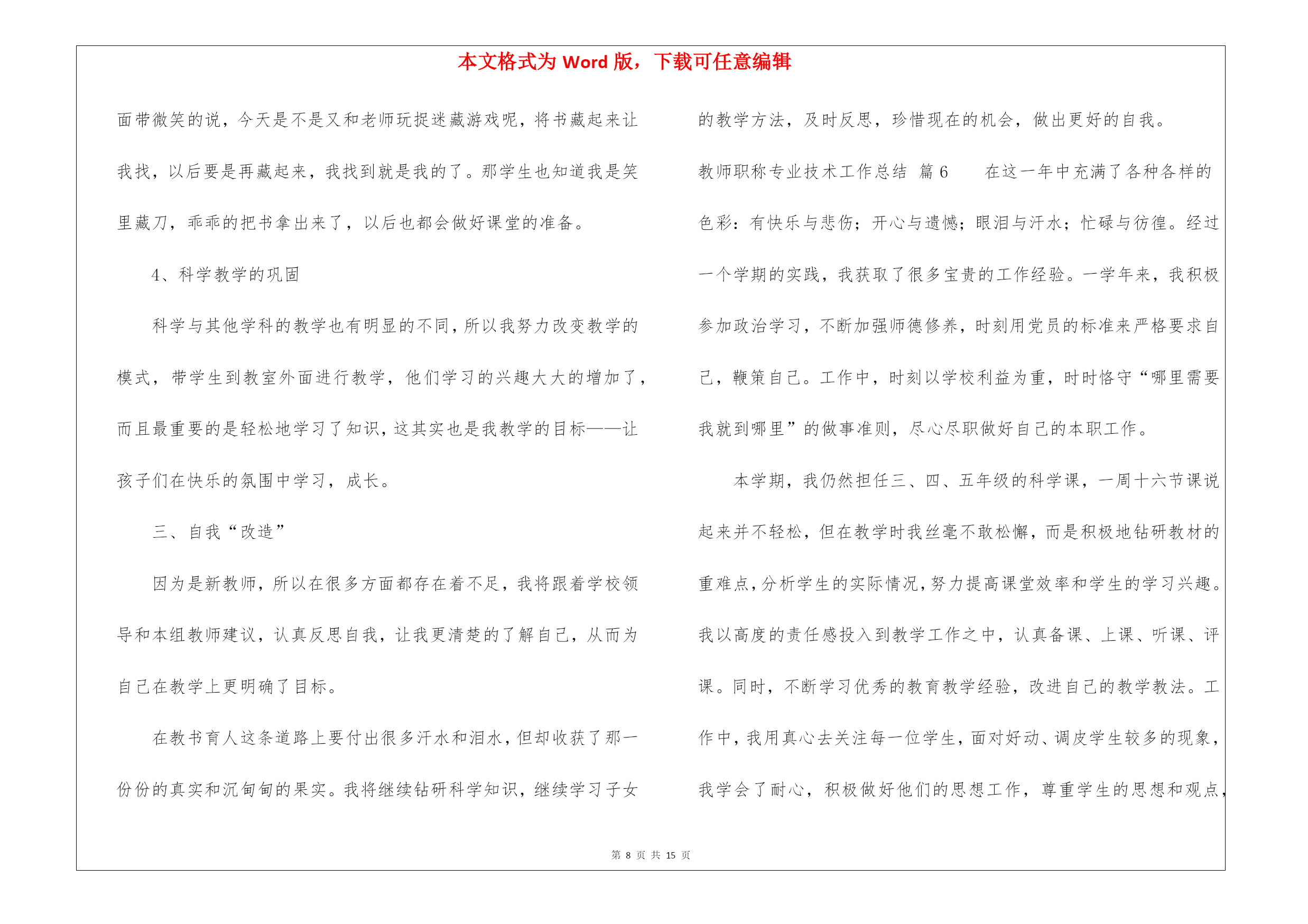 本文格式为Word版,下载可任意编辑第PAGE\*MERGEFORMAT15页共NUMPAGES\*MERGEFORMAT15页教师职称专业技术工作总结锦集8篇教师职称专业技术工作总结锦集8篇总结是指对某一阶段的工作、学习或思想中的经验或情况进行分析研究,做出带有规律性结论的书面材料,它可以促使我们思考,不如立即行动起来写一份总结吧。那么我们该怎么去写总结呢?以下是我为大家编写的教师职称专业技术工作总结8篇,仅供参考,大家一起来看看吧。教师职称专业技术工作总结篇1师爱是师德的重要表现之一。也正像教科文总干事马约翰先生说的:“世界上只有一种教育—爱的教育。”身为教师对每一个孩子都要做到“捧着一颗心来,不带半根草去”的境地,让教师永远当爱的播撒者。那么,平凡的师爱就会产生非凡的力量。我作为学校的校长更是深有体会。从朝师毕业已十年,但教育学、心理学的书籍却舍不得丢掉。每每翻起,必开卷有益,获得点滴灵感,得到一些帮助。从《儿童心理学》中获悉:七、八岁的孩子的个人的荣誉已不再能使他们满足,他们开始重视从集体的成功中获得满足……也就是学生的集体荣誉感在不断的增强。据此,在对学生进行行为规范养成教育时,时刻以小集体——小组、年级,大集体——年级、学校的荣誉来激励他们,规范他们的言行,收到的效果甚佳。《从环境对孩子的影响》一文中,我得到启示,新组建五(5)班时,教育孩子把握机会,重新塑造自己,借机改正不良习惯。使集体很快稳定下来,并且形成民主、快乐、团结向上的集体。随着信息时代的到来,计算机成了人们离不开的工具,为此我利用业余时间,完成了计算机信息管理专业大专班的学习。特别是在近两年的工作中受益匪浅。我能用电脑备课,绘制精美的统计图表、几何图形,通过演示文稿开阔了孩子们的视野。并且鼓励孩子们利用电脑制做课件,帮助理解书本上的知识。为人师表,师爱的基础。孔子说过:“其身正,不令而行,其身不正,虽令不从。”这说明凡是教师要求学生做到的,自己首先应该做到;凡是要求学生不能做的,自己先坚决不做。我们爱每一个学生,师爱的准则。一个人最崇高的爱是爱别人,一个教师最崇高的爱是全心去爱每一个学生,这也是师爱的准则。在教育工作中,教师要把信任和期待的目光洒向每个学生,把关爱倾注于整个教育教学过程之中,善于倾听学生的意见和呼声,和学生广交朋友,多开展谈心活动,与学生进行思想和情感上的交流,用爱去赢得一切学生的信赖。四、培养孩子的爱心,师爱的升华。人云:师者,所以传道、授业、解惑也。解惑,不仅要解决知识上的疑惑,更要重视道德、行为上的疑惑。即教师在教授知识的同时,更要重视孩子的行为习惯,教授做人的道理。“要立业,先树人”。现在有些学生由于家庭的宠爱、溺爱,在家里是“小太阳”、“小皇帝”,从小就养成了事事占先,以自己为中心的坏习惯。在自己热爱学生的同时,我还注意让每个孩子学会去爱他人。我把我最喜欢的一句话“要想别人爱你,你首先学会爱他人”送给学生们。并召开“爱、爱、爱”主题班会,让学生们用自己的双眼去寻找爱,亲身感受爱,最终用自己的行动去奉献爱。我新接五(5)班时,通过调查发现,孩子们非常喜欢过生日,找自己的好朋友庆祝一番,却不知道父母的生日。为此,我借“三八”妇女节之际,开展了“特殊的礼物”的活动,每人为自己的母亲送上一份有意义的礼物,看谁的礼物能称之为“特殊的礼物”。孩子们有的送给妈妈一首歌,有的给妈妈写一封信,有的送一盒擦手油……裴淼在周记中写道:老师让我送给妈妈一件特殊的礼物,我开始认真的观察妈妈,妈妈每天除了要上班,回家还要照顾我,买菜、做饭、洗衣服……妈妈太辛苦了。他们主动帮助低年级小同学做值日,积极为身患绝症的小伙伴捐款。在绿色环保活动中,不怕脏不怕累,回收废品,为奥运会作贡献。前两天,顽皮的王维加,红着脸,悄悄地问我:“老师借我两块钱行吗?”“干什么用?”“今天是我爸爸的生日,我想给爸爸买件礼物,钱还没攒够……”我一听高兴地笑了。教师一人之爱是有限的,学生的爱才更宽广。教师以一人之爱,唤起学生之爱,才是师爱的延续,师爱的非凡力量。教师是“辛勤的园丁”,教师是“燃烧的蜡烛”,教师是“人梯”……教师的工作就是奉献。让我们牢记学无止境,为人师表,让我们用行动去播撒爱,让我们用爱去培育心灵,让我们平凡的师爱,发挥非凡的力量。教师职称专业技术工作总结篇2教师是人类灵魂的工程师,是传递知识和文明的接力手,是点燃光明未来的火炬手。作为一名人民教师,我感到由衷的自豪,也深知肩负的历史寄托和责任。我也深知工作要不断自省才能进步。我清楚要成为优秀的新世纪、社会主义精神文明工作者,就要不断提高自身的精神修养,提高自己的政治素养和专业文化水平。教书育人。教书育人是教师的天职,是教育过程中不可分割的两个方面。教育的过程其实就是影响和被影响的过程。多年来,我