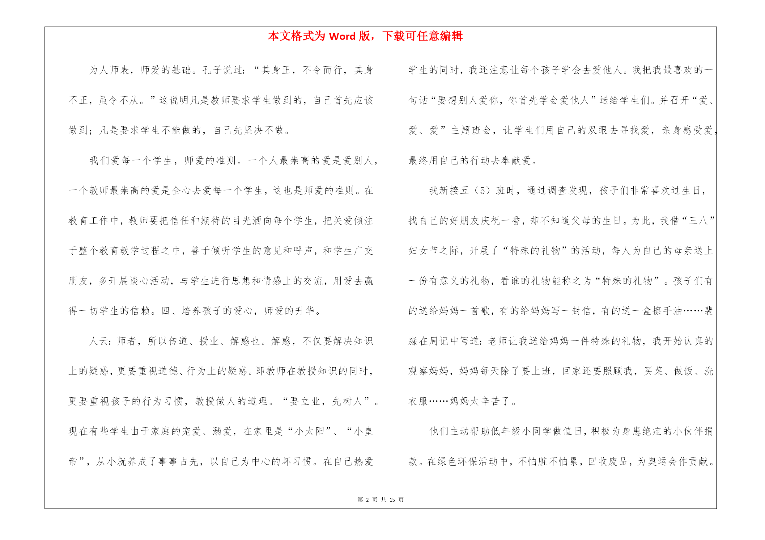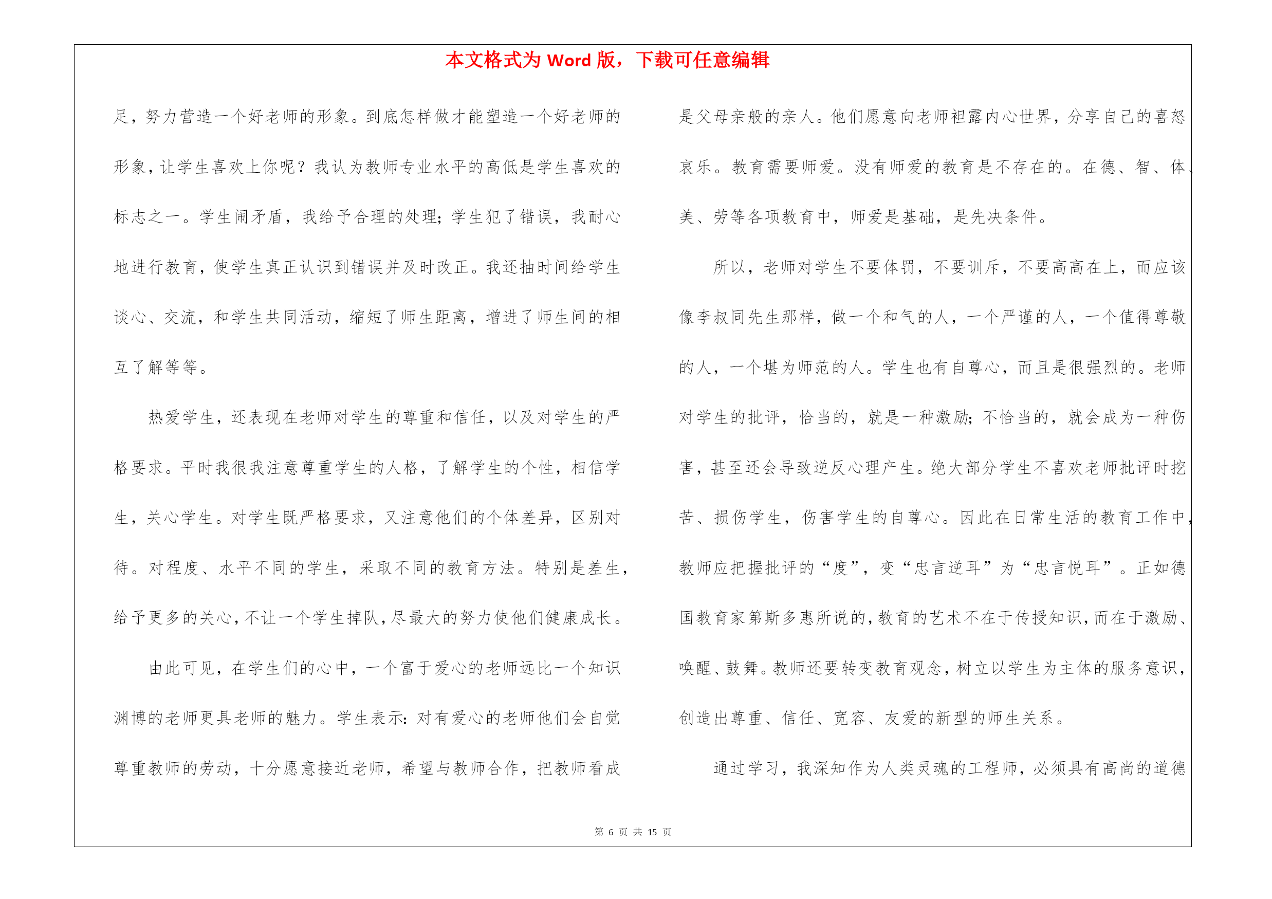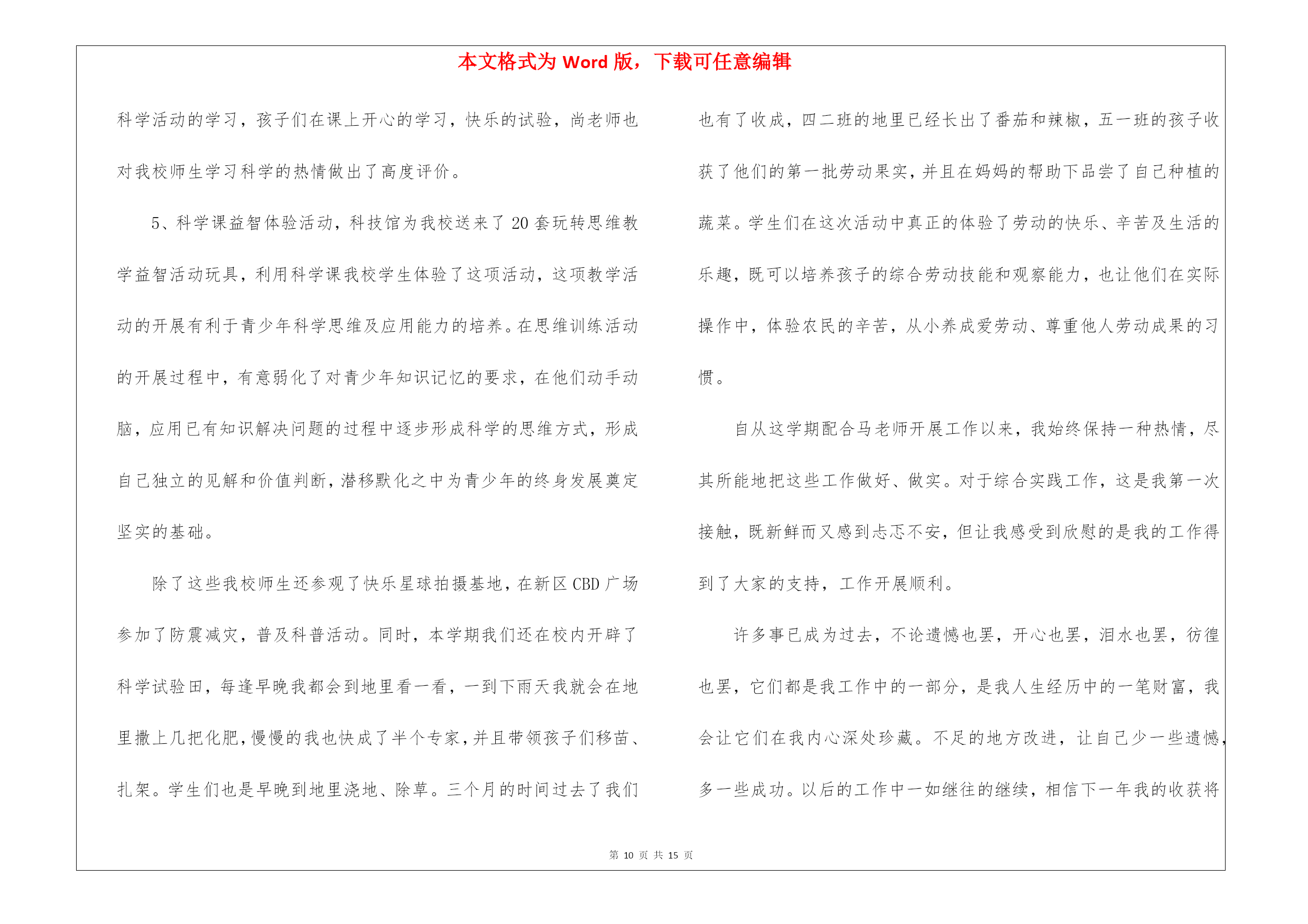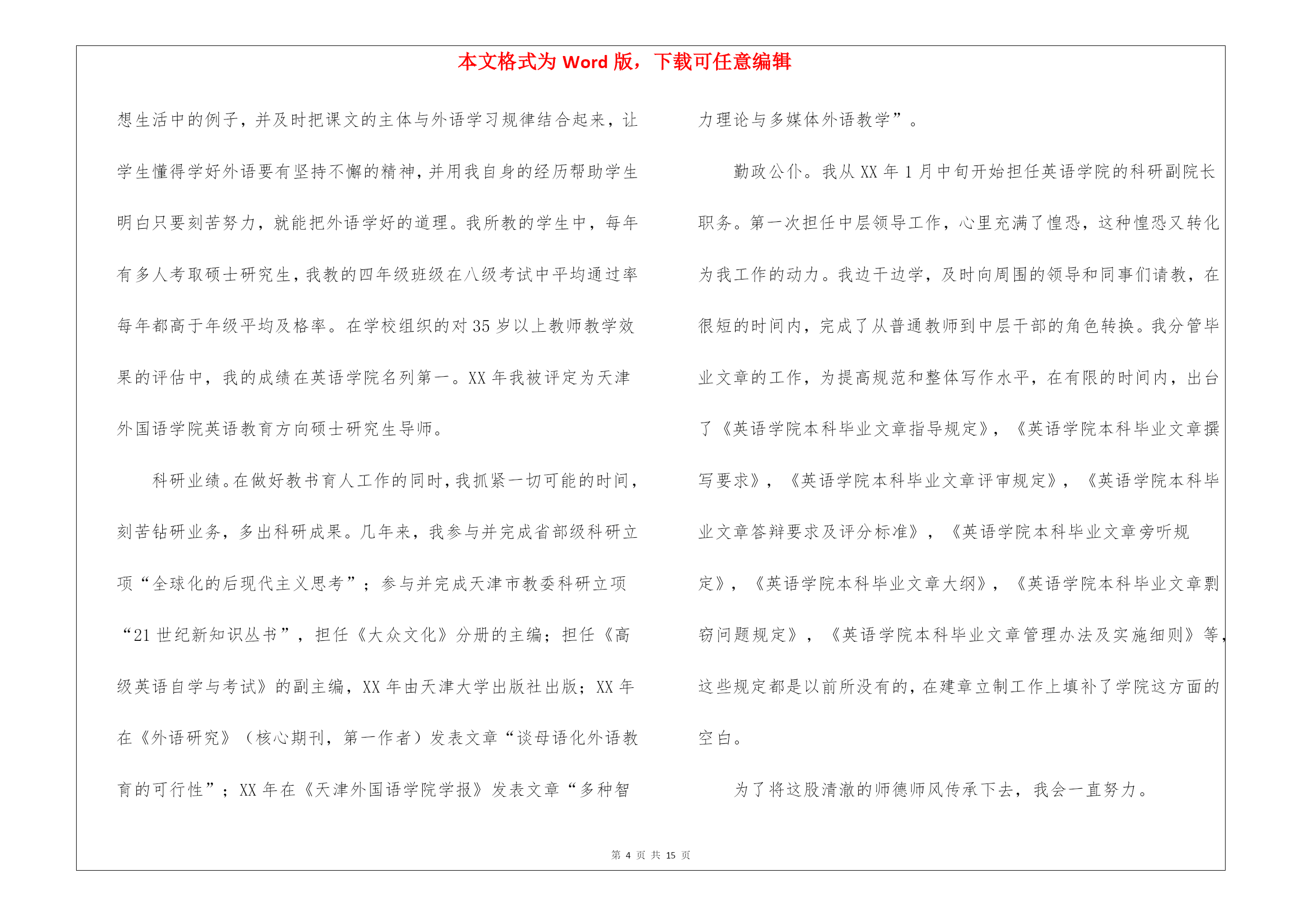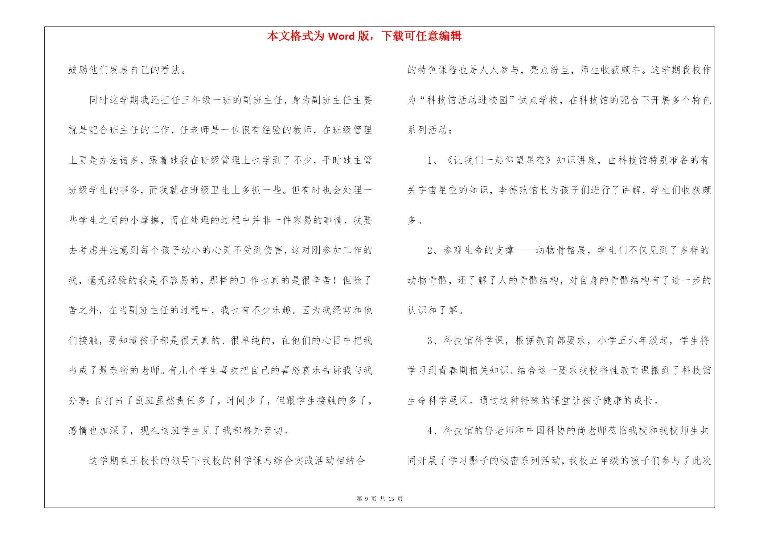 本文格式为Word版,下载可任意编辑第PAGE\*MERGEFORMAT15页共NUMPAGES\*MERGEFORMAT15页教师职称专业技术工作总结锦集8篇教师职称专业技术工作总结锦集8篇总结是指对某一阶段的工作、学习或思想中的经验或情况进行分析研究,做出带有规律性结论的书面材料,它可以促使我们思考,不如立即行动起来写一份总结吧。那么我们该怎么去写总结呢?以下是我为大家编写的教师职称专业技术工作总结8篇,仅供参考,大家一起来看看吧。教师职称专业技术工作总结篇1师爱是师德的重要表现之一。也正像教科文总干事马约翰先生说的:“世界上只有一种教育—爱的教育。”身为教师对每一个孩子都要做到“捧着一颗心来,不带半根草去”的境地,让教师永远当爱的播撒者。那么,平凡的师爱就会产生非凡的力量。我作为学校的校长更是深有体会。从朝师毕业已十年,但教育学、心理学的书籍却舍不得丢掉。每每翻起,必开卷有益,获得点滴灵感,得到一些帮助。从《儿童心理学》中获悉:七、八岁的孩子的个人的荣誉已不再能使他们满足,他们开始重视从集体的成功中获得满足……也就是学生的集体荣誉感在不断的增强。据此,在对学生进行行为规范养成教育时,时刻以小集体——小组、年级,大集体——年级、学校的荣誉来激励他们,规范他们的言行,收到的效果甚佳。《从环境对孩子的影响》一文中,我得到启示,新组建五(5)班时,教育孩子把握机会,重新塑造自己,借机改正不良习惯。使集体很快稳定下来,并且形成民主、快乐、团结向上的集体。随着信息时代的到来,计算机成了人们离不开的工具,为此我利用业余时间,完成了计算机信息管理专业大专班的学习。特别是在近两年的工作中受益匪浅。我能用电脑备课,绘制精美的统计图表、几何图形,通过演示文稿开阔了孩子们的视野。并且鼓励孩子们利用电脑制做课件,帮助理解书本上的知识。为人师表,师爱的基础。孔子说过:“其身正,不令而行,其身不正,虽令不从。”这说明凡是教师要求学生做到的,自己首先应该做到;凡是要求学生不能做的,自己先坚决不做。我们爱每一个学生,师爱的准则。一个人最崇高的爱是爱别人,一个教师最崇高的爱是全心去爱每一个学生,这也是师爱的准则。在教育工作中,教师要把信任和期待的目光洒向每个学生,把关爱倾注于整个教育教学过程之中,善于倾听学生的意见和呼声,和学生广交朋友,多开展谈心活动,与学生进行思想和情感上的交流,用爱去赢得一切学生的信赖。四、培养孩子的爱心,师爱的升华。人云:师者,所以传道、授业、解惑也。解惑,不仅要解决知识上的疑惑,更要重视道德、行为上的疑惑。即教师在教授知识的同时,更要重视孩子的行为习惯,教授做人的道理。“要立业,先树人”。现在有些学生由于家庭的宠爱、溺爱,在家里是“小太阳”、“小皇帝”,从小就养成了事事占先,以自己为中心的坏习惯。在自己热爱学生的同时,我还注意让每个孩子学会去爱他人。我把我最喜欢的一句话“要想别人爱你,你首先学会爱他人”送给学生们。并召开“爱、爱、爱”主题班会,让学生们用自己的双眼去寻找爱,亲身感受爱,最终用自己的行动去奉献爱。我新接五(5)班时,通过调查发现,孩子们非常喜欢过生日,找自己的好朋友庆祝一番,却不知道父母的生日。为此,我借“三八”妇女节之际,开展了“特殊的礼物”的活动,每人为自己的母亲送上一份有意义的礼物,看谁的礼物能称之为“特殊的礼物”。孩子们有的送给妈妈一首歌,有的给妈妈写一封信,有的送一盒擦手油……裴淼在周记中写道:老师让我送给妈妈一件特殊的礼物,我开始认真的观察妈妈,妈妈每天除了要上班,回家还要照顾我,买菜、做饭、洗衣服……妈妈太辛苦了。他们主动帮助低年级小同学做值日,积极为身患绝症的小伙伴捐款。在绿色环保活动中,不怕脏不怕累,回收废品,为奥运会作贡献。前两天,顽皮的王维加,红着脸,悄悄地问我:“老师借我两块钱行吗?”“干什么用?”“今天是我爸爸的生日,我想给爸爸买件礼物,钱还没攒够……”我一听高兴地笑了。教师一人之爱是有限的,学生的爱才更宽广。教师以一人之爱,唤起学生之爱,才是师爱的延续,师爱的非凡力量。教师是“辛勤的园丁”,教师是“燃烧的蜡烛”,教师是“人梯”……教师的工作就是奉献。让我们牢记学无止境,为人师表,让我们用行动去播撒爱,让我们用爱去培育心灵,让我们平凡的师爱,发挥非凡的力量。教师职称专业技术工作总结篇2教师是人类灵魂的工程师,是传递知识和文明的接力手,是点燃光明未来的火炬手。作为一名人民教师,我感到由衷的自豪,也深知肩负的历史寄托和责任。我也深知工作要不断自省才能进步。我清楚要成为优秀的新世纪、社会主义精神文明工作者,就要不断提高自身的精神修养,提高自己的政治素养和专业文化水平。教书育人。教书育人是教师的天职,是教育过程中不可分割的两个方面。教育的过程其实就是影响和被影响的过程。多年来,我