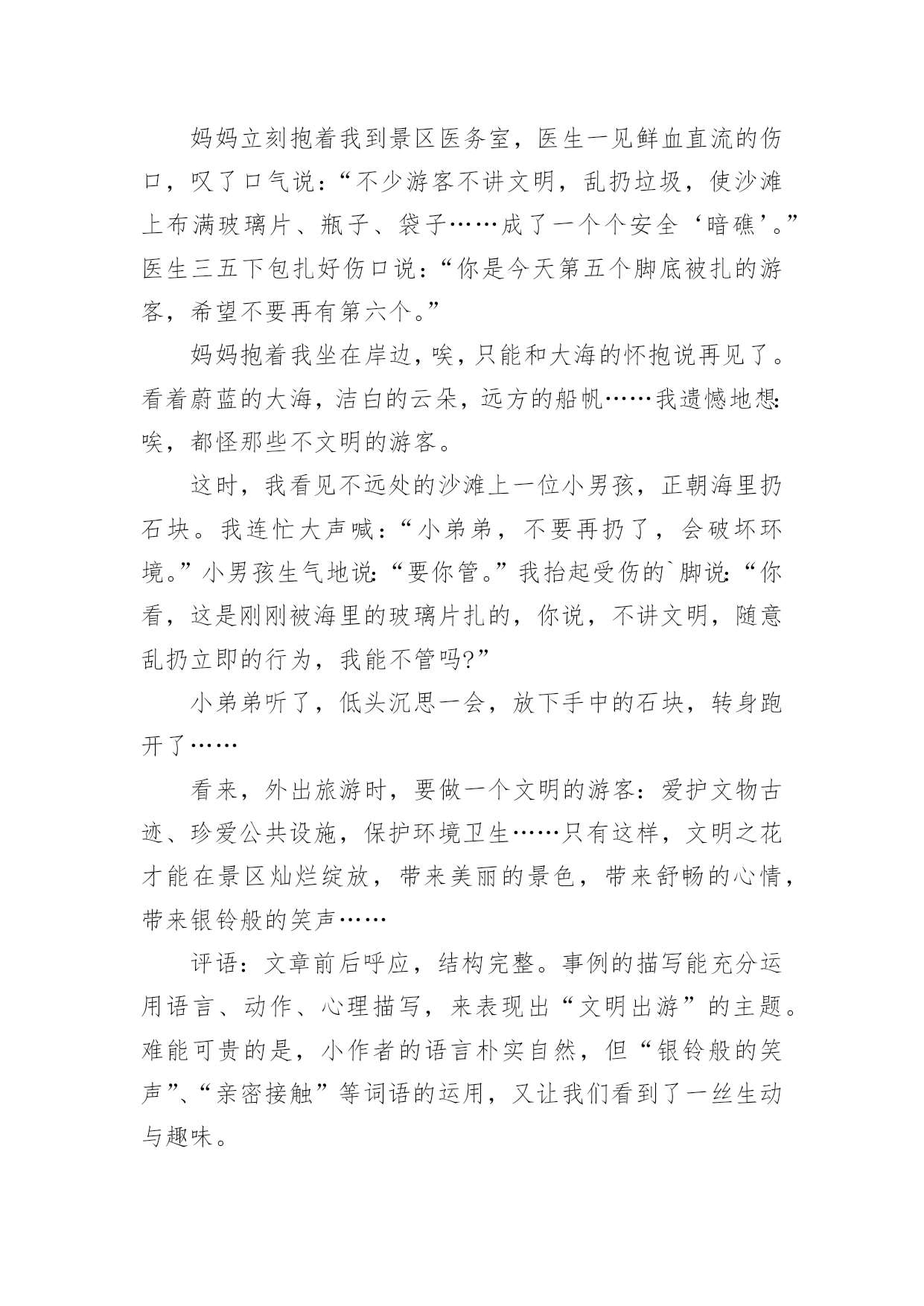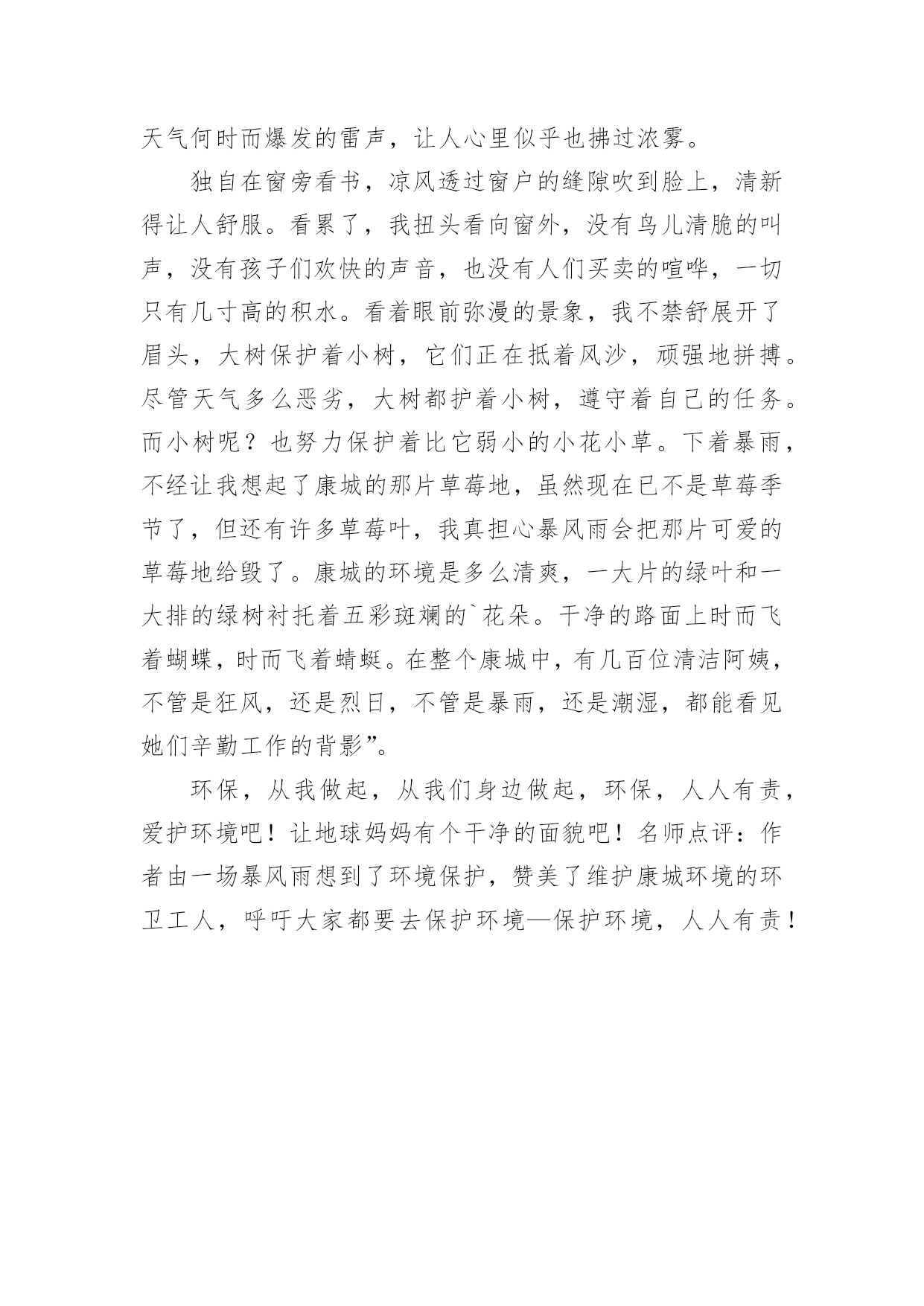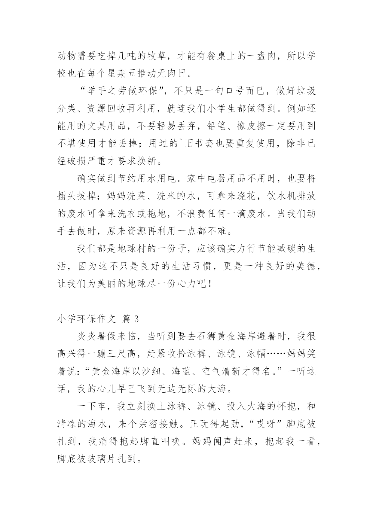 小学环保作文小学环保作文合集六篇在学习、工作或生活中,大家一定都接触过作文吧,作文要求篇章结构完整,一定要避免无结尾作文的出现。如何写一篇有思想、有文采的作文呢?下面是小编为大家收集的小学环保作文6篇,供大家参考借鉴,希望可以帮助到有需要的朋友。小学环保作文篇1大家都知道,每年的4月24日是地球环保日,在这一天,大家都应该实际行动起来保护我们的地球,为地球母亲做一些事情。但是生活中有一些人,经常把一些果皮,垃圾甚至是痰往地上随地扔,随地吐。这不仅给地面造成很大的伤害,还对环境造成了巨大的影响。记得有一次,我和妈妈一起去黄山旅游。我和妈妈刚走在黄山的山脚下,忽然间,我被一个奇怪的东西绊倒,差点把头撞破。妈妈赶紧扶起我,用自己口袋中的手帕帮我的.揉了揉,说道:“怎么样,还疼吗?”我连忙说:“不疼,不疼。”我回头一看,看见一块香蕉皮把我给绊倒了。我拿起香蕉皮,把它扔到旁边的垃圾箱(我这样做是为了防止有人跟我一样被绊倒)。妈妈看着我,说:“看来这个条路上可能还有这样的果皮垃圾,我们还是赶紧离开这里吧。”说完便带着我离开了那个危险之地。本来这个星球是无比美好的,但是在这里却有一些人为了自己的一点私利,把这里的河水没有树木的遮挡而发生了洪灾、泥石流等自然地质灾害。而造成这一切的真凶,就是那些只为利益而不懂得爱护的人类。现在的地球,大多都被那些自然灾害而毁灭。像南极和北极,以前那里有着好多的动物、企鹅、北极熊、北极狐等动物,还存有上千年的冰山,但是,因为全球变暖,冰山开始融化,许多动物都因为没有地方生存而离开了南极和北极。而想拯救那些自然景物,也就只能靠我们人类。保护地球,人人有责。让我们从现在做起,用实际行动来保护环境,让那些动物重新回归到自己的家园。小学环保作文篇2记得不久前在电视上看过一部卡通影片,片名叫做《风之谷》。影片中呈现出世界被污染很严重,以及整个世界即将灭亡的情形,看了之后真是令人忧心,我觉得我们一定要改掉不良的生活习惯,因为要救地球只能靠自己。为了挽救这个危机,当务之急就是要做好节能减碳和资源回收。首先我们要将节能减碳的观念告诉家人,例如能骑脚踏车就不要骑机车,能骑机车就不要开车,以减少汽机车所排放的废气,而且骑脚踏车和走路是一项很好的健身运动,若能如此真是一举两得。饮食方面尽量多蔬食、少鱼肉,这样就不必豢养这么多家禽家畜,也可以减少由动物体内排放出的碳量。根据报导,动物需要吃掉几吨的牧草,才能有餐桌上的一盘肉,所以学校也在每个星期五推动无肉日。“举手之劳做环保”,不只是一句口号而已,做好垃圾分类、资源回收再利用,就连我们小学生都做得到。例如还能用的文具用品,不要轻易丢弃,铅笔、橡皮擦一定要用到不堪使用才能丢掉;用过的`旧书套也要重复使用,除非已经破损严重才要求换新。确实做到节约用水用电。家中电器用品不用时,也要将插头拔掉;妈妈洗菜、洗米的水,可拿来浇花,饮水机排放的废水可拿来洗衣或拖地,不浪费任何一滴废水。当我们动手去做时,原来资源再利用一点都不难。我们都是地球村的一份子,应该确实力行节能减碳的生活,因为这不只是良好的生活习惯,更是一种良好的美德,让我们为美丽的地球尽一份心力吧!小学环保作文篇3炎炎暑假来临,当听到要去石狮黄金海岸避暑时,我很高兴得一蹦三尺高,赶紧收拾泳裤、泳镜、泳帽……妈妈笑着说:“黄金海岸以沙细、海蓝、空气清新才得名。”一听这话,我的心儿早已飞到无边无际的大海。一下车,我立刻换上泳裤、泳镜、投入大海的怀抱,和清凉的海水,来个亲密接触。正玩得起劲,“哎呀”脚底被扎到,我痛得抱起脚直叫唤。妈妈闻声赶来,抱起我一看,脚底被玻璃片扎到。妈妈立刻抱着我到景区医务室,医生一见鲜血直流的伤口,叹了口气说:“不少游客不讲文明,乱扔垃圾,使沙滩上布满玻璃片、瓶子、袋子……成了一个个安全‘暗礁’。”医生三五下包扎好伤口说:“你是今天第五个脚底被扎的游客,希望不要再有第六个。”妈妈抱着我坐在岸边,唉,只能和大海的怀抱说再见了。看着蔚蓝的大海,洁白的云朵,远方的船帆……我遗憾地想:唉,都怪那些不文明的游客。这时,我看见不远处的沙滩上一位小男孩,正朝海里扔石块。我连忙大声喊:“小弟弟,不要再扔了,会破坏环境。”小男孩生气地说:“要你管。”我抬起受伤的`脚说:“你看,这是刚刚被海里的玻璃片扎的,你说,不讲文明,随意乱扔立即的行为,我能不管吗?”小弟弟听了,低头沉思一会,放下手中的石块,转身跑开了……看来,外出旅游时,要做一个文明的游客:爱护文物古迹、珍爱公共设施,保护环境卫生……只有这样,文明之花才能在景区灿烂绽放,带来美丽的景色,带来舒畅的心情,带来银铃般的笑声……评语:文章前后呼应,结构完整。事例的描写能充分运用语言、动作、心理描写,来表现出“文明出游”的主题。难能可贵的是,小作者的语言朴实自然,但“银铃般的笑声”、“亲