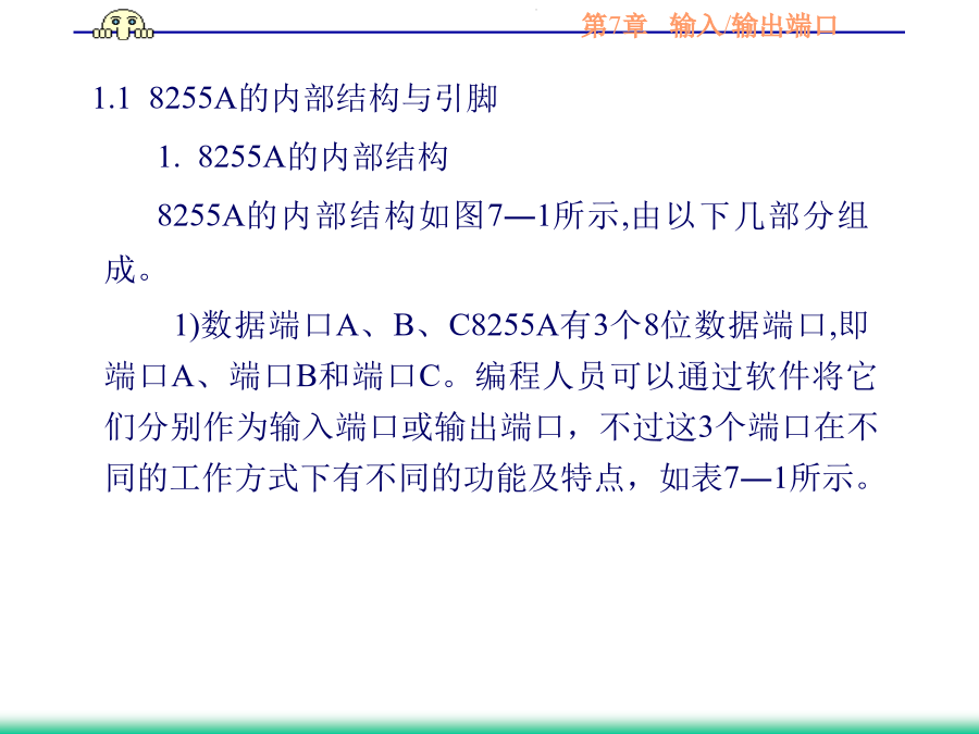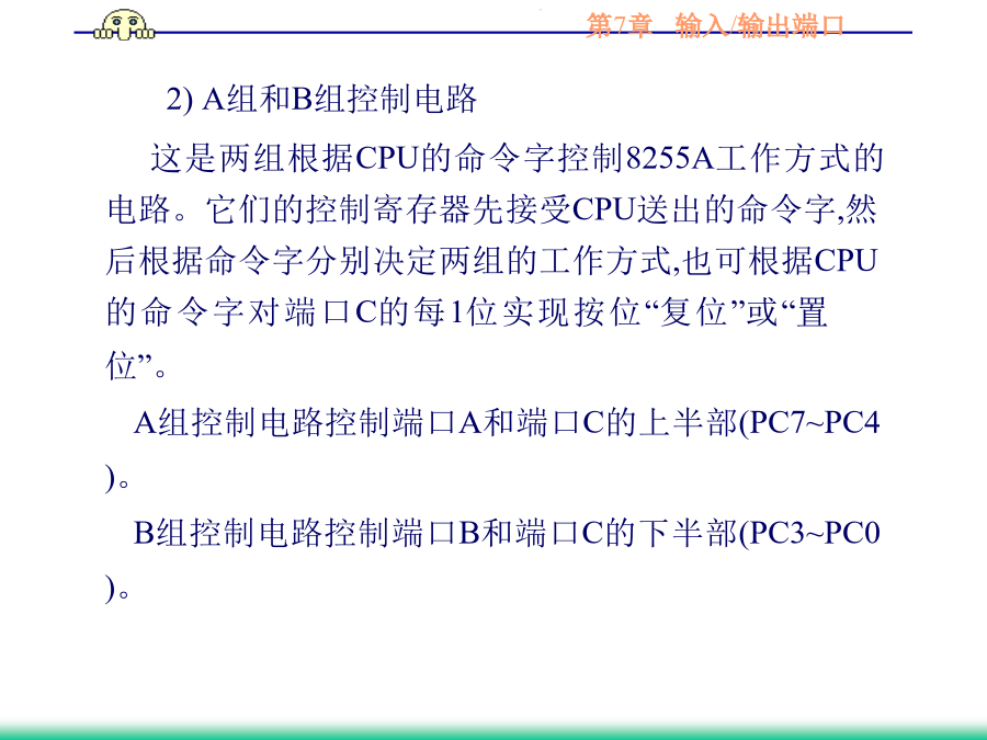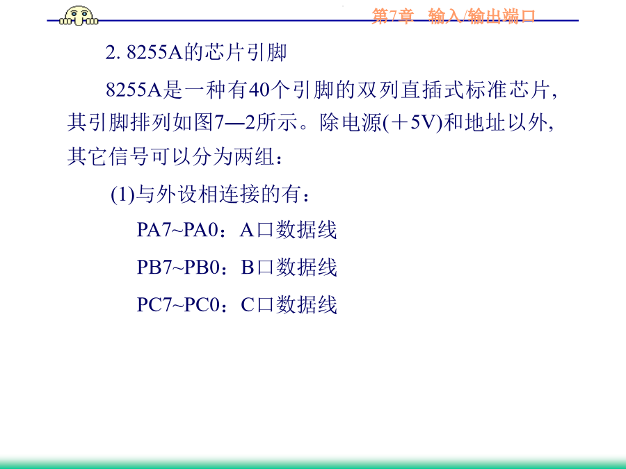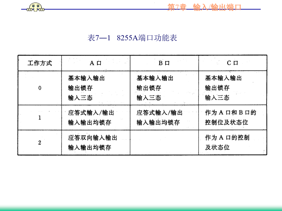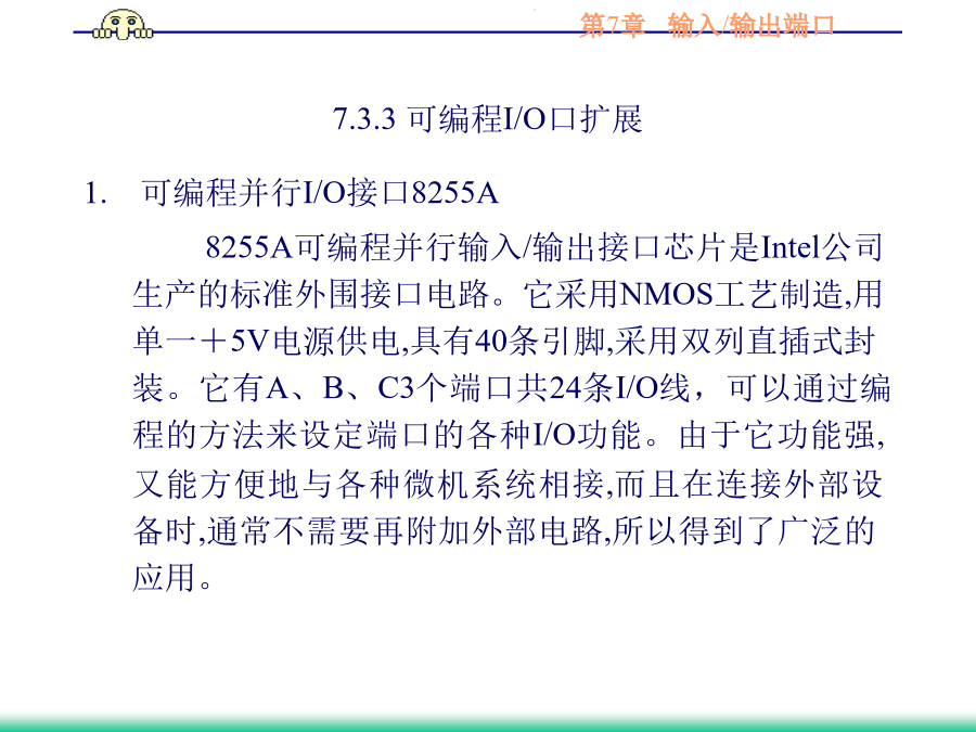 7.3I/O口的扩展7.3.3可编程I/O口扩展1.18255A的内部结构与引脚1.8255A的内部结构8255A的内部结构如图7―1所示,由以下几部分组成。1)数据端口A、B、C8255A有3个8位数据端口,即端口A、端口B和端口C。编程人员可以通过软件将它们分别作为输入端口或输出端口,不过这3个端口在不同的工作方式下有不同的功能及特点,如表7―1所示。图7―18255A的内部结构图2)A组和B组控制电路这是两组根据CPU的命令字控制8255A工作方式的电路。它们的控制寄存器先接受CPU送出的命令字,然后根据命令字分别决定两组的工作方式,也可根据CPU的命令字对端口C的每1位实现按位“复位”或“置位”。A组控制电路控制端口A和端口C的上半部(PC7~PC4)。B组控制电路控制端口B和端口C的下半部(PC3~PC0)。表7―18255A端口功能表2.8255A的芯片引脚8255A是一种有40个引脚的双列直插式标准芯片,其引脚排列如图7―2所示。除电源(+5V)和地址以外,其它信号可以分为两组:(1)与外设相连接的有:PA7~PA0:A口数据线PB7~PB0:B口数据线PC7~PC0:C口数据线图6―28255A的芯片引脚图(2)与CPU相连接的有:D7~D0:8255A的数据线,和系统数据总线相连。RESET:复位信号,高电平有效。当RESET有效时,所有内部寄存器都被清除,同时,3个数据端口被自动设为输入方式。:片选信号,低电平有效。只有当有效时,芯片才被选中,允许8255A与CPU交换信息。:读信号,低电平有效。当有效时,CPU可以从8255A中读取输入数据。:写信号,低电平有效。当有效时,CPU可以往8255A中写入控制字或数据。A1、A0:端口选择信号。8255A内部有3个数据端口和1个控制端口,当A1A0=00时选中端口A;A1A0=01时选中端口B;A1A0=10时选中端口C;A1A0=11时选中控制口。A1、A0和、及组合所实现的各种功能如表6-2所示。表7―28255A端口选择表1.28255A的工作方式8255A有3种工作方式,即方式0、方式1和方式2,这些工作方式可用软件编程来指定。3种工作方式的传送示意图如图6―3所示。图6―38255A的3种工作方式(a)方式0;(b)方式1;(c)方式21.方式0(基本输入/输出方式)这种工作方式不需要任何选通信号,A口、B口及C口的高4位和低4位都可以设定为输入或输出。作为输出口时,输出的数据均被锁存;作为输入口时,A口的数据能锁存,B口与C口的数据不能锁存。2.方式1(选通输入/输出方式)在这种工作方式下,A口可由编程设定为输入口或输出口,C口的3位用来作为输入/输出操作的控制和同步信号;B口同样可由编程设定为输入口或输出口,C口的另3位用来作为输入/输出操作的控制和同步信号。在方式1下A口和B口的输入数据或输出数据都能被锁存。1)方式1下A口、B口均为输入在方式1下,A口和B口均工作在输入状态时,需利用C口的6条线作为控制和状态信号线,其定义如图6―4(a)所示。图6―4方式1下的信号定义(a)A口、B口均为输入时;(b)A口、B口均为输出时C口所提供的用于输入的联络信号有:①(Strobe):选通脉冲信号(输入),低电平有效。当外设送来信号时,输入的数据被装入8255A的输入锁存器中。②IBF(InputBufferFull):输入缓冲器满信号(输出),高电平有效。此信号有效时,表示已有一个有效的外设数据锁存于8255A的口锁存器中,尚未被CPU取走,暂不能向接口输入数据,它是一个状态信号。③INTR(InterruptRequest):中断请求信号(输出),高电平有效。当IBF为高、信号由低变高(后沿)时,该信号有效,向CPU发出中断请求。方式1数据输入过程如下:当外设的数据准备好后,发出信号,输入的数据被装入锁存器中,然后IBF信号有效(变为高电平)。数据输入操作的时序关系如图6―5所示。图6―5方式1下的输入时序2)方式1下A口、B口均为输出与输入时一样,要利用C口的6根信号线,其定义如图6―4(b)所示。用于输出的联络信号有:(1)(Acknowledge):外设响应信号(输入),低电平有效。(2)(OutputBuffeFull):输出缓冲器满信号(输出),低电平有效。(3)INTR:中断请求信号(输出),高电平有效。方式1下数据输出过程如下:当外设接收并处理完1组数据后,发回响应信号。数据输出操作的时序关系如图6―6所示。应当指出,当8255A的A口与B口同时为方式1的输入或输出时,需使用C口的6条线,C口剩下的2条线还可以用程序来指定数据的传送方向