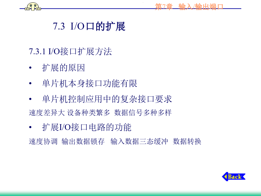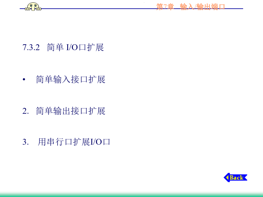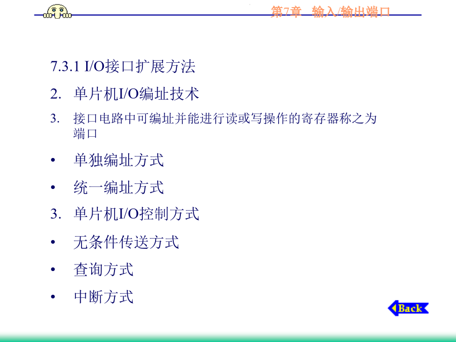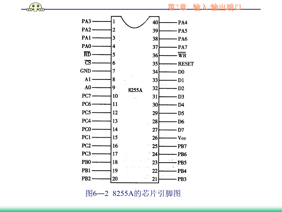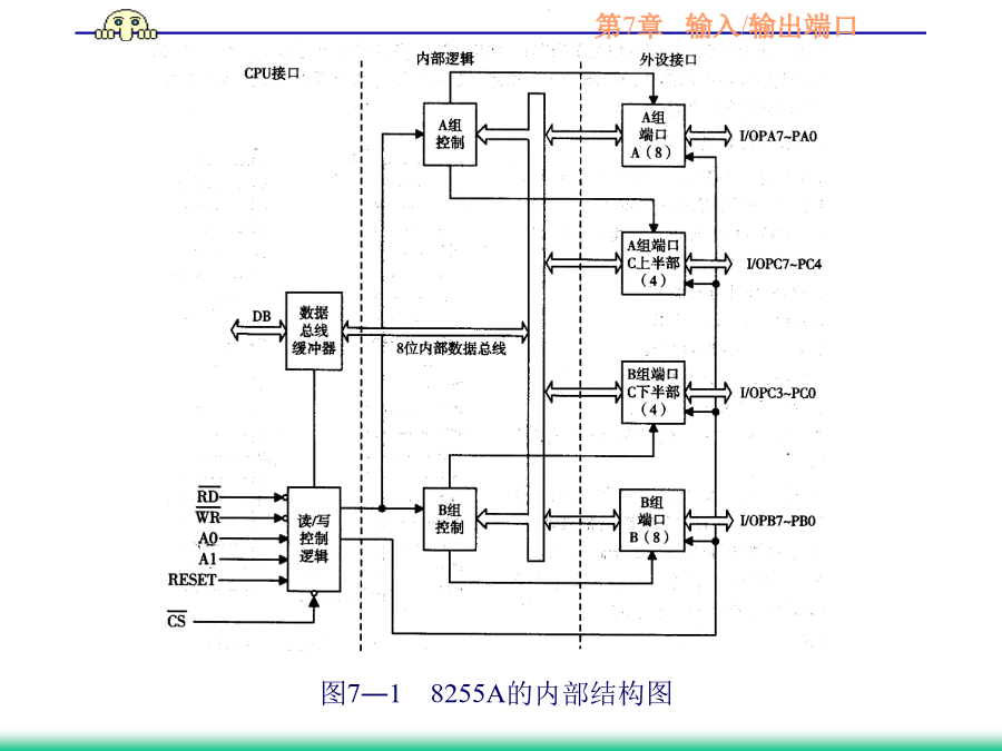 7.3I/O口的扩展7.3.3可编程I/O口扩展1.18255A的内部结构与引脚1.8255A的内部结构8255A的内部结构如图7―1所示,由以下几部分组成。1)数据端口A、B、C8255A有3个8位数据端口,即端口A、端口B和端口C。编程人员可以通过软件将它们分别作为输入端口或输出端口,不过这3个端口在不同的工作方式下有不同的功能及特点,如表7―1所示。图7―18255A的内部结构图2)A组和B组控制电路这是两组根据CPU的命令字控制8255A工作方式的电路。它们的控制寄存器先接受CPU送出的命令字,然后根据命令字分别决定两组的工作方式,也可根据CPU的命令字对端口C的每1位实现按位“复位”或“置位”。A组控制电路控制端口A和端口C的上半部(PC7~PC4)。B组控制电路控制端口B和端口C的下半部(PC3~PC0)。表7―18255A端口功能表2.8255A的芯片引脚8255A是一种有40个引脚的双列直插式标准芯片,其引脚排列如图7―2所示。除电源(+5V)和地址以外,其它信号可以分为两组:(1)与外设相连接的有:PA7~PA0:A口数据线PB7~PB0:B口数据线PC7~PC0:C口数据线图6―28255A的芯片引脚图(2)与CPU相连接的有:D7~D0:8255A的数据线,和系统数据总线相连。RESET:复位信号,高电平有效。当RESET有效时,所有内部寄存器都被清除,同时,3个数据端口被自动设为输入方式。:片选信号,低电平有效。只有当有效时,芯片才被选中,允许8255A与CPU交换信息。:读信号,低电平有效。当有效时,CPU可以从8255A中读取输入数据。:写信号,低电平有效。当有效时,CPU可以往8255A中写入控制字或数据。A1、A0:端口选择信号。8255A内部有3个数据端口和1个控制端口,当A1A0=00时选中端口A;A1A0=01时选中端口B;A1A0=10时选中端口C;A1A0=11时选中控制口。A1、A0和、及组合所实现的各种功能如表6-2所示。表7―28255A端口选择表1.28255A的工作方式8255A有3种工作方式,即方式0、方式1和方式2,这些工作方式可用软件编程来指定。3种工作方式的传送示意图如图6―3所示。图6―38255A的3种工作方式(a)方式0;(b)方式1;(c)方式21.方式0(基本输入/输出方式)这种工作方式不需要任何选通信号,A口、B口及C口的高4位和低4位都可以设定为输入或输出。作为输出口时,输出的数据均被锁存;作为输入口时,A口的数据能锁存,B口与C口的数据不能锁存。2.方式1(选通输入/输出方式)在这种工作方式下,A口可由编程设定为输入口或输出口,C口的3位用来作为输入/输出操作的控制和同步信号;B口同样可由编程设定为输入口或输出口,C口的另3位用来作为输入/输出操作的控制和同步信号。在方式1下A口和B口的输入数据或输出数据都能被锁存。1)方式1下A口、B口均为输入在方式1下,A口和B口均工作在输入状态时,需利用C口的6条线作为控制和状态信号线,其定义如图6―4(a)所示。图6―4方式1下的信号定义(a)A口、B口均为输入时;(b)A口、B口均为输出时C口所提供的用于输入的联络信号有:①(Strobe):选通脉冲信号(输入),低电平有效。当外设送来信号时,输入的数据被装入8255A的输入锁存器中。②IBF(InputBufferFull):输入缓冲器满信号(输出),高电平有效。此信号有效时,表示已有一个有效的外设数据锁存于8255A的口锁存器中,尚未被CPU取走,暂不能向接口输入数据,它是一个状态信号。③INTR(InterruptRequest):中断请求信号(输出),高电平有效。当IBF为高、信号由低变高(后沿)时,该信号有效,向CPU发出中断请求。方式1数据输入过程如下:当外设的数据准备好后,发出信号,输入的数据被装入锁存器中,然后IBF信号有效(变为高电平)。数据输入操作的时序关系如图6―5所示。图6―5方式1下的输入时序2)方式1下A口、B口均为输出与输入时一样,要利用C口的6根信号线,其定义如图6―4(b)所示。用于输出的联络信号有:(1)(Acknowledge):外设响应信号(输入),低电平有效。(2)(OutputBuffeFull):输出缓冲器满信号(输出),低电平有效。(3)INTR:中断请求信号(输出),高电平有效。方式1下数据输出过程如下:当外设接收并处理完1组数据后,发回响应信号。数据输出操作的时序关系如图6―6所示。应当指出,当8255A的A口与B口同时为方式1的输入或输出时,需使用C口的6条线,C口剩下的2条线还可以用程序来指定数据的传送方向