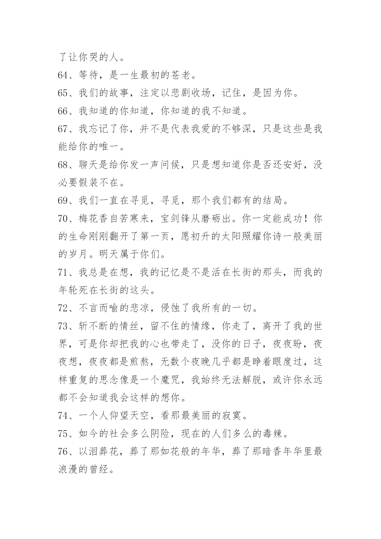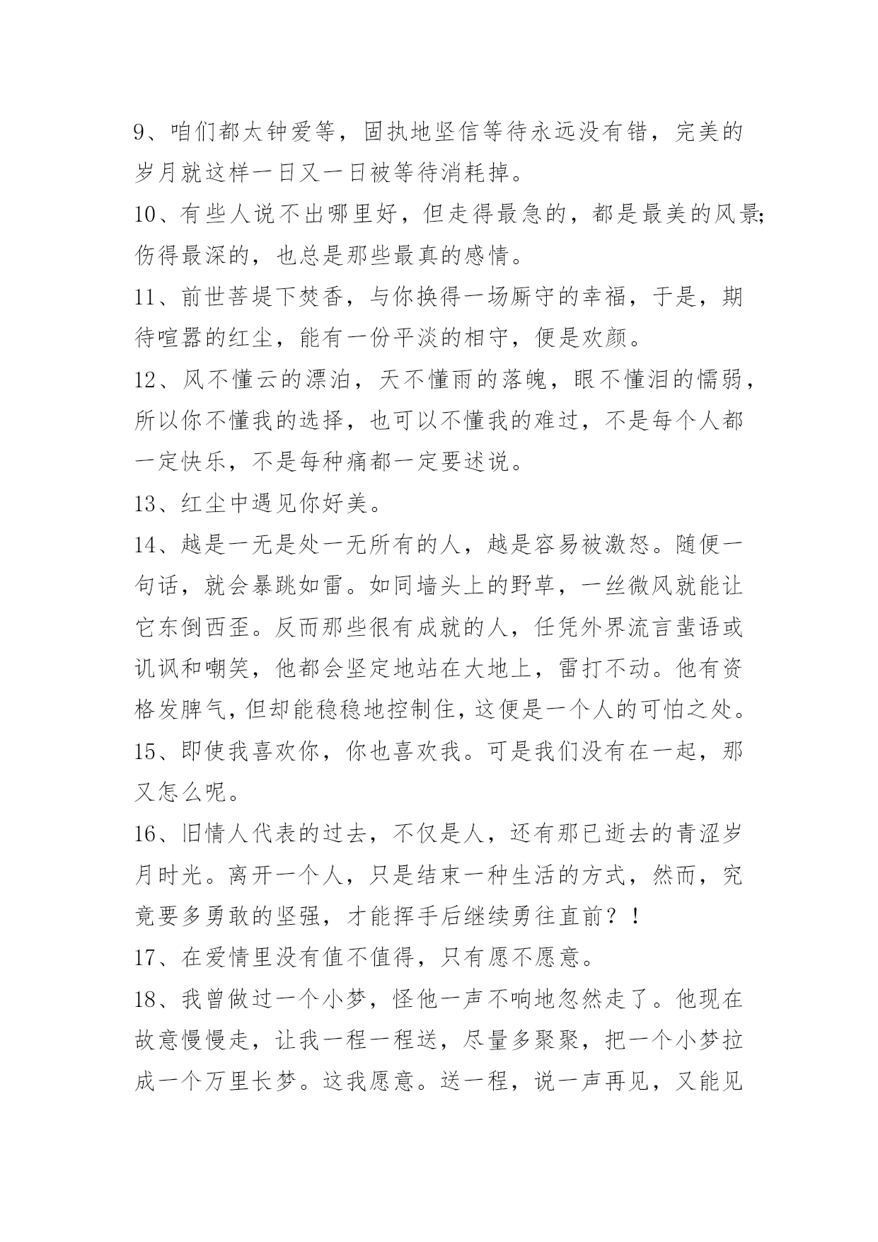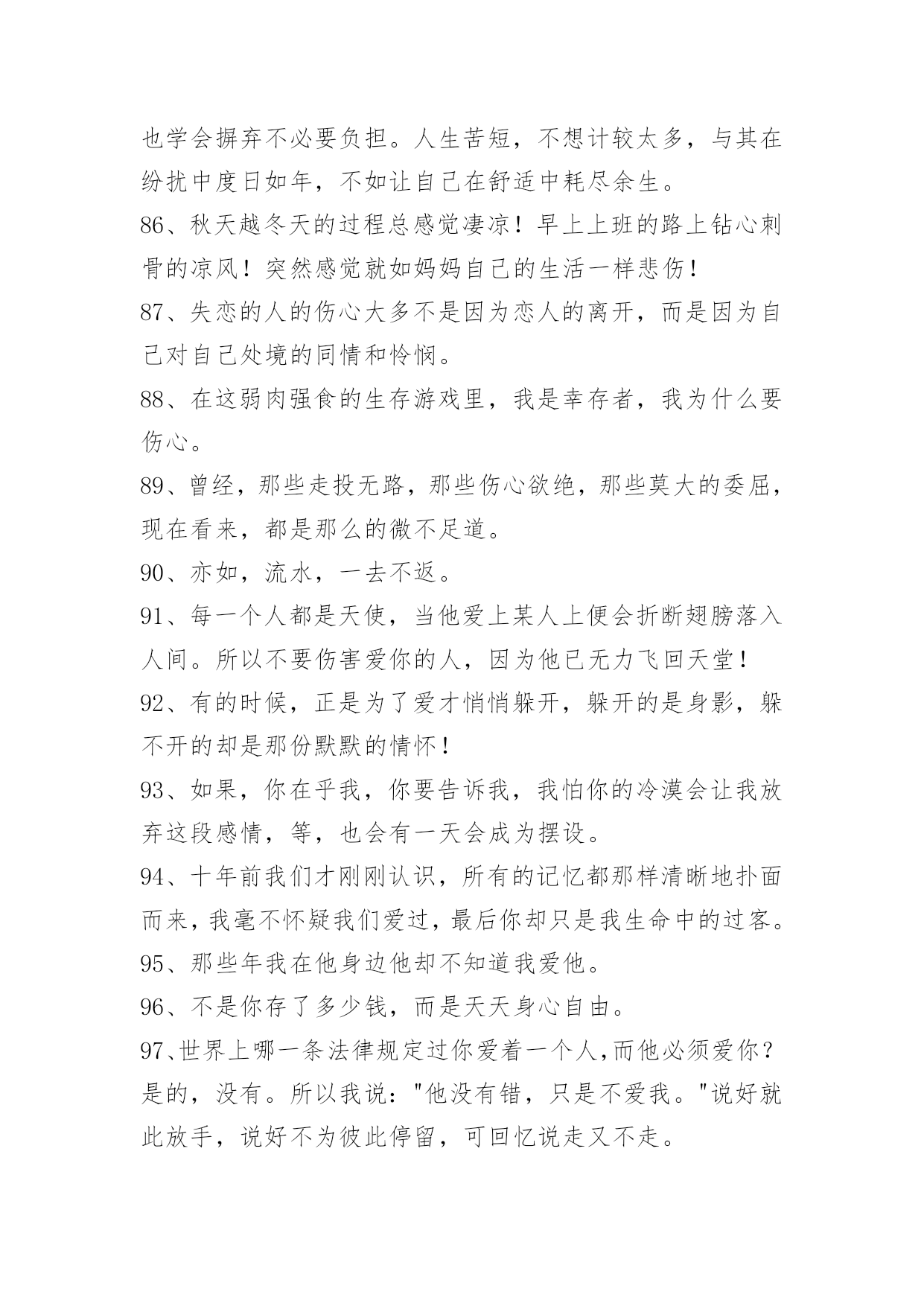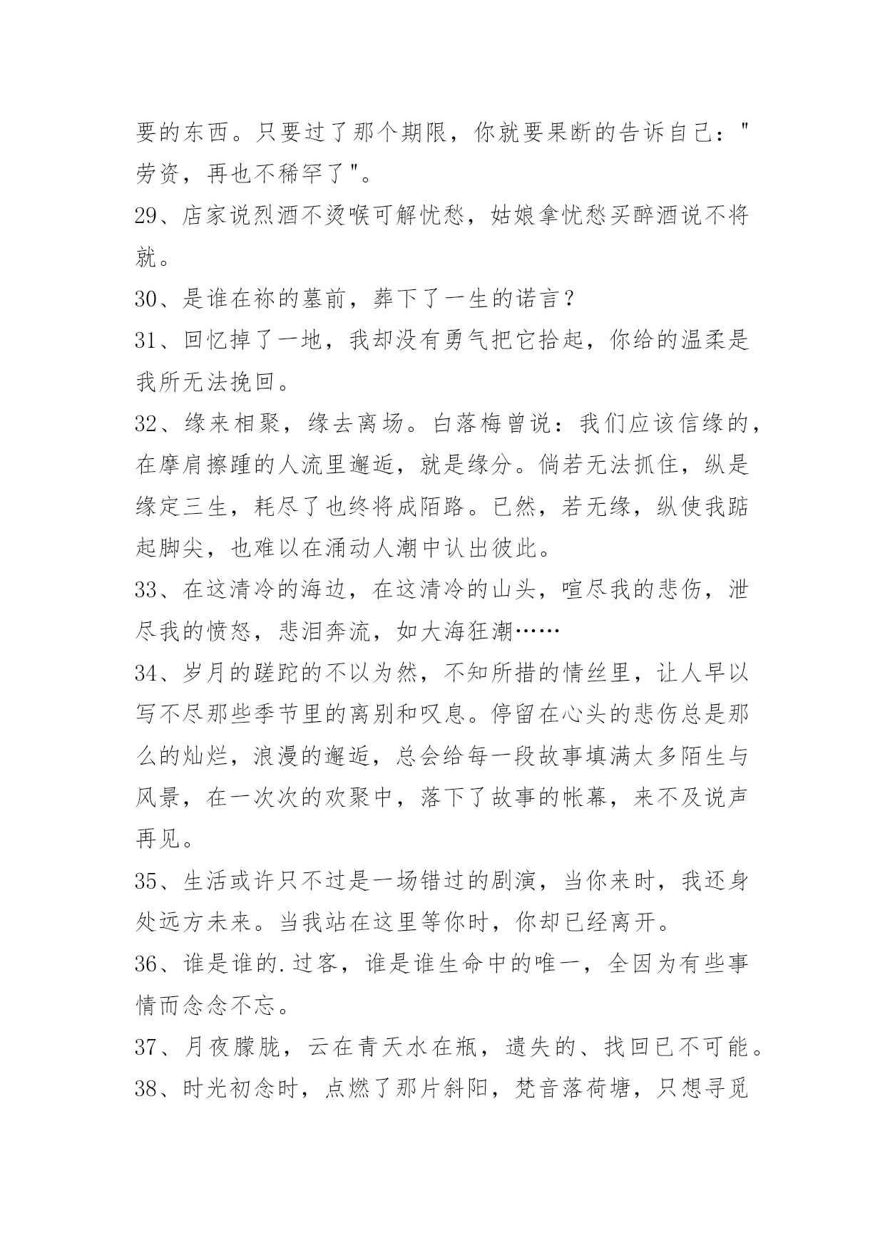 忧伤唯美句子100条【实用】忧伤唯美句子100条最美丽的回忆是最绝望的守候,刹那芳华铸就了永恒,生命里有些不朽的篇章,是纯粹的泪,在月光的记忆里打捞逝去的甜蜜,看见的却是镜花水月的激荡。下面是小编为大家推荐的忧伤唯美句子100条,感兴趣的一起来看看吧。1、今宵与伊共醉,何其辛哉。人不道一朝离别,怎忘却旧日情怀,伤心扉。刹那芳华,辛甚乐甚,今宵沉醉,昨夜于伊梦回,此生难忘。2、那些说我不美的人,我从来不和他们生气,只是感到惋惜,他们年纪轻轻的居然就瞎了。3、爱,一个人,不是,爱她的十全十美,而是,用十全十美的爱,去诠释一个完美的心灵。4、再美的风景,你不上路,也只能存在于别人眼中;再周全的计划,你不去实施,也只会成就别人的功绩。5、宽容与自信结合到同一个男人身上的时候,这个男人就称得上是一个完美的男人、一个很有魅力的男人了。6、更值得赞美的还是仙人球顽强的生命力,不管是严寒酷暑,它都会开出美丽的花,冲人们微笑,供人们欣赏。7、女人,如果你想要一个近乎完美的男人,你就必须变得近乎完美。所以,努力吧。8、其实,爱不是找找一个完美的人,而是要学会用完美的眼光,欣赏一个并不完美的人。9、咱们都太钟爱等,固执地坚信等待永远没有错,完美的岁月就这样一日又一日被等待消耗掉。10、有些人说不出哪里好,但走得最急的,都是最美的风景;伤得最深的,也总是那些最真的感情。11、前世菩堤下焚香,与你换得一场厮守的幸福,于是,期待喧嚣的红尘,能有一份平淡的相守,便是欢颜。12、风不懂云的漂泊,天不懂雨的落魄,眼不懂泪的懦弱,所以你不懂我的选择,也可以不懂我的难过,不是每个人都一定快乐,不是每种痛都一定要述说。13、红尘中遇见你好美。14、越是一无是处一无所有的人,越是容易被激怒。随便一句话,就会暴跳如雷。如同墙头上的野草,一丝微风就能让它东倒西歪。反而那些很有成就的人,任凭外界流言蜚语或讥讽和嘲笑,他都会坚定地站在大地上,雷打不动。他有资格发脾气,但却能稳稳地控制住,这便是一个人的可怕之处。15、即使我喜欢你,你也喜欢我。可是我们没有在一起,那又怎么呢。16、旧情人代表的过去,不仅是人,还有那已逝去的青涩岁月时光。离开一个人,只是结束一种生活的方式,然而,究竟要多勇敢的坚强,才能挥手后继续勇往直前?!17、在爱情里没有值不值得,只有愿不愿意。18、我曾做过一个小梦,怪他一声不响地忽然走了。他现在故意慢慢走,让我一程一程送,尽量多聚聚,把一个小梦拉成一个万里长梦。这我愿意。送一程,说一声再见,又能见到一面。离别拉得长,是增加痛苦还是减少痛苦呢?我算不清。但是我陪他走的愈远,愈怕从此不见。19、我早已过了在演唱会拿着荧光棒左摇右晃的年纪,也相信所有沛然莫之能御的情感只是离别气氛下催化出的产物。20、我习惯了这样的分分合合,而你却还不明白,我只想你再也不离开。21、当你快乐的时候沙滩上有四行脚印,当你伤悲的时候沙滩上有两行脚印。因为当你快乐时我陪着你,当你悲伤的时候我背着你。22、大家都抱怨生活苦,可是我们苦吗,大学文凭拿着,办公室坐着,拿人钱财替人消灾,气当然是要受点啊,虽然工资不高但足可以解决温饱,虽然买不起大房子但也没露宿街头,虽然找不到高富帅,也有矮矬穷接着,每天最发愁的是晚饭要吃什么,而不是晚饭有什么可以吃,我们还抱怨什么呢?生活对我们已经很好了。23、我也是第一次为自己的电影流泪,送给倾尽全力生活的人。24、世间没有一件造物会是完美的,但有时缺憾会更美。25、当一个男人对你万般娇纵时,你要问自己凭什么?当一个女人对你万般包容时,你也要问自己凭什么?当这一生男女都不停这么想时,这一辈子不幸福才怪。26、我会用行动告诉你:爱你不是冲动。27、有时候想问自己,笑的这么大声,真的快乐吗?28、也许人生,真的应该给自己设定一个期限,就算是再想要的东西。只要过了那个期限,你就要果断的告诉自己:"劳资,再也不稀罕了"。29、店家说烈酒不烫喉可解忧愁,姑娘拿忧愁买醉酒说不将就。30、是谁在祢的墓前,葬下了一生的诺言?31、回忆掉了一地,我却没有勇气把它拾起,你给的温柔是我所无法挽回。32、缘来相聚,缘去离场。白落梅曾说:我们应该信缘的,在摩肩擦踵的人流里邂逅,就是缘分。倘若无法抓住,纵是缘定三生,耗尽了也终将成陌路。已然,若无缘,纵使我踮起脚尖,也难以在涌动人潮中认出彼此。33、在这清冷的海边,在这清冷的山头,喧尽我的悲伤,泄尽我的愤怒,悲泪奔流,如大海狂潮……34、岁月的蹉跎的不以为然,不知所措的情丝里,让人早以写不尽那些季节里的离别和叹息。停留在心头的悲伤总是那么的灿烂,浪漫的邂逅,总会给每一段故事填满太多陌生与风景,在一次次的欢聚中,落下了故事的帐幕,来不及说声再见。35、生活或许只不过是一场错过的剧演,当你来时,我还身处远方未来。当我站在这里等你时,你却