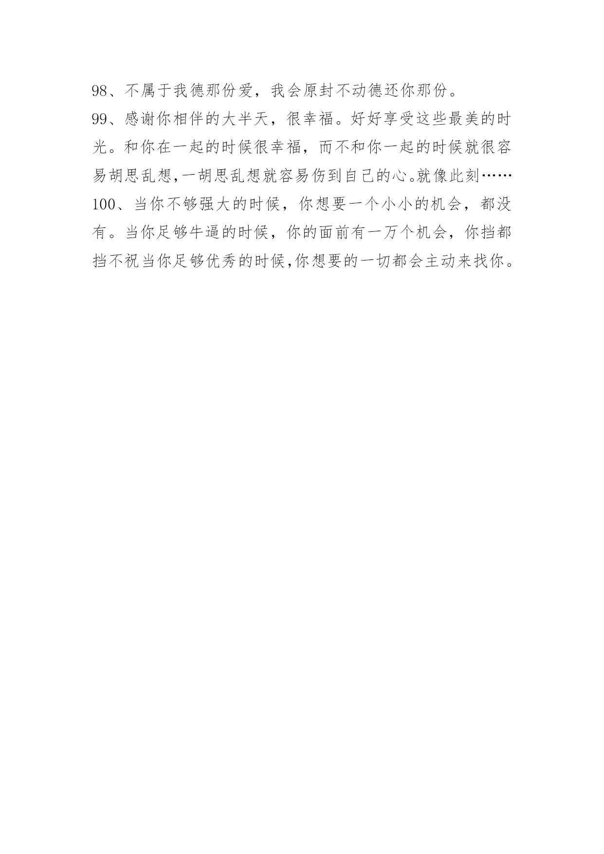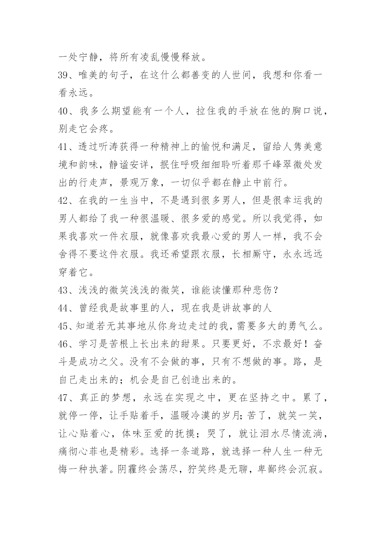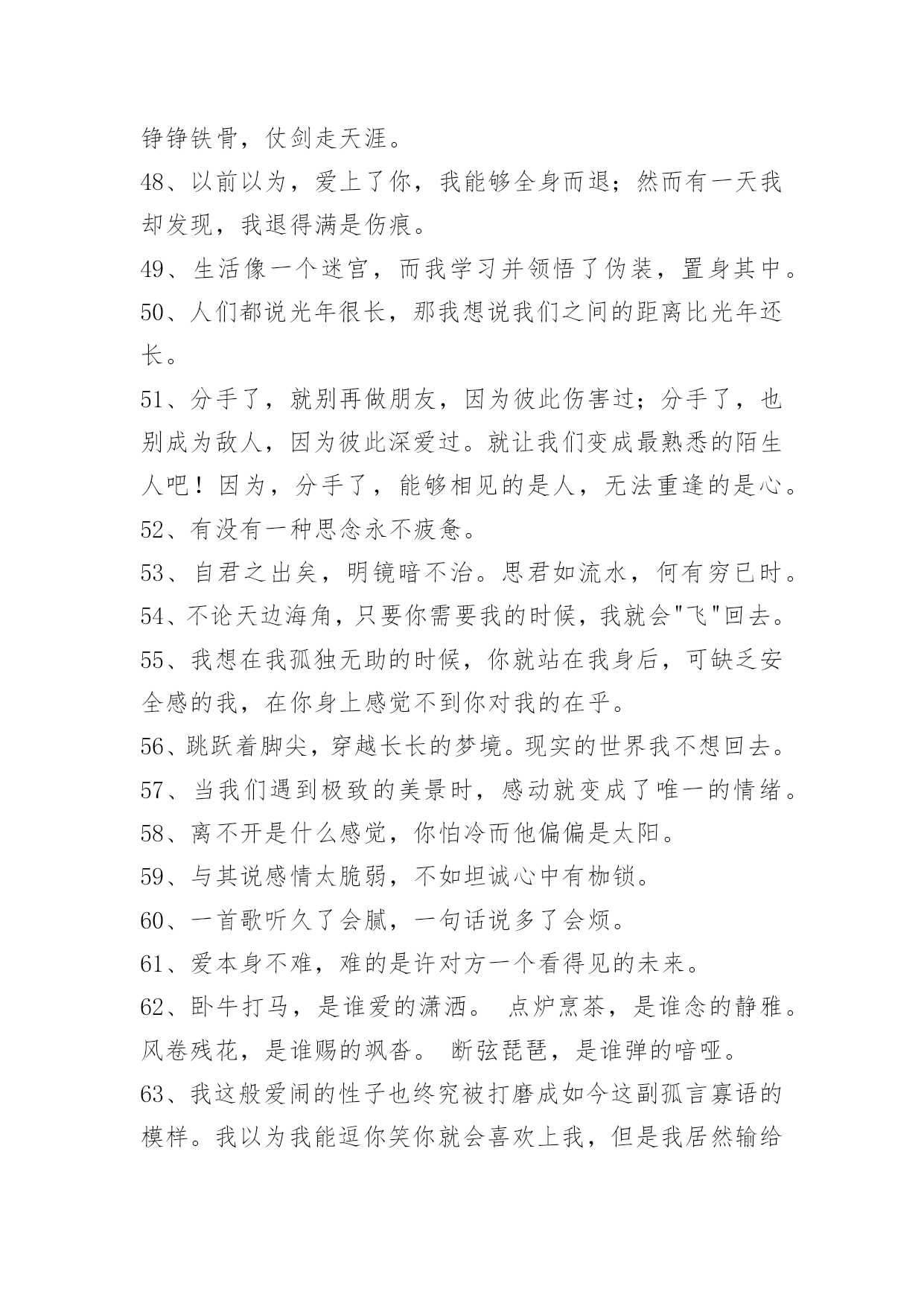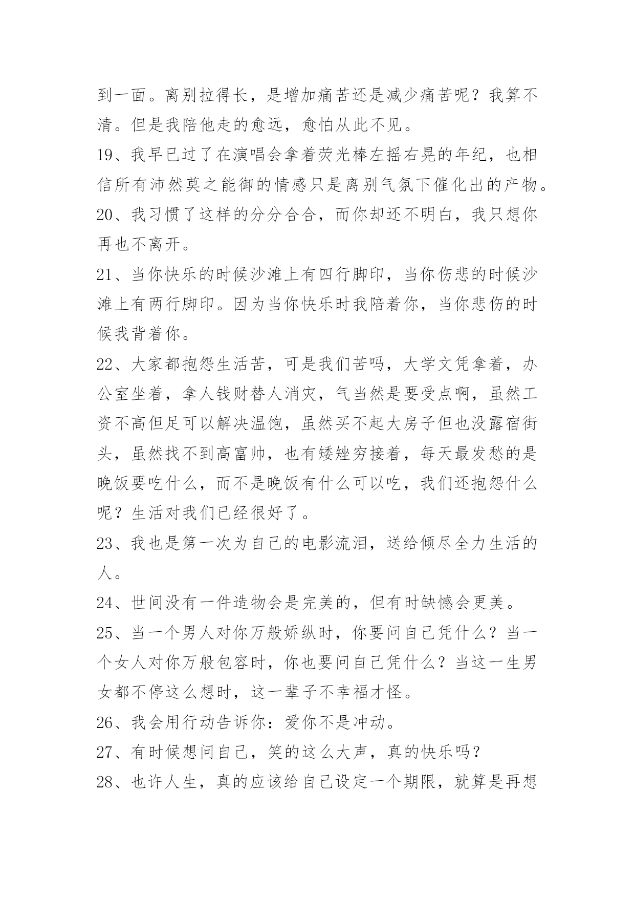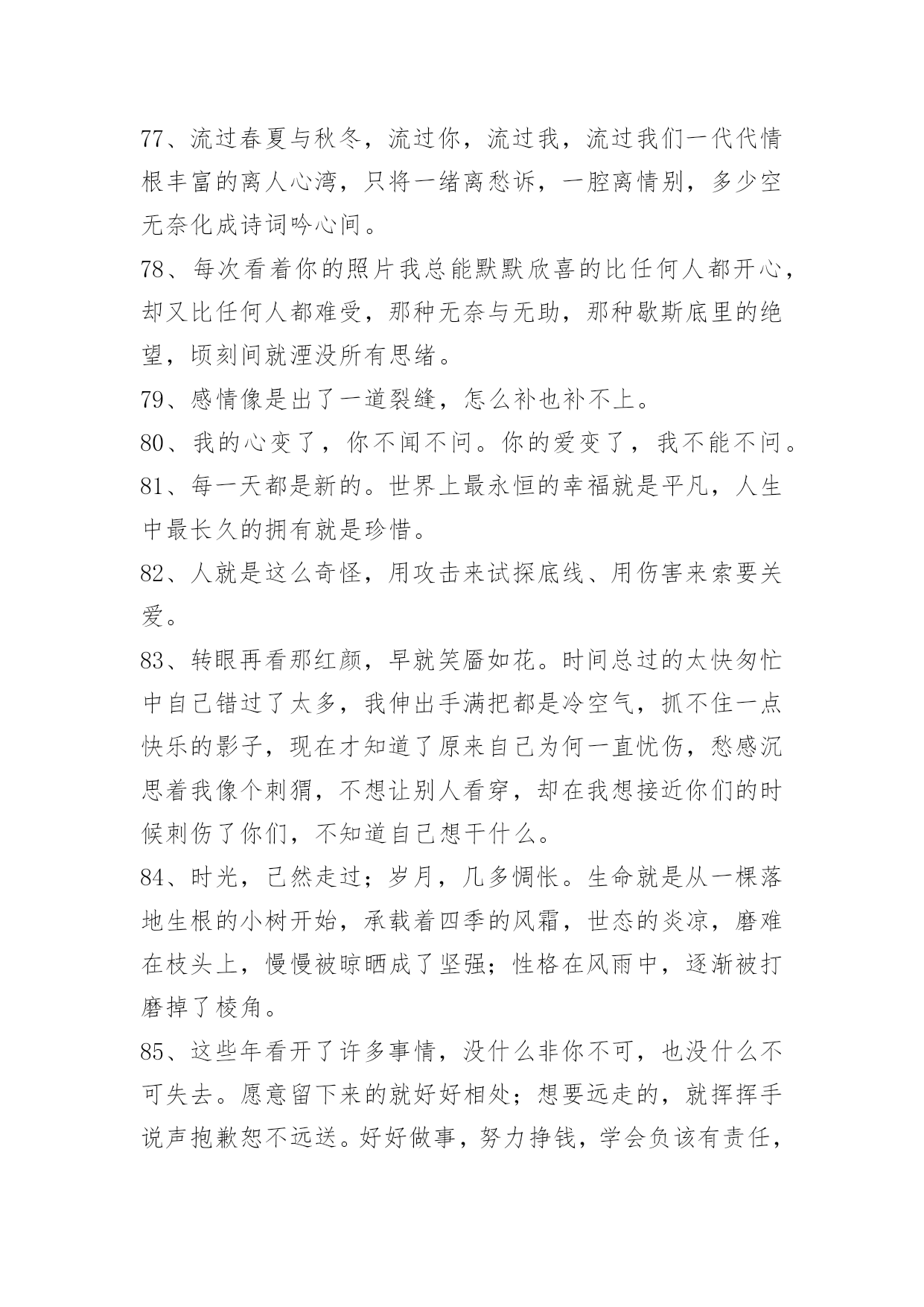 忧伤唯美句子100条【实用】忧伤唯美句子100条最美丽的回忆是最绝望的守候,刹那芳华铸就了永恒,生命里有些不朽的篇章,是纯粹的泪,在月光的记忆里打捞逝去的甜蜜,看见的却是镜花水月的激荡。下面是小编为大家推荐的忧伤唯美句子100条,感兴趣的一起来看看吧。1、今宵与伊共醉,何其辛哉。人不道一朝离别,怎忘却旧日情怀,伤心扉。刹那芳华,辛甚乐甚,今宵沉醉,昨夜于伊梦回,此生难忘。2、那些说我不美的人,我从来不和他们生气,只是感到惋惜,他们年纪轻轻的居然就瞎了。3、爱,一个人,不是,爱她的十全十美,而是,用十全十美的爱,去诠释一个完美的心灵。4、再美的风景,你不上路,也只能存在于别人眼中;再周全的计划,你不去实施,也只会成就别人的功绩。5、宽容与自信结合到同一个男人身上的时候,这个男人就称得上是一个完美的男人、一个很有魅力的男人了。6、更值得赞美的还是仙人球顽强的生命力,不管是严寒酷暑,它都会开出美丽的花,冲人们微笑,供人们欣赏。7、女人,如果你想要一个近乎完美的男人,你就必须变得近乎完美。所以,努力吧。8、其实,爱不是找找一个完美的人,而是要学会用完美的眼光,欣赏一个并不完美的人。9、咱们都太钟爱等,固执地坚信等待永远没有错,完美的岁月就这样一日又一日被等待消耗掉。10、有些人说不出哪里好,但走得最急的,都是最美的风景;伤得最深的,也总是那些最真的感情。11、前世菩堤下焚香,与你换得一场厮守的幸福,于是,期待喧嚣的红尘,能有一份平淡的相守,便是欢颜。12、风不懂云的漂泊,天不懂雨的落魄,眼不懂泪的懦弱,所以你不懂我的选择,也可以不懂我的难过,不是每个人都一定快乐,不是每种痛都一定要述说。13、红尘中遇见你好美。14、越是一无是处一无所有的人,越是容易被激怒。随便一句话,就会暴跳如雷。如同墙头上的野草,一丝微风就能让它东倒西歪。反而那些很有成就的人,任凭外界流言蜚语或讥讽和嘲笑,他都会坚定地站在大地上,雷打不动。他有资格发脾气,但却能稳稳地控制住,这便是一个人的可怕之处。15、即使我喜欢你,你也喜欢我。可是我们没有在一起,那又怎么呢。16、旧情人代表的过去,不仅是人,还有那已逝去的青涩岁月时光。离开一个人,只是结束一种生活的方式,然而,究竟要多勇敢的坚强,才能挥手后继续勇往直前?!17、在爱情里没有值不值得,只有愿不愿意。18、我曾做过一个小梦,怪他一声不响地忽然走了。他现在故意慢慢走,让我一程一程送,尽量多聚聚,把一个小梦拉成一个万里长梦。这我愿意。送一程,说一声再见,又能见到一面。离别拉得长,是增加痛苦还是减少痛苦呢?我算不清。但是我陪他走的愈远,愈怕从此不见。19、我早已过了在演唱会拿着荧光棒左摇右晃的年纪,也相信所有沛然莫之能御的情感只是离别气氛下催化出的产物。20、我习惯了这样的分分合合,而你却还不明白,我只想你再也不离开。21、当你快乐的时候沙滩上有四行脚印,当你伤悲的时候沙滩上有两行脚印。因为当你快乐时我陪着你,当你悲伤的时候我背着你。22、大家都抱怨生活苦,可是我们苦吗,大学文凭拿着,办公室坐着,拿人钱财替人消灾,气当然是要受点啊,虽然工资不高但足可以解决温饱,虽然买不起大房子但也没露宿街头,虽然找不到高富帅,也有矮矬穷接着,每天最发愁的是晚饭要吃什么,而不是晚饭有什么可以吃,我们还抱怨什么呢?生活对我们已经很好了。23、我也是第一次为自己的电影流泪,送给倾尽全力生活的人。24、世间没有一件造物会是完美的,但有时缺憾会更美。25、当一个男人对你万般娇纵时,你要问自己凭什么?当一个女人对你万般包容时,你也要问自己凭什么?当这一生男女都不停这么想时,这一辈子不幸福才怪。26、我会用行动告诉你:爱你不是冲动。27、有时候想问自己,笑的这么大声,真的快乐吗?28、也许人生,真的应该给自己设定一个期限,就算是再想要的东西。只要过了那个期限,你就要果断的告诉自己:"劳资,再也不稀罕了"。29、店家说烈酒不烫喉可解忧愁,姑娘拿忧愁买醉酒说不将就。30、是谁在祢的墓前,葬下了一生的诺言?31、回忆掉了一地,我却没有勇气把它拾起,你给的温柔是我所无法挽回。32、缘来相聚,缘去离场。白落梅曾说:我们应该信缘的,在摩肩擦踵的人流里邂逅,就是缘分。倘若无法抓住,纵是缘定三生,耗尽了也终将成陌路。已然,若无缘,纵使我踮起脚尖,也难以在涌动人潮中认出彼此。33、在这清冷的海边,在这清冷的山头,喧尽我的悲伤,泄尽我的愤怒,悲泪奔流,如大海狂潮……34、岁月的蹉跎的不以为然,不知所措的情丝里,让人早以写不尽那些季节里的离别和叹息。停留在心头的悲伤总是那么的灿烂,浪漫的邂逅,总会给每一段故事填满太多陌生与风景,在一次次的欢聚中,落下了故事的帐幕,来不及说声再见。35、生活或许只不过是一场错过的剧演,当你来时,我还身处远方未来。当我站在这里等你时,你却