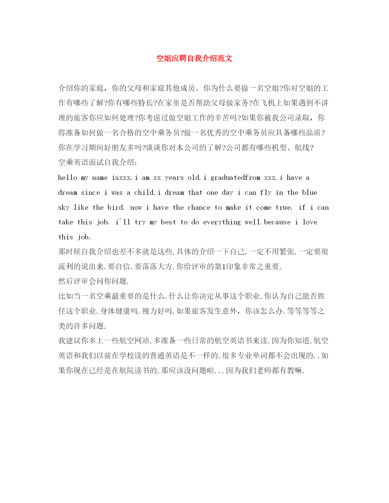 此资料由网络收集而来,如有侵权请告知上传者立即删除。资料共分享,我们负责传递知识。空姐应聘自我介绍范文介绍你的家庭,你的父母和家庭其他成员。你为什么要做一名空姐?你对空姐的工作有哪些了解?你有哪些特长?在家里是否帮助父母做家务?在飞机上如果遇到不讲理的旅客你应如何处理?你考虑过做空姐工作的辛苦吗?如果你被我公司录取,你将准备如何做一名合格的空中乘务员?做一名优秀的空中乘务员应具备哪些品质?你在学习期间好朋友多吗?谈谈你对本公司的了解?公司都有哪些机型、航线?空乘英语面试自我介绍:hellomynameisxxx.iamxxyearsold.igraduatedfromxxx.ihaveadreamsinceiwasachild.idreamthatonedayicanflyintheblueskylikethebird.nowihavethechancetomakeitcometrue.ificantakethisjob.i'lltrymybesttodoeverythingwell.becauseilovethisjob.那时候自我介绍也差不多就是这些.具体的介绍一下自己.一定不用紧张.一定要很流利的说出来.要自信.要落落大方.你给评审的第1印象非常之重要.然后评审会问你问题.比如当一名空乘最重要的是什么.什么让你决定从事这个职业.你认为自己能否胜任这个职业.身体健康吗.视力好吗.如果旅客发生意外,你该怎么办.等等等等之类的许多问题.我建议你多上一些航空网站,多准备一些日常的航空英语书来读.因为你知道,航空英语和我们以前在学校读的普通英语是不一样的.很多专业单词都不会出现的..如果你现在已经是在航院读书的,那应该没问题啦...因为我们老师都有教嘛.