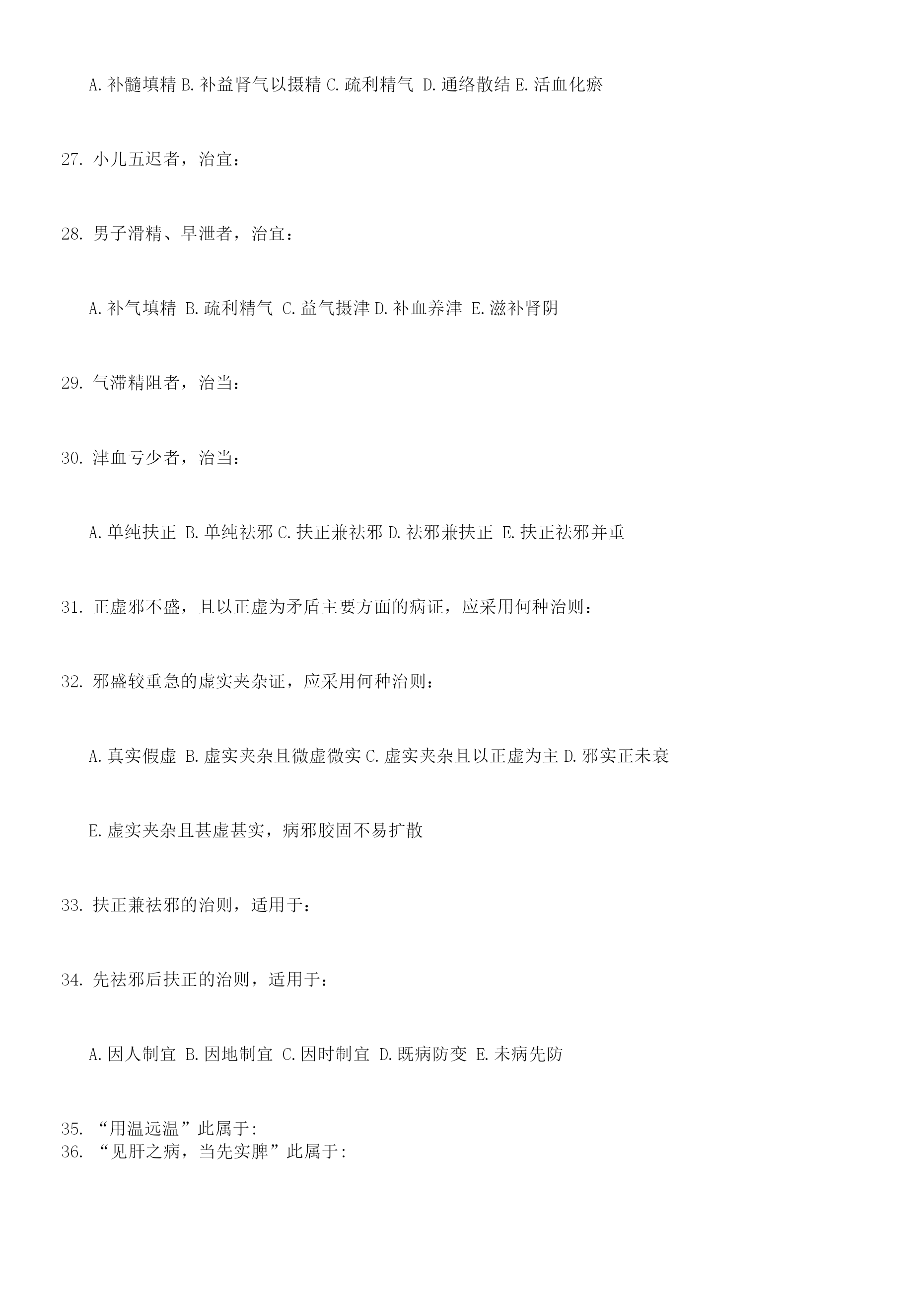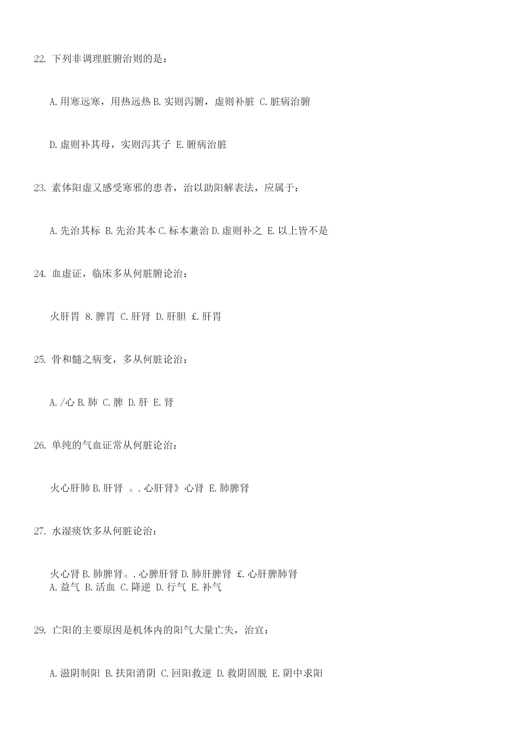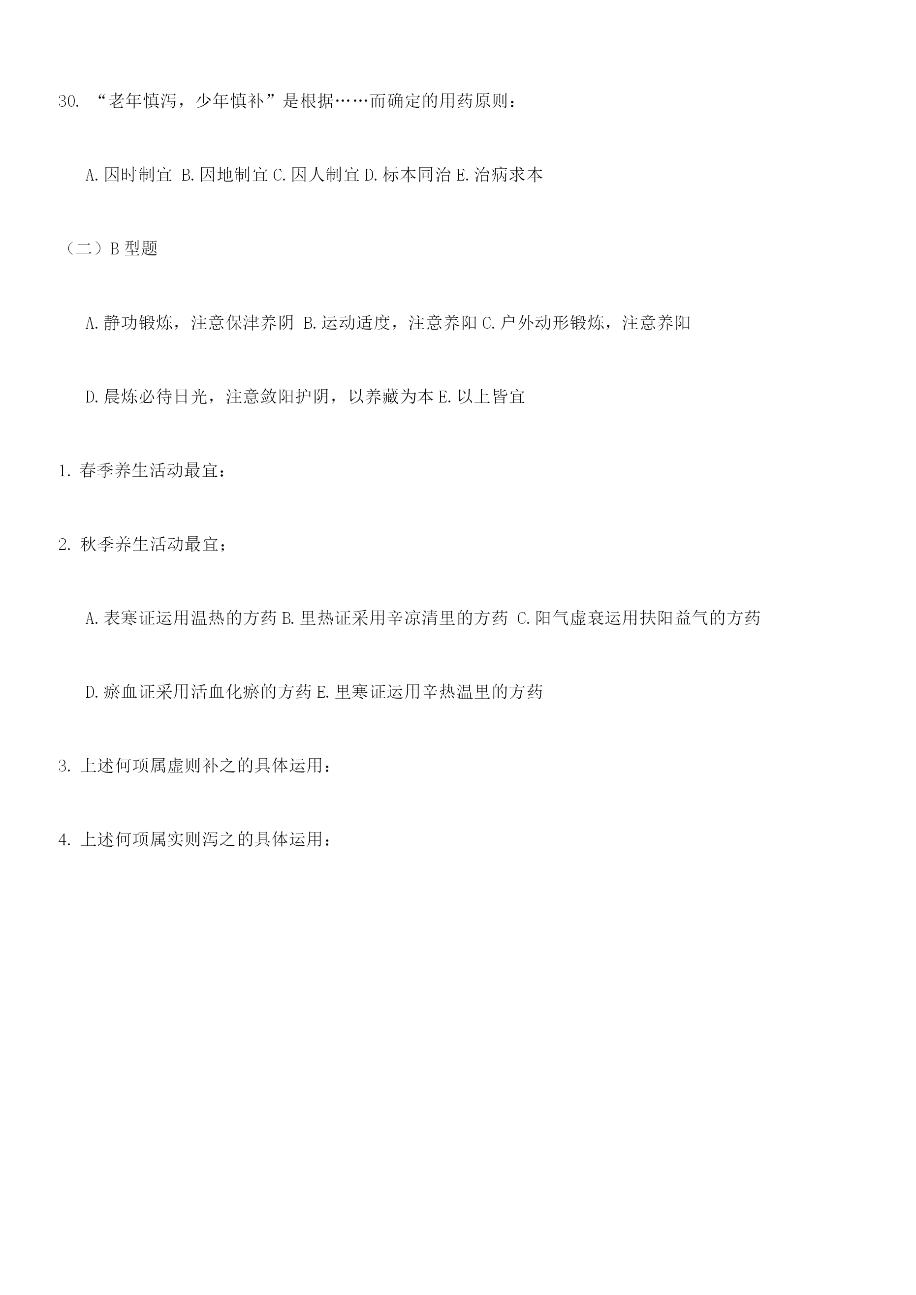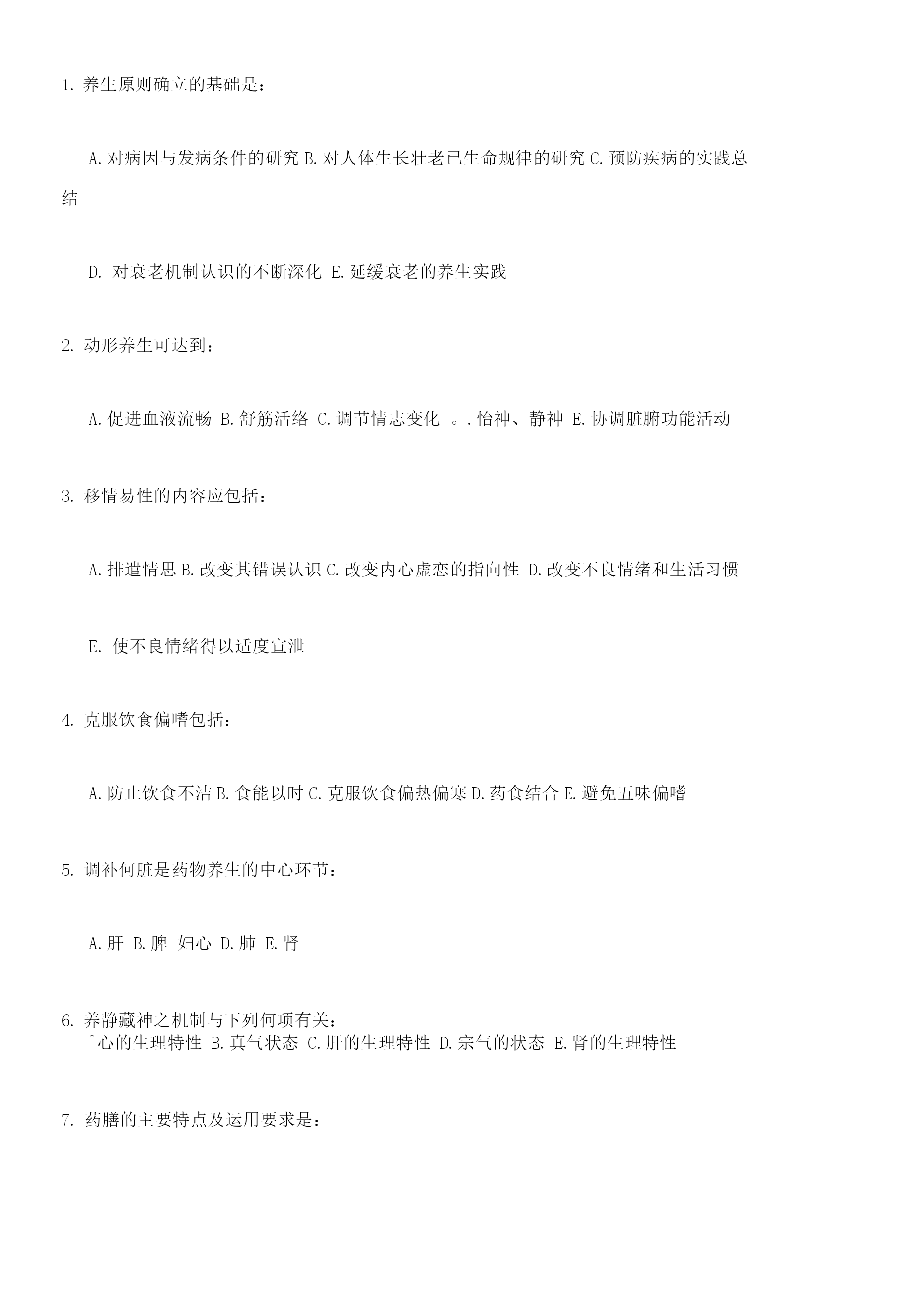 中医基础理论试题及答案一、选择题(一)A型题中医养生学认为探索衰老机制的中心环节是:A.肾中精气的盛衰B.I、肺的功能状态脾胃运化功能的强弱D.肝肾精血互化的状态E.肾中精气的盛衰和脾的功能状态下列不属于顺应自然养生的是:A.用寒远寒,用热远热B.春夏养阳、秋冬养阴C.顺应四时调摄D.昼夜晨昏调养E.起居有常下列何项非中医饮食养生所提倡:A.药膳保健B.注意饮食卫生C.提倡饮食有节D.克服饮食偏嗜E.强调高营养饮食对疾病力求早期诊断、早期治疗的目的:A.提高治愈率B.尽早确立治疗方法C.提高诊断的正确率D.中止其病情的发展变化E.以上均不是下列不属于既病防变方法的是:A.人工免疫B.早期诊断C.早期治疗D.先安未受邪之地E.阻截病传途径不属于治则的是:A.治病求本B.扶正祛邪C.调理气血D.活血化瘀E.调治脏腑“见肝之病,当先实脾”的治疗原则当属:A.早治防变B.治病求本C.调理脏腑D.调理气血E.三因制宜下列何项属正治法则:A.标本兼治B.塞因塞用C.寒者热之D.因人制宜E.寒因寒用下列何项非属逆治法则:A.热因热用B.寒者热之C.热者寒之D.虚则补之E.实则泻之下列何项属反治法则:A.实则泻之B.通因通用C.虚则补之D.培土生金E.滋水涵木下列何项不属从治法则:A.寒因寒用B.热因热用C.通因通用D.热者寒之E.寒因寒用“阴中求阳”的治疗方法是指:A.在扶阳剂中适当佐以滋阴药B.滋阴剂中适当佐以扶阳药C.在温阳散寒同时佐以扶阳D.在清泻阳热同时佐以滋阴E.以上皆是“壮水之主,以制阳光”指:A.阴中求阳B.阳中求阴C.阳病治阴D.阴病治阳E.治寒以热攻补兼施治则适用于何证:A.虚证B.真实假虚证C.实证D.真虚假实证E.虚实夹杂证真实假虚证的治疗原则应是:A.祛邪兼扶正B.扶正兼祛邪C.先祛邪后扶正D‘单独祛邪E.先扶正后祛邪真虚假实证的治疗原则应是:A.单独祛邪B.单独扶正C.先扶正后祛邪D.扶正兼祛邪E.祛邪扶正并重“通因通用”适用于下列哪种病证:A.脾虚泄泻B.肾虚泄泻C.食积泄泻D.气虚泄泻E.寒湿泄泻“塞因塞用”不适用于下列哪种病证:A.脾虚腹胀B.血枯经闭C.肾虚尿闭D.气郁腹胀E.阴虚便秘阴中求阳的治疗方法是指:A.在扶阳剂中适当佐以滋阴药D.在滋阴剂中适当佐以扶阳药C.温阳散寒同时佐以扶阳D.充分滋阴的基础上配以补阳剂E.以上皆不是阴病治阳适用于下列何证:“壮水之主,以制阳光”指:A.阴中求阳B.阳中求阴C.阳病治阴D.阴病治阳E.阴阳双补下列非调理脏腑治则的是:A.用寒远寒,用热远热B.实则泻腑,虚则补脏C.脏病治腑D.虚则补其母,实则泻其子E.腑病治脏素体阳虚又感受寒邪的患者,治以助阳解表法,应属于:A.先治其标B.先治其本C.标本兼治D.虚则补之E.以上皆不是血虚证,临床多从何脏腑论治:火肝胃8.脾胃C.肝肾D.肝胆£.肝胃骨和髓之病变,多从何脏论治:A./心B.肺C.脾D.肝E.肾单纯的气血证常从何脏论治:火心肝肺B.肝肾。.心肝肾》心肾E.肺脾肾水湿痰饮多从何脏论治:火心肾B.肺脾肾。.心脾肝肾D.肺肝脾肾£.心肝脾肺肾A.益气B.活血C.降逆D.行气E.补气亡阳的主要原因是机体内的阳气大量亡失,治宜:A.滋阴制阳B.扶阳消阴C.回阳救逆D.救阴固脱E.阴中求阳“老年慎泻,少年慎补”是根据……而确定的用药原则:A.因时制宜B.因地制宜C.因人制宜D.标本同治E.治病求本(二)B型题A.静功锻炼,注意保津养阴B.运动适度,注意养阳C.户外动形锻炼,注意养阳D.晨炼必待日光,注意敛阳护阴,以养藏为本E.以上皆宜春季养生活动最宜:秋季养生活动最宜;A.表寒证运用温热的方药B.里热证采用辛凉清里的方药C.阳气虚衰运用扶阳益气的方药D.瘀血证采用活血化瘀的方药E.里寒证运用辛热温里的方药上述何项属虚则补之的具体运用:上述何项属实则泻之的具体运用:A.补益心阳B.补养心气。.清心泻火D.活血祛瘀E.补养心血心、阳不足者,法宜:心、脉瘀阻者,法宜:心、火炽盛者,法宜:A.脾不统血B.脾气下陷健脾利水之法适用于:益气升提之法适用于:A.滋养肝阴B.补养肝血肝阳上亢化风者,治宜:肝阴不足者,治宜:A.热者寒之B.寒者热之C.脾虚湿阻D.脾虚水肿C.清降肝火D.疏肝理气C.热因热用D.塞因塞用E.脾虚带下E.滋养肝肾、平肝熄风潜阳E.通因通用用消导积滞的方法治疗腹泄病证,其治则当属:用温热性质的方药治疗寒证的方法,其治则当属:用温热性质的药物治疗阴盛格阳病