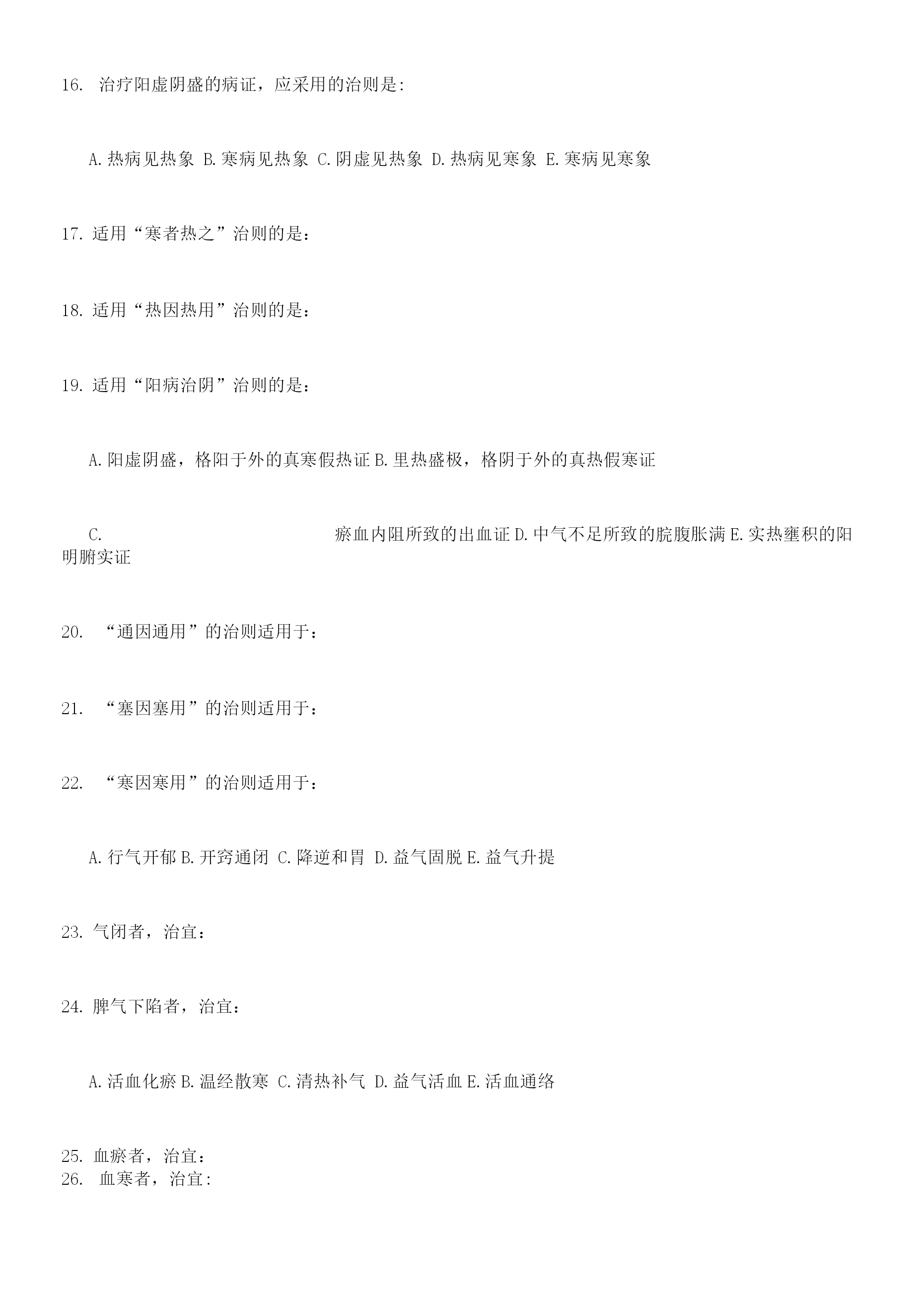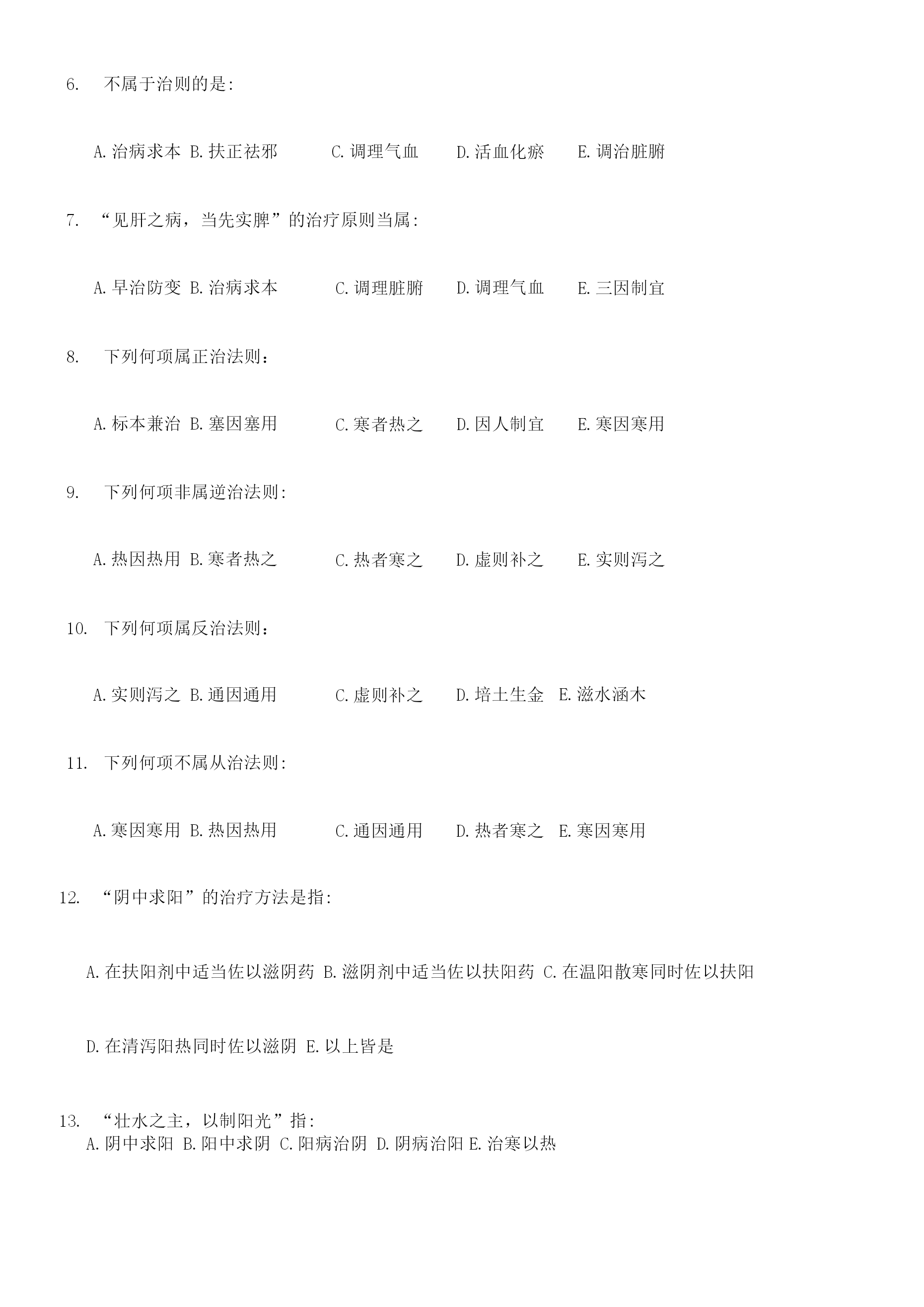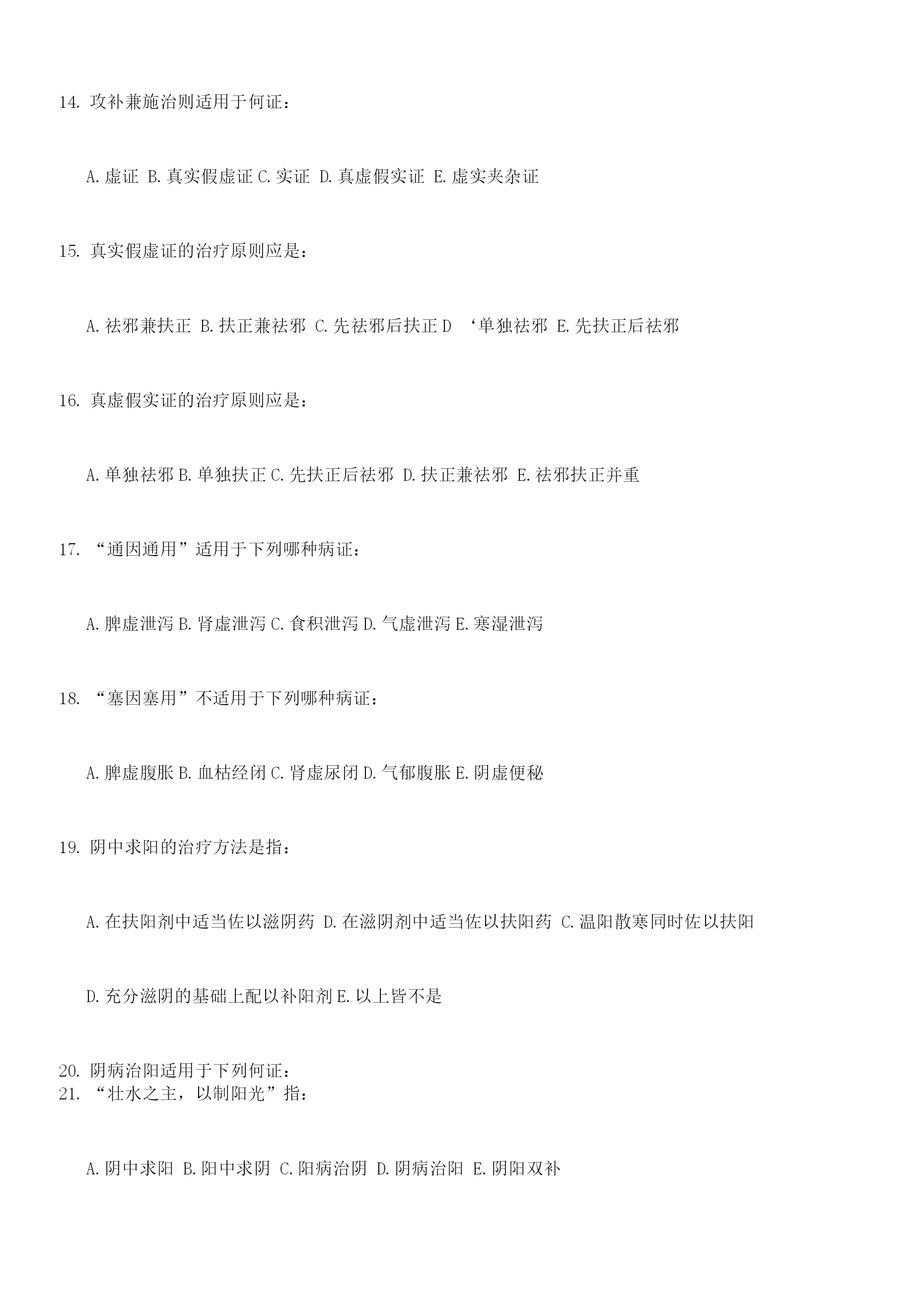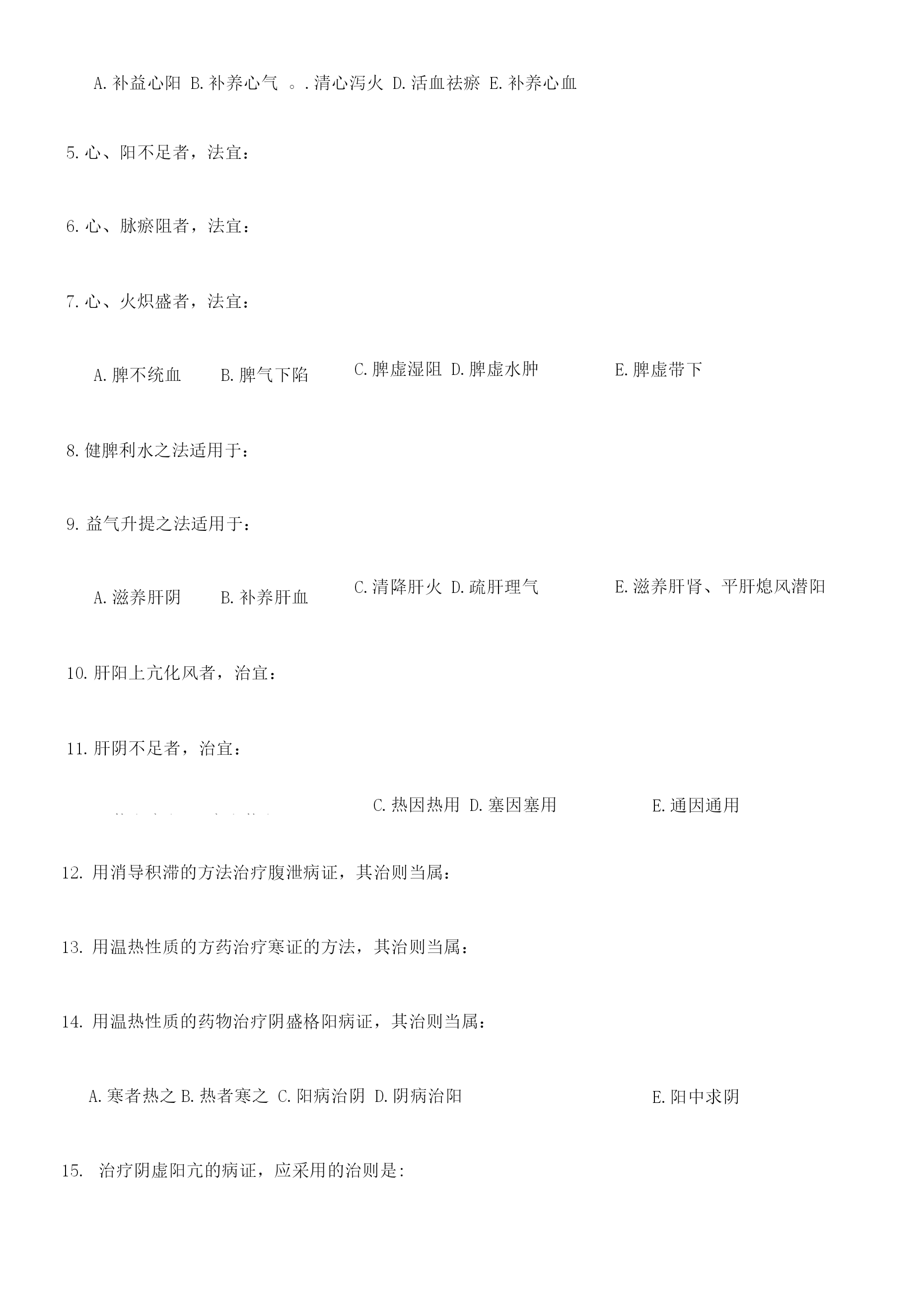 中医基础理论试题及答案一、选择题(一)A型题中医养生学认为探索衰老机制的中心环节是:A.肾中精气的盛衰B.I、肺的功能状态脾胃运化功能的强弱D.肝肾精血互化的状态E.肾中精气的盛衰和脾的功能状态下列不属于顺应自然养生的是:A.用寒远寒,用热远热B.春夏养阳、秋冬养阴C.顺应四时调摄D.昼夜晨昏调养E.起居有常下列何项非中医饮食养生所提倡:A.药膳保健B.注意饮食卫生C.提倡饮食有节D.克服饮食偏嗜E.强调高营养饮食对疾病力求早期诊断、早期治疗的目的:A.提高治愈率B.尽早确立治疗方法C.提高诊断的正确率D.中止其病情的发展变化E.以上均不是下列不属于既病防变方法的是:A.人工免疫B.早期诊断C.早期治疗D.先安未受邪之地E.阻截病传途径不属于治则的是:A.治病求本B.扶正祛邪C.调理气血D.活血化瘀E.调治脏腑“见肝之病,当先实脾”的治疗原则当属:A.早治防变B.治病求本C.调理脏腑D.调理气血E.三因制宜下列何项属正治法则:A.标本兼治B.塞因塞用C.寒者热之D.因人制宜E.寒因寒用下列何项非属逆治法则:A.热因热用B.寒者热之C.热者寒之D.虚则补之E.实则泻之下列何项属反治法则:A.实则泻之B.通因通用C.虚则补之D.培土生金E.滋水涵木下列何项不属从治法则:A.寒因寒用B.热因热用C.通因通用D.热者寒之E.寒因寒用“阴中求阳”的治疗方法是指:A.在扶阳剂中适当佐以滋阴药B.滋阴剂中适当佐以扶阳药C.在温阳散寒同时佐以扶阳D.在清泻阳热同时佐以滋阴E.以上皆是“壮水之主,以制阳光”指:A.阴中求阳B.阳中求阴C.阳病治阴D.阴病治阳E.治寒以热攻补兼施治则适用于何证:A.虚证B.真实假虚证C.实证D.真虚假实证E.虚实夹杂证真实假虚证的治疗原则应是:A.祛邪兼扶正B.扶正兼祛邪C.先祛邪后扶正D‘单独祛邪E.先扶正后祛邪真虚假实证的治疗原则应是:A.单独祛邪B.单独扶正C.先扶正后祛邪D.扶正兼祛邪E.祛邪扶正并重“通因通用”适用于下列哪种病证:A.脾虚泄泻B.肾虚泄泻C.食积泄泻D.气虚泄泻E.寒湿泄泻“塞因塞用”不适用于下列哪种病证:A.脾虚腹胀B.血枯经闭C.肾虚尿闭D.气郁腹胀E.阴虚便秘阴中求阳的治疗方法是指:A.在扶阳剂中适当佐以滋阴药D.在滋阴剂中适当佐以扶阳药C.温阳散寒同时佐以扶阳D.充分滋阴的基础上配以补阳剂E.以上皆不是阴病治阳适用于下列何证:“壮水之主,以制阳光”指:A.阴中求阳B.阳中求阴C.阳病治阴D.阴病治阳E.阴阳双补下列非调理脏腑治则的是:A.用寒远寒,用热远热B.实则泻腑,虚则补脏C.脏病治腑D.虚则补其母,实则泻其子E.腑病治脏素体阳虚又感受寒邪的患者,治以助阳解表法,应属于:A.先治其标B.先治其本C.标本兼治D.虚则补之E.以上皆不是血虚证,临床多从何脏腑论治:火肝胃8.脾胃C.肝肾D.肝胆£.肝胃骨和髓之病变,多从何脏论治:A./心B.肺C.脾D.肝E.肾单纯的气血证常从何脏论治:火心肝肺B.肝肾。.心肝肾》心肾E.肺脾肾水湿痰饮多从何脏论治:火心肾B.肺脾肾。.心脾肝肾D.肺肝脾肾£.心肝脾肺肾A.益气B.活血C.降逆D.行气E.补气亡阳的主要原因是机体内的阳气大量亡失,治宜:A.滋阴制阳B.扶阳消阴C.回阳救逆D.救阴固脱E.阴中求阳“老年慎泻,少年慎补”是根据……而确定的用药原则:A.因时制宜B.因地制宜C.因人制宜D.标本同治E.治病求本(二)B型题A.静功锻炼,注意保津养阴B.运动适度,注意养阳C.户外动形锻炼,注意养阳D.晨炼必待日光,注意敛阳护阴,以养藏为本E.以上皆宜春季养生活动最宜:秋季养生活动最宜;A.表寒证运用温热的方药B.里热证采用辛凉清里的方药C.阳气虚衰运用扶阳益气的方药D.瘀血证采用活血化瘀的方药E.里寒证运用辛热温里的方药上述何项属虚则补之的具体运用:上述何项属实则泻之的具体运用:A.补益心阳B.补养心气。.清心泻火D.活血祛瘀E.补养心血心、阳不足者,法宜:心、脉瘀阻者,法宜:心、火炽盛者,法宜:A.脾不统血B.脾气下陷健脾利水之法适用于:益气升提之法适用于:A.滋养肝阴B.补养肝血肝阳上亢化风者,治宜:肝阴不足者,治宜:A.热者寒之B.寒者热之C.脾虚湿阻D.脾虚水肿C.清降肝火D.疏肝理气C.热因热用D.塞因塞用E.脾虚带下E.滋养肝肾、平肝熄风潜阳E.通因通用用消导积滞的方法治疗腹泄病证,其治则当属:用温热性质的方药治疗寒证的方法,其治则当属:用温热性质的药物治疗阴盛格阳病