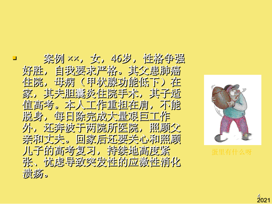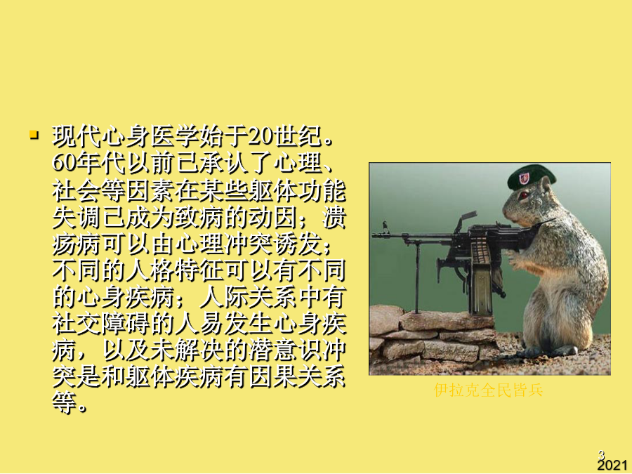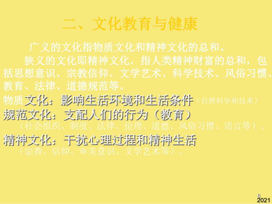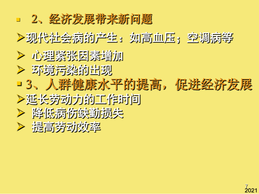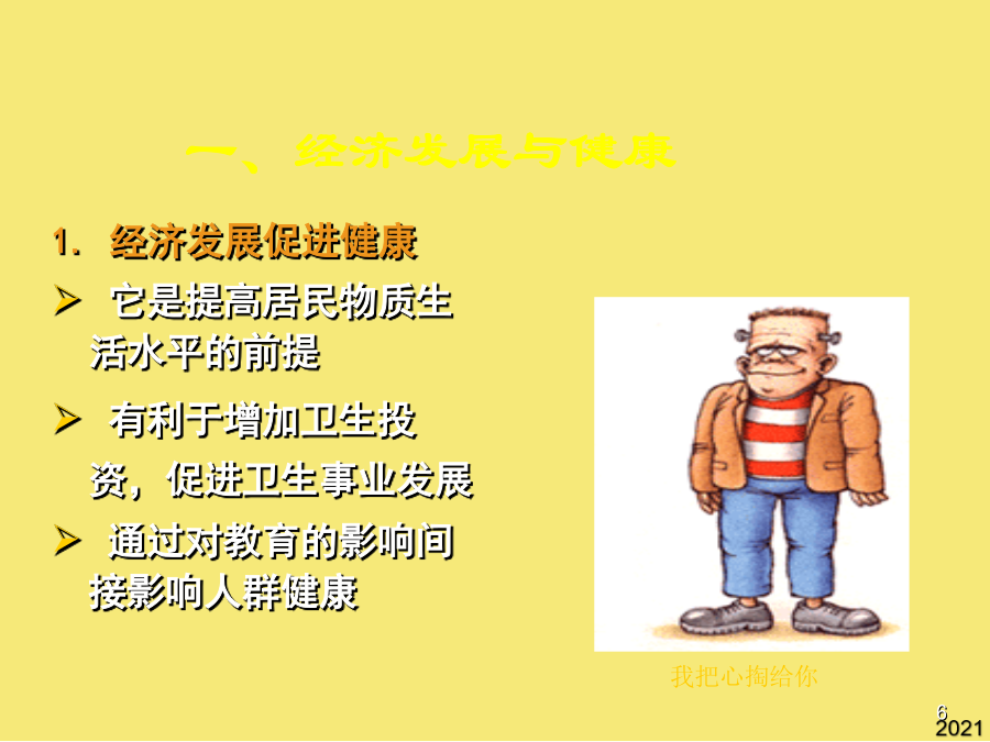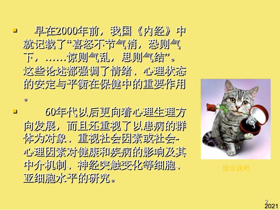 第六章社会环境与健康早在2000年前,我国《内经》中就记载了“喜怒不节气消,恐则气下,……惊则气乱,思则气结”。这些论述都强调了情绪、心理状态的安定与平衡在保健中的重要作用。60年代以后更向着心理生理方向发展,而且还重视了以患病的群体为对象、重视社会因素或社会-心理因素对健康和疾病的影响及其中介机制、神经突触变化等细胞、亚细胞水平的研究。社会因素与健康2、吸毒人群的特征及动机心理因素→大脑皮层→植物神经→内脏功能障碍→内脏形态学改变共同特点:病原体很脆弱,对外界湿度与温度变化的适应能力很低。指由于社会心理因素的刺激引起的持久生理功能紊乱及其所致的器质性疾病。[2]导致社会病的行为方式是法律和行政手段(关键)、药物治疗、心理治疗如何实现好的生活扩大家庭(主干、联合家庭)(社会组织、制度、法律、伦理、道德、风俗习惯、语言等)、消费结构:文化程度不同的人对生活资料的支配方式不同,产生不同的健康效果2、存在自创性危险因素型C型行为:压抑、过分忍让、回避矛盾、怒而不发、好生闷气。1、社会心理因素与疾病[2]造成心理紧张的化学因素是[2]造成心理紧张的化学因素是常见情感障碍有:焦虑、忧郁、指主要通过性交或类似性行为而传播的疾病。2、经济发展带来新问题现代社会病的产生:如高血压;空调病等心理紧张因素增加环境污染的出现3、人群健康水平的提高,促进经济发展延长劳动力的工作时间降低病伤缺勤损失提高劳动效率广义的文化指物质文化和精神文化的总和。狭义的文化即精神文化,指人类精神财富的总和,包括思想意识、宗教信仰、文学艺术、科学技术、风俗习惯、教育、法律、道德规范等。物质文化:影响生活环境和生活条件(自然科学和技术)规范文化:支配人们的行为(教育)(社会组织、制度、法律、伦理、道德、风俗习惯、语言等)、精神文化:干扰心理过程和精神生活(宗教、信仰、审美意识、文学艺术等)。三、家庭与健康3.家庭对健康的影响人是生活在社会环境中的有各种心理活动的高级动物。社会环境中的各种因素必然要影响人的一切心理活动,导致情绪恶化,对健康造成影响。它是提高居民物质生活水平的前提生命在于运动[2]造成心理紧张的化学因素是WHO定无烟日于每年:现代心身医学始于20世纪。5、遗传和个性特征和心身疾病有关先天畸形[1]不良的营养方式是关系不融洽、家庭不和睦——家将成为烦恼的源泉。本人工作重担在肩,不能脱身,每日除完成大量艰巨工作外,还奔波于两院所医院,照顾父亲和丈夫。[1]造成心理紧张的社会心理因素是社会环境变动、特殊事件等家庭:不和睦、婚姻破裂、解体2、学习工作环境工种、工作学习环境、工作学习负荷等3、社会生活与个人特殊遭遇社会环境变动、特殊事件等二、社会心理因素对健康的影响2、社会心理因素致病机制3.心身疾病1、心血管系统;2、呼吸系统;3、消化系统;4、内分泌系统;5、泌尿生殖系统;6、神经系统;7、皮肤系统;8、肌肉骨骼系统;9、其他心身疾病的特点危险因素常见心理刺激1、学习与工作的问题2、人事关系3、恋爱与婚姻问题4、家庭问题5、意外事件6、非现实性想象性心理刺激3.生理因素(3)神经递质系统应激→中枢儿茶酚胺↑、5-HT↓→植物神经功能、内分泌活动改变(4)免疫系统应激→T细胞功能↓→免疫功能↓或紊乱4.情感障碍常见情感障碍有:焦虑、忧郁、应激性(irritability)5.人格类型有些心身疾病具有特殊的人格特征:孤独、内向、抑郁、失望等。6.遗传同一家族的人具有相似的性格、生理素质、生活习惯、文化背景等。三、社会心理因素刺激的评估刺激引起的心理反应累积到一定程度,超过个体自我调节的能力才会致病。人类的健康和长寿40%取决于遗传和客观条件,60%依靠自己建立的生活方式和心理行为习惯。1992年WHO报告,全球50%以上死亡与不良生活方式和行为有关。据全国19个点的调查结果显示,心血管疾病已跃居死亡原因的首位,在其死因分析中,生活方式和心理行为因素已超过传统的生物因素(45.70:29.00),成为与死亡有关的首位因素。有利健康的行为:合理营养、睡眠、锻炼有害健康的行为:吸烟、酗酒、吸毒等一、吸烟(smoking)吸烟被称为“二十世纪的瘟疫”,是一种慢性自杀行为。1.吸烟对健康的危害吸烟与癌症:肺癌(RR、剂量关系)其他(卵巢癌、膀胱癌)吸烟与慢支、肺气肿、支气管扩张等被动吸烟孕妇吸烟与胎儿:体重,早产、流产先天畸形2、经济发展带来新问题二、健康危险因素评价的目的局部刺激、干扰生理、生化和代谢、致突、致癌常见情感障碍有:焦虑、忧郁、2、存在自创性危险因素型狭义的文化即精神文化,指人类精神财富的总