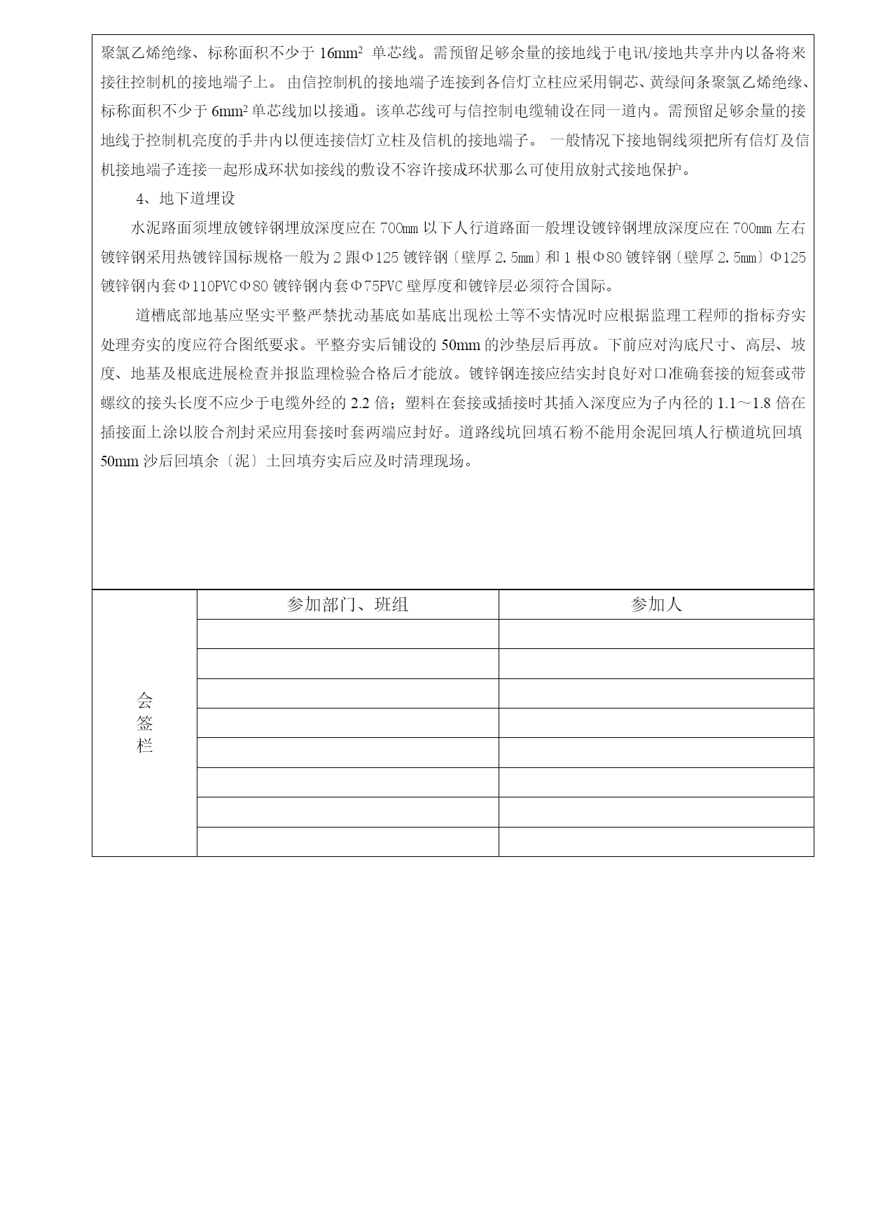第一页共三页政根底设施工程施工技术交底记录编:政施—10工程名称山南海区桂澜路〔桂平路至海八路〕改造工程承包北京政二建立工程有限责任分包交底北京政二建立工程有限责任交底日年月日交底范围交通工程交底人交底内容:交通工程施工措施、方案1、交通标志施工⑴、根底施工①标志柱根底应按设计图规定的尺寸于指定地点进展开挖。基底按规定进展处理后立模板扎钢筋敷设电线浇注混凝上。②地脚螺栓和底法兰盘位置正确达规定标高。③在混凝土尚未经过至少七天之凝固前混凝土根底上不得受力架设支柱和标志。④回填压实工作应于构造物上竖立标志前完成。⑶、标志支撑构造的安装标志支撑构造的架设应在根底砼到达设计强度的75以后。在横梁安装前应先预拱;横梁中间处的预拱度一般为50mm悬臂标志的预拱度为40mm。⑷、标志板的制作①粘贴反光膜时不允许采用手工操作或用溶剂激活粘结剂。在标志的最外层可涂保护层如透明涂料等。②反光膜应尽可能减少拼接当粘贴反光膜不可防止出现接缝时应使用反光膜的宽度进展拼接拼接以搭接为主。③当用反光膜拼接标志图案时拼接处应有3-6mm的重叠局部。反光膜粘贴在挤压型材版面上伸出上下边缘的最小长度8mm且应严地粘贴在上、下边缘上。④标志板应在车间剪裁或切割以产生整齐方正的边缘不应有毛刺。所有标志的槽钢应在粘贴定向反光膜之前焊接好。⑤定向反光膜应用不剥落的热活性胶粘剂粘贴将反光膜结实粘贴到标志板上其外表不得产生气泡和污损等缺陷。⑥标志安装完毕后应清扫标志板应使用清水或无腐蚀性液体轻擦。2、交通标线⑴、本合同段均采用耐久、发光性能好的热熔标线涂料。⑵、将热熔釜装载于车上配以液化石油气加热装置和搅拌装置。熔融的过程中要注意温度的控制充分搅拌、混合使涂料均匀。⑶、可用扫帚、板刷、枯燥器等工具使路面保持清洁、枯燥确保路面无松散颗粒、灰尘、油污或其续上表第二页共三页他有害物质。⑷、为了进步路面与涂膜的粘接力须在路面上先涂抹适量的底漆待底漆不粘车胎、不粘附灰尘、沙土时才可进展标线涂布作业。⑸、涂敷前应进展施工设备的调试及试划以确保施划出的标线的色泽、厚度、宽度、玻璃珠的撒布量等符合业主的要求。为了保证间的识别性在标线涂敷的同时要撒布适量的玻璃珠。⑹、划线完毕后应根据实际完成情况计测工作量。检查标线的厚度、尺寸、玻璃珠的撒布量及标线的形状等对不符合要求的标线进展修整去除溢出和垂落的涂膜。⑺、及时整理施工机械扫除施工残留物确保施工现场的清洁并请监理工程师验收施划好的交通标带。3、交通信灯施工⑴、构造件加工①信灯杆的焊接加工采用电弧焊。②在制螺栓孔时均加工相应夹具固定以保证法兰具有互换性。对于安装尺寸一样的构件加工过程中用专用夹具固定其相对位置以保证其同一类构件的互换性。③横梁的制作由于横梁均为悬臂构造根据设计要求在制作中将连接处预先向上方偏2度以平衡横梁在荷载作用下的边形。④根据使用要求金属构件外表均做防腐金属构件加工完成后均做热浸锌处理。在浸锌过程中构件在镀曹内放置平整严格控制构件的变形以保证构件的安装尺寸以及安装后的误差在施工验收规定范围内。假如外表进展了喷塑处理那么在运转过程中要防止碰伤喷塑外表。⑵、杆件的安装①在所选定位置挖掘根底并安设好预埋件。②将按图纸尺寸制作好的信灯灯杆、悬臂以及信灯电缆线运送至现场并将所需的机具设备准备好并作现场环境检查。③对信灯及灯杆要求安装组合的部件安排专业技术人员进展组装。④信灯及杆件安装用吊车先将信灯杆吊起组织施工人员将信灯杆固定在根底上调整信灯杆位置用检测机具对信灯杆的竖直度进展检测以确定其正确位置再校整信灯位置。⑶、线路的施工①电缆〔电线〕交通信系统的电缆将采用地下敷设。②交通信控制电缆分别连接到信灯和信机的接线柱上电线绝缘且无接头并用有码的套编码以便日后的维修。除所需长度外每根电缆线应留有余量于最靠近立柱的拉线井内人行灯立柱应2m车道灯立柱应留2m。在信机端每根电缆应留有2m的余量整齐地放于信机根底旁的接线井内。连线要有足够的导体保证信系统的全负载操作。放线后每根电缆线尾断口应封防止水份渗入线内。③所有外部非带电的金属部件用铜线连成一个连续的接地系统用一绝缘铜线分别连接至控制机的接地座。所有埋在地下物件和电缆的设计与安装应使他们在浸水时能连续运行而不出故障。④除所需长度外电缆应留有2m的余量于井内接头应全封连接防水、防潮接线施工前须上报业主/工程师同意。整段电缆不应有其它接头。在信机端传输电缆应留有2m的余量封整续上表第三页共三页齐地放于信机根底的接线井内每根传输电缆应分别进展方向和车道的编。⑤接地安排路口交通信设施须安装接地系统使整个路口的信灯杆信机接地极加以保护。接地极应采用铜制接地棒其直径不少于12.5mm。如需加长接地棒应以耦合器