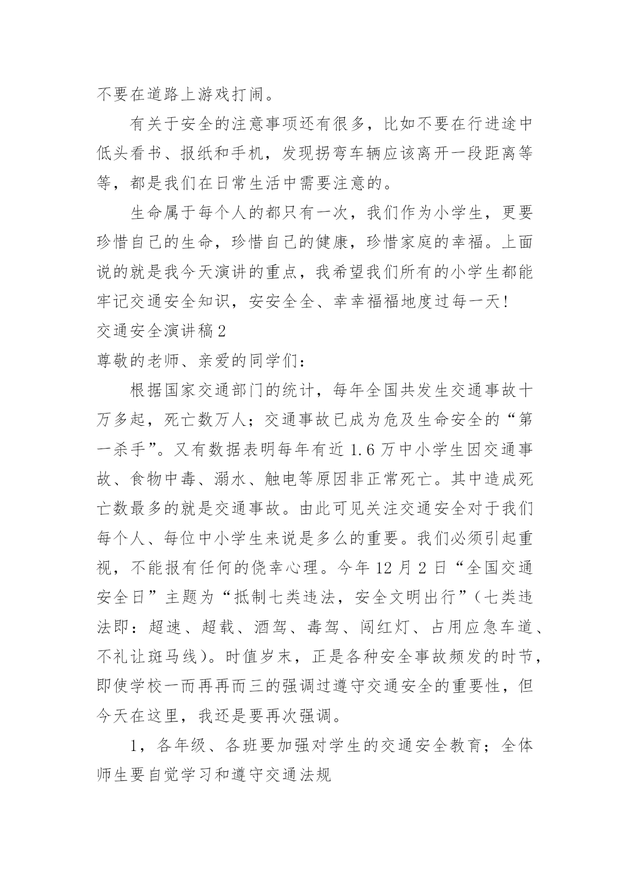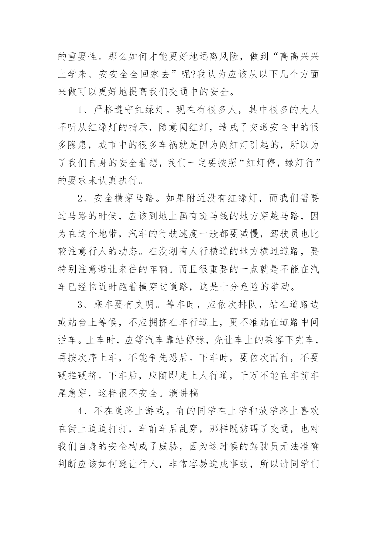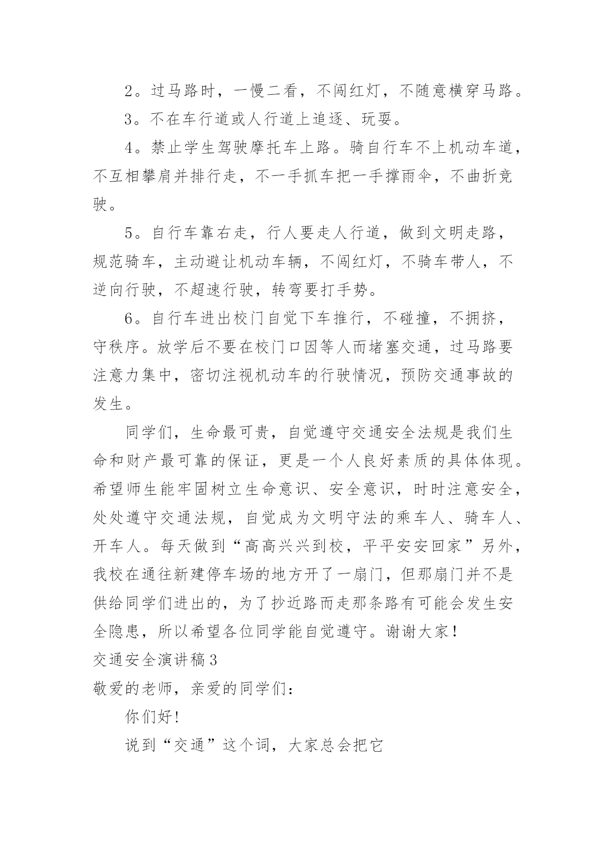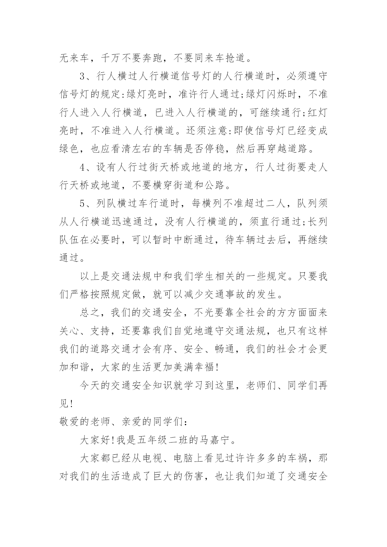 交通安全演讲稿交通安全演讲稿演讲稿是为了在会议或重要活动上表达自己意见、看法或汇报思想工作情况而事先准备好的文稿。在日常生活和工作中,演讲稿应用范围愈来愈广泛,还是对演讲稿一筹莫展吗?下面是小编帮大家整理的交通安全演讲稿,供大家参考借鉴,希望可以帮助到有需要的朋友。交通安全演讲稿1尊敬的各位老师,同学们:大家好!伴随着一首好听的音乐《红灯停绿灯行》。我们开始了今天的广播。音乐很好听吧!在我们刚入校时,老师就教育我们要遵守交通规则。请同学们回想一下,你真正做到了吗?从今天起,我们将通过广播一起学习各项安全知识。希望各班班主任组织好学生认真收听。今天我们一起学习《交通安全知识》。很多时候,我们走路都是步行的,所以我们先来了解一下交通法规对行人的要求。交通法规对行人的要求有:1、遵守车辆、行人各行其道的规定,借道通行时,应当让在其本道内行驶的车辆或行人优先通行;2、遵守“红灯停、绿灯行、黄灯闪烁多注意”的原则;3、必须遵守交通标志和标线的规定,服从交通警察的指挥与管理;4、不要在道路上爬车、追车、强行拦车、抛物击车或在道路上躺卧、纳凉、聚众围观等;5、不要强迫、纵容他人违反交通法规,同时对任何人违反交通法规都有劝阻和控告的权利。作为小学生,我们在放学和集体外出时应怎样做?在放学路上,要遵守纪律排好队,在教师的护送下,有秩序地在人行道上行走。过马路时,要走人行横道。我们走路要走人行道。在没有人行道的地方,应靠路边行走。走路时,思想要集中,不能一边走一边玩耍或一边看书,不能三五成群并排行走,更不能追赶车辆嬉戏打闹。集体外出活动,要有教师的带领,排成两列纵队,在人行道上行走。不要随便离开队伍。不要在队伍里你推我拉,嬉戏打闹。不做妨碍交通安全的事,不在交通拥挤的地方集队、停留,以免影响他人通行。过公路时,应走人行横道。在没有人行横道的路段要看清路面情况,在没有车辆行驶时,抓紧时间通过。大家知道吧!未满12周岁的儿童不准骑车。为什么未满12周岁的儿童不准骑车呢?因为骑车人必须具有一定的体力、智力和骑车技术,还需要有一定的交通常识以及对各种事物的识别、分析和判断能力,才能安全使用车辆。根据医学、生理学和心理学资料分析表明,一个人的发育期通常要满十二、十三岁,才能初步达到上述最低要求。因此交通规则从保障少年儿童的安全出发,规定十二周岁以下儿童不准骑车。作为一名小学生,我们要做文明人。那么文明乘车应当尊守哪些秩序?文明乘车,确保安全。等乘公共汽车,应在站台上有秩序地等候。车停稳后,让车上的人先下,然后依次上车,不要争抢。上车后要主动买票,遇到老弱病残和怀抱婴儿的人应主动让座。车辆行驶时,要坐好或站稳,抓住扶手,防止紧急刹车时摔倒。不能将头和手伸出窗外,不能在车厢内大声叫嚷,乱扔果皮、纸屑,要做一个文明的小乘客。此外,我们还要注意,千万不要去乘坐车况不好或者没有合法手续的车,比如我刚才给大家讲的黑龙江的那起车祸,翻车的一个原因就是车况差。在我们上街和横过道路应该怎么做?1、行人上街要走人行道,不要走车行道。2、横过街道和公路要走人行横道,不要斜穿或猛跑。行人横过道路时,应站立在路边,看清来往车辆后,选择离自己最近的人行横道通过。通过时,须先看左右方向是否有来车,确认来车距离远无危险后才能通过。行人横过道路时,不要突然改变行走路线,突然猛跑,突然往后退,以防来车驾驶员措手不及,发生危险。横过同方向有两条以上机动车道的道路时,要十分注意驶近或停下的车辆旁边是否还有车辆驶来,没有看清时不要冒险行走。横过未设人行横道线乡镇街道或公路时,要看清左右有无来车,千万不要奔跑,不要同来车抢道。3、行人横过人行横道信号灯的人行横道时,必须遵守信号灯的规定:绿灯亮时,准许行人通过;绿灯闪烁时,不准行人进入人行横道,已进入人行横道的,可继续通行;红灯亮时,不准进入人行横道。还须注意:即使信号灯已经变成绿色,也应看清左右的车辆是否停稳,然后再穿越道路。4、设有人行过街天桥或地道的地方,行人过街要走人行天桥或地道,不要横穿街道和公路。5、列队横过车行道时,每横列不准超过二人,队列须从人行横道迅速通过,没有人行横道的,须直行通过;长列队伍在必要时,可以暂时中断通过,待车辆过去后,再继续通过。以上是交通法规中和我们学生相关的一些规定。只要我们严格按照规定做,就可以减少交通事故的发生。总之,我们的交通安全,不光要靠全社会的方方面面来关心、支持,还要靠我们自觉地遵守交通法规,也只有这样我们的道路交通才会有序、安全、畅通,我们的社会才会更加和谐,大家的生活更加美满幸福!今天的交通安全知识就学习到这里,老师们、同学们再见!敬爱的老师、亲爱的同学们:大家好!我是五年级二班的马嘉宁。大家都已经从电视、电脑上看见过许许多多的车祸,那对我们的生活造成了巨大的伤害,也让我们知道了交通安全的重要