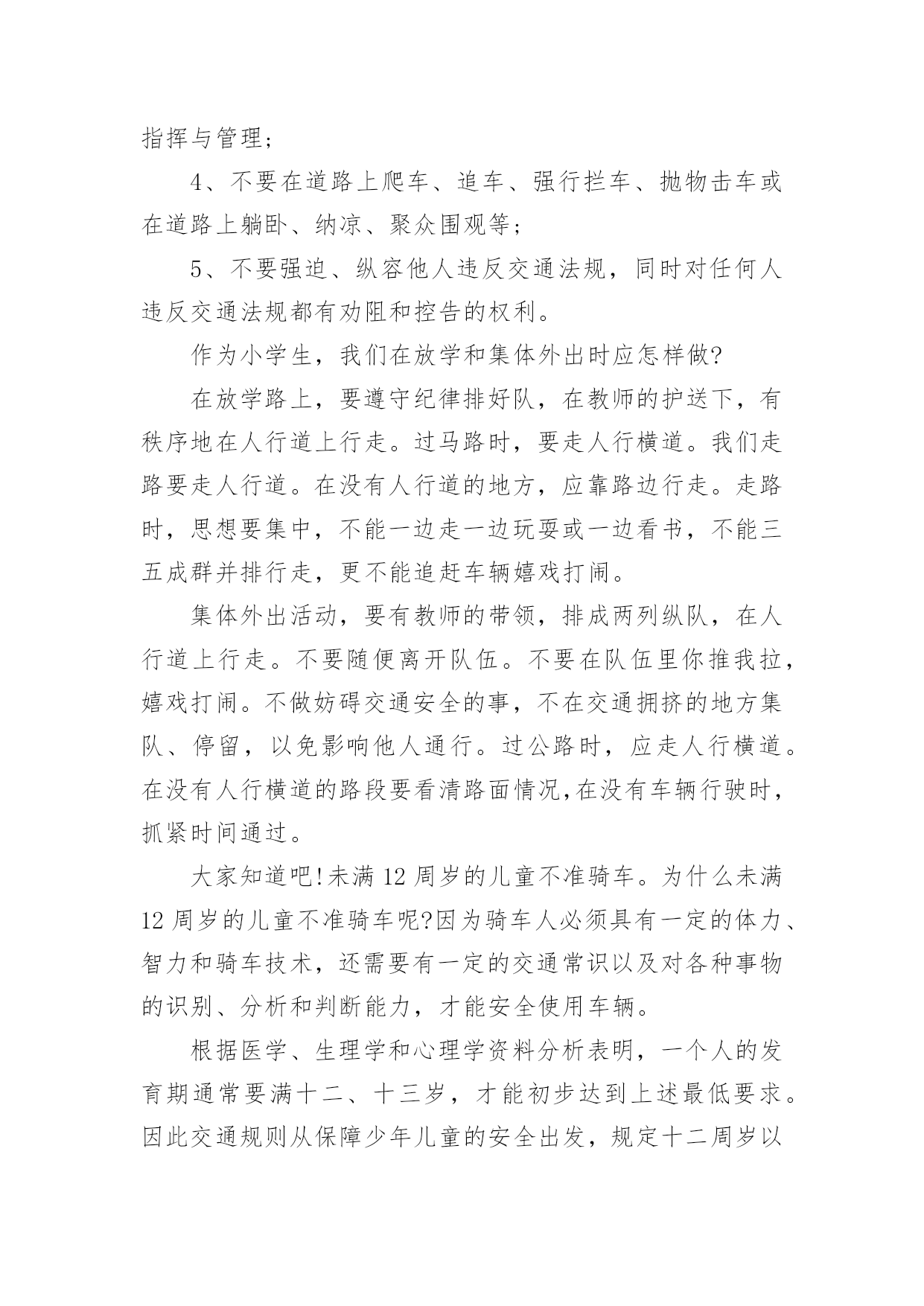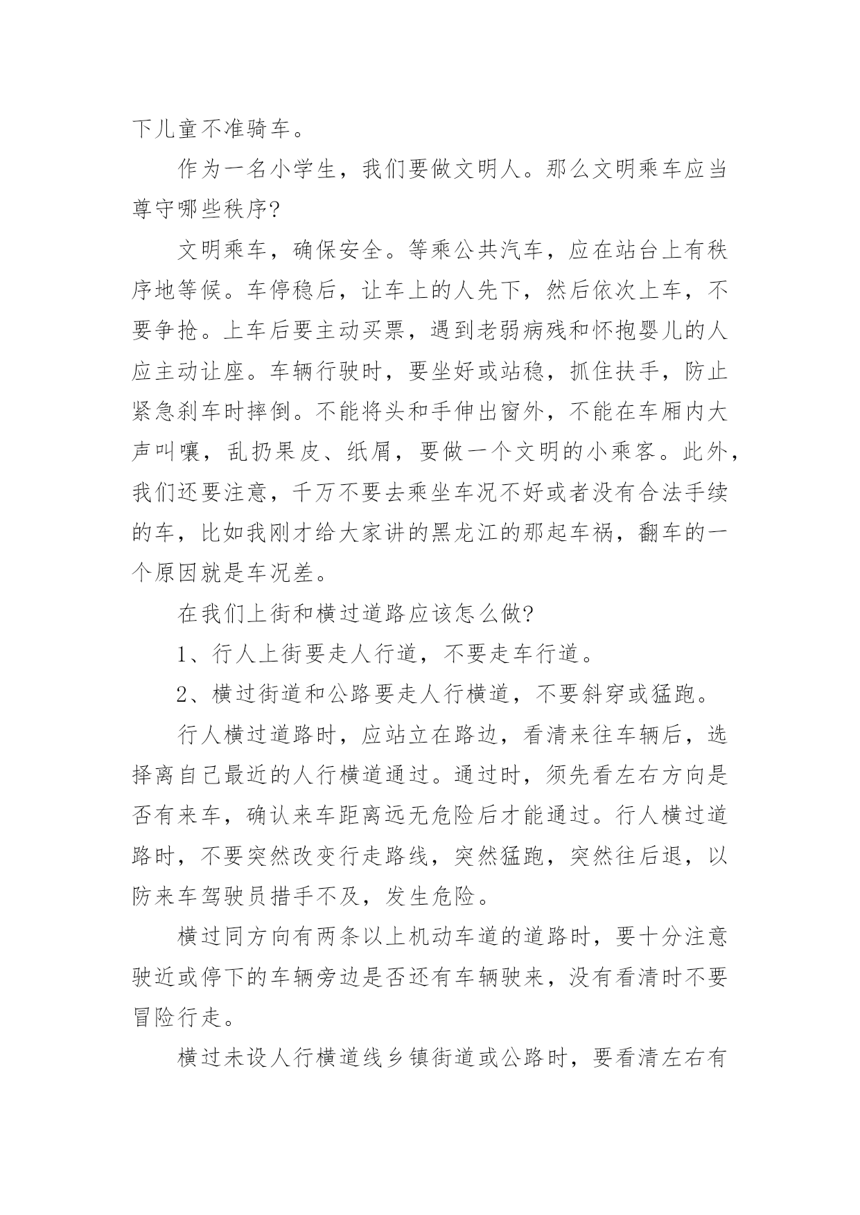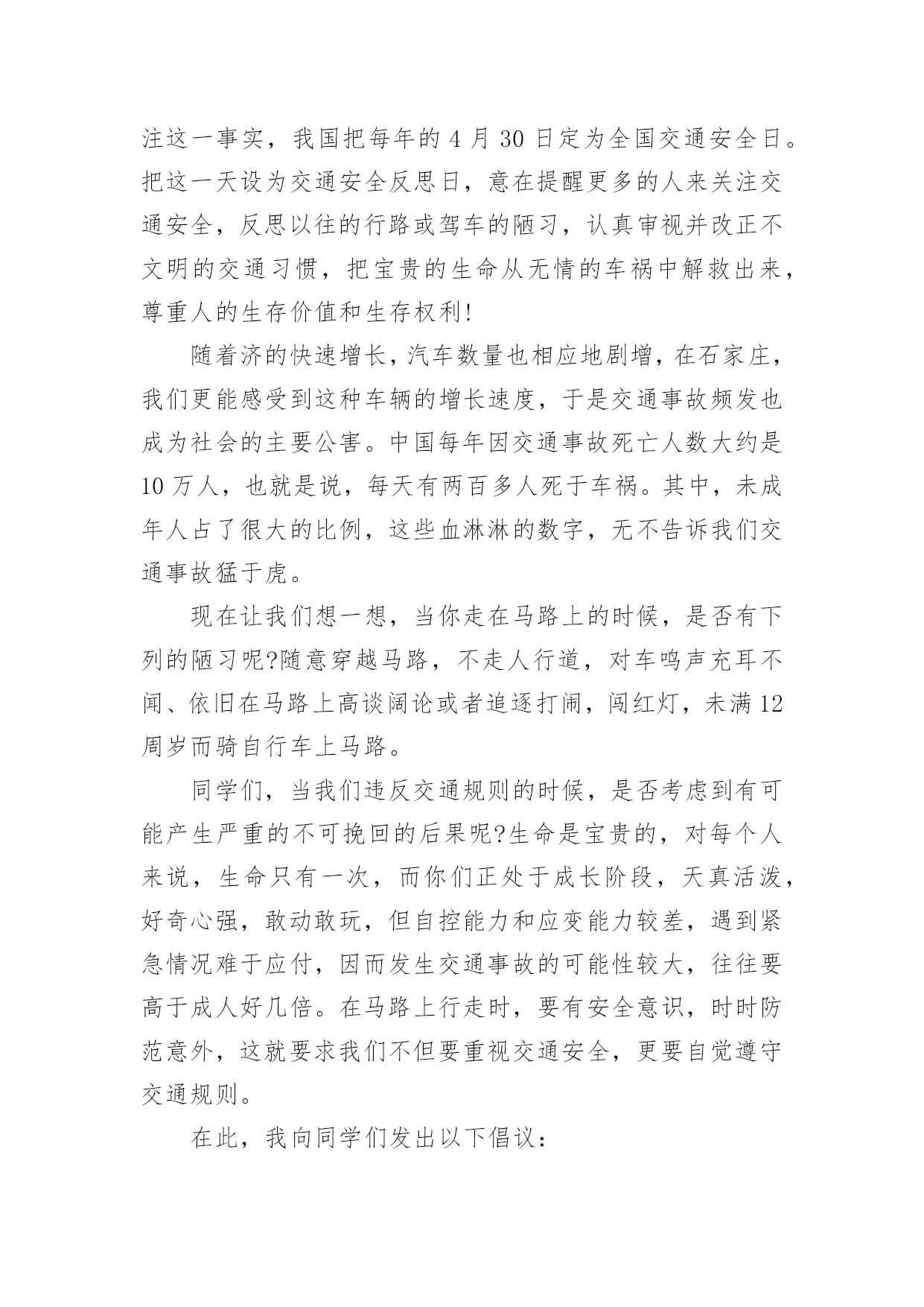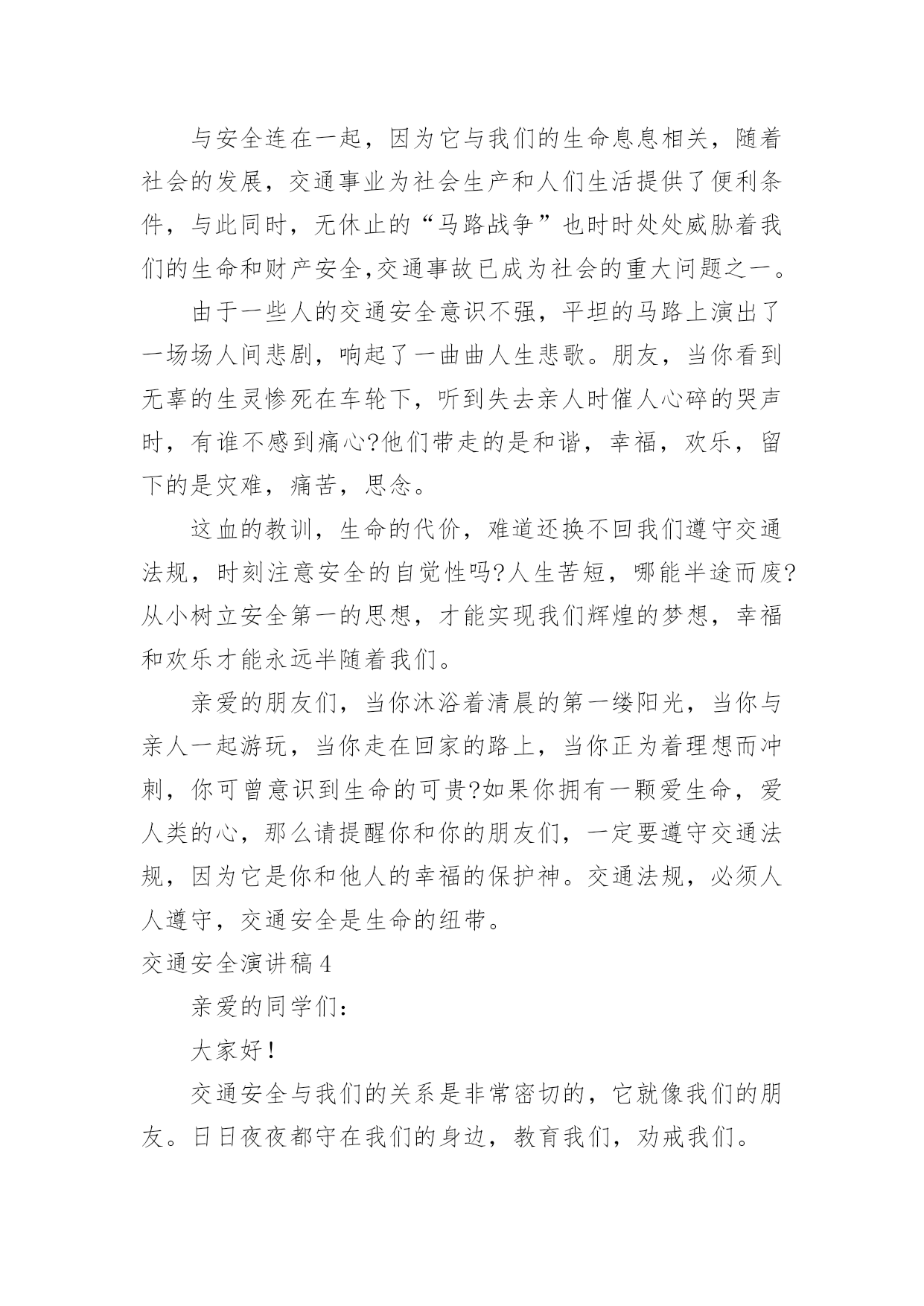 交通安全演讲稿交通安全演讲稿演讲稿是为了在会议或重要活动上表达自己意见、看法或汇报思想工作情况而事先准备好的文稿。在日常生活和工作中,演讲稿应用范围愈来愈广泛,还是对演讲稿一筹莫展吗?下面是小编帮大家整理的交通安全演讲稿,供大家参考借鉴,希望可以帮助到有需要的朋友。交通安全演讲稿1尊敬的各位老师,同学们:大家好!伴随着一首好听的音乐《红灯停绿灯行》。我们开始了今天的广播。音乐很好听吧!在我们刚入校时,老师就教育我们要遵守交通规则。请同学们回想一下,你真正做到了吗?从今天起,我们将通过广播一起学习各项安全知识。希望各班班主任组织好学生认真收听。今天我们一起学习《交通安全知识》。很多时候,我们走路都是步行的,所以我们先来了解一下交通法规对行人的要求。交通法规对行人的要求有:1、遵守车辆、行人各行其道的规定,借道通行时,应当让在其本道内行驶的车辆或行人优先通行;2、遵守“红灯停、绿灯行、黄灯闪烁多注意”的原则;3、必须遵守交通标志和标线的规定,服从交通警察的指挥与管理;4、不要在道路上爬车、追车、强行拦车、抛物击车或在道路上躺卧、纳凉、聚众围观等;5、不要强迫、纵容他人违反交通法规,同时对任何人违反交通法规都有劝阻和控告的权利。作为小学生,我们在放学和集体外出时应怎样做?在放学路上,要遵守纪律排好队,在教师的护送下,有秩序地在人行道上行走。过马路时,要走人行横道。我们走路要走人行道。在没有人行道的地方,应靠路边行走。走路时,思想要集中,不能一边走一边玩耍或一边看书,不能三五成群并排行走,更不能追赶车辆嬉戏打闹。集体外出活动,要有教师的带领,排成两列纵队,在人行道上行走。不要随便离开队伍。不要在队伍里你推我拉,嬉戏打闹。不做妨碍交通安全的事,不在交通拥挤的地方集队、停留,以免影响他人通行。过公路时,应走人行横道。在没有人行横道的路段要看清路面情况,在没有车辆行驶时,抓紧时间通过。大家知道吧!未满12周岁的儿童不准骑车。为什么未满12周岁的儿童不准骑车呢?因为骑车人必须具有一定的体力、智力和骑车技术,还需要有一定的交通常识以及对各种事物的识别、分析和判断能力,才能安全使用车辆。根据医学、生理学和心理学资料分析表明,一个人的发育期通常要满十二、十三岁,才能初步达到上述最低要求。因此交通规则从保障少年儿童的安全出发,规定十二周岁以下儿童不准骑车。作为一名小学生,我们要做文明人。那么文明乘车应当尊守哪些秩序?文明乘车,确保安全。等乘公共汽车,应在站台上有秩序地等候。车停稳后,让车上的人先下,然后依次上车,不要争抢。上车后要主动买票,遇到老弱病残和怀抱婴儿的人应主动让座。车辆行驶时,要坐好或站稳,抓住扶手,防止紧急刹车时摔倒。不能将头和手伸出窗外,不能在车厢内大声叫嚷,乱扔果皮、纸屑,要做一个文明的小乘客。此外,我们还要注意,千万不要去乘坐车况不好或者没有合法手续的车,比如我刚才给大家讲的黑龙江的那起车祸,翻车的一个原因就是车况差。在我们上街和横过道路应该怎么做?1、行人上街要走人行道,不要走车行道。2、横过街道和公路要走人行横道,不要斜穿或猛跑。行人横过道路时,应站立在路边,看清来往车辆后,选择离自己最近的人行横道通过。通过时,须先看左右方向是否有来车,确认来车距离远无危险后才能通过。行人横过道路时,不要突然改变行走路线,突然猛跑,突然往后退,以防来车驾驶员措手不及,发生危险。横过同方向有两条以上机动车道的道路时,要十分注意驶近或停下的车辆旁边是否还有车辆驶来,没有看清时不要冒险行走。横过未设人行横道线乡镇街道或公路时,要看清左右有无来车,千万不要奔跑,不要同来车抢道。3、行人横过人行横道信号灯的人行横道时,必须遵守信号灯的规定:绿灯亮时,准许行人通过;绿灯闪烁时,不准行人进入人行横道,已进入人行横道的,可继续通行;红灯亮时,不准进入人行横道。还须注意:即使信号灯已经变成绿色,也应看清左右的车辆是否停稳,然后再穿越道路。4、设有人行过街天桥或地道的地方,行人过街要走人行天桥或地道,不要横穿街道和公路。5、列队横过车行道时,每横列不准超过二人,队列须从人行横道迅速通过,没有人行横道的,须直行通过;长列队伍在必要时,可以暂时中断通过,待车辆过去后,再继续通过。以上是交通法规中和我们学生相关的一些规定。只要我们严格按照规定做,就可以减少交通事故的发生。总之,我们的交通安全,不光要靠全社会的方方面面来关心、支持,还要靠我们自觉地遵守交通法规,也只有这样我们的道路交通才会有序、安全、畅通,我们的社会才会更加和谐,大家的生活更加美满幸福!今天的交通安全知识就学习到这里,老师们、同学们再见!敬爱的老师、亲爱的同学们:大家好!我是五年级二班的马嘉宁。大家都已经从电视、电脑上看见过许许多多的车祸,那对我们的生活造成了巨大的伤害,也让我们知道了交通安全的重要