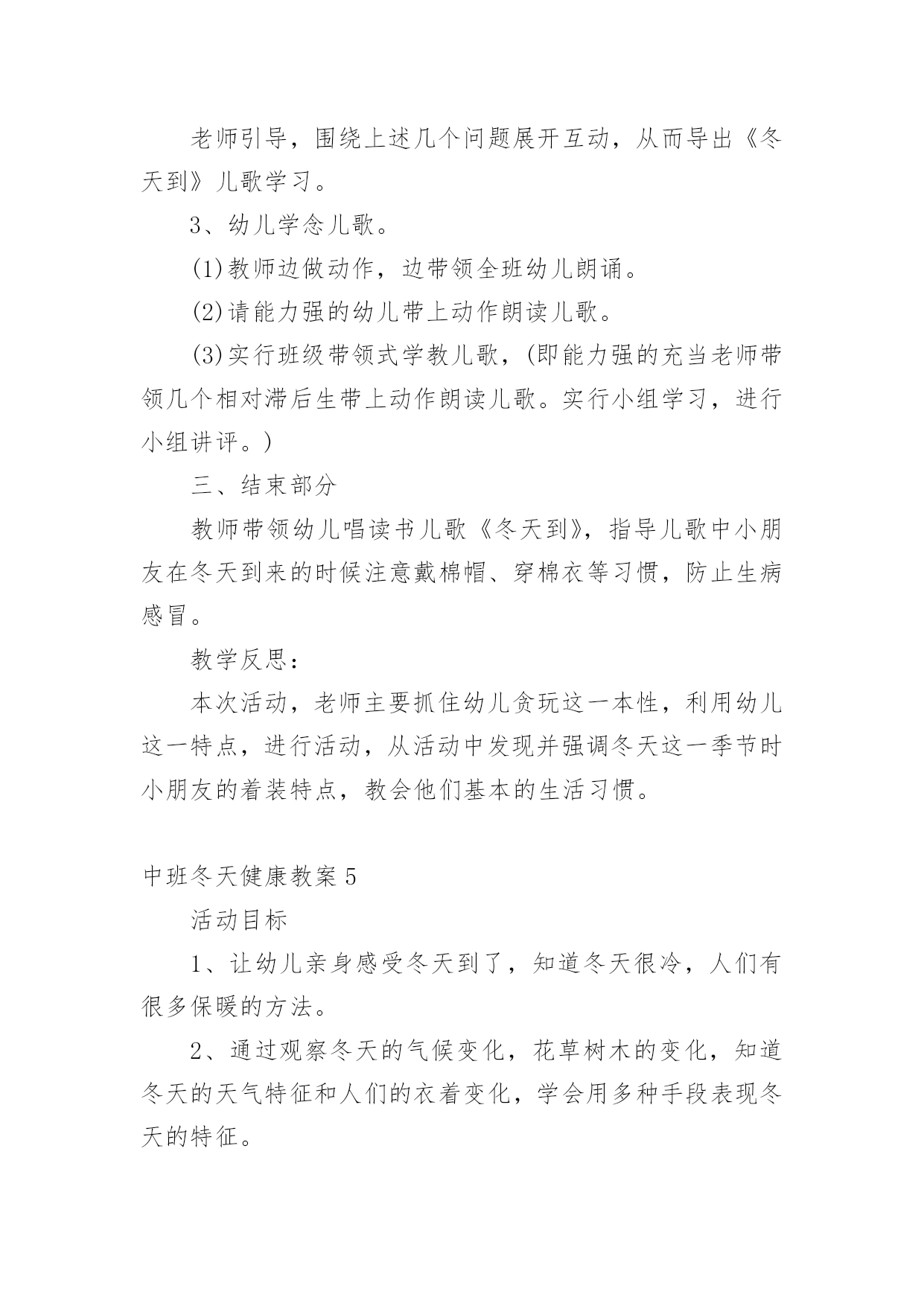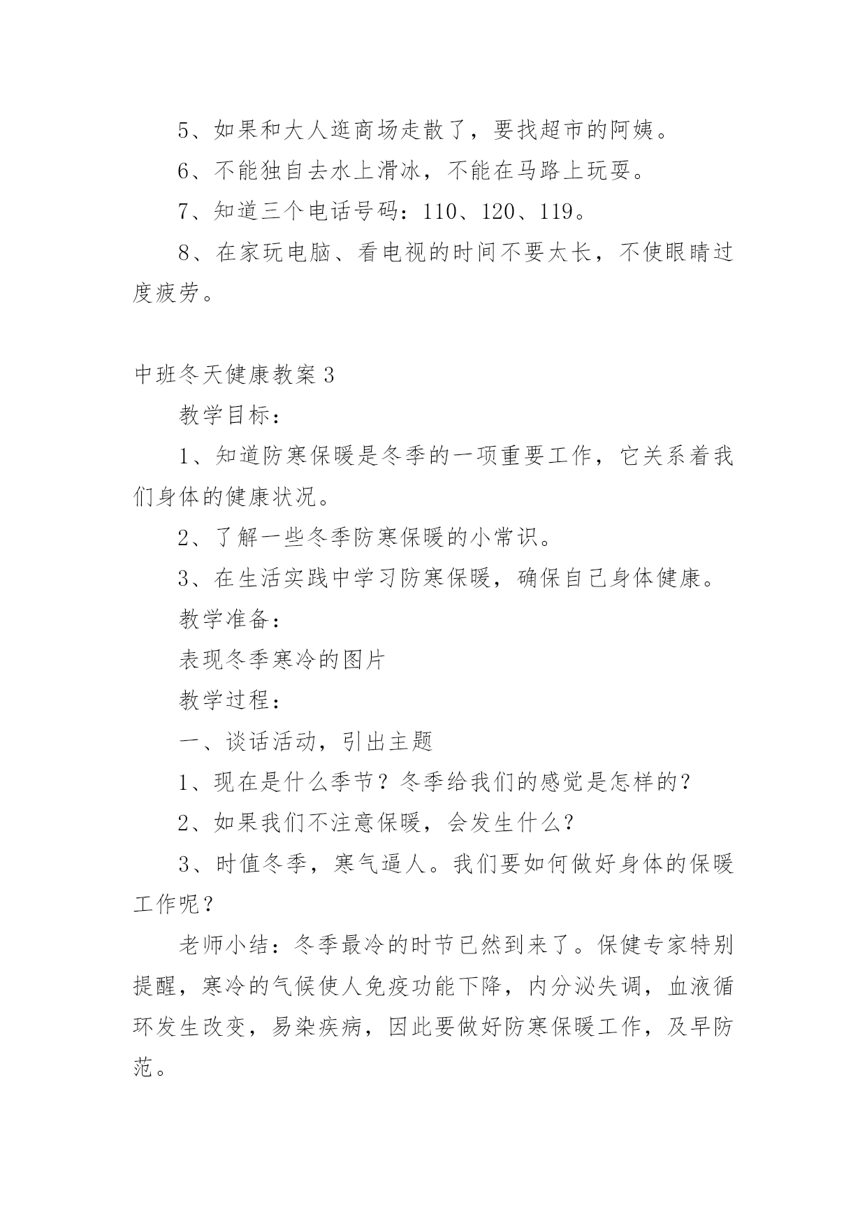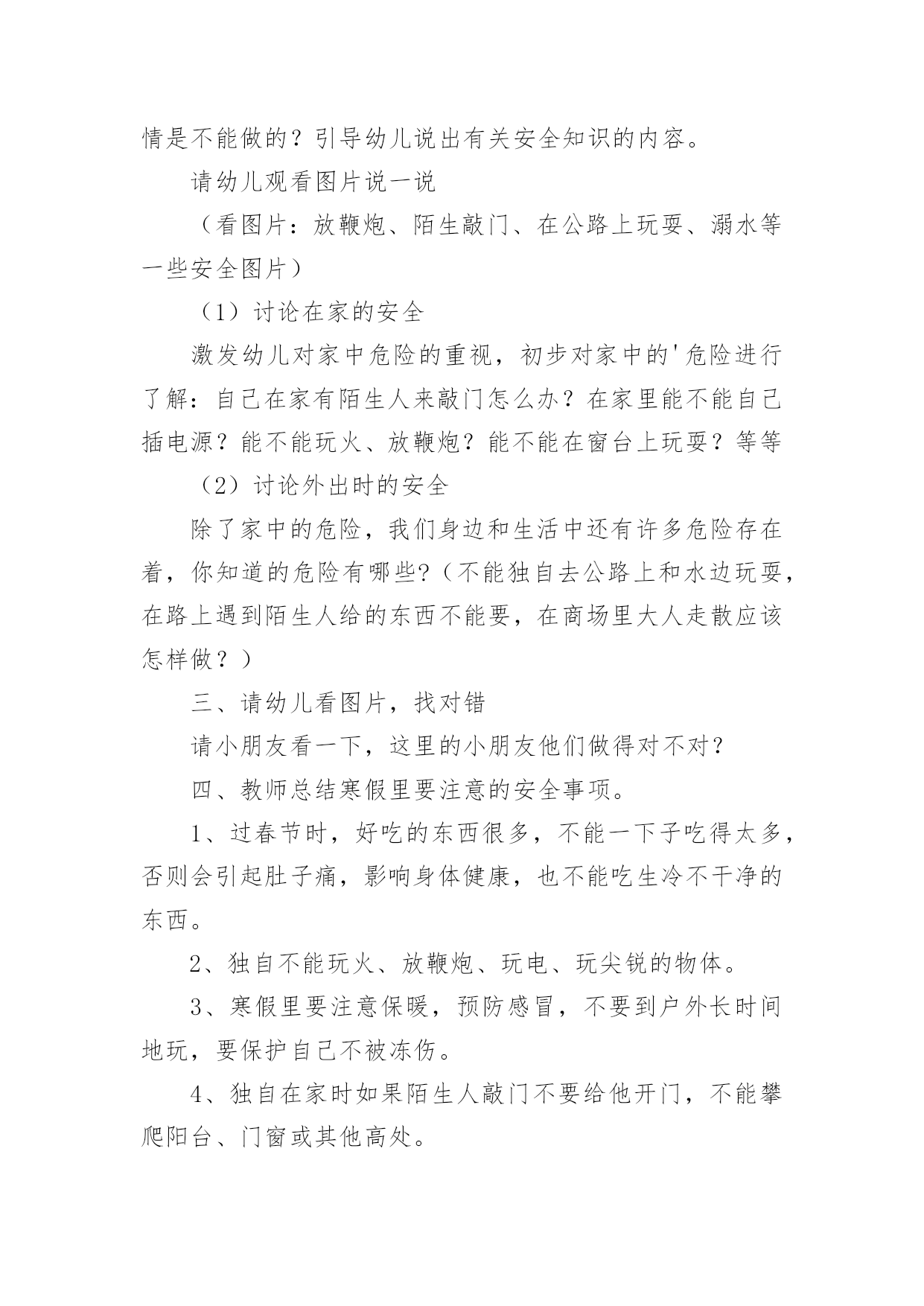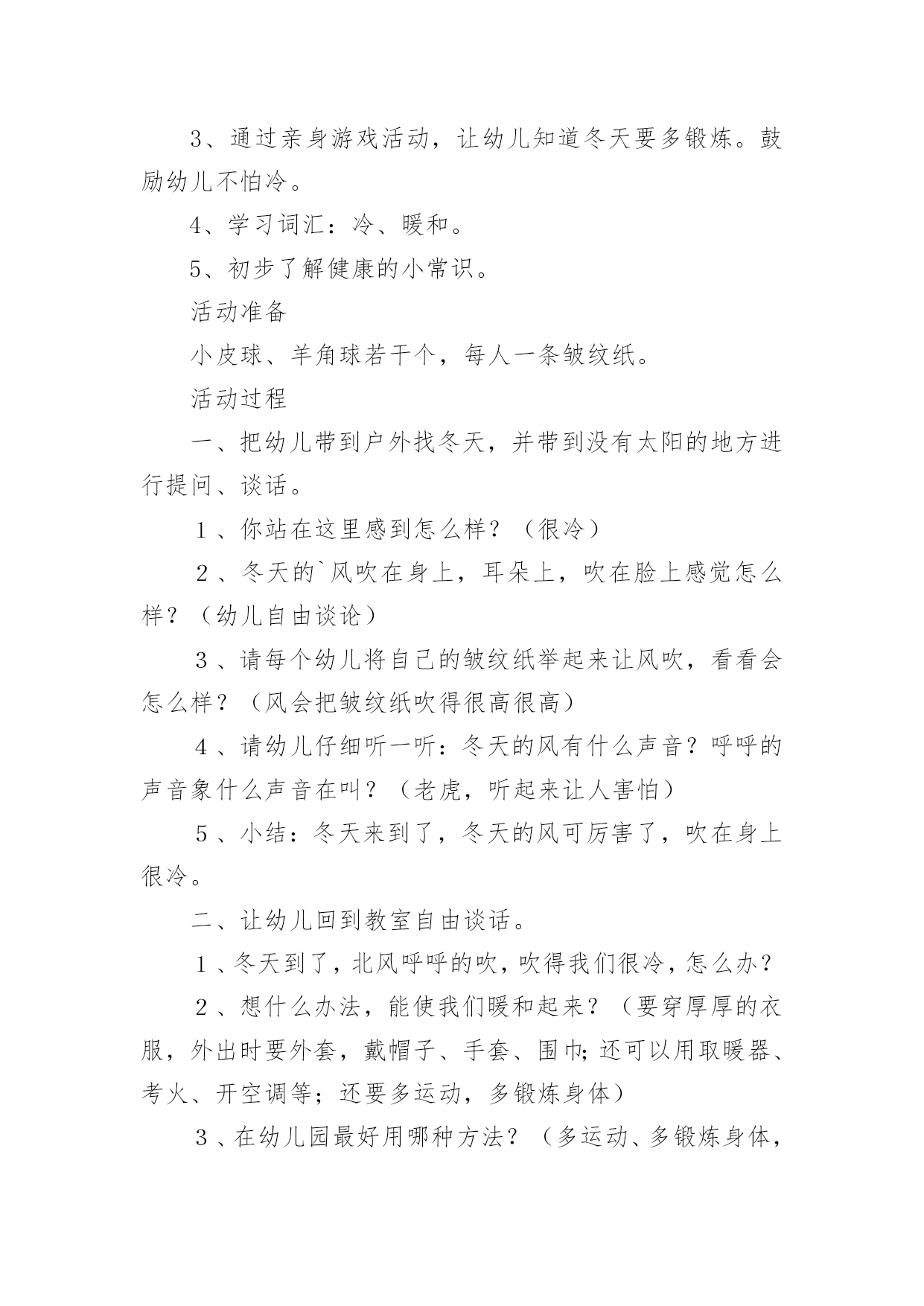 中班冬天健康教案作为一名无私奉献的老师,常常要写一份优秀的教案,教案是保证教学取得成功、提高教学质量的基本条件。那么你有了解过教案吗?下面是小编帮大家整理的中班冬天健康教案,供大家参考借鉴,希望可以帮助到有需要的朋友。中班冬天健康教案1设计背景随着冬天的到来,孩子们发现人们的穿着有所改变的同时也产生许多迷惑:“为什么看不到小蚂蚁出来搬食物?树上的小鸟不见了,它们都到哪去了?”孩子们对动物的生活习性的改变产生了好奇,因此为了顺应幼儿的兴趣需要和发展的需要,我通过活动《冬天是什么》可以让孩子们了解冬天对动物们生活习性产生的影响,以激发幼儿的兴趣和对动物的情感。活动目标1.理解故事《冬天是什么》,感受冬天里的快乐,了解一些动物在冬天里的特别活动。2.理解一些动物不同的过冬方式。3.通过语言表达和动作相结合的形式充分感受故事的童趣。4.能分析故事情节,培养想象力。5.引导幼儿在故事和游戏中学习,感悟生活。重点难点重点:理解故事,感受冬天的快乐。难点:知道动物过冬的几种不同方式。活动准备幼儿用书《动物过冬》,教学课件《冬天是什么》。活动过程1.教师:冬天里我们用什么方法来取暖呢?吃热的东西,戴围巾、戴手套、穿棉袄、戴棉帽,烤火或用取暖器、做运动等方式取暖。2.教师:原来,在寒冷的冬天里我们有好多方法来取暖!但是,小动物们又是怎样度过寒冷的冬天呢?下面我们来听一听、看一看!一、倾听故事《冬天是什么》教师播放故事课件,讲述故事。二、理解故事,交流讨论1.教师:故事的名字叫什么?故事里都有哪些动物?2.教师:冬天,燕子、杜鹃和大雁有什么特别的活动?(飞到温暖的南方—迁移过冬)3.教师:青蛙、小熊和蛇又有什么特别的活动?(美美地睡觉—冬眠)4.教师:松鼠、兔子和绵羊身上出现什么特别的现象?(长出更多更厚的毛御冷—换毛过冬)5.教师:蚂蚁有什么特别的表现?(躲在窝里,不出门—躲藏过冬和储粮过冬)6.教师:冬天里的小朋友有什么特别的活动?(坐雪橇、堆雪人、打雪仗)7.教师小结。在冬天里,小动物们就是通过迁移、冬眠、换毛、躲藏和储粮等过冬方式来度过寒冷的冬天的。8.让幼儿操作幼儿用书《动物过冬》,结束活动。教学反思本次活动教师能运用课件引导幼儿倾听故事,帮助幼儿理解故事的`同时能引导幼儿理解一些动物不同过冬的方式,从而丰富幼儿对各种动物过冬的科学知识。活动中,教师注重孩子们的年龄特点,采用生动形象的课件和有效提问来引导幼儿进行讨论,鼓励幼儿大胆交流,分享彼此不同见解,在说中学,从而发展了幼儿的思维,丰富了知识,进一步拓展了幼儿的认知空间。但本次活动也存在了一些不足,如教师语言还不够精练,在活动的最后一个环节结束较快,没能很好的小结等。但本次活动目标基本达到。中班冬天健康教案2活动目标:1、让幼儿了解寒假中应注意的安全,增强幼儿的自我保护意识。2、通过讨论,教育幼儿愉快、合理地过寒假。3、培养幼儿的表达能力和对事物的判断能力。4、培养幼儿反应的敏捷性和对动作的控制能力。5、探索、发现生活中的多样性及特征。活动准备:安全图片、《寒假安全知识调查表》活动过程:一、谈话与讨论1、小朋友们谁来说一说在幼儿园里怎样做才能不发生危险?幼儿自由讨论,根据平时已有的经验和我们平时的嘱咐回答。教师小结:(在教室里不能跑因为有桌子和椅子,到处有尖尖角,在洗手时要排队防止地面有水摔倒,小朋友上下楼梯要靠右走,不能推挤。户外活动时,滑滑梯不能倒着滑要扶好扶手,在楼上走廊玩玩具时不能扔到楼下去,发生危险。使用小剪刀不能对着小朋友等等。)2、丰富知识经验,激发幼儿过寒假的兴趣。(1)小朋友过几天小朋友就要离开幼儿园了,你们知道为什么?(知道放寒假了)(2)因为过年了,小朋友要放寒假,在家里一个月的时间,小朋友们高兴吗?(高兴)(3)怎样开开心心的过新年呢?(引导幼儿只有注意安全才能开心过年)二、和幼儿一起讨论怎样安全、合理地过寒假,培养幼儿完整的表达能力和想象、判断能力。1、教师引导幼儿:“寒假里你们想做些什么事情呢?”2、可是在寒假里,有些事情是可以做的,但是有些事情是不能做的?引导幼儿说出有关安全知识的内容。请幼儿观看图片说一说(看图片:放鞭炮、陌生敲门、在公路上玩耍、溺水等一些安全图片)(1)讨论在家的安全激发幼儿对家中危险的重视,初步对家中的'危险进行了解:自己在家有陌生人来敲门怎么办?在家里能不能自己插电源?能不能玩火、放鞭炮?能不能在窗台上玩耍?等等(2)讨论外出时的安全除了家中的危险,我们身边和生活中还有许多危险存在着,你知道的危险有哪些?(不能独自去公路上和水边玩耍,在路上遇到陌生人给的东西不能要,在商场里大人走散应该怎样做?)三、请幼儿看图片,找对错请小朋友看一下,这里的小朋友他们做得对不对?四、教师总结寒假里要注意的安全事项。1、过春节时,好吃的东西很多,