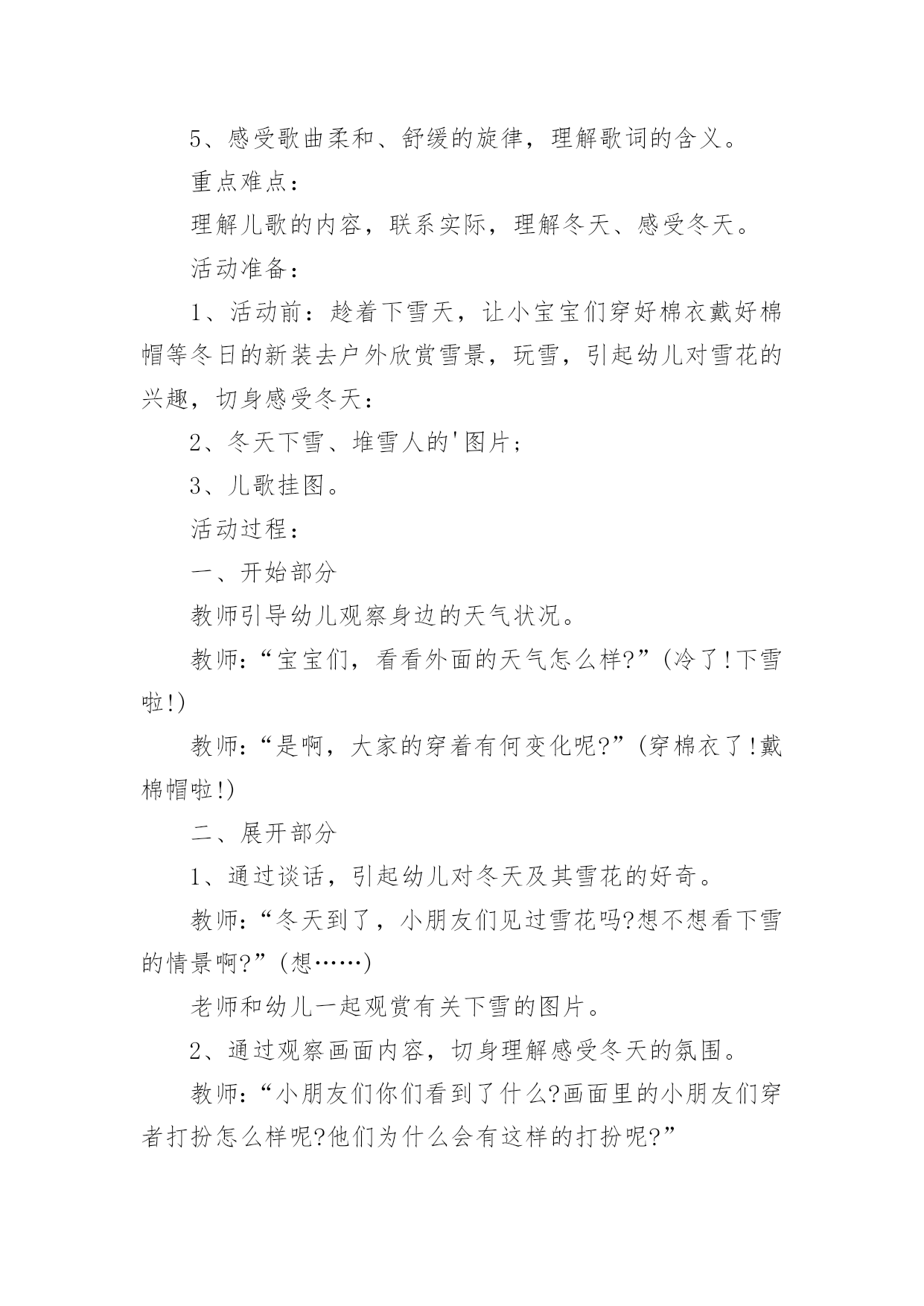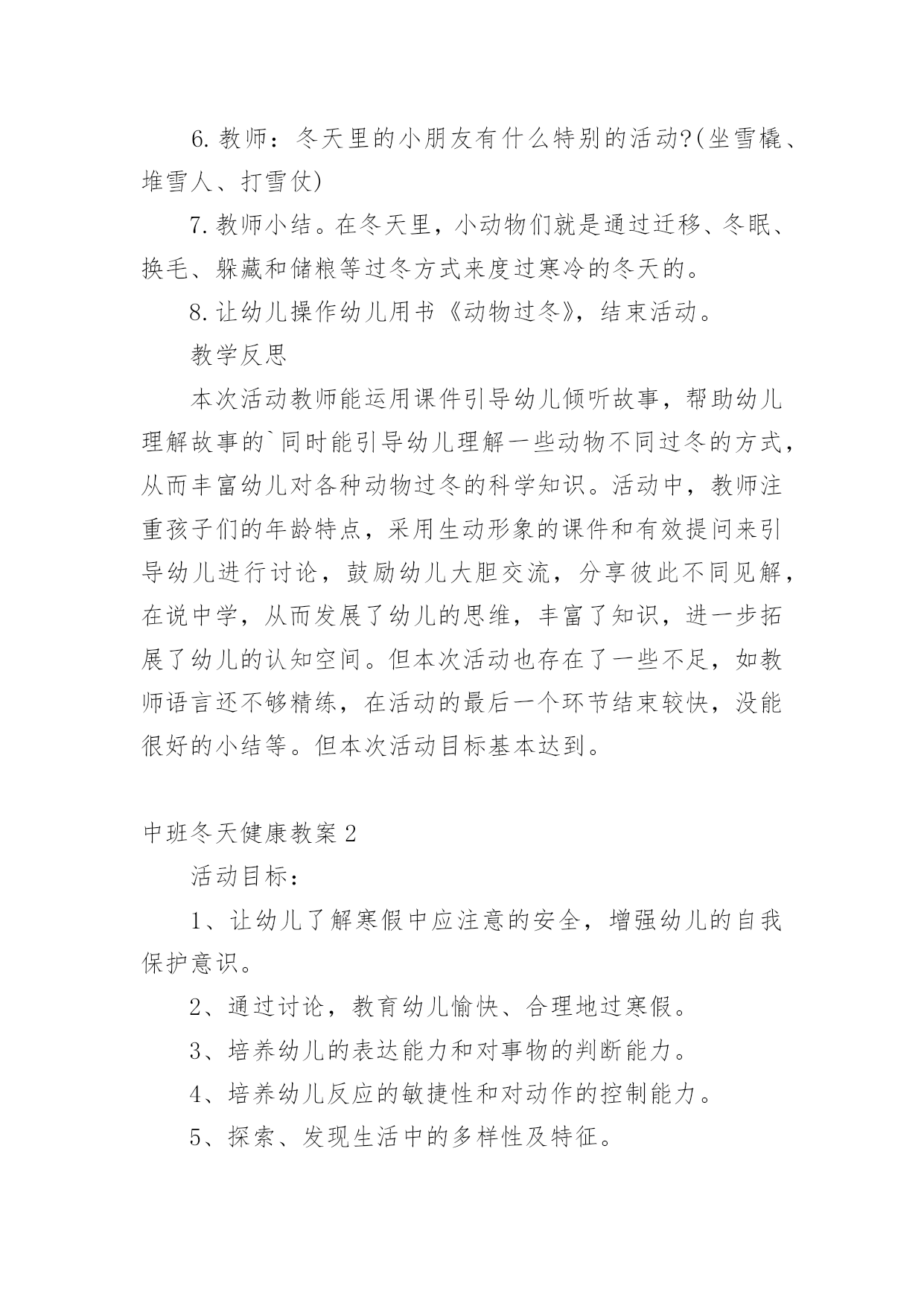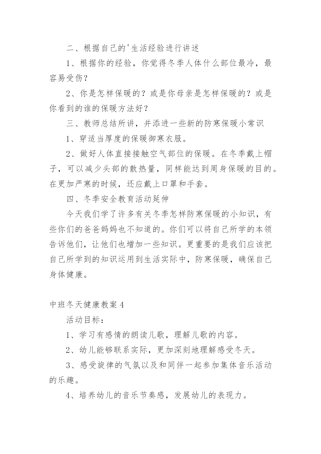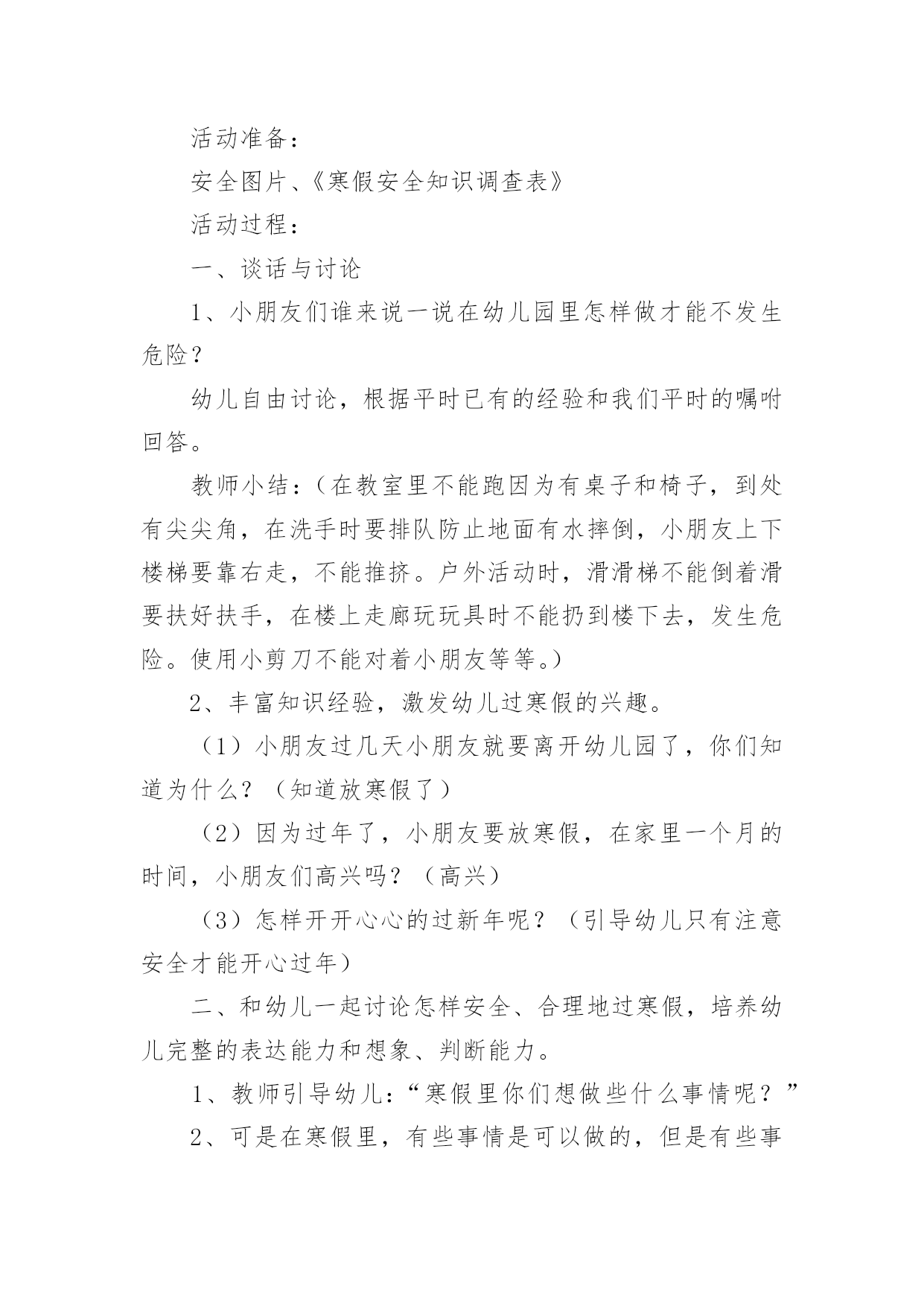 中班冬天健康教案作为一名无私奉献的老师,常常要写一份优秀的教案,教案是保证教学取得成功、提高教学质量的基本条件。那么你有了解过教案吗?下面是小编帮大家整理的中班冬天健康教案,供大家参考借鉴,希望可以帮助到有需要的朋友。中班冬天健康教案1设计背景随着冬天的到来,孩子们发现人们的穿着有所改变的同时也产生许多迷惑:“为什么看不到小蚂蚁出来搬食物?树上的小鸟不见了,它们都到哪去了?”孩子们对动物的生活习性的改变产生了好奇,因此为了顺应幼儿的兴趣需要和发展的需要,我通过活动《冬天是什么》可以让孩子们了解冬天对动物们生活习性产生的影响,以激发幼儿的兴趣和对动物的情感。活动目标1.理解故事《冬天是什么》,感受冬天里的快乐,了解一些动物在冬天里的特别活动。2.理解一些动物不同的过冬方式。3.通过语言表达和动作相结合的形式充分感受故事的童趣。4.能分析故事情节,培养想象力。5.引导幼儿在故事和游戏中学习,感悟生活。重点难点重点:理解故事,感受冬天的快乐。难点:知道动物过冬的几种不同方式。活动准备幼儿用书《动物过冬》,教学课件《冬天是什么》。活动过程1.教师:冬天里我们用什么方法来取暖呢?吃热的东西,戴围巾、戴手套、穿棉袄、戴棉帽,烤火或用取暖器、做运动等方式取暖。2.教师:原来,在寒冷的冬天里我们有好多方法来取暖!但是,小动物们又是怎样度过寒冷的冬天呢?下面我们来听一听、看一看!一、倾听故事《冬天是什么》教师播放故事课件,讲述故事。二、理解故事,交流讨论1.教师:故事的名字叫什么?故事里都有哪些动物?2.教师:冬天,燕子、杜鹃和大雁有什么特别的活动?(飞到温暖的南方—迁移过冬)3.教师:青蛙、小熊和蛇又有什么特别的活动?(美美地睡觉—冬眠)4.教师:松鼠、兔子和绵羊身上出现什么特别的现象?(长出更多更厚的毛御冷—换毛过冬)5.教师:蚂蚁有什么特别的表现?(躲在窝里,不出门—躲藏过冬和储粮过冬)6.教师:冬天里的小朋友有什么特别的活动?(坐雪橇、堆雪人、打雪仗)7.教师小结。在冬天里,小动物们就是通过迁移、冬眠、换毛、躲藏和储粮等过冬方式来度过寒冷的冬天的。8.让幼儿操作幼儿用书《动物过冬》,结束活动。教学反思本次活动教师能运用课件引导幼儿倾听故事,帮助幼儿理解故事的`同时能引导幼儿理解一些动物不同过冬的方式,从而丰富幼儿对各种动物过冬的科学知识。活动中,教师注重孩子们的年龄特点,采用生动形象的课件和有效提问来引导幼儿进行讨论,鼓励幼儿大胆交流,分享彼此不同见解,在说中学,从而发展了幼儿的思维,丰富了知识,进一步拓展了幼儿的认知空间。但本次活动也存在了一些不足,如教师语言还不够精练,在活动的最后一个环节结束较快,没能很好的小结等。但本次活动目标基本达到。中班冬天健康教案2活动目标:1、让幼儿了解寒假中应注意的安全,增强幼儿的自我保护意识。2、通过讨论,教育幼儿愉快、合理地过寒假。3、培养幼儿的表达能力和对事物的判断能力。4、培养幼儿反应的敏捷性和对动作的控制能力。5、探索、发现生活中的多样性及特征。活动准备:安全图片、《寒假安全知识调查表》活动过程:一、谈话与讨论1、小朋友们谁来说一说在幼儿园里怎样做才能不发生危险?幼儿自由讨论,根据平时已有的经验和我们平时的嘱咐回答。教师小结:(在教室里不能跑因为有桌子和椅子,到处有尖尖角,在洗手时要排队防止地面有水摔倒,小朋友上下楼梯要靠右走,不能推挤。户外活动时,滑滑梯不能倒着滑要扶好扶手,在楼上走廊玩玩具时不能扔到楼下去,发生危险。使用小剪刀不能对着小朋友等等。)2、丰富知识经验,激发幼儿过寒假的兴趣。(1)小朋友过几天小朋友就要离开幼儿园了,你们知道为什么?(知道放寒假了)(2)因为过年了,小朋友要放寒假,在家里一个月的时间,小朋友们高兴吗?(高兴)(3)怎样开开心心的过新年呢?(引导幼儿只有注意安全才能开心过年)二、和幼儿一起讨论怎样安全、合理地过寒假,培养幼儿完整的表达能力和想象、判断能力。1、教师引导幼儿:“寒假里你们想做些什么事情呢?”2、可是在寒假里,有些事情是可以做的,但是有些事情是不能做的?引导幼儿说出有关安全知识的内容。请幼儿观看图片说一说(看图片:放鞭炮、陌生敲门、在公路上玩耍、溺水等一些安全图片)(1)讨论在家的安全激发幼儿对家中危险的重视,初步对家中的'危险进行了解:自己在家有陌生人来敲门怎么办?在家里能不能自己插电源?能不能玩火、放鞭炮?能不能在窗台上玩耍?等等(2)讨论外出时的安全除了家中的危险,我们身边和生活中还有许多危险存在着,你知道的危险有哪些?(不能独自去公路上和水边玩耍,在路上遇到陌生人给的东西不能要,在商场里大人走散应该怎样做?)三、请幼儿看图片,找对错请小朋友看一下,这里的小朋友他们做得对不对?四、教师总结寒假里要注意的安全事项。1、过春节时,好吃的东西很多,