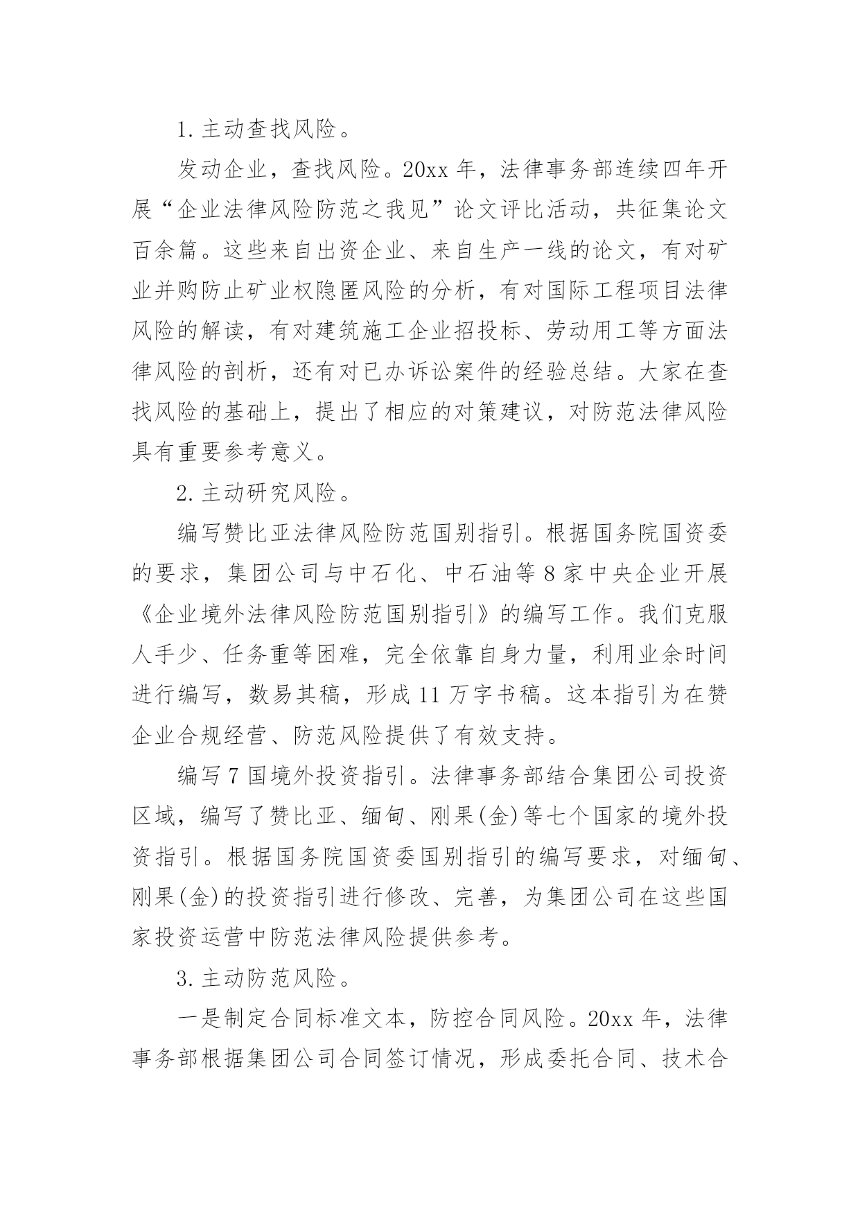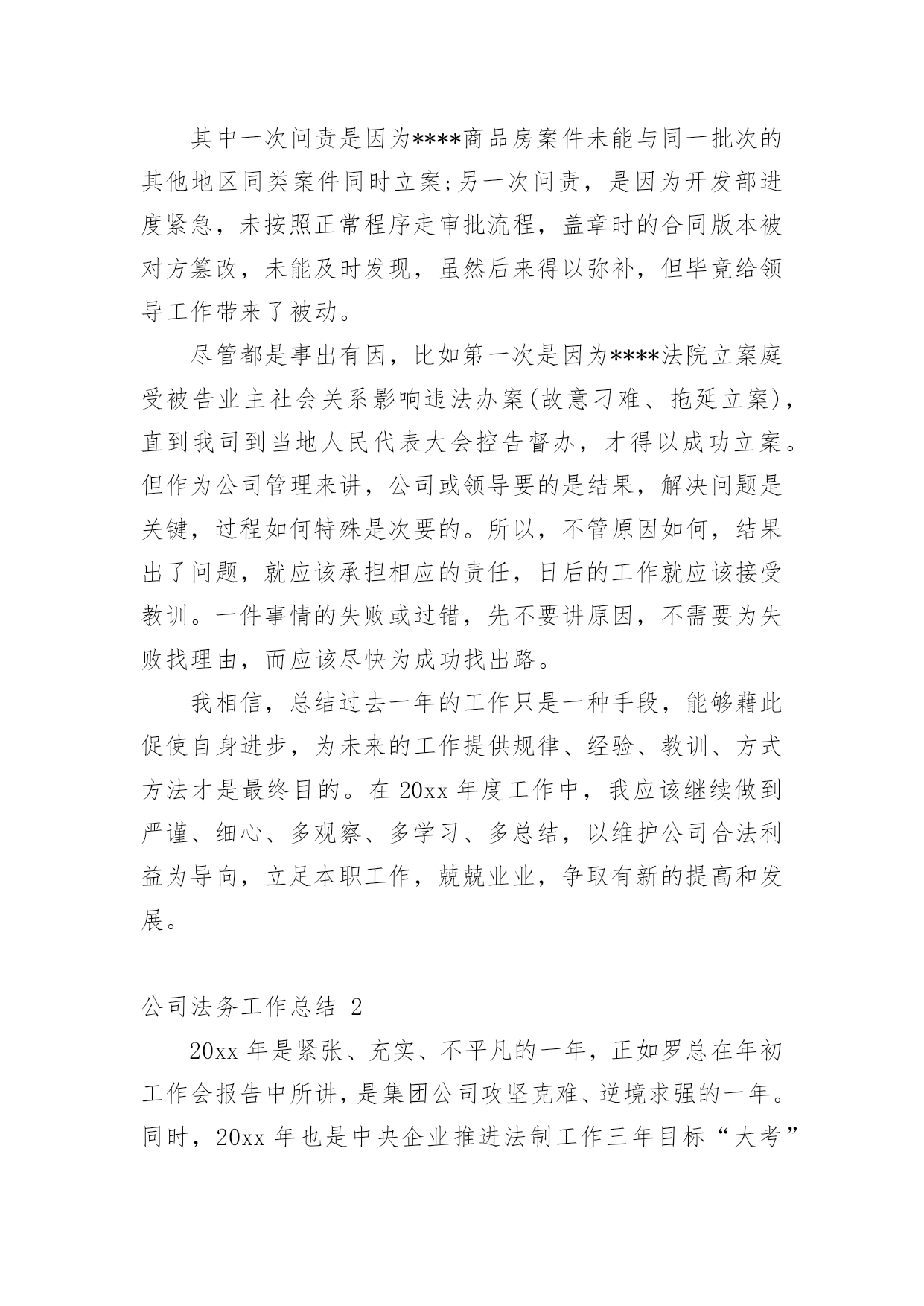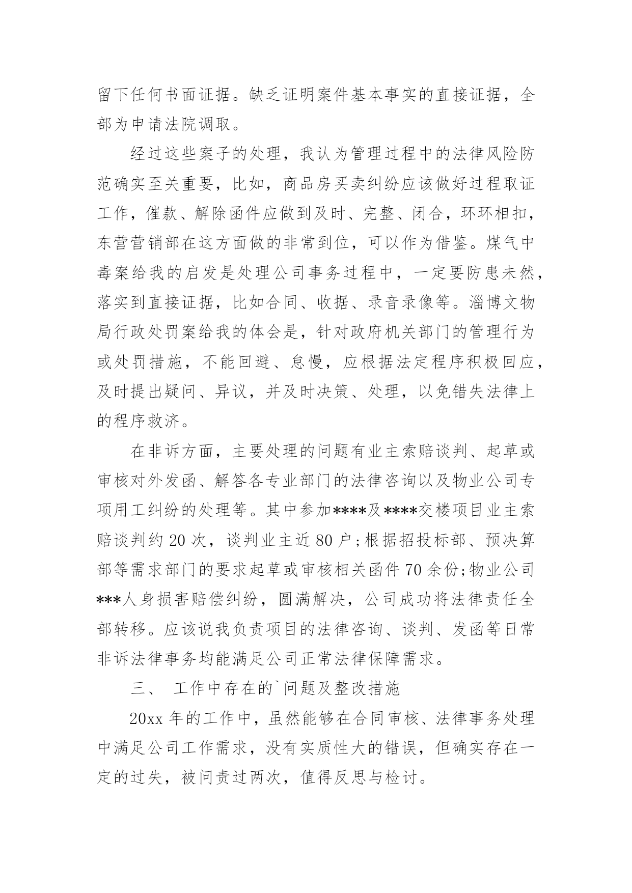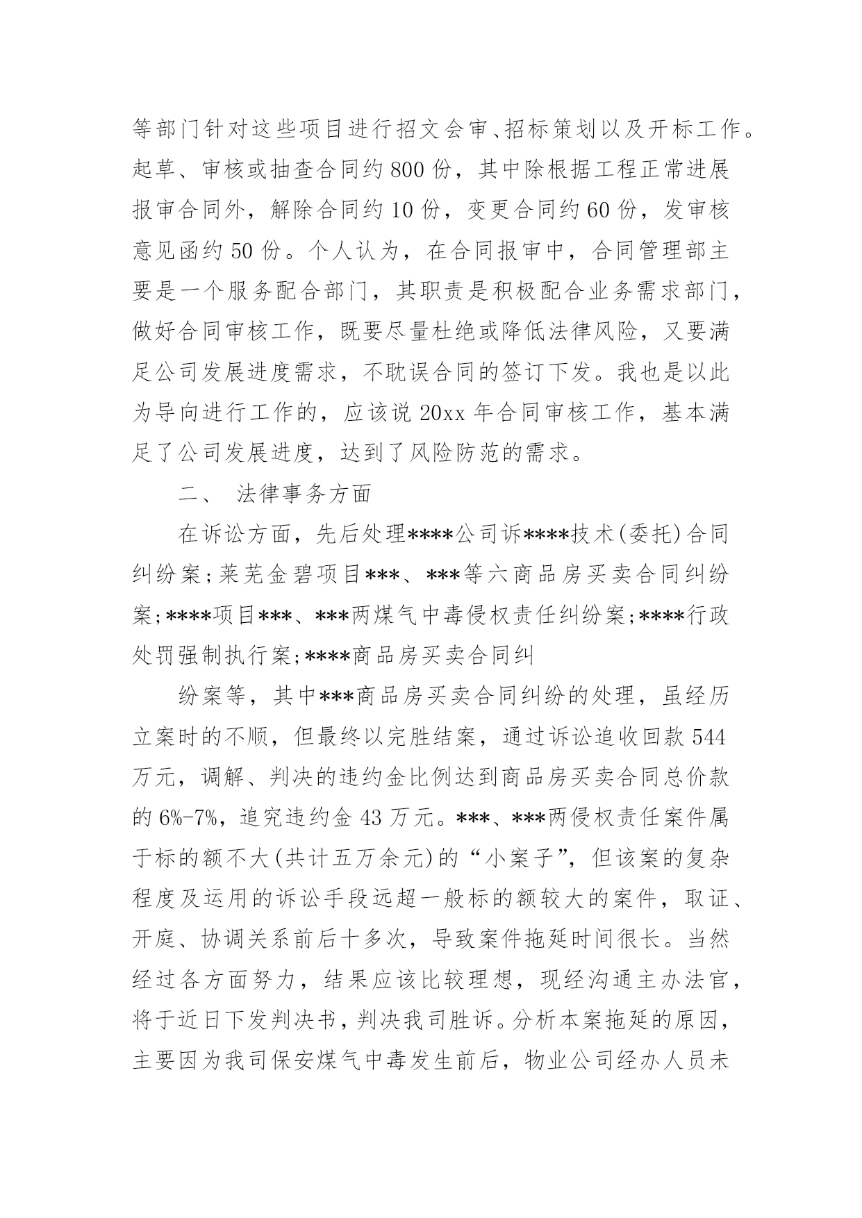 公司法务工作总结总结就是把一个时段的学习、工作或其完成情况进行一次全面系统的总结,它可以帮助我们总结以往思想,发扬成绩,因此,让我们写一份总结吧。但是总结有什么要求呢?以下是小编为大家整理的公司法务工作总结,供大家参考借鉴,希望可以帮助到有需要的朋友。公司法务工作总结120xx年又是公司迅猛发展的一年,无论是内部战斗力,还是外部影响力,均有很大提升,比如房屋销售营业额破****亿再上新台阶,****称雄为国争光,作为公司的一名普通职工,我也很有自豪感。随着年底的临近,***年的工作接近尾声,也到了该对这一年工作进行总结的时候,对比公司的重大成就,总结自身日常工作中的进步与不足,以作为对自己日后工作的加油与鞭策。作为合同管理部的一名普通员工,在领导和同事的帮助下,我自认为在本职工作岗位上做到了勤勉尽责,能够达到工作岗位的职责要求,当然在工作中也存在一定的过失,值得总结教训。一、合同审核方面20xx年我先后负责的合同审核范围包括:***、***、***、***、全过程合同及年度合同的审核以及全部商品房买卖合同的抽查审核工作,并配合招投标部、采购部、营销部等部门针对这些项目进行招文会审、招标策划以及开标工作。起草、审核或抽查合同约800份,其中除根据工程正常进展报审合同外,解除合同约10份,变更合同约60份,发审核意见函约50份。个人认为,在合同报审中,合同管理部主要是一个服务配合部门,其职责是积极配合业务需求部门,做好合同审核工作,既要尽量杜绝或降低法律风险,又要满足公司发展进度需求,不耽误合同的签订下发。我也是以此为导向进行工作的,应该说20xx年合同审核工作,基本满足了公司发展进度,达到了风险防范的需求。二、法律事务方面在诉讼方面,先后处理****公司诉****技术(委托)合同纠纷案;莱芜金碧项目***、***等六商品房买卖合同纠纷案;****项目***、***两煤气中毒侵权责任纠纷案;****行政处罚强制执行案;****商品房买卖合同纠纷案等,其中***商品房买卖合同纠纷的处理,虽经历立案时的不顺,但最终以完胜结案,通过诉讼追收回款544万元,调解、判决的违约金比例达到商品房买卖合同总价款的6%-7%,追究违约金43万元。***、***两侵权责任案件属于标的额不大(共计五万余元)的“小案子”,但该案的复杂程度及运用的诉讼手段远超一般标的额较大的案件,取证、开庭、协调关系前后十多次,导致案件拖延时间很长。当然经过各方面努力,结果应该比较理想,现经沟通主办法官,将于近日下发判决书,判决我司胜诉。分析本案拖延的原因,主要因为我司保安煤气中毒发生前后,物业公司经办人员未留下任何书面证据。缺乏证明案件基本事实的直接证据,全部为申请法院调取。经过这些案子的处理,我认为管理过程中的法律风险防范确实至关重要,比如,商品房买卖纠纷应该做好过程取证工作,催款、解除函件应做到及时、完整、闭合,环环相扣,东营营销部在这方面做的非常到位,可以作为借鉴。煤气中毒案给我的启发是处理公司事务过程中,一定要防患未然,落实到直接证据,比如合同、收据、录音录像等。淄博文物局行政处罚案给我的体会是,针对政府机关部门的管理行为或处罚措施,不能回避、怠慢,应根据法定程序积极回应,及时提出疑问、异议,并及时决策、处理,以免错失法律上的程序救济。在非诉方面,主要处理的问题有业主索赔谈判、起草或审核对外发函、解答各专业部门的法律咨询以及物业公司专项用工纠纷的处理等。其中参加****及****交楼项目业主索赔谈判约20次,谈判业主近80户;根据招投标部、预决算部等需求部门的要求起草或审核相关函件70余份;物业公司***人身损害赔偿纠纷,圆满解决,公司成功将法律责任全部转移。应该说我负责项目的法律咨询、谈判、发函等日常非诉法律事务均能满足公司正常法律保障需求。三、工作中存在的`问题及整改措施20xx年的工作中,虽然能够在合同审核、法律事务处理中满足公司工作需求,没有实质性大的错误,但确实存在一定的过失,被问责过两次,值得反思与检讨。其中一次问责是因为****商品房案件未能与同一批次的其他地区同类案件同时立案;另一次问责,是因为开发部进度紧急,未按照正常程序走审批流程,盖章时的合同版本被对方篡改,未能及时发现,虽然后来得以弥补,但毕竟给领导工作带来了被动。尽管都是事出有因,比如第一次是因为****法院立案庭受被告业主社会关系影响违法办案(故意刁难、拖延立案),直到我司到当地人民代表大会控告督办,才得以成功立案。但作为公司管理来讲,公司或领导要的是结果,解决问题是关键,过程如何特殊是次要的。所以,不管原因如何,结果出了问题,就应该承担相应的责任,日后的工作就应该接受教训。一件事情的失败或过错,先不要讲原因,不需要为失败找理由,而应该尽快为成功找出路。我相信,总结过去一年的工作只