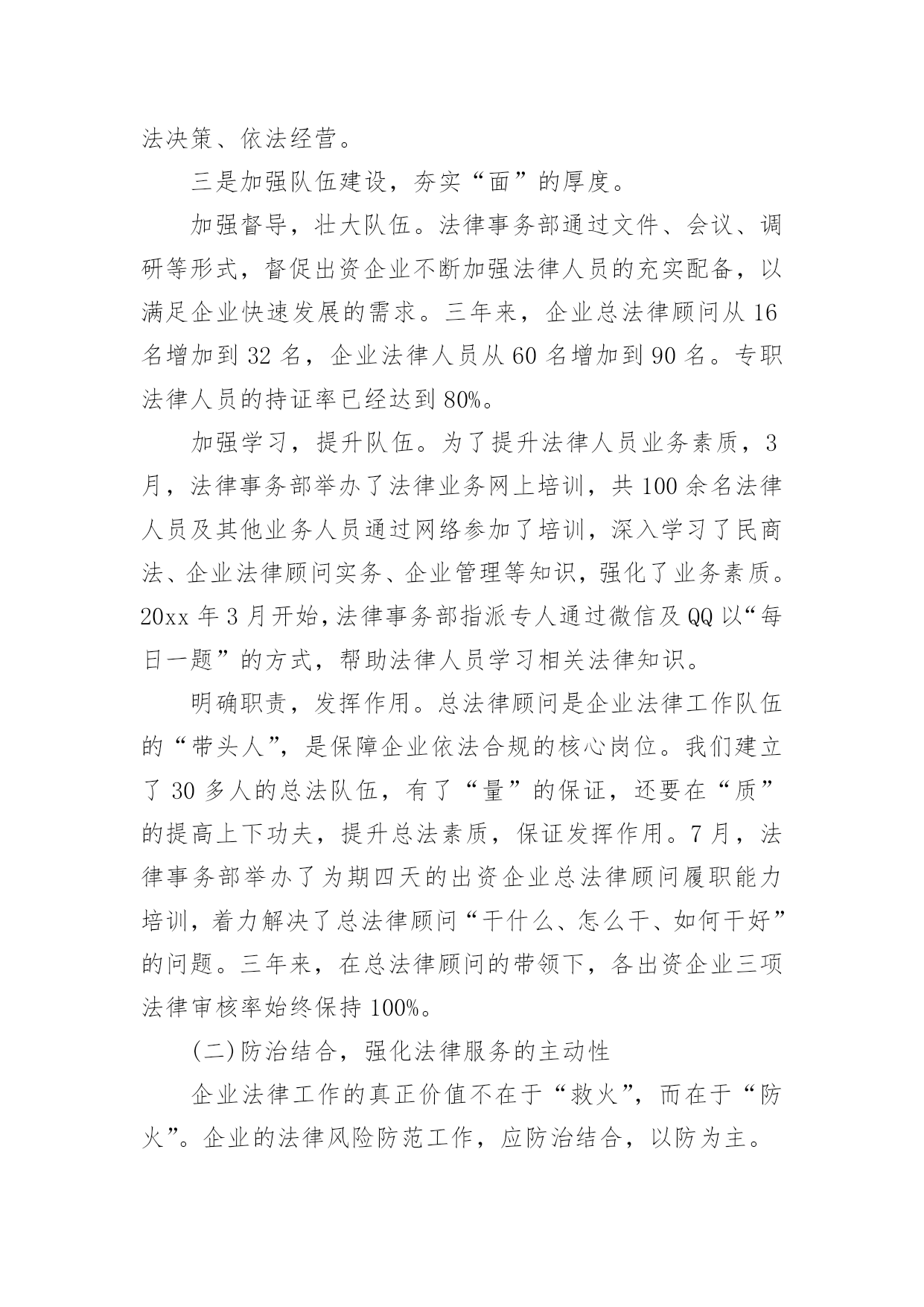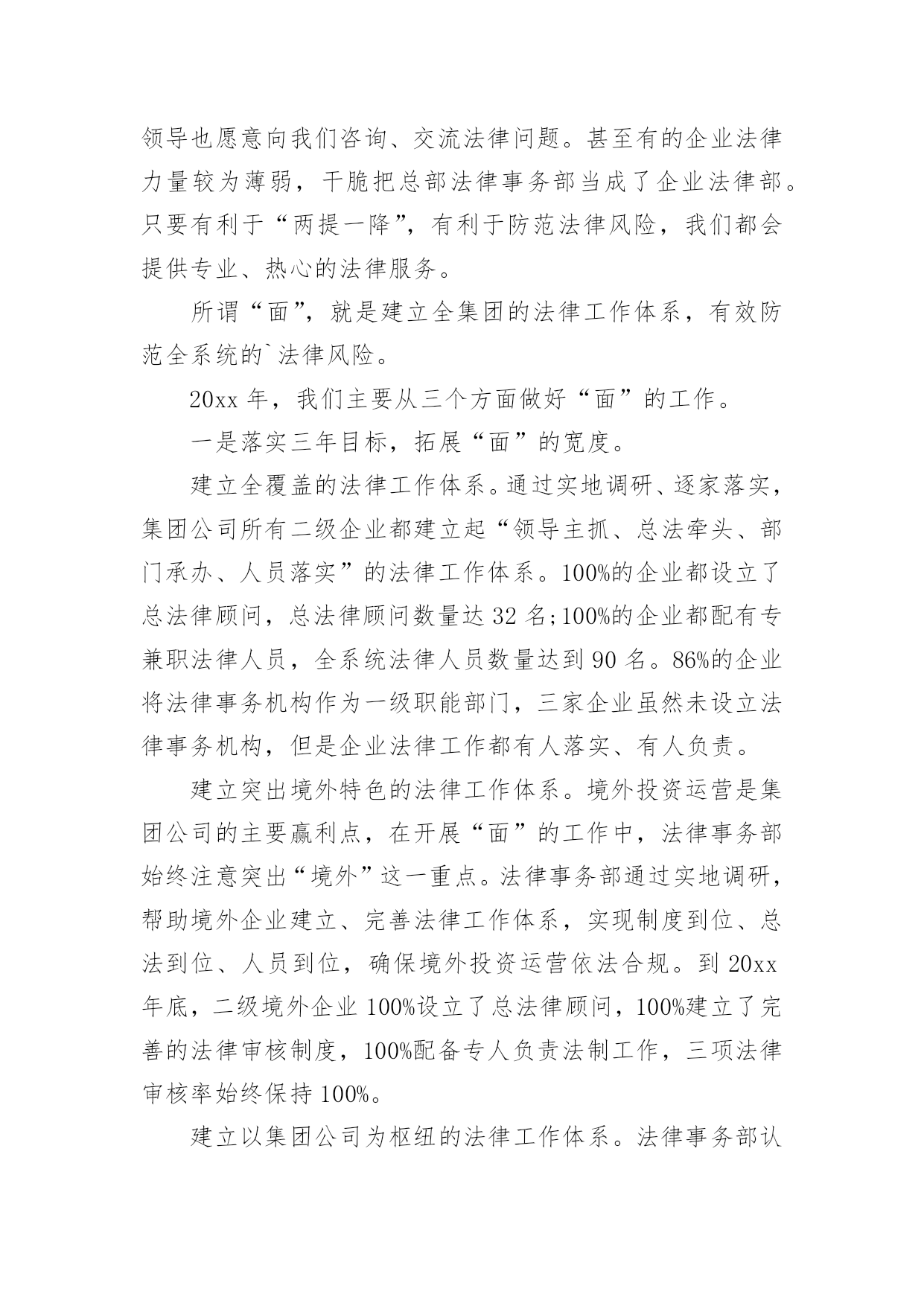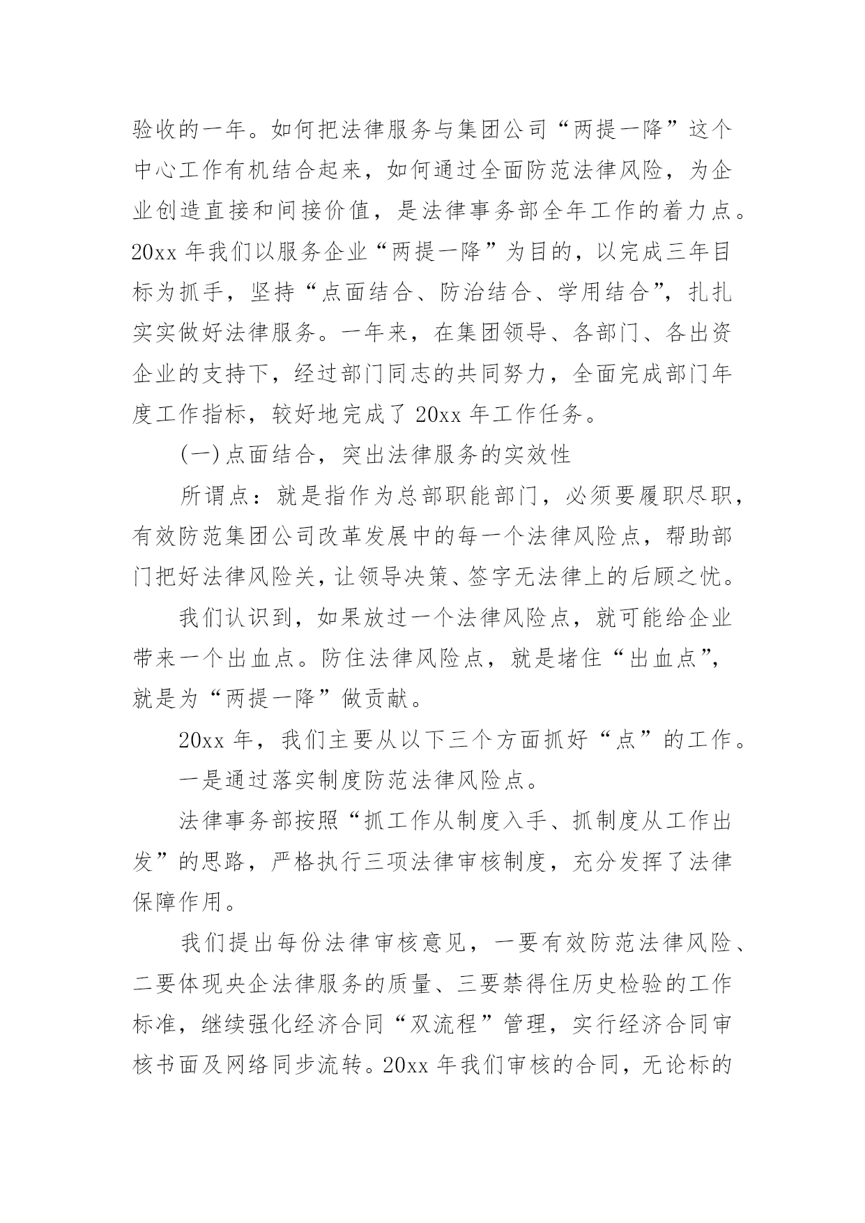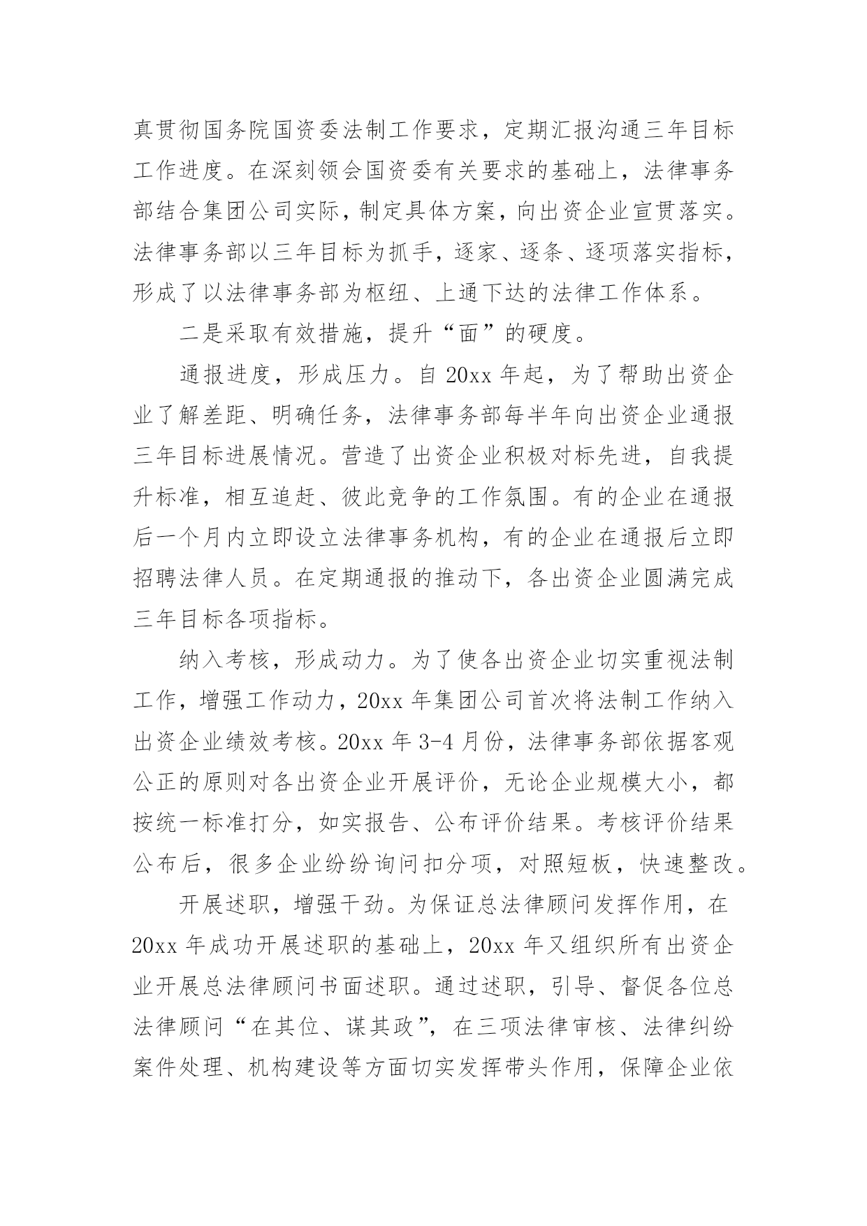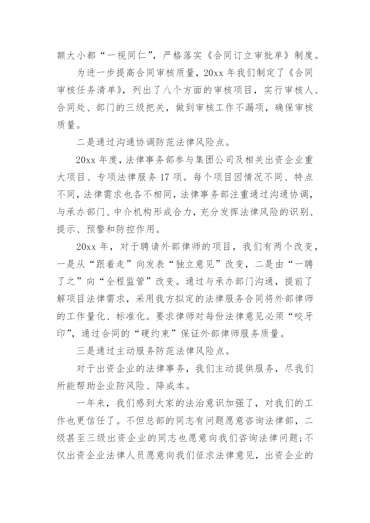 公司法务工作总结总结就是把一个时段的学习、工作或其完成情况进行一次全面系统的总结,它可以帮助我们总结以往思想,发扬成绩,因此,让我们写一份总结吧。但是总结有什么要求呢?以下是小编为大家整理的公司法务工作总结,供大家参考借鉴,希望可以帮助到有需要的朋友。公司法务工作总结120xx年又是公司迅猛发展的一年,无论是内部战斗力,还是外部影响力,均有很大提升,比如房屋销售营业额破****亿再上新台阶,****称雄为国争光,作为公司的一名普通职工,我也很有自豪感。随着年底的临近,***年的工作接近尾声,也到了该对这一年工作进行总结的时候,对比公司的重大成就,总结自身日常工作中的进步与不足,以作为对自己日后工作的加油与鞭策。作为合同管理部的一名普通员工,在领导和同事的帮助下,我自认为在本职工作岗位上做到了勤勉尽责,能够达到工作岗位的职责要求,当然在工作中也存在一定的过失,值得总结教训。一、合同审核方面20xx年我先后负责的合同审核范围包括:***、***、***、***、全过程合同及年度合同的审核以及全部商品房买卖合同的抽查审核工作,并配合招投标部、采购部、营销部等部门针对这些项目进行招文会审、招标策划以及开标工作。起草、审核或抽查合同约800份,其中除根据工程正常进展报审合同外,解除合同约10份,变更合同约60份,发审核意见函约50份。个人认为,在合同报审中,合同管理部主要是一个服务配合部门,其职责是积极配合业务需求部门,做好合同审核工作,既要尽量杜绝或降低法律风险,又要满足公司发展进度需求,不耽误合同的签订下发。我也是以此为导向进行工作的,应该说20xx年合同审核工作,基本满足了公司发展进度,达到了风险防范的需求。二、法律事务方面在诉讼方面,先后处理****公司诉****技术(委托)合同纠纷案;莱芜金碧项目***、***等六商品房买卖合同纠纷案;****项目***、***两煤气中毒侵权责任纠纷案;****行政处罚强制执行案;****商品房买卖合同纠纷案等,其中***商品房买卖合同纠纷的处理,虽经历立案时的不顺,但最终以完胜结案,通过诉讼追收回款544万元,调解、判决的违约金比例达到商品房买卖合同总价款的6%-7%,追究违约金43万元。***、***两侵权责任案件属于标的额不大(共计五万余元)的“小案子”,但该案的复杂程度及运用的诉讼手段远超一般标的额较大的案件,取证、开庭、协调关系前后十多次,导致案件拖延时间很长。当然经过各方面努力,结果应该比较理想,现经沟通主办法官,将于近日下发判决书,判决我司胜诉。分析本案拖延的原因,主要因为我司保安煤气中毒发生前后,物业公司经办人员未留下任何书面证据。缺乏证明案件基本事实的直接证据,全部为申请法院调取。经过这些案子的处理,我认为管理过程中的法律风险防范确实至关重要,比如,商品房买卖纠纷应该做好过程取证工作,催款、解除函件应做到及时、完整、闭合,环环相扣,东营营销部在这方面做的非常到位,可以作为借鉴。煤气中毒案给我的启发是处理公司事务过程中,一定要防患未然,落实到直接证据,比如合同、收据、录音录像等。淄博文物局行政处罚案给我的体会是,针对政府机关部门的管理行为或处罚措施,不能回避、怠慢,应根据法定程序积极回应,及时提出疑问、异议,并及时决策、处理,以免错失法律上的程序救济。在非诉方面,主要处理的问题有业主索赔谈判、起草或审核对外发函、解答各专业部门的法律咨询以及物业公司专项用工纠纷的处理等。其中参加****及****交楼项目业主索赔谈判约20次,谈判业主近80户;根据招投标部、预决算部等需求部门的要求起草或审核相关函件70余份;物业公司***人身损害赔偿纠纷,圆满解决,公司成功将法律责任全部转移。应该说我负责项目的法律咨询、谈判、发函等日常非诉法律事务均能满足公司正常法律保障需求。三、工作中存在的`问题及整改措施20xx年的工作中,虽然能够在合同审核、法律事务处理中满足公司工作需求,没有实质性大的错误,但确实存在一定的过失,被问责过两次,值得反思与检讨。其中一次问责是因为****商品房案件未能与同一批次的其他地区同类案件同时立案;另一次问责,是因为开发部进度紧急,未按照正常程序走审批流程,盖章时的合同版本被对方篡改,未能及时发现,虽然后来得以弥补,但毕竟给领导工作带来了被动。尽管都是事出有因,比如第一次是因为****法院立案庭受被告业主社会关系影响违法办案(故意刁难、拖延立案),直到我司到当地人民代表大会控告督办,才得以成功立案。但作为公司管理来讲,公司或领导要的是结果,解决问题是关键,过程如何特殊是次要的。所以,不管原因如何,结果出了问题,就应该承担相应的责任,日后的工作就应该接受教训。一件事情的失败或过错,先不要讲原因,不需要为失败找理由,而应该尽快为成功找出路。我相信,总结过去一年的工作只
