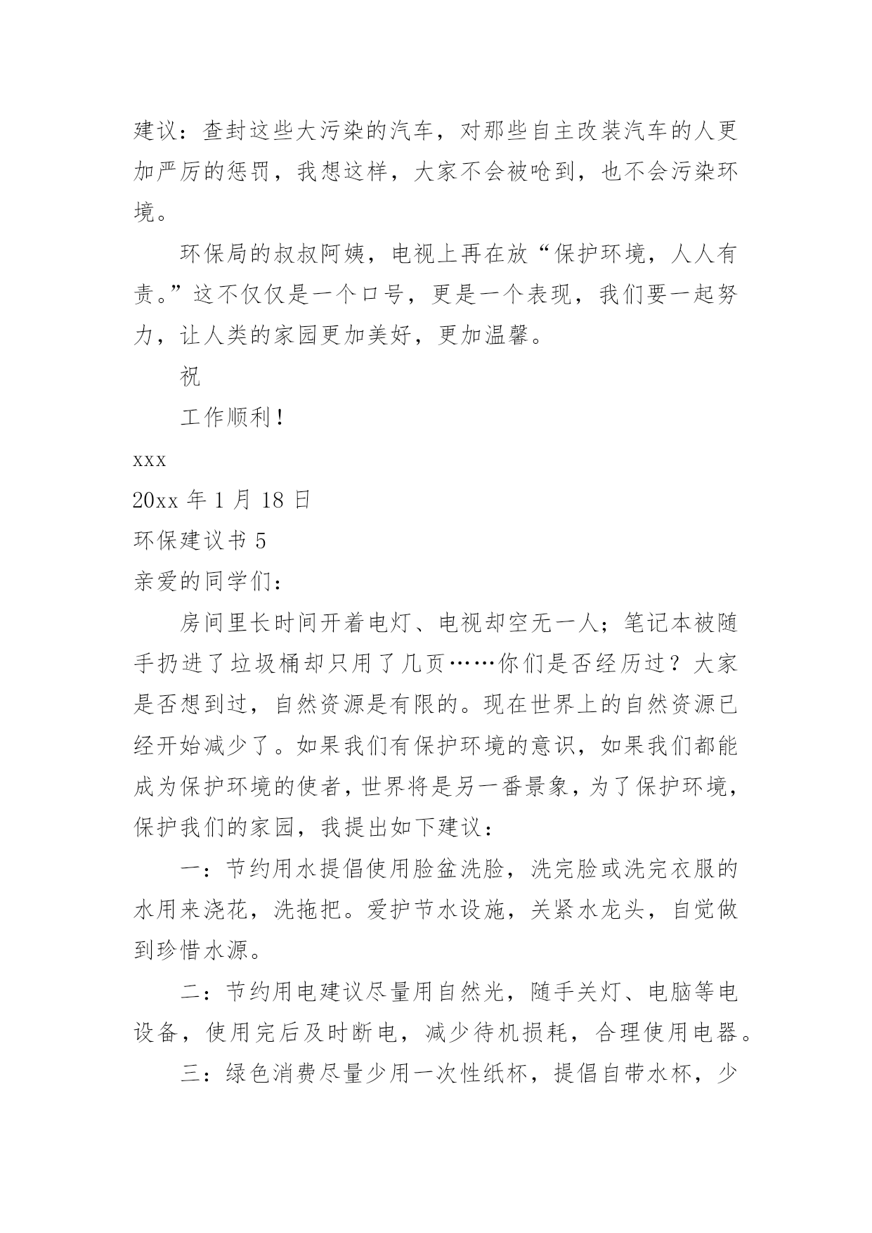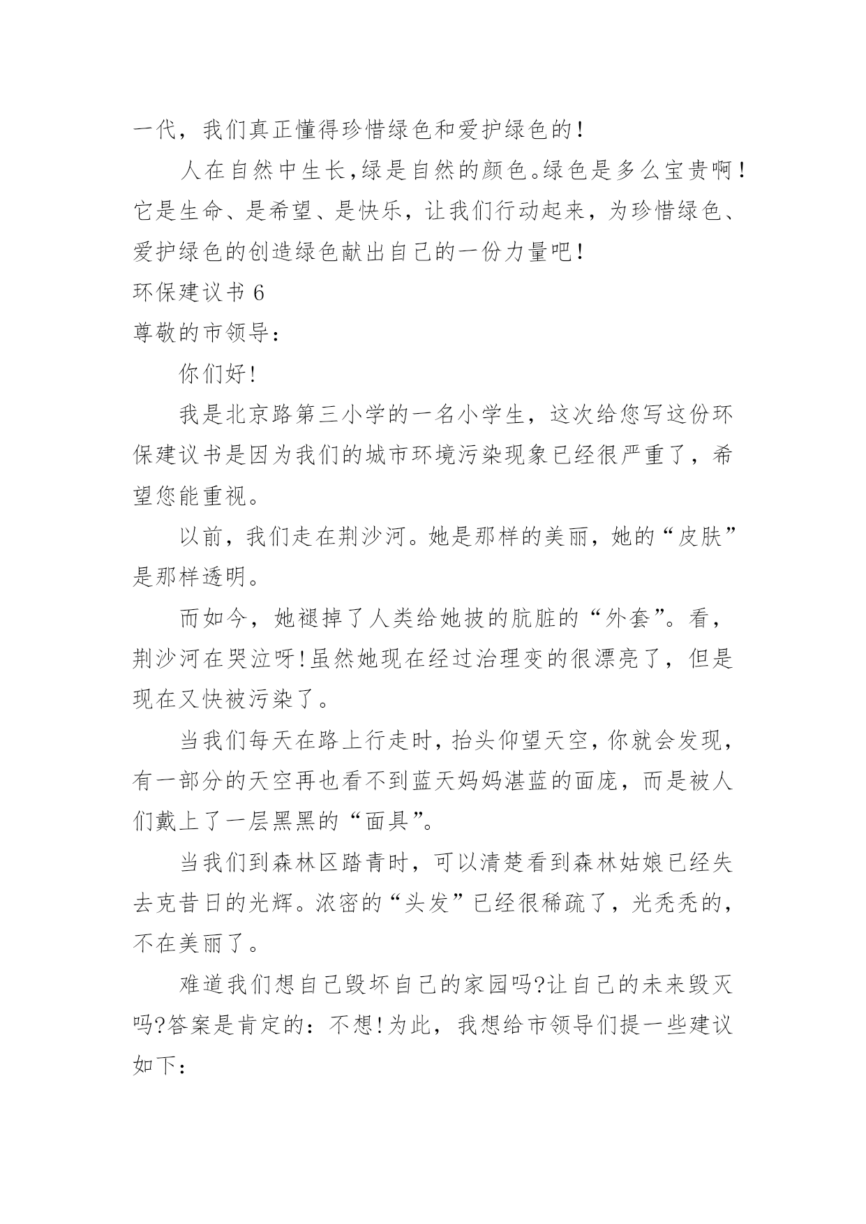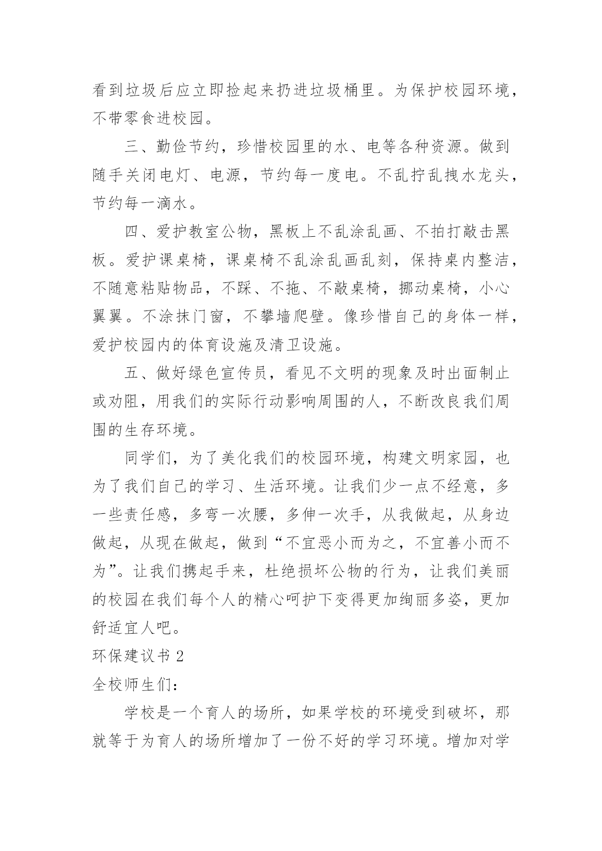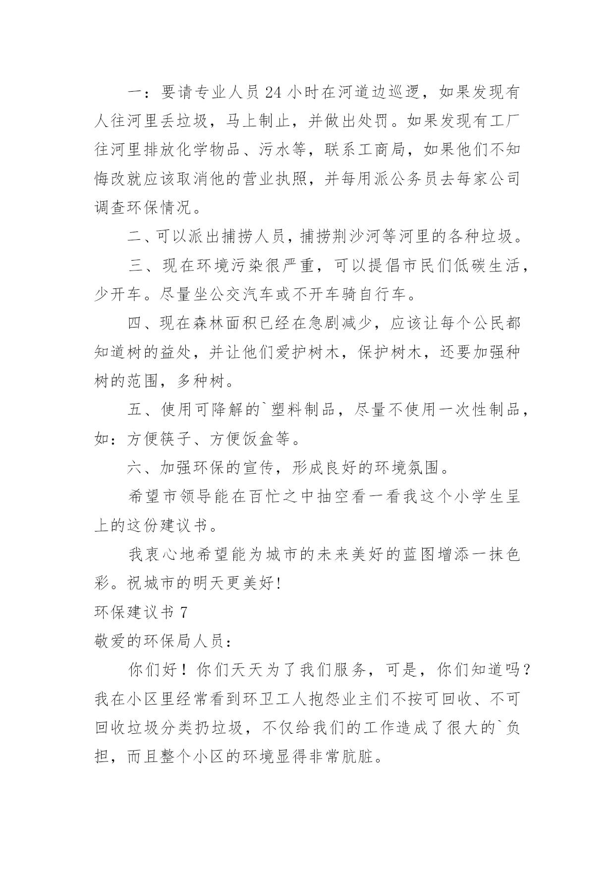环保建议书(推荐)环保建议书现如今,很多地方都会使用到建议书,建议书是单位或集体向有关单位或上级机关和领导,就某项工作提出某种建议时使用的一种常用书信。大家知道建议书的格式吗?以下是小编为大家整理的环保建议书,欢迎大家分享。环保建议书1亲爱的同学们:当走进东风小学的校园,你一定感受到了它的洁净、整齐。虽然没有鲜花的装点,没有绿叶的陪衬,但整体布局同样多姿多彩,清洁有序,既优美又舒适。但近来我们的校园在哭泣,楼道在落泪。因为有的同学随意破坏公物,有的`同学在地上乱扔果皮纸屑瓜子壳,有的同学在楼道墙壁上乱写乱画……我们美丽的活动环境需要大家共同去营造,文明习惯要靠我们一点一滴去做起。为此向全体队员发出如下倡议:请伸出你的手和我们一道共创美丽校园。一、树立绿色文明的观念,自觉关心学校的环境状况,把个人环保行为作为个人文明修养的重要组成部分。二、爱护校园环境,不做破坏校园环境的事,对破坏校园环境的行为敢于出面劝阻。养成良好的卫生习惯,不随意吐痰,不随意乱丢乱扔果皮纸屑瓜子壳。管住自己的手不乱扔、不乱画,管住自己的嘴不乱吐,管住自己的脚不乱踩。看到垃圾后应立即捡起来扔进垃圾桶里。为保护校园环境,不带零食进校园。三、勤俭节约,珍惜校园里的水、电等各种资源。做到随手关闭电灯、电源,节约每一度电。不乱拧乱拽水龙头,节约每一滴水。四、爱护教室公物,黑板上不乱涂乱画、不拍打敲击黑板。爱护课桌椅,课桌椅不乱涂乱画乱刻,保持桌内整洁,不随意粘贴物品,不踩、不拖、不敲桌椅,挪动桌椅,小心翼翼。不涂抹门窗,不攀墙爬壁。像珍惜自己的身体一样,爱护校园内的体育设施及清卫设施。五、做好绿色宣传员,看见不文明的现象及时出面制止或劝阻,用我们的实际行动影响周围的人,不断改良我们周围的生存环境。同学们,为了美化我们的校园环境,构建文明家园,也为了我们自己的学习、生活环境。让我们少一点不经意,多一些责任感,多弯一次腰,多伸一次手,从我做起,从身边做起,从现在做起,做到“不宜恶小而为之,不宜善小而不为”。让我们携起手来,杜绝损坏公物的行为,让我们美丽的校园在我们每个人的精心呵护下变得更加绚丽多姿,更加舒适宜人吧。环保建议书2全校师生们:学校是一个育人的场所,如果学校的环境受到破坏,那就等于为育人的场所增加了一份不好的学习环境。增加对学校的环保是一个小学生应有的思想品德,所以我为全校师生提出以下建议:1、在光线充足的教室里,不要开电灯;如从阴天转晴天后应立刻把灯闭闭,避免“白昼灯”、“长明灯”等现象。2、在校园内不应当到校外购买小零食,吃过小零食后,又将零食的包装袋丢弃在校园内,为学校的值日生增加了许多负担。3、在水房用完水后,一定要关紧水龙头,如果一个没有关紧的水龙头一个月会浪费1—3吨水。4、不应该破坏学校的板报,不采摘学校的`一草一木,不随地吐痰。5、不在校园内乱涂乱画。以上是我对大家提出的学校环保建议,让我们各自出一份力,共同来保护校园的环境吧!建议人:xx20xx年11月15日环保建议书3敬爱的市环保局局长:您好!地球是我们人类的母亲,也是我们唯一可以赖以生存的地方。她给我们生存,给我们资源。可是,现在我们正在破坏我们和蔼可亲的地球,例如:大量砍伐树木、建立化工厂、大量排放污水和黑烟、大量使用不可降解的白色垃圾、大量排放汽车尾气……这些危害注意危害整个地球,如果我们在不环保的话,就会像电影“20xx”的场面一样,洪水淹没喜马拉雅山的山顶,整座大城市瞬间被洪水吞没。作文如果我们不想让悲剧发生,让我们城市更美丽的话,我建议:1.我们要做到讲究卫生,不能随地吐痰,不乱扔垃圾,不在公共场所吸烟,不制造噪音。2.我们要保护自然环境,那样万物才能共同生存在一个美好的家园。不乱猎杀动物、不乱抓珍稀动物和受保护的动物,关爱和保护野生动植物;爱护我们身边的.每一寸绿地、每一株花草、每一片树木!3.减少汽车尾气排放,以汽车牌的尾号为单日或双日可以行车,单数为单日可以开车,双数为双日可以开车,单日的星期日要骑直行车去公司。4.不使用不可降解的一次性饭盒、塑料袋等白色垃圾。要使用可降解的一次性饭盒,这样才可以回收利用饭盒。塑料袋改为使用环保的袋子,例如:布做成的环保袋。5.减少化工厂的黑气排放和污水排放,污水可以变成清水,然后再输到附近的洗车场盔行多次利用再清掉。用太阳能来烧废掉的东西这样可以减少黑气。希望局长能提用我的建议。祝:工作顺利。xxx20xx年xx月xx日环保建议书4尊敬的卫生局的叔叔阿姨:你们好!我是一名镇海区中心学校六(2)班的学生。我们现在所住的城市虽然丰衣足食,但是我们生边的环境在不断的恶化,为了使我们所住的城市能更加美丽,我希望你们能在工作中抽空听一听一位孩子的意见。现在我住的城市是素有“浙东门户”“海天雄镇”等称的——宁波市镇海区。这里有一条历史悠久的江——