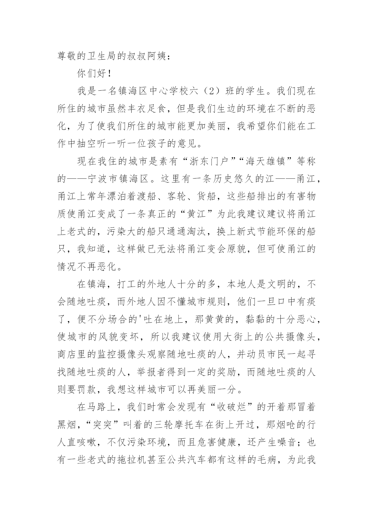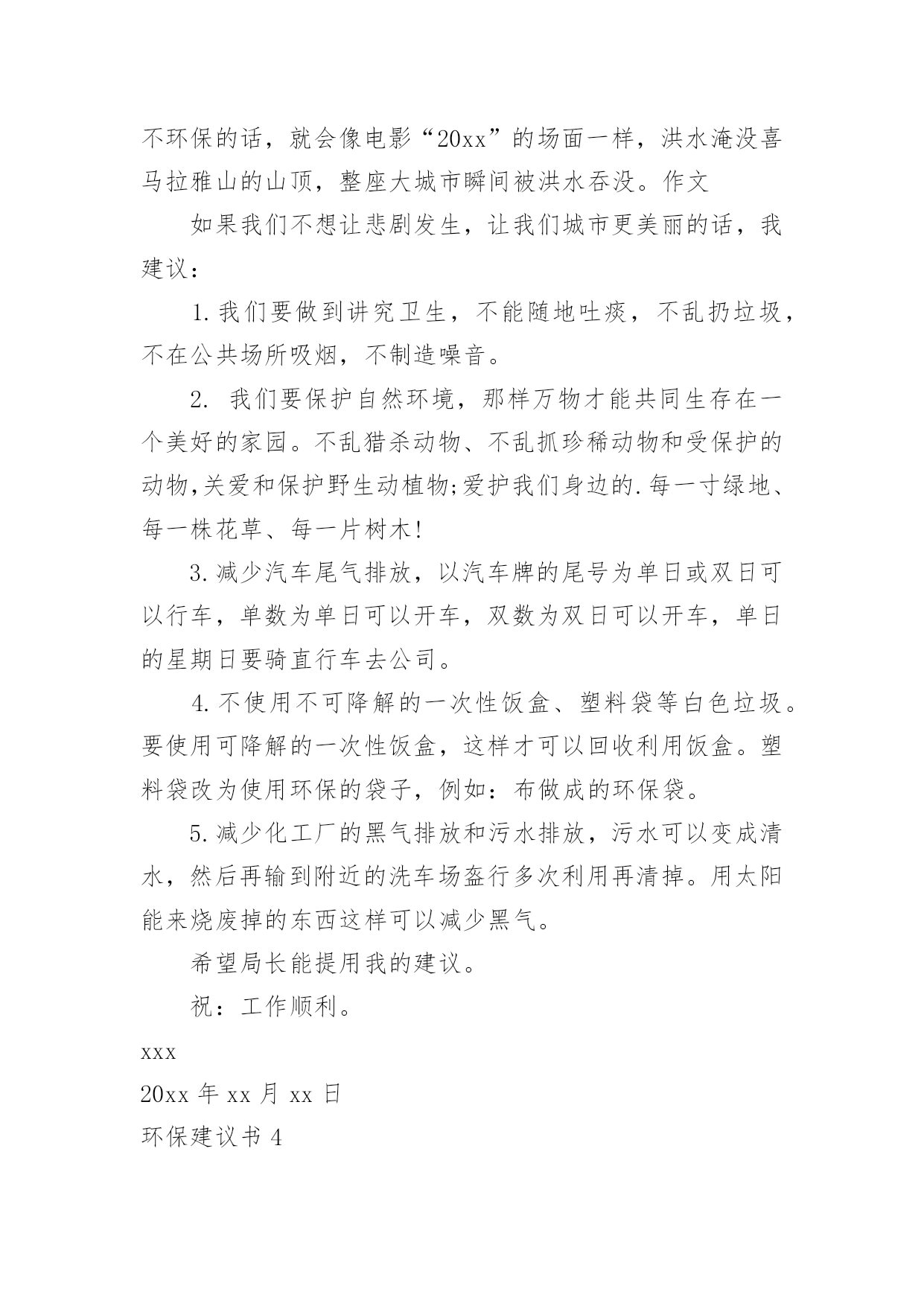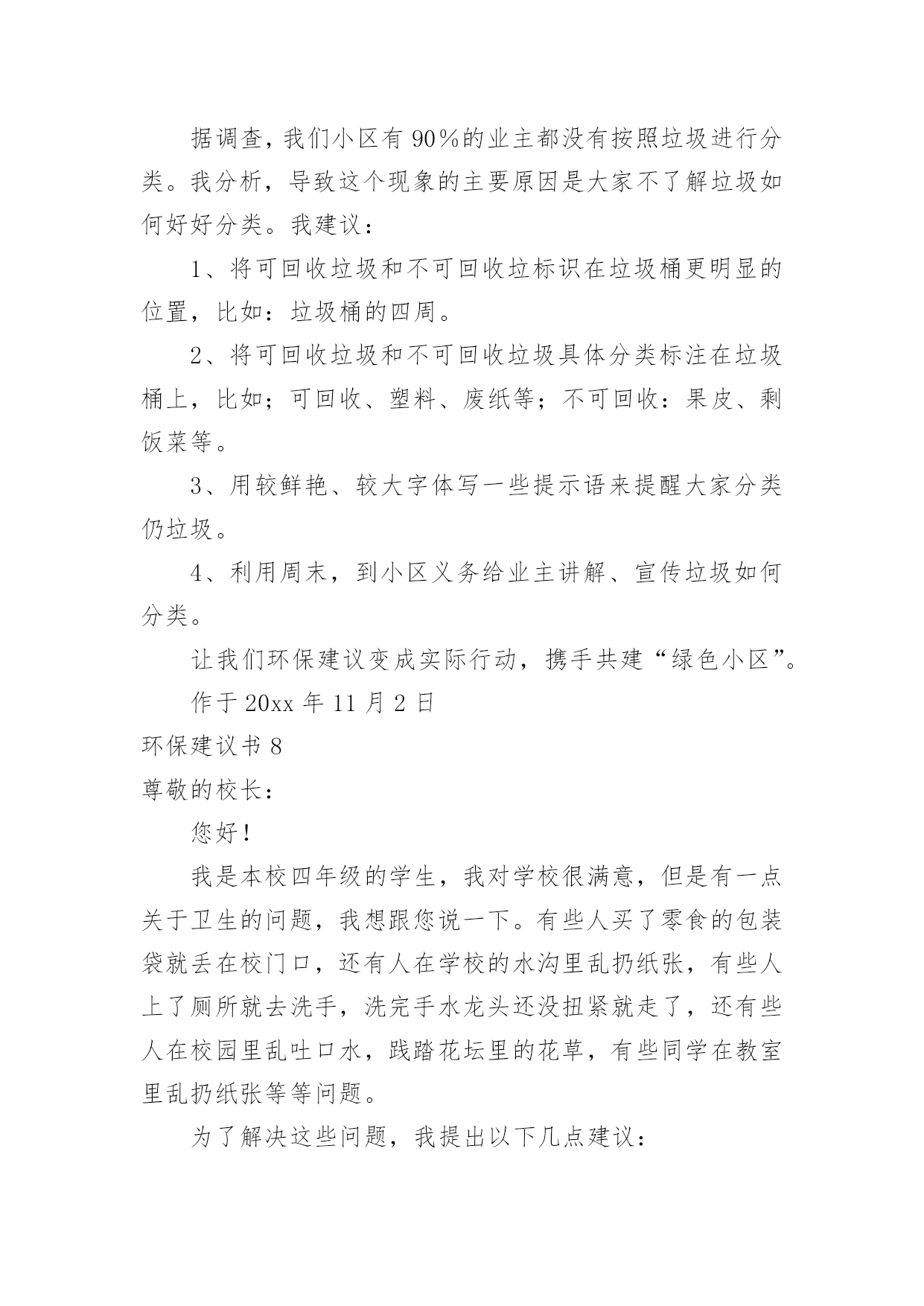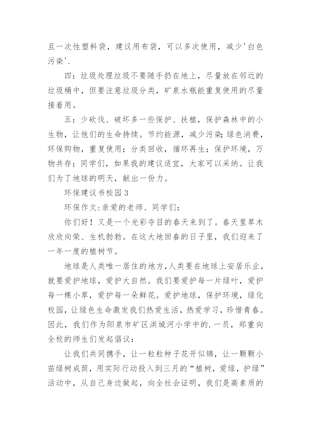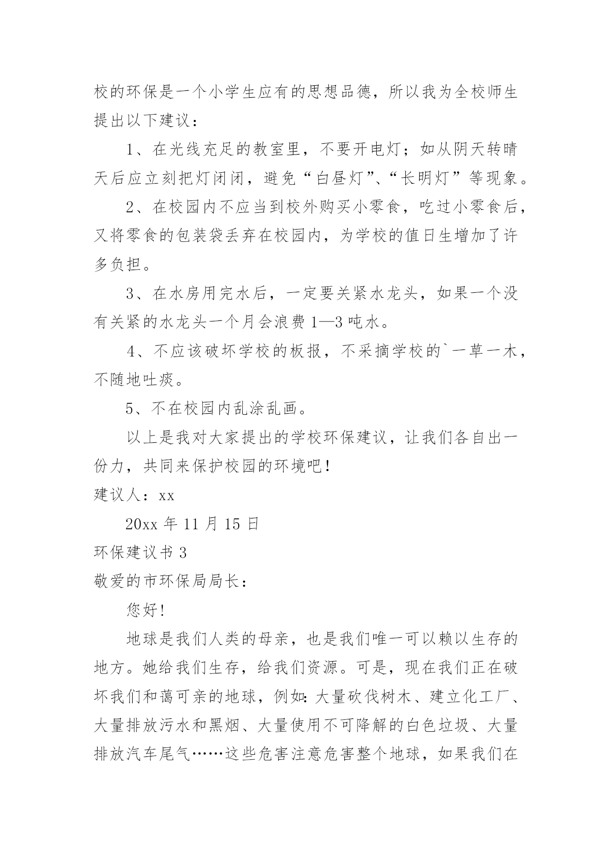 环保建议书(推荐)环保建议书现如今,很多地方都会使用到建议书,建议书是单位或集体向有关单位或上级机关和领导,就某项工作提出某种建议时使用的一种常用书信。大家知道建议书的格式吗?以下是小编为大家整理的环保建议书,欢迎大家分享。环保建议书1亲爱的同学们:当走进东风小学的校园,你一定感受到了它的洁净、整齐。虽然没有鲜花的装点,没有绿叶的陪衬,但整体布局同样多姿多彩,清洁有序,既优美又舒适。但近来我们的校园在哭泣,楼道在落泪。因为有的同学随意破坏公物,有的`同学在地上乱扔果皮纸屑瓜子壳,有的同学在楼道墙壁上乱写乱画……我们美丽的活动环境需要大家共同去营造,文明习惯要靠我们一点一滴去做起。为此向全体队员发出如下倡议:请伸出你的手和我们一道共创美丽校园。一、树立绿色文明的观念,自觉关心学校的环境状况,把个人环保行为作为个人文明修养的重要组成部分。二、爱护校园环境,不做破坏校园环境的事,对破坏校园环境的行为敢于出面劝阻。养成良好的卫生习惯,不随意吐痰,不随意乱丢乱扔果皮纸屑瓜子壳。管住自己的手不乱扔、不乱画,管住自己的嘴不乱吐,管住自己的脚不乱踩。看到垃圾后应立即捡起来扔进垃圾桶里。为保护校园环境,不带零食进校园。三、勤俭节约,珍惜校园里的水、电等各种资源。做到随手关闭电灯、电源,节约每一度电。不乱拧乱拽水龙头,节约每一滴水。四、爱护教室公物,黑板上不乱涂乱画、不拍打敲击黑板。爱护课桌椅,课桌椅不乱涂乱画乱刻,保持桌内整洁,不随意粘贴物品,不踩、不拖、不敲桌椅,挪动桌椅,小心翼翼。不涂抹门窗,不攀墙爬壁。像珍惜自己的身体一样,爱护校园内的体育设施及清卫设施。五、做好绿色宣传员,看见不文明的现象及时出面制止或劝阻,用我们的实际行动影响周围的人,不断改良我们周围的生存环境。同学们,为了美化我们的校园环境,构建文明家园,也为了我们自己的学习、生活环境。让我们少一点不经意,多一些责任感,多弯一次腰,多伸一次手,从我做起,从身边做起,从现在做起,做到“不宜恶小而为之,不宜善小而不为”。让我们携起手来,杜绝损坏公物的行为,让我们美丽的校园在我们每个人的精心呵护下变得更加绚丽多姿,更加舒适宜人吧。环保建议书2全校师生们:学校是一个育人的场所,如果学校的环境受到破坏,那就等于为育人的场所增加了一份不好的学习环境。增加对学校的环保是一个小学生应有的思想品德,所以我为全校师生提出以下建议:1、在光线充足的教室里,不要开电灯;如从阴天转晴天后应立刻把灯闭闭,避免“白昼灯”、“长明灯”等现象。2、在校园内不应当到校外购买小零食,吃过小零食后,又将零食的包装袋丢弃在校园内,为学校的值日生增加了许多负担。3、在水房用完水后,一定要关紧水龙头,如果一个没有关紧的水龙头一个月会浪费1—3吨水。4、不应该破坏学校的板报,不采摘学校的`一草一木,不随地吐痰。5、不在校园内乱涂乱画。以上是我对大家提出的学校环保建议,让我们各自出一份力,共同来保护校园的环境吧!建议人:xx20xx年11月15日环保建议书3敬爱的市环保局局长:您好!地球是我们人类的母亲,也是我们唯一可以赖以生存的地方。她给我们生存,给我们资源。可是,现在我们正在破坏我们和蔼可亲的地球,例如:大量砍伐树木、建立化工厂、大量排放污水和黑烟、大量使用不可降解的白色垃圾、大量排放汽车尾气……这些危害注意危害整个地球,如果我们在不环保的话,就会像电影“20xx”的场面一样,洪水淹没喜马拉雅山的山顶,整座大城市瞬间被洪水吞没。作文如果我们不想让悲剧发生,让我们城市更美丽的话,我建议:1.我们要做到讲究卫生,不能随地吐痰,不乱扔垃圾,不在公共场所吸烟,不制造噪音。2.我们要保护自然环境,那样万物才能共同生存在一个美好的家园。不乱猎杀动物、不乱抓珍稀动物和受保护的动物,关爱和保护野生动植物;爱护我们身边的.每一寸绿地、每一株花草、每一片树木!3.减少汽车尾气排放,以汽车牌的尾号为单日或双日可以行车,单数为单日可以开车,双数为双日可以开车,单日的星期日要骑直行车去公司。4.不使用不可降解的一次性饭盒、塑料袋等白色垃圾。要使用可降解的一次性饭盒,这样才可以回收利用饭盒。塑料袋改为使用环保的袋子,例如:布做成的环保袋。5.减少化工厂的黑气排放和污水排放,污水可以变成清水,然后再输到附近的洗车场盔行多次利用再清掉。用太阳能来烧废掉的东西这样可以减少黑气。希望局长能提用我的建议。祝:工作顺利。xxx20xx年xx月xx日环保建议书4尊敬的卫生局的叔叔阿姨:你们好!我是一名镇海区中心学校六(2)班的学生。我们现在所住的城市虽然丰衣足食,但是我们生边的环境在不断的恶化,为了使我们所住的城市能更加美丽,我希望你们能在工作中抽空听一听一位孩子的意见。现在我住的城市是素有“浙东门户”“海天雄镇”等称的——宁波市镇海区。这里有一条历史悠久的江——