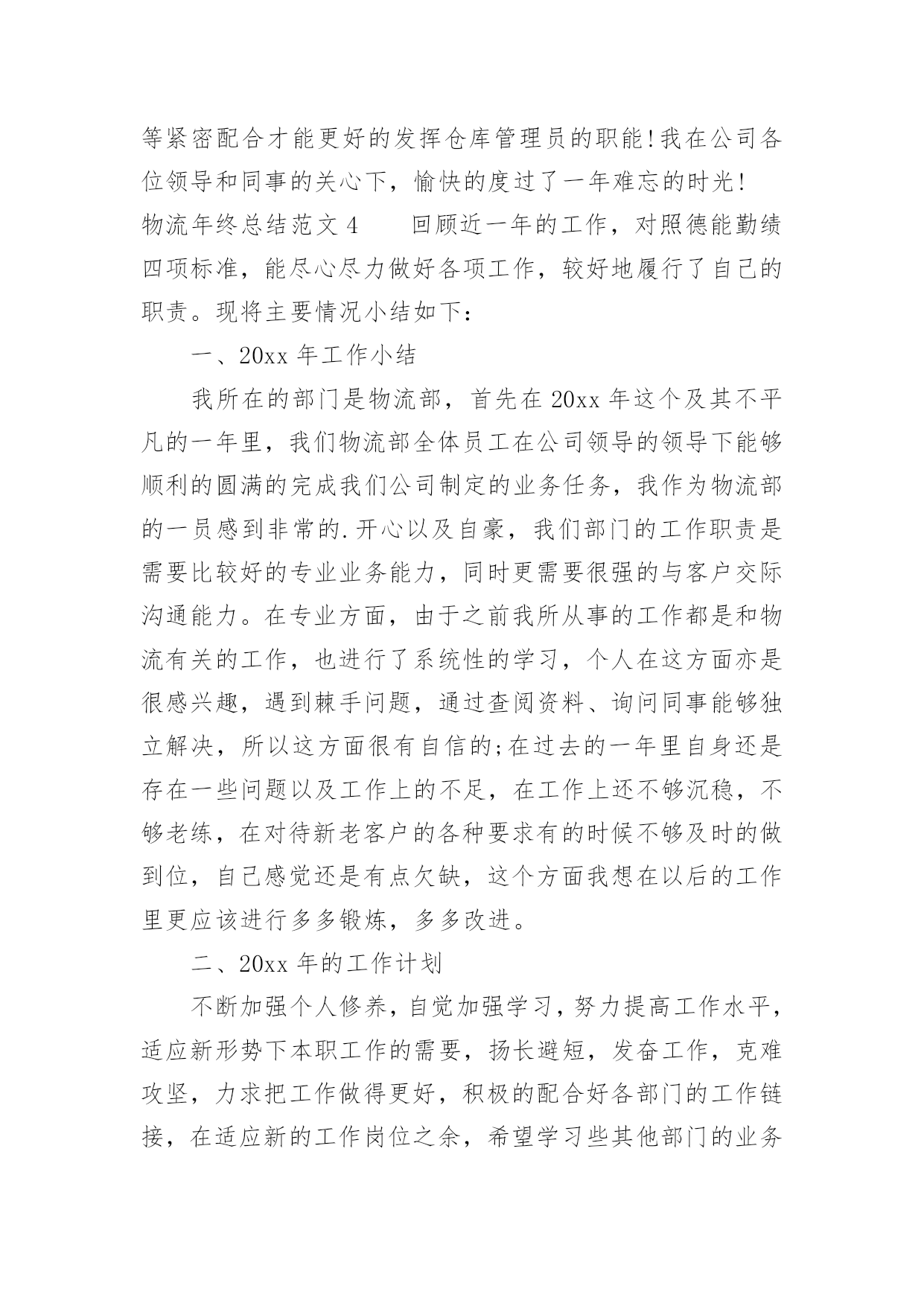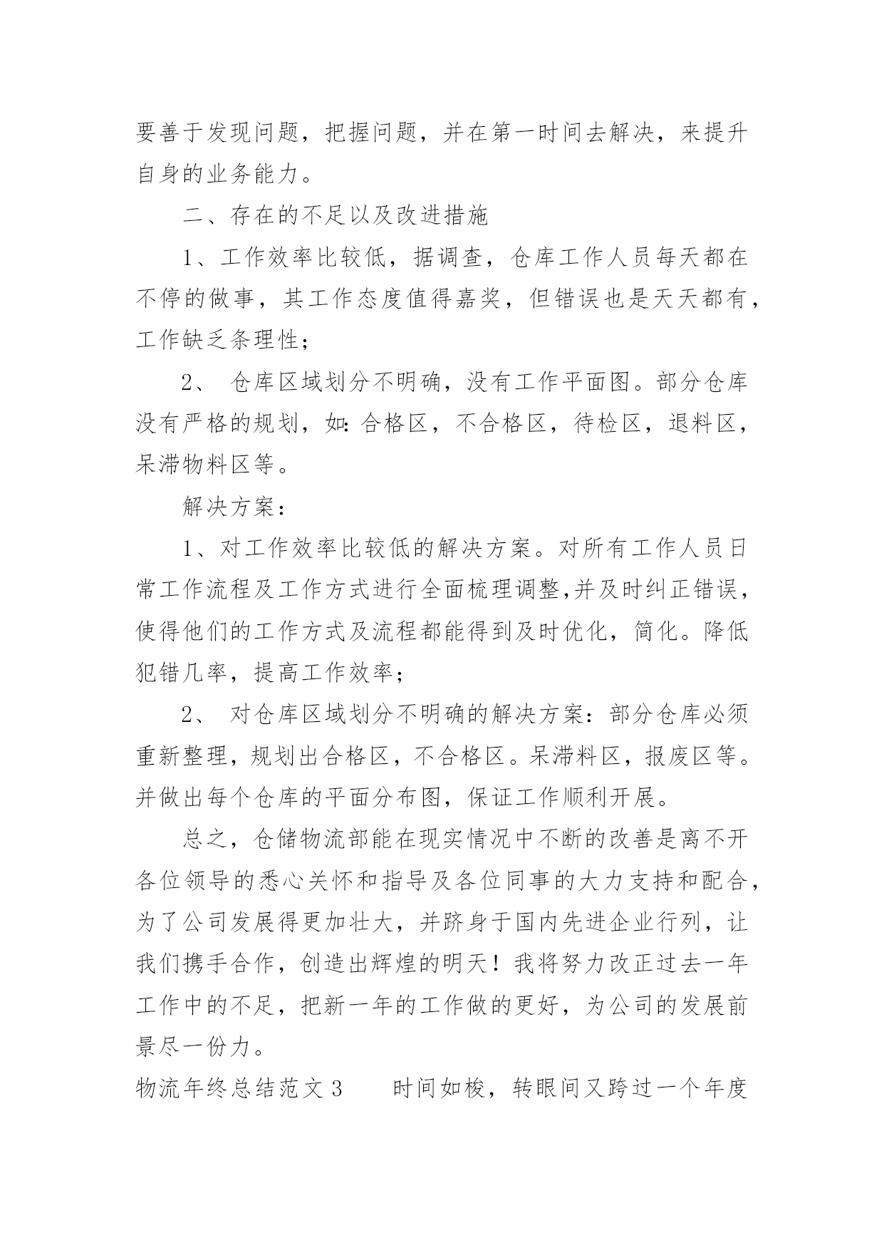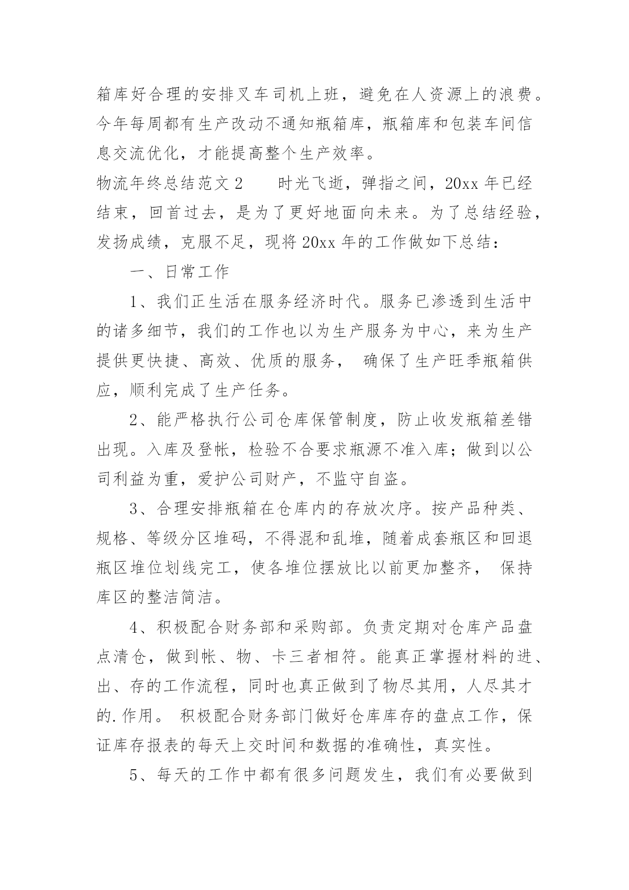 物流年终总结物流年终总结范文总结是在某一时期、某一项目或某些工作告一段落或者全部完成后进行回顾检查、分析评价,从而得出教训和一些规律性认识的一种书面材料,它可以帮助我们有寻找学习和工作中的规律,让我们来为自己写一份总结吧。那么我们该怎么去写总结呢?下面是小编收集整理的物流年终总结范文,仅供参考,欢迎大家阅读。物流年终总结范文1时光飞逝,弹指之间,20xx年已接近尾声,回首过去的一年,内心不禁感慨万千。时间如梭,又将跨过一个年度之坎。回首过去,是为了更好地面向未来。为了总结经验,发扬成绩,克服不足,现将20xx年的工作做如下简要总结:一、回首20xx1、我们正生活在服务经济时代。服务已渗透到生活中的诸多细节,每个人既是享受服务的“客户”,又是为“客户”提供服务的个体。正因如此,我们的工作也应该更完善以为生产服务为中心,来为生产提供更快捷、高效、优质的服务。实实在在做人做事,是我们秉承的理念,尽我们的全力去满足每一个生产细节的要求。确保了20xx年生产旺季瓶箱供应,顺利完成了生产任务。2、能严格执行公司仓库保管制度,防止收发瓶箱差错出现。入库及登帐,检验不合要求瓶源不准入库;做到以公司利益为重,爱护公司财产,不监守自盗。3、合理安排瓶箱在仓库内的存放次序。按产品种类、规格、等级分区堆码,不得混和乱堆,随着成套瓶区和回退瓶区堆位划线完工,使各堆位摆放比以前更加整齐,保持库区的整洁简洁。4、积极配合财务部和采购部。负责定期对仓库产品盘点清仓,做到帐、物、卡三者相符。能真正掌握材料的进、出、存的工作流程,同时也真正做到了物尽其用,人尽其才的作用。每天的工作中都有很多问题发生,我们有必要做到要善于发现问题,把握问题,并在第一时间去解决,来提升自身的业务能力。二、展望20xx在恪守以往取得的成绩和好的工作方法外,争取在20xx年能改善去年的不足,使工作再上一个新的台阶,特在此列出如下的仓库20xx年工作计划和工作目标。1、加强日常管理工作(1)按规定时间瓶箱进行盘点,及时核算出各生产班所使用瓶箱情况。在月终报表中通报给生产主管、及时指出各生产班存在浪费瓶子现象,积极配合各部门查找瓶损非正常损耗分析原因。杜绝后续再出现浪费现象。争取做到低成本高效益的管理理念。(2)在紧张的工作之余,加强团队建设,打造一个业务全面,工作热情高涨的团队。作为一个管理者,对下属充分做到发挥他们的主观能动性及工作积极性。提高团队的整体素质,树立起开拓创新、务实高效的.部门新形象。(3)作为基层管理者,我充分认识到自己既是一个管理者,更是一个执行者。要想真正把公司成本降低,除了对员工的合理安排调动外,还需要认真实在培训员工,首先要以身作则,这样才能让自己的下属有榜样看,大家都能够主动形成节约意识。2、在仓库管理及数据管理能力上提高(1)为提高物料的管理,对所有进出仓物料必须按仓库管理制度执行,对经销商严格把关回退瓶质量和数量。为确保采购部、生产部及销售部能及时了解瓶箱库存情况,对xx数据及库存日报表需要实时录入。确保在进出仓前查询并录入相关数据再收发料,确保数据的准确性与及时性。(2)加强对本部门职员的培训学习,真正掌握物料进、出、存的工作流程,使他们真正发挥技术骨干和模范带头作用,使物品能起到物流顺利周转,同时也真正做到物尽其用,人尽其才的作用,使其仓库管理工作得到有效的改进。(3)重新对仓库库位成套瓶放置进行更有效合理的规划,使成套瓶摆放更加整齐,盘点更加方便,塑造目视仓储管理。三、瓶箱库提出的建议车间生产延时和生产变动,应及时尽早通知瓶箱库,瓶箱库好合理的安排叉车司机上班,避免在人资源上的浪费。今年每周都有生产改动不通知瓶箱库,瓶箱库和包装车间信息交流优化,才能提高整个生产效率。物流年终总结范文2时光飞逝,弹指之间,20xx年已经结束,回首过去,是为了更好地面向未来。为了总结经验,发扬成绩,克服不足,现将20xx年的工作做如下总结:一、日常工作1、我们正生活在服务经济时代。服务已渗透到生活中的诸多细节,我们的工作也以为生产服务为中心,来为生产提供更快捷、高效、优质的服务,确保了生产旺季瓶箱供应,顺利完成了生产任务。2、能严格执行公司仓库保管制度,防止收发瓶箱差错出现。入库及登帐,检验不合要求瓶源不准入库;做到以公司利益为重,爱护公司财产,不监守自盗。3、合理安排瓶箱在仓库内的存放次序。按产品种类、规格、等级分区堆码,不得混和乱堆,随着成套瓶区和回退瓶区堆位划线完工,使各堆位摆放比以前更加整齐,保持库区的整洁简洁。4、积极配合财务部和采购部。负责定期对仓库产品盘点清仓,做到帐、物、卡三者相符。能真正掌握材料的进、出、存的工作流程,同时也真正做到了物尽其用,人尽其才的.作用。积极配合财务部门做好仓库库存的盘点工作,保证库存报表的每天上交时间和数据的准确性,真实性