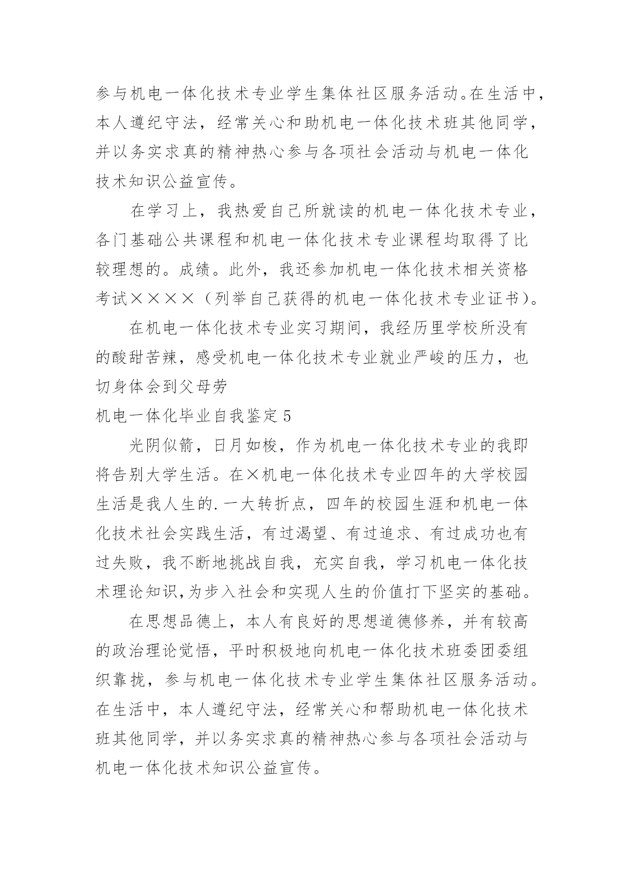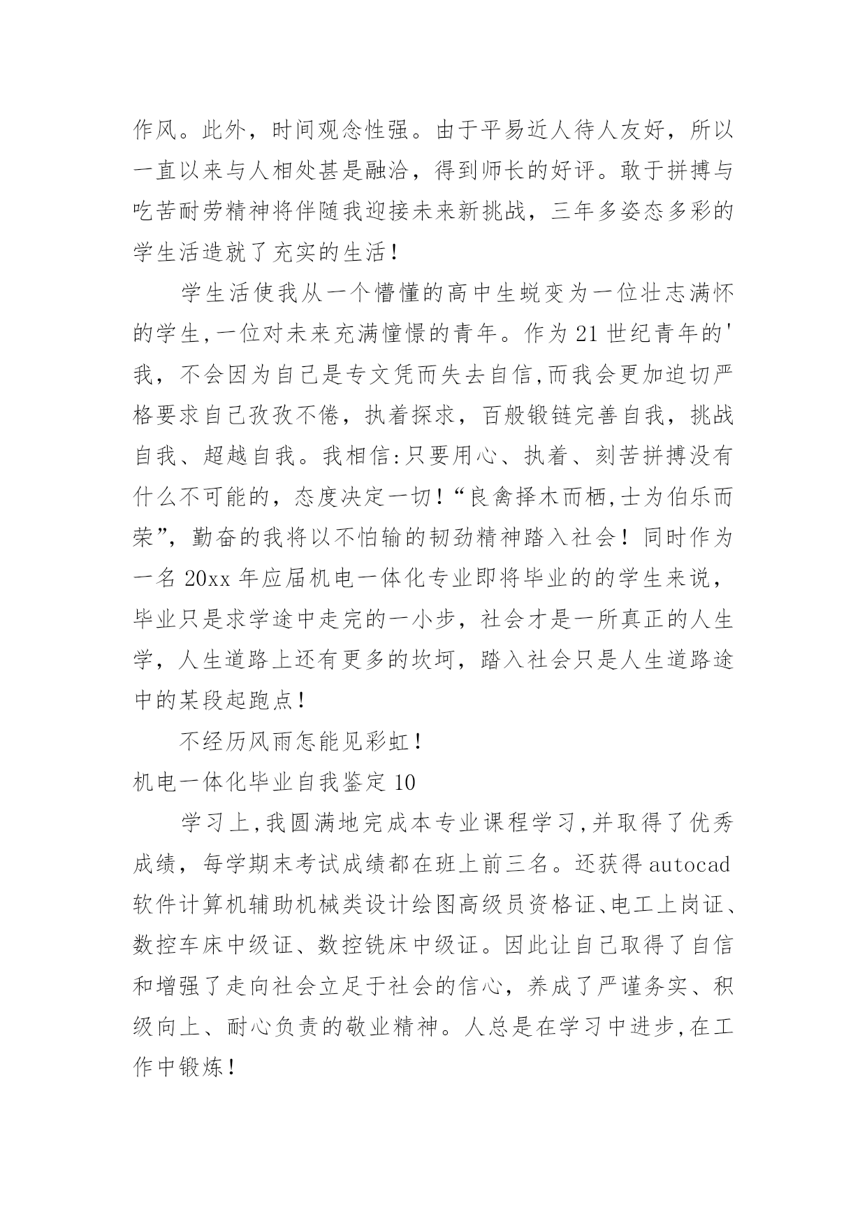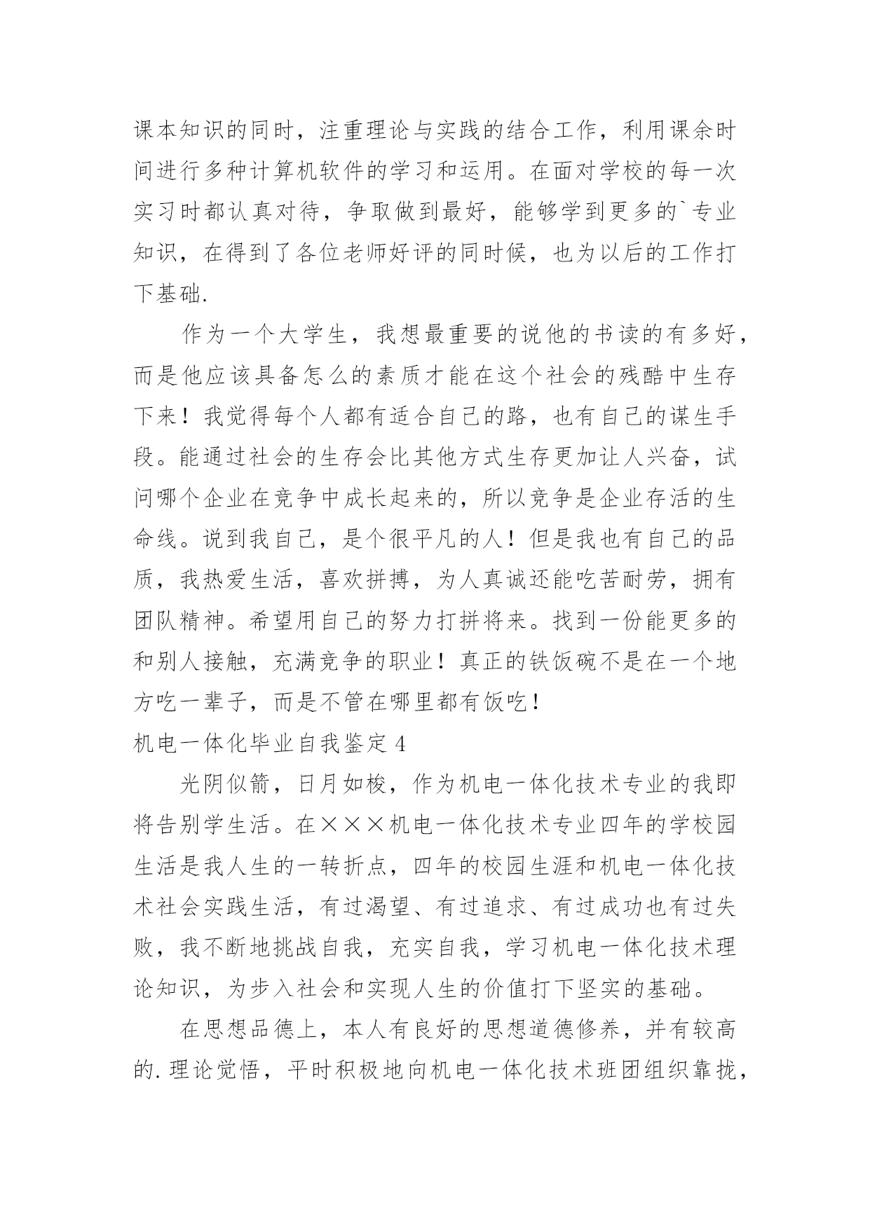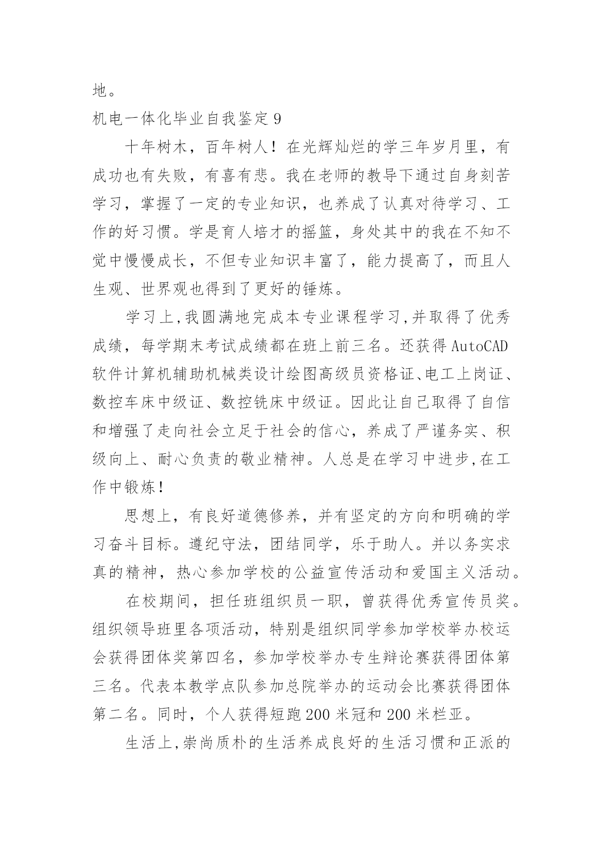 机电一体化毕业自我鉴机电一体化毕业自我鉴定自我鉴定是一个人在某个阶段的学习和工作生活等表现的一个自我总结,它是增长才干的一种好办法,不如静下心来好好写写自我鉴定吧。那么自我鉴定有什么格式呢?以下是小编收集整理的机电一体化毕业自我鉴定,欢迎大家分享。机电一体化毕业自我鉴定1学习上,我圆满地完成本专业课程学习,并取得了优秀成绩,每学期末考试成绩都在班上前三名。还获得AutoCAD软件计算机辅助机械类设计绘图高级员资格证、电工上岗证、数控车床中级证、数控铣床中级证。因此让自己取得了自信和增强了走向社会立足于社会的信心,养成了严谨务实、积级向上、耐心负责的敬业精神。人总是在学习中进步,在工作中锻炼!思想上,有良好道德修养,并有坚定的政治方向和明确的学习奋斗目标。遵纪守法,团结同学,乐于助人。并以务实求真的精神热心参与学校的.公益宣传活动和爱国主义活动。在校期间,担任班委组织委员一职,曾获得优秀宣传员奖。组织领导班里各项活动,特别是组织同学参加学校举办校运会获得团体奖第四名,参加学校举办大专生辩论赛获得团体第三名。代表本教学点队参加总院举办的运动会比赛获得团体第二名。同时,个人获得短跑200米冠军和200米栏亚军。生活上,崇尚质朴的生活养成良好的生活习惯和正派的作风。此外,时间观念性强。由于平易近人待人友好,所以一直以来与人相处甚是融洽,得到师长的好评。敢于拼搏与吃苦耐劳精神将伴随我迎接未来新挑战,三年多姿态多彩的大学生活造就了充实的生活!作为21世纪的新青年,不会因为自己是大专文凭而失去自信,反而我会更加迫切严格要求自己孜孜不倦,执着探求,百般锻炼来完善自我,挑战自我、超越自我。我相信:只要用心、执着、刻苦拼搏没有什么不可能的,态度决定一切!“良禽择木而栖,士为伯乐而荣”,勤奋的我将以不怕输的韧劲精神踏入社会!同时作为一名20xx年应届机电一体化专业即将毕业的的大学生来说,毕业只是求学途中走完的一小步,社会才是一所真正的人生大学,人生道路上还有更多的坎坷,踏入社会只是人生道路途中的某段起跑点!机电一体化毕业自我鉴定2我叫XXX,是xx机电一体化专业的应届毕业生,在求学的这两年半期间,我始终以提高自身的综合素养为目标,以自我的全面进展为努力方向,树立正确的人生观、价值观和世界观,刻苦学习,点滴积累,努力实践,渐渐把握了适应社会进展的.技能。有人说,读网络训练无非就是"混'一张文凭;然而,我深知人的一生是一个不断自我充实、自我完善的一生,读网络训练也是吸取学问、把握技能的好方法。因此,在这两年半的求同学涯里,我能保持"认仔细真做人,踏踏实实学习'的生活原则,乐观投入到学问这个浩瀚的海洋里,工学结合,纲举目张,不耻下问,珍惜时间,切切实实地学习各种学问。在两年半期间熟悉了很多同学和老师,建立起友情,并在与他们的交往中提升了自身素养,认清了自身的一些缺点并尽力改正。社会实践力量也有很大提高,为更好的工作奠定了坚实的基础。两年半的锤炼,筑就了我扎实的对待工作仔细负责,擅长沟通、协调有较强的组织力量与团队精神;活泼开朗、乐观上进、有爱心并擅长施教并行;在工作中,我将以更充足的精力,刻苦钻研的精神来努力工作,稳定地提高自己的工作力量,坚信在山东高校学习的学问在我的人生定有用武之地。机电一体化毕业自我鉴定3经过大学四年机电一体化专业课程的,谦虚自律的我,乐观向上、为人真诚、坦率,能吃苦耐劳具有团队合作精神,有较强的适应能力和自学能力,不易受外界环境的干扰,在上,我成绩良好,多次获得奖学金,通过课余时间学习参加自学考试(建筑工程),参加浙江省的计算机等级考试现已通过一级windows、二级(vb)、三级(网络技术)。在深透课本知识的同时,注重理论与实践的结合工作,利用课余时间进行多种计算机软件的学习和运用。在面对学校的每一次实习时都认真对待,争取做到最好,能够学到更多的`专业知识,在得到了各位老师好评的同时候,也为以后的工作打下基础.作为一个大学生,我想最重要的说他的书读的有多好,而是他应该具备怎么的素质才能在这个社会的残酷中生存下来!我觉得每个人都有适合自己的路,也有自己的谋生手段。能通过社会的生存会比其他方式生存更加让人兴奋,试问哪个企业在竞争中成长起来的,所以竞争是企业存活的生命线。说到我自己,是个很平凡的人!但是我也有自己的品质,我热爱生活,喜欢拼搏,为人真诚还能吃苦耐劳,拥有团队精神。希望用自己的努力打拼将来。找到一份能更多的和别人接触,充满竞争的职业!真正的铁饭碗不是在一个地方吃一辈子,而是不管在哪里都有饭吃!机电一体化毕业自我鉴定4光阴似箭,日月如梭,作为机电一体化技术专业的我即将告别学生活。在×××机电一体化技术专业四年的学校园生活是我人生的一转折点,四年的校园生涯和机电一体化技术社会实践生活,有过渴望、有过追求、有过成功也有过失败