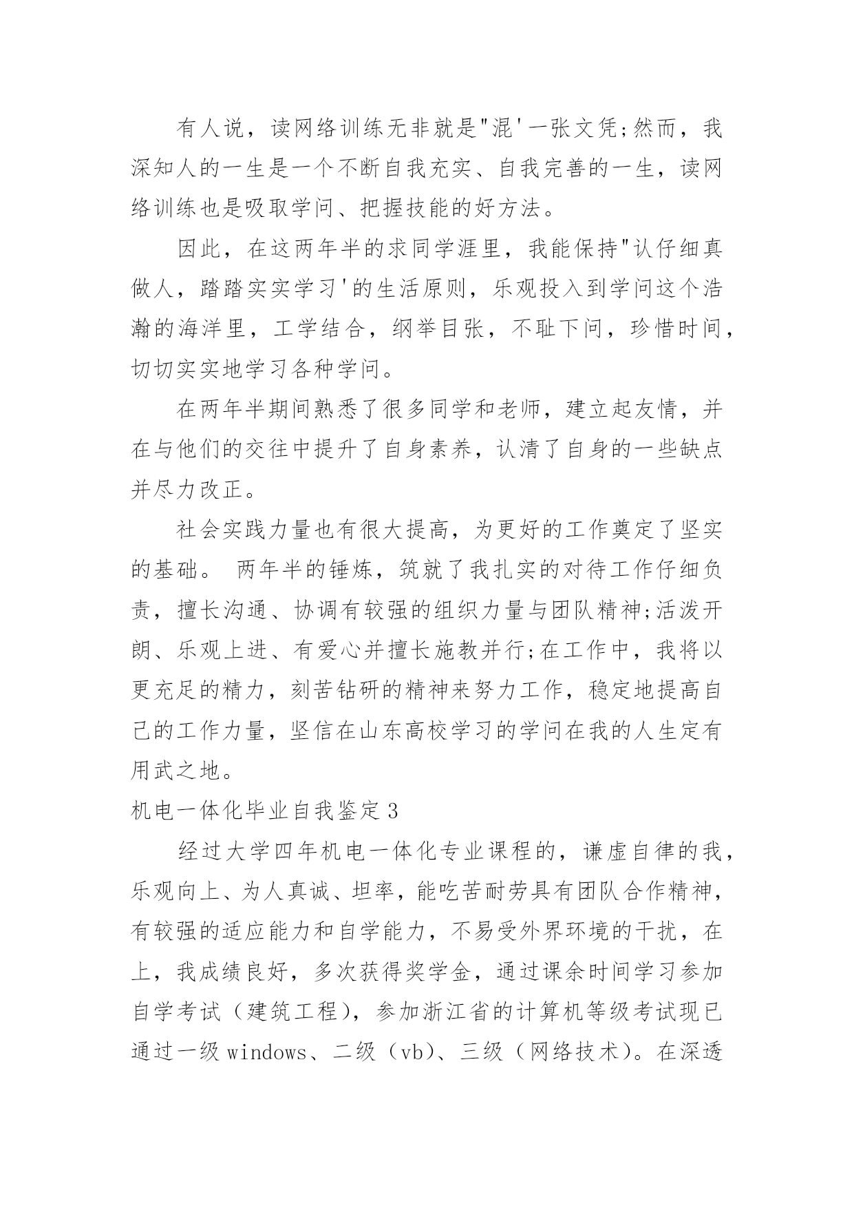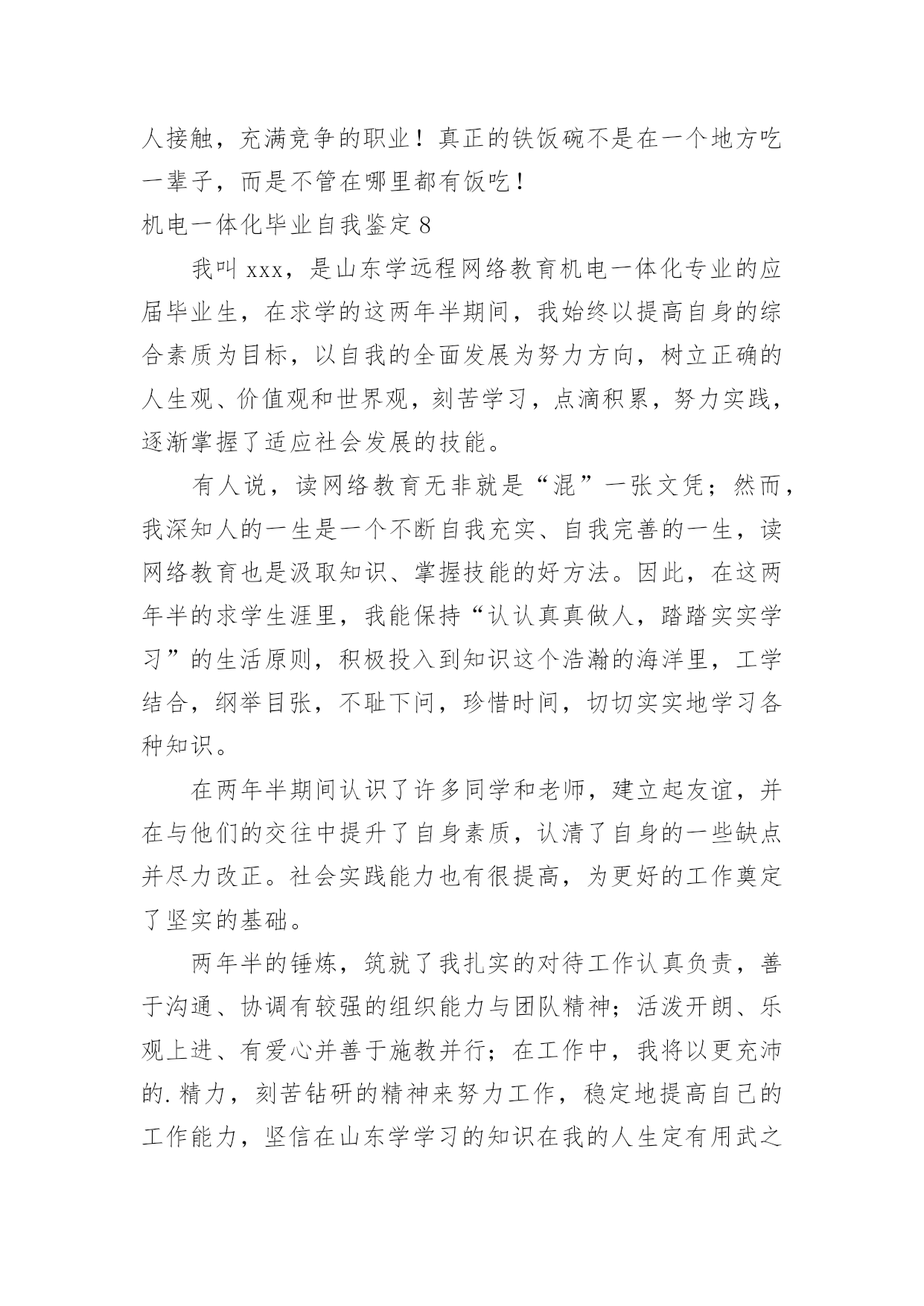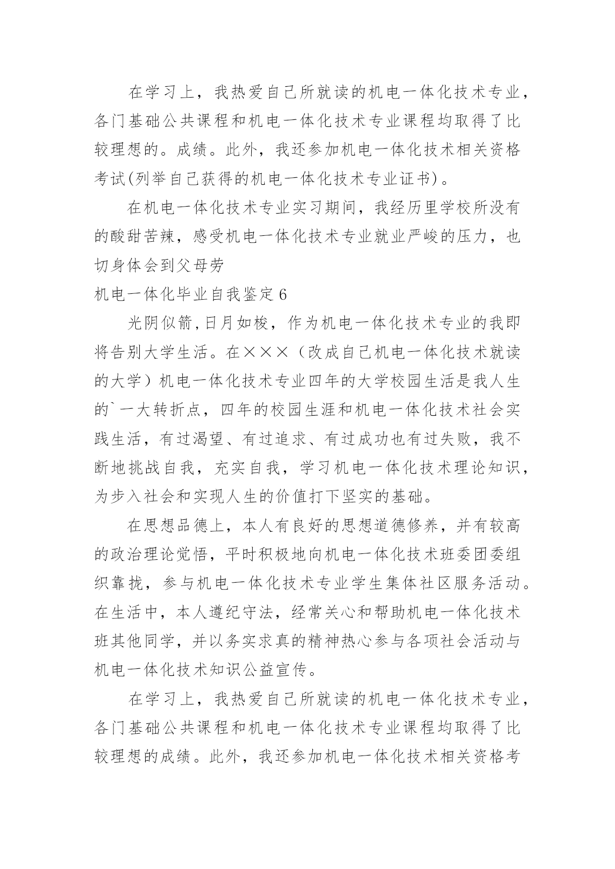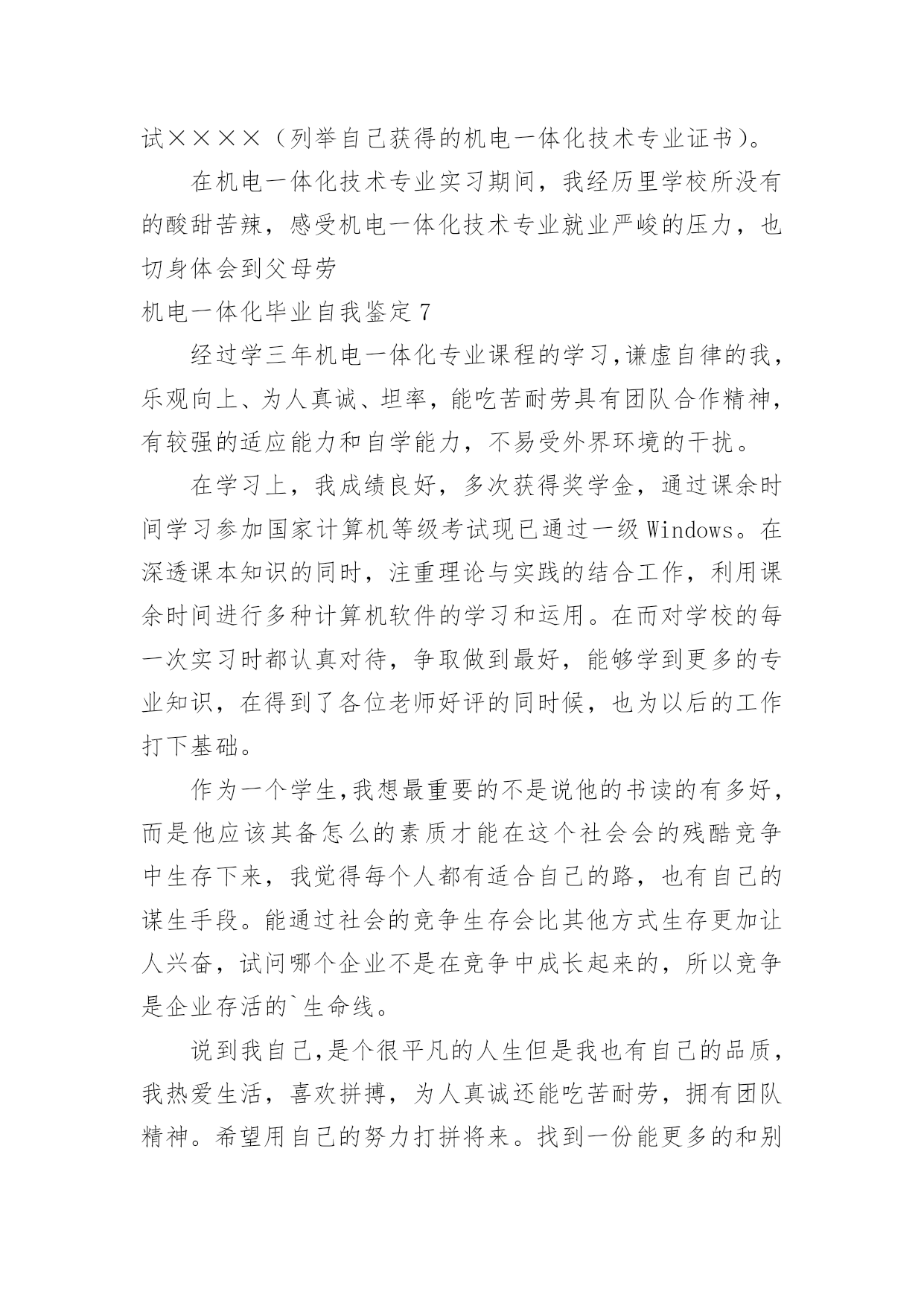机电一体化毕业自我鉴机电一体化毕业自我鉴定自我鉴定是一个人在某个阶段的学习和工作生活等表现的一个自我总结,它是增长才干的一种好办法,不如静下心来好好写写自我鉴定吧。那么自我鉴定有什么格式呢?以下是小编收集整理的机电一体化毕业自我鉴定,欢迎大家分享。机电一体化毕业自我鉴定1学习上,我圆满地完成本专业课程学习,并取得了优秀成绩,每学期末考试成绩都在班上前三名。还获得AutoCAD软件计算机辅助机械类设计绘图高级员资格证、电工上岗证、数控车床中级证、数控铣床中级证。因此让自己取得了自信和增强了走向社会立足于社会的信心,养成了严谨务实、积级向上、耐心负责的敬业精神。人总是在学习中进步,在工作中锻炼!思想上,有良好道德修养,并有坚定的政治方向和明确的学习奋斗目标。遵纪守法,团结同学,乐于助人。并以务实求真的精神热心参与学校的.公益宣传活动和爱国主义活动。在校期间,担任班委组织委员一职,曾获得优秀宣传员奖。组织领导班里各项活动,特别是组织同学参加学校举办校运会获得团体奖第四名,参加学校举办大专生辩论赛获得团体第三名。代表本教学点队参加总院举办的运动会比赛获得团体第二名。同时,个人获得短跑200米冠军和200米栏亚军。生活上,崇尚质朴的生活养成良好的生活习惯和正派的作风。此外,时间观念性强。由于平易近人待人友好,所以一直以来与人相处甚是融洽,得到师长的好评。敢于拼搏与吃苦耐劳精神将伴随我迎接未来新挑战,三年多姿态多彩的大学生活造就了充实的生活!作为21世纪的新青年,不会因为自己是大专文凭而失去自信,反而我会更加迫切严格要求自己孜孜不倦,执着探求,百般锻炼来完善自我,挑战自我、超越自我。我相信:只要用心、执着、刻苦拼搏没有什么不可能的,态度决定一切!“良禽择木而栖,士为伯乐而荣”,勤奋的我将以不怕输的韧劲精神踏入社会!同时作为一名20xx年应届机电一体化专业即将毕业的的大学生来说,毕业只是求学途中走完的一小步,社会才是一所真正的人生大学,人生道路上还有更多的坎坷,踏入社会只是人生道路途中的某段起跑点!机电一体化毕业自我鉴定2我叫XXX,是xx机电一体化专业的应届毕业生,在求学的这两年半期间,我始终以提高自身的综合素养为目标,以自我的全面进展为努力方向,树立正确的人生观、价值观和世界观,刻苦学习,点滴积累,努力实践,渐渐把握了适应社会进展的.技能。有人说,读网络训练无非就是"混'一张文凭;然而,我深知人的一生是一个不断自我充实、自我完善的一生,读网络训练也是吸取学问、把握技能的好方法。因此,在这两年半的求同学涯里,我能保持"认仔细真做人,踏踏实实学习'的生活原则,乐观投入到学问这个浩瀚的海洋里,工学结合,纲举目张,不耻下问,珍惜时间,切切实实地学习各种学问。在两年半期间熟悉了很多同学和老师,建立起友情,并在与他们的交往中提升了自身素养,认清了自身的一些缺点并尽力改正。社会实践力量也有很大提高,为更好的工作奠定了坚实的基础。两年半的锤炼,筑就了我扎实的对待工作仔细负责,擅长沟通、协调有较强的组织力量与团队精神;活泼开朗、乐观上进、有爱心并擅长施教并行;在工作中,我将以更充足的精力,刻苦钻研的精神来努力工作,稳定地提高自己的工作力量,坚信在山东高校学习的学问在我的人生定有用武之地。机电一体化毕业自我鉴定3经过大学四年机电一体化专业课程的,谦虚自律的我,乐观向上、为人真诚、坦率,能吃苦耐劳具有团队合作精神,有较强的适应能力和自学能力,不易受外界环境的干扰,在上,我成绩良好,多次获得奖学金,通过课余时间学习参加自学考试(建筑工程),参加浙江省的计算机等级考试现已通过一级windows、二级(vb)、三级(网络技术)。在深透课本知识的同时,注重理论与实践的结合工作,利用课余时间进行多种计算机软件的学习和运用。在面对学校的每一次实习时都认真对待,争取做到最好,能够学到更多的`专业知识,在得到了各位老师好评的同时候,也为以后的工作打下基础.作为一个大学生,我想最重要的说他的书读的有多好,而是他应该具备怎么的素质才能在这个社会的残酷中生存下来!我觉得每个人都有适合自己的路,也有自己的谋生手段。能通过社会的生存会比其他方式生存更加让人兴奋,试问哪个企业在竞争中成长起来的,所以竞争是企业存活的生命线。说到我自己,是个很平凡的人!但是我也有自己的品质,我热爱生活,喜欢拼搏,为人真诚还能吃苦耐劳,拥有团队精神。希望用自己的努力打拼将来。找到一份能更多的和别人接触,充满竞争的职业!真正的铁饭碗不是在一个地方吃一辈子,而是不管在哪里都有饭吃!机电一体化毕业自我鉴定4光阴似箭,日月如梭,作为机电一体化技术专业的我即将告别学生活。在×××机电一体化技术专业四年的学校园生活是我人生的一转折点,四年的校园生涯和机电一体化技术社会实践生活,有过渴望、有过追求、有过成功也有过失败