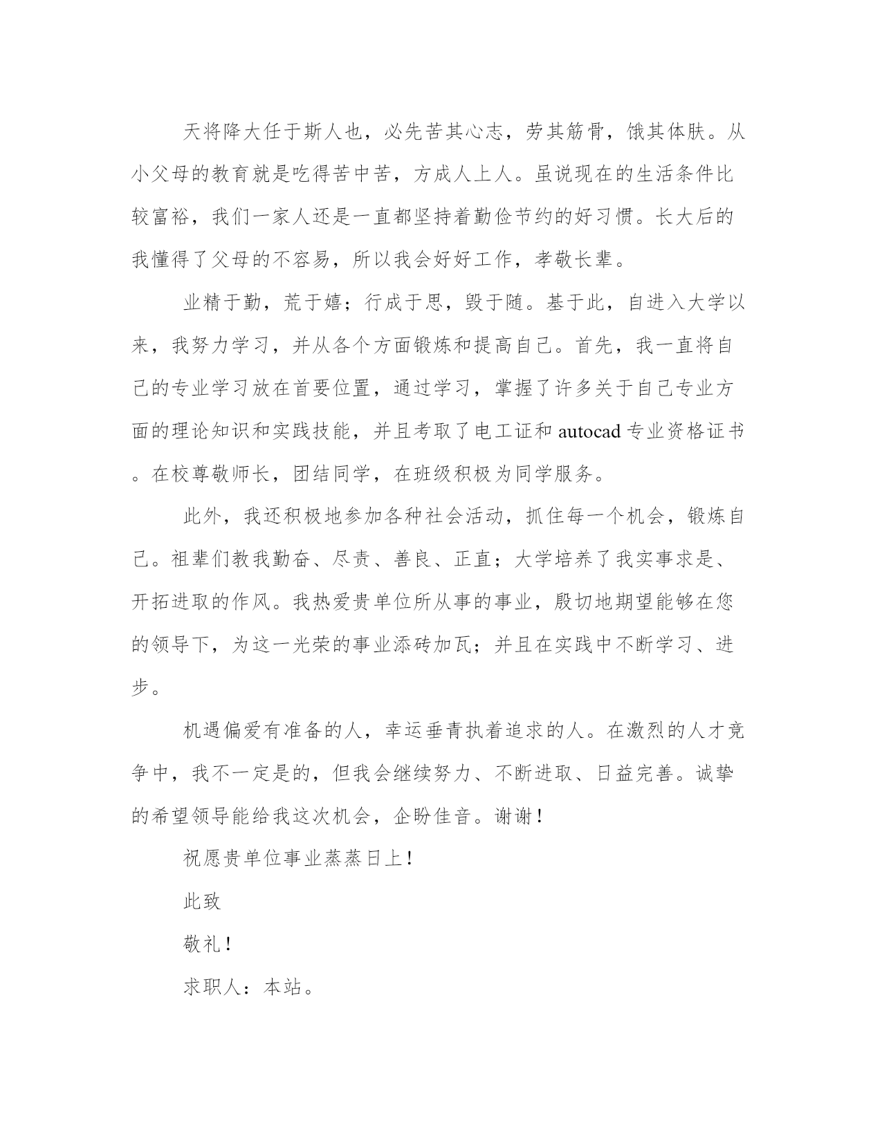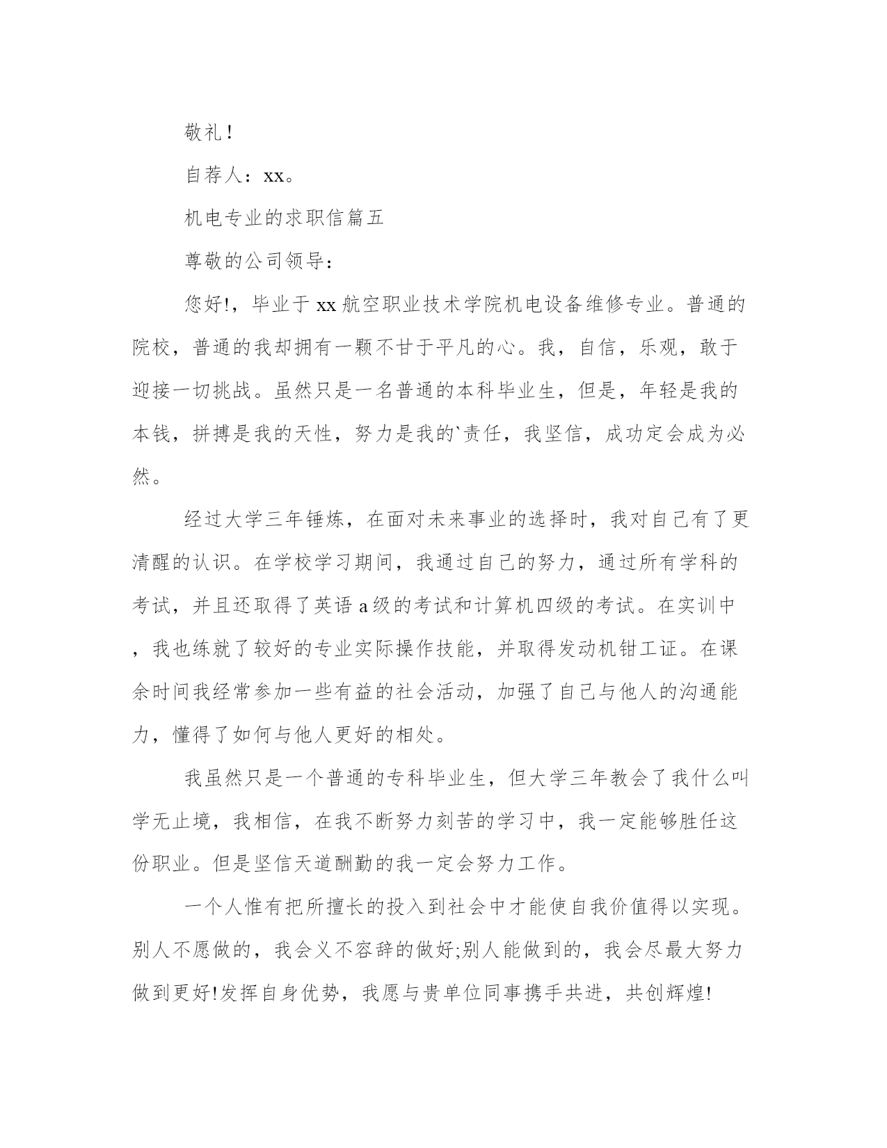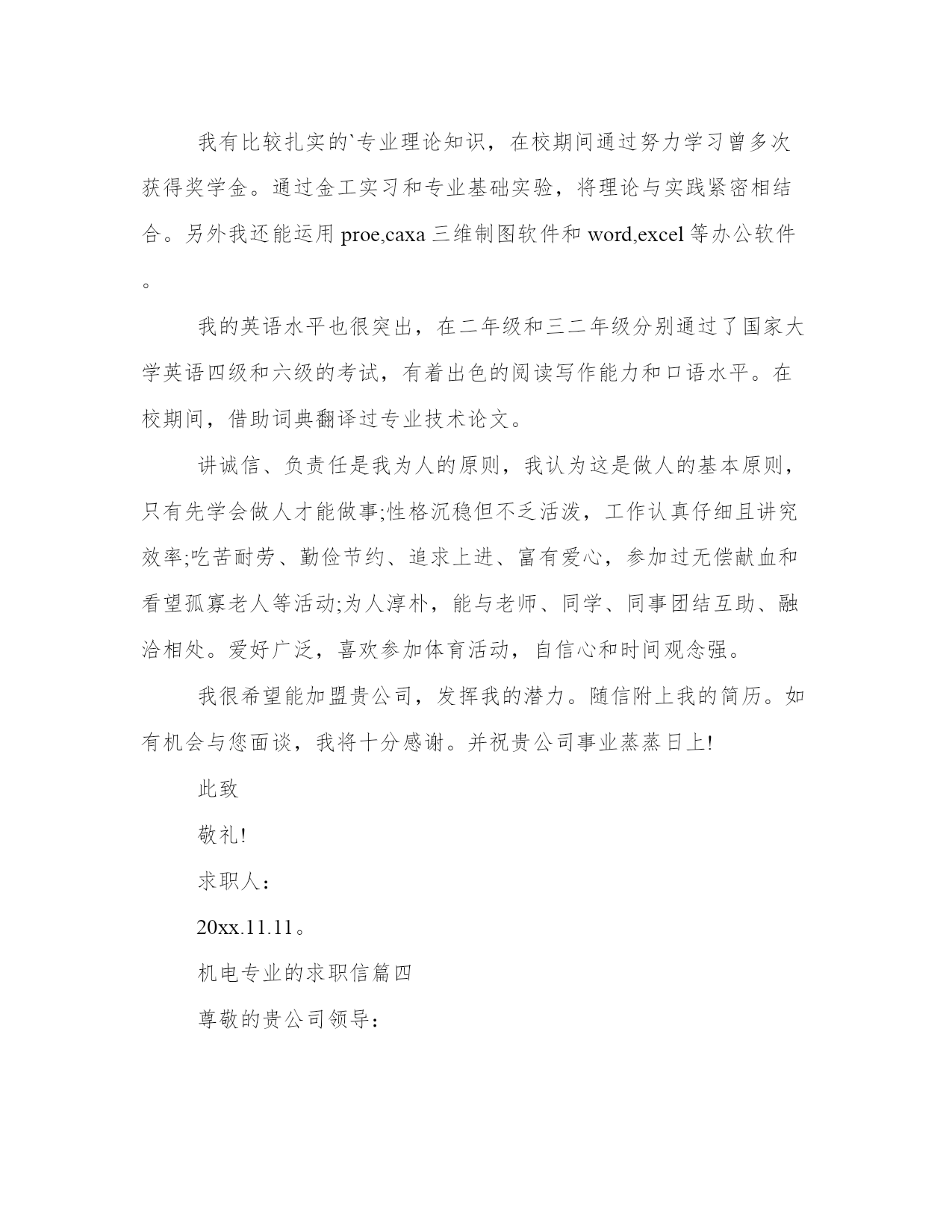 机电专业的求职信(实用8篇)在日常学习、工作或生活中,大家总少不了接触作文或者范文吧,通过文章可以把我们那些零零散散的思想,聚集在一块。那么我们该如何写一篇较为完美的范文呢?下面我给大家整理了一些优秀范文,希望能够帮助到大家,我们一起来看一看吧。机电专业的求职信篇一尊敬的领导:您好!请恕打扰.我是一名刚刚从生物学院机电系毕业的大学生.我很荣幸有机回向您呈上我的个人资料.在投身社会之际,为了找到符合自己专业和兴趣的工作,更好地发挥自己的才能,实现自己的人生价值,谨向各位领导作一自我推荐.现将自己的情况简要介绍如下:作为一名机电专业的大学生,我热爱我的专业并为其投入了巨大的热情和精力.在三年的学习生活中,我所学习的内容包括了从数控学的基础知识到运用等许多方面.通过对这些知识的学习,我对这一领域的相关知识有了一定程度的理解和掌握,此专业是一种工具,而利用此工具的能力是最重要的,在与课程同步进行的各种相关时践和实习中,具有了一定的实际操作能力和技术.在学校工作中,加强锻炼处世能力,学习管理知识,吸收管理经验.我正处于人生中精力充沛的时期,我渴望在更广阔的天地里展露自己的才能,我不满足与现有的知识水平,期望在实践中得到锻炼和提高,因此我希望能够加入你们的单位.我会踏踏实实的做好属于自己的一份工作,竭尽全力的在工作中取得好的成绩.我相信经过自己的勤奋和努力,一定会做出应有的贡献.刚谢您在百忙之中所给与我的关注,愿贵单位事业蒸蒸日上,屡创佳绩,祝您的事业白尺竿头,更进一步!希望各位领导能够对我予以考虑,我热切期盼你们的回音.谢谢!此致敬礼!求职人:本站。20xx年xx月xx日。尊敬的x公司领导:您好!首先感谢您在百忙之中阅览我的求职信。给一个即将毕业的大学生一个机会,在次我对此表示深深的感谢!我叫,男,23岁,xx学院机电一体化专业的一名应届毕业生。今天很荣幸能来到贵单位参加应聘,同时也希望自己能在贵单位找到一份满意的工作。下面根据自己的情况,特向贵单位作一番自我推荐。天将降大任于斯人也,必先苦其心志,劳其筋骨,饿其体肤。从小父母的教育就是吃得苦中苦,方成人上人。虽说现在的生活条件比较富裕,我们一家人还是一直都坚持着勤俭节约的好习惯。长大后的我懂得了父母的不容易,所以我会好好工作,孝敬长辈。业精于勤,荒于嬉;行成于思,毁于随。基于此,自进入大学以来,我努力学习,并从各个方面锻炼和提高自己。首先,我一直将自己的专业学习放在首要位置,通过学习,掌握了许多关于自己专业方面的理论知识和实践技能,并且考取了电工证和autocad专业资格证书。在校尊敬师长,团结同学,在班级积极为同学服务。此外,我还积极地参加各种社会活动,抓住每一个机会,锻炼自己。祖辈们教我勤奋、尽责、善良、正直;大学培养了我实事求是、开拓进取的作风。我热爱贵单位所从事的事业,殷切地期望能够在您的领导下,为这一光荣的事业添砖加瓦;并且在实践中不断学习、进步。机遇偏爱有准备的人,幸运垂青执着追求的人。在激烈的人才竞争中,我不一定是的,但我会继续努力、不断进取、日益完善。诚挚的希望领导能给我这次机会,企盼佳音。谢谢!祝愿贵单位事业蒸蒸日上!此致敬礼!求职人:本站。20xx年xx月xx日。尊敬的领导:您好!首先感谢您抽空垂阅我的求职信!希望这份求职信能帮贵公司找到一位有志青年,栋梁之材,也希望它能为我开启机遇与成功之门。我是xx科技学院机电专业一名应届毕业生。大学四年转眼即过,我满怀希望地走进社会这个更加博大的课堂。当今世界充满着竞争、充满着挑战,也充满了机遇。我希望能从贵公司得到一个机会、一个舞台,用我所学去服务公司,服务社会。大学期间,本着严谨求学的态度,在学习中我注重实际能力的培养,把专业知识与实践相结合,积极主动地参加各种社会活动,将我所学用于实践,不断增強自己的工作能力,为今后开展各项工作打下坚实的基础。在校期间主要学习电工原理、电子技术、电机学、自动控制原理、cad制图、矿山供电、plc与电气控制、单片机、微机原理、采矿技术、矿山固定机械与提升等。在计算机方面,我广泛地学习计算机软、硬件方面的知识,能熟练地运用windows98/20xx、office20xx、vf等软件,同时对internet有一定的了解,能够有效地利用互联网资源。在大学四年间的学习、生活使我培养了责任心和吃苦耐劳的精神,让我学到了很多知识,同时在在团队合作方面有了很大的提高,我以勤勉进取的积极态度,全方位地充实锻炼自己。怀着自信我向您推荐自己,如果有幸成为贵公司的一员,我愿从小事情做起,虚心尽责、勤奋工作,在实践中不断学习,发挥自己的主动性、创造性,竭力为公司的发展添一份光彩。最后,衷心的感谢您在百忙之中阅读我的求职信,祝愿贵单位事业蒸蒸日