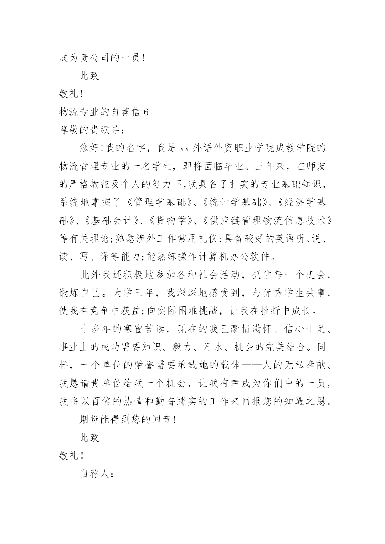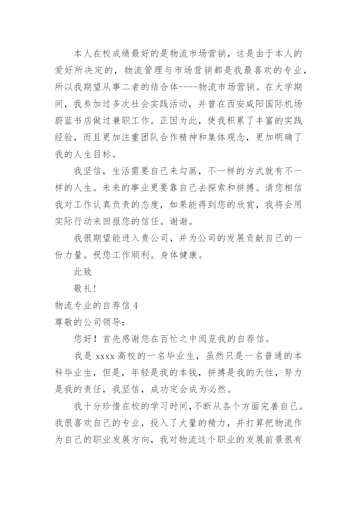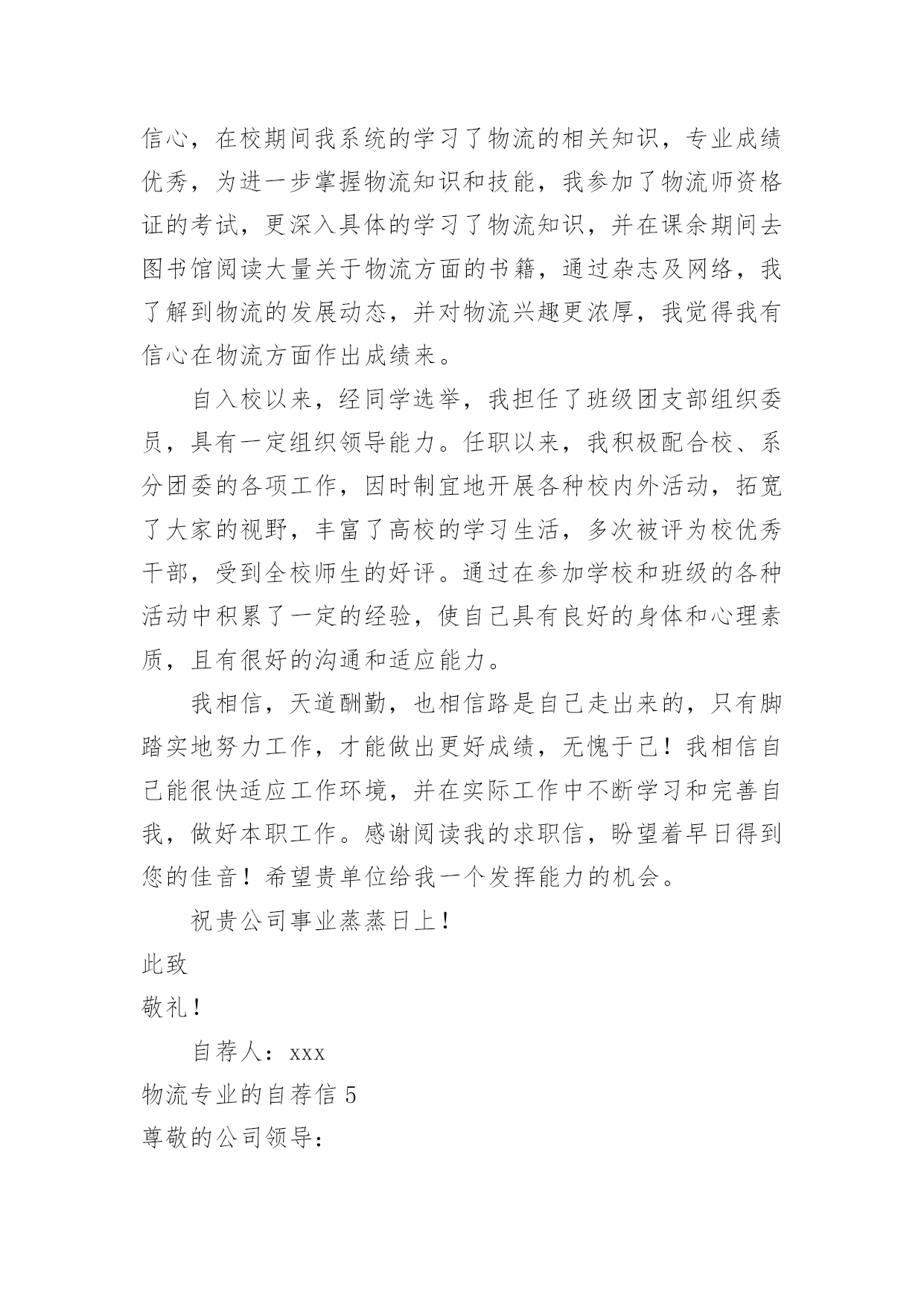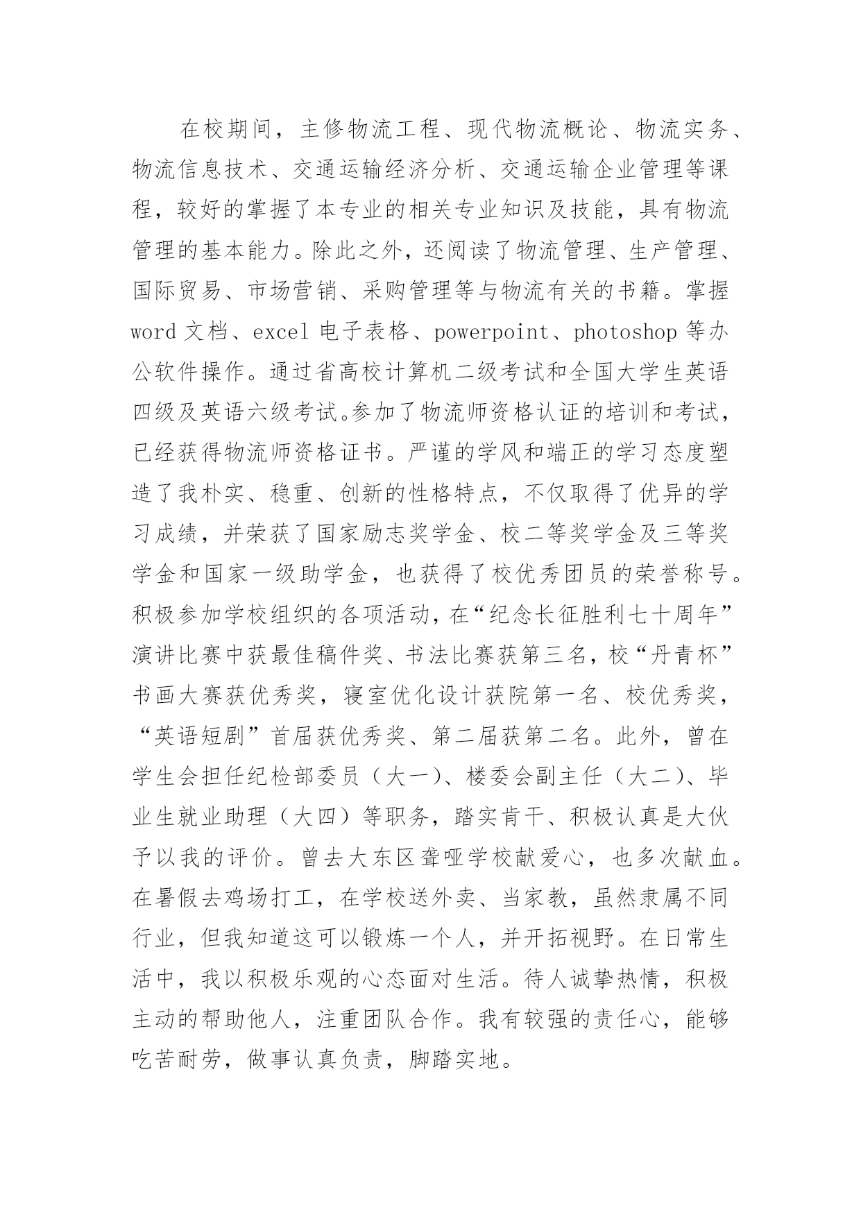 物流专业的自荐信物流专业的自荐信在当下这个社会中,我们都跟自荐信有着直接或间接的联系,自荐信根据用途的不同也有着不同的类型。那么,怎么去写自荐信呢?下面是小编为大家收集的物流专业的自荐信,欢迎阅读与收藏。物流专业的自荐信1尊敬的领导:您好!我xxx高校物流管理专业的一名应届毕业生。近期获知贵公司正在招聘人才,我自信能胜任这一职位,所以特意写了这封信。感谢您能在百忙中翻阅我的求职信。经过四年物流专业的学习,在师友的严格教益及个人的努力下,我具备了扎实的专业基础知识,系统地掌握了《管理学基础》、《统计学基础》、《经济学基础》、《基础会计》、《货物学》、《供应链管理物流信息技术》等有关理论;熟悉涉外工作常用礼仪;具备较好的英语听、说、读、写、译等能力;能熟练操作计算机办公软件。我熟练掌握与现代物流相关的知识。并于××年国家物流师职业资格证书。四年的高校校园和社会实践生活使我不断地挑战自我、开拓创新,为实现自身价值打下了坚实的基础。在校期间得到了老师和同学们的一致肯定。作为一名物流管理专业应届毕业生,我期望从一线职位做起,把所学到的专业知识,与实际工作情况相结合,快速积累最基础的工作经验,所以工作初期阶段,本人期望从事物流实际操作。本人在校成绩最好的是物流市场营销,这是由于本人的爱好所决定的,物流管理与市场营销都是我最喜欢的专业,所以我期望从事二者的结合体----物流市场营销。在高校期间,我参加过多次社会实践活动,并曾在多家公司做过兼职工作。正因为此,使我积累了丰富的实践经验,而且更加注重团队合作精神和集体观念,更加明确了我的人生目标。我坚信,生活需要自己来勾画,不一样的方式就有不一样的人生。未来的事业更要靠自己去探索和拼搏。请您相信我对工作认真负责的态度,如果能得到您的欣赏,我将会用实际行动来回报您的信任。谢谢。我很期望能进入贵公司,并为公司的发展贡献自己的一份力量。祝您工作顺利。身体健康。此致敬礼!求职人:×××××年××月物流专业的自荐信2尊敬的领导:您好!感谢您在百忙之中抽出宝贵的时间阅读我的自荐材料。我叫xxx,是xx农业大学工程学院交通运输专业物流方向的本科应届毕业生。在校期间,主修物流工程、现代物流概论、物流实务、物流信息技术、交通运输经济分析、交通运输企业管理等课程,较好的掌握了本专业的相关专业知识及技能,具有物流管理的基本能力。除此之外,还阅读了物流管理、生产管理、国际贸易、市场营销、采购管理等与物流有关的书籍。掌握word文档、excel电子表格、powerpoint、photoshop等办公软件操作。通过省高校计算机二级考试和全国大学生英语四级及英语六级考试。参加了物流师资格认证的培训和考试,已经获得物流师资格证书。严谨的学风和端正的学习态度塑造了我朴实、稳重、创新的性格特点,不仅取得了优异的学习成绩,并荣获了国家励志奖学金、校二等奖学金及三等奖学金和国家一级助学金,也获得了校优秀团员的荣誉称号。积极参加学校组织的各项活动,在“纪念长征胜利七十周年”演讲比赛中获最佳稿件奖、书法比赛获第三名,校“丹青杯”书画大赛获优秀奖,寝室优化设计获院第一名、校优秀奖,“英语短剧”首届获优秀奖、第二届获第二名。此外,曾在学生会担任纪检部委员(大一)、楼委会副主任(大二)、毕业生就业助理(大四)等职务,踏实肯干、积极认真是大伙予以我的评价。曾去大东区聋哑学校献爱心,也多次献血。在暑假去鸡场打工,在学校送外卖、当家教,虽然隶属不同行业,但我知道这可以锻炼一个人,并开拓视野。在日常生活中,我以积极乐观的心态面对生活。待人诚挚热情,积极主动的帮助他人,注重团队合作。我有较强的责任心,能够吃苦耐劳,做事认真负责,脚踏实地。我深知四年的时间是短暂的,所学的知识更是有限的,大学培养的仅仅是一种思维方式和学习方法,所以我期望贵公司能提供给我一个学习新知识并将从课本上学来的知识融于实践中的平台。我能够很快的适应工作环境,熟悉业务,并且在实际工作中不断学习,不断完善自己,做好本职工作。若我有幸成为贵公司的一员,我将全力与贵公司同事一起用我的智慧和热情奉献自己、共创辉煌。再次感谢您拨冗阅读我的自荐材料,期待您的反馈!并衷心祝愿贵公司事业蒸蒸日上,也祝您身体健康,工作顺利!此致敬礼!自荐人:xxx物流专业的自荐信3尊敬的领导:您好!我的名字叫hbrc,我陕西工业职业技术学院物流管理专业的一名hbrc。近期获知贵公司正在招聘人才,我自信能胜任这一职位,所以特意写了这封信。感谢您能在百忙中翻阅我的求职信。经过三年物流专业的学习。我熟练掌握与现代物流相关的知识。三年的大学校园和社会实践生活使我不断地挑战自我、开拓创新,为实现自身价值打下了坚实的基础。在校期间得到了老师和同学们的一致肯定。作为一名物流管理专业hbrc,我期望从一线职位做起,把所学到的专业知