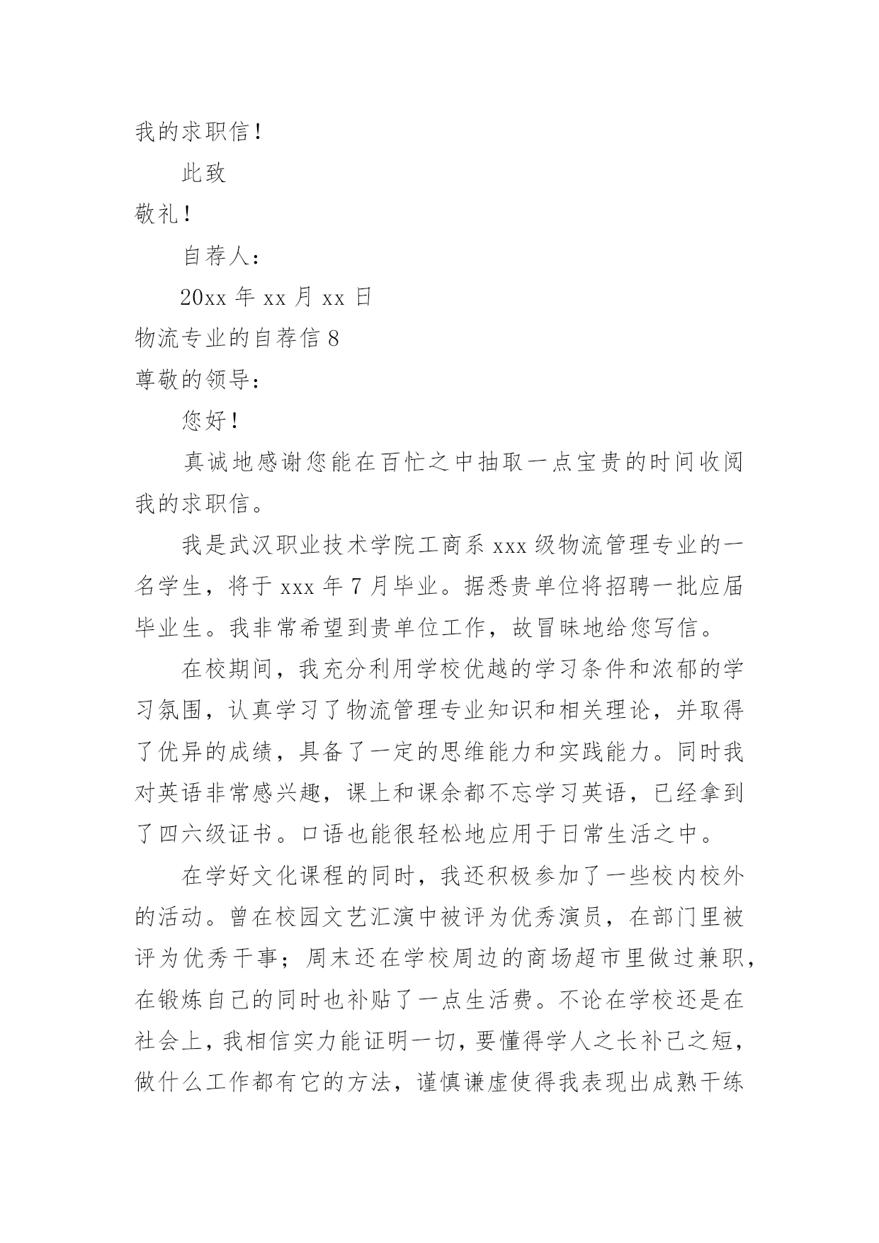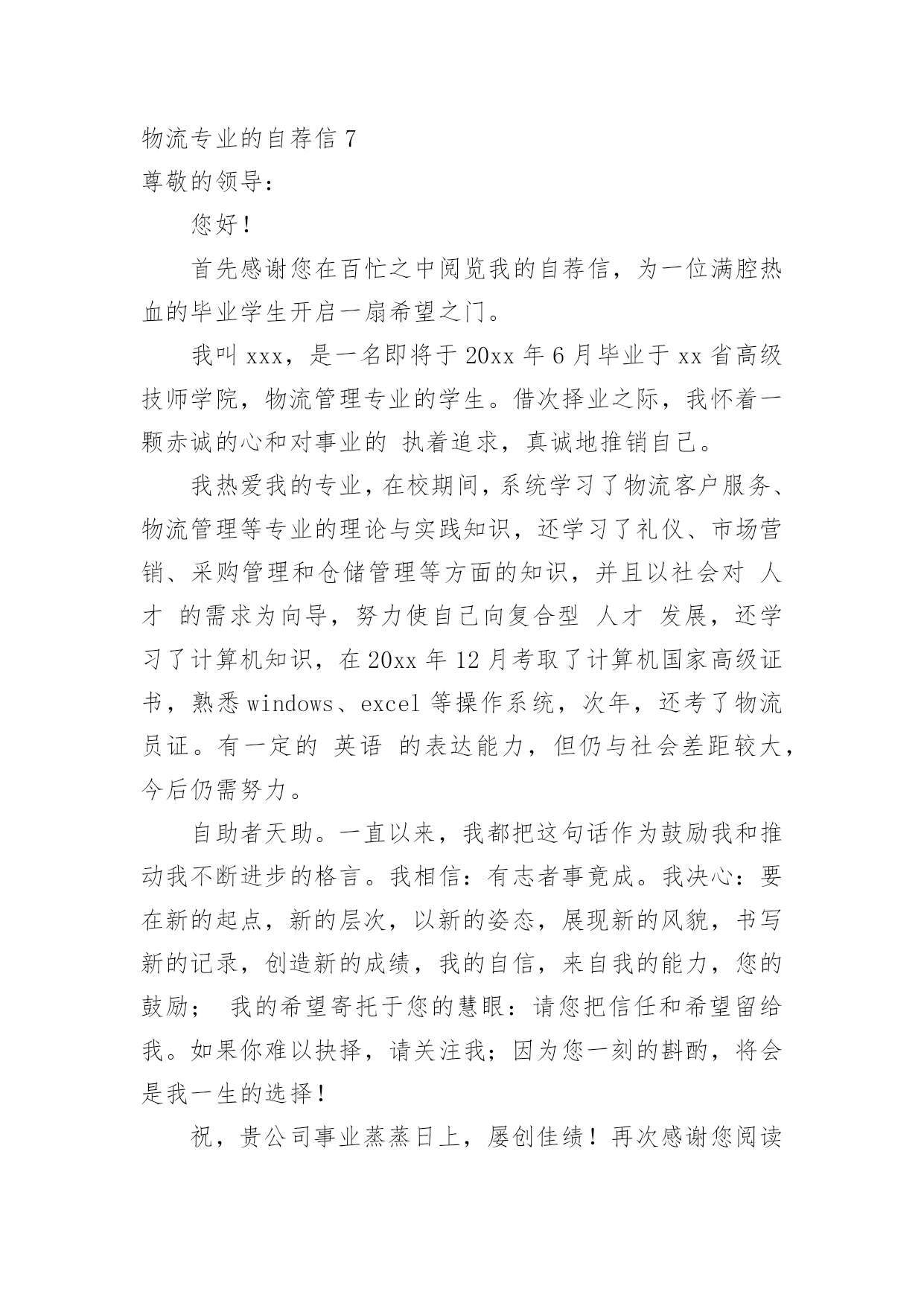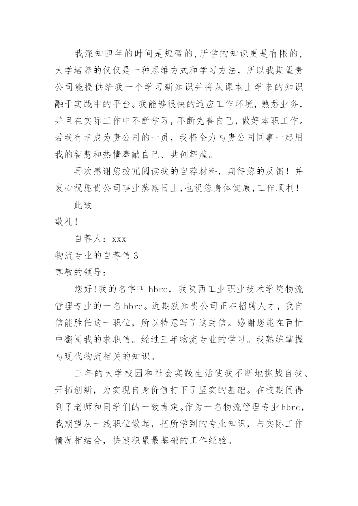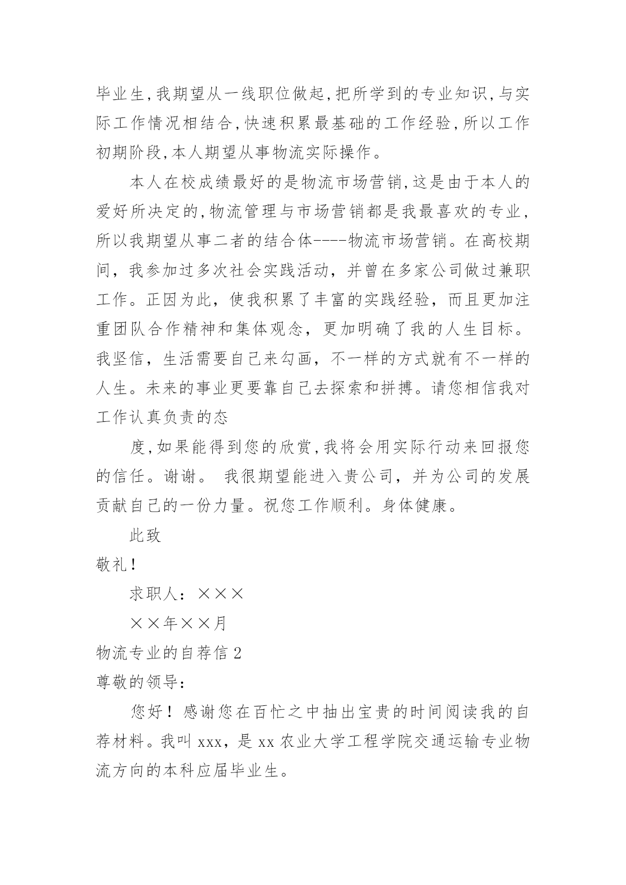物流专业的自荐信物流专业的自荐信在当下这个社会中,我们都跟自荐信有着直接或间接的联系,自荐信根据用途的不同也有着不同的类型。那么,怎么去写自荐信呢?下面是小编为大家收集的物流专业的自荐信,欢迎阅读与收藏。物流专业的自荐信1尊敬的领导:您好!我xxx高校物流管理专业的一名应届毕业生。近期获知贵公司正在招聘人才,我自信能胜任这一职位,所以特意写了这封信。感谢您能在百忙中翻阅我的求职信。经过四年物流专业的学习,在师友的严格教益及个人的努力下,我具备了扎实的专业基础知识,系统地掌握了《管理学基础》、《统计学基础》、《经济学基础》、《基础会计》、《货物学》、《供应链管理物流信息技术》等有关理论;熟悉涉外工作常用礼仪;具备较好的英语听、说、读、写、译等能力;能熟练操作计算机办公软件。我熟练掌握与现代物流相关的知识。并于××年国家物流师职业资格证书。四年的高校校园和社会实践生活使我不断地挑战自我、开拓创新,为实现自身价值打下了坚实的基础。在校期间得到了老师和同学们的一致肯定。作为一名物流管理专业应届毕业生,我期望从一线职位做起,把所学到的专业知识,与实际工作情况相结合,快速积累最基础的工作经验,所以工作初期阶段,本人期望从事物流实际操作。本人在校成绩最好的是物流市场营销,这是由于本人的爱好所决定的,物流管理与市场营销都是我最喜欢的专业,所以我期望从事二者的结合体----物流市场营销。在高校期间,我参加过多次社会实践活动,并曾在多家公司做过兼职工作。正因为此,使我积累了丰富的实践经验,而且更加注重团队合作精神和集体观念,更加明确了我的人生目标。我坚信,生活需要自己来勾画,不一样的方式就有不一样的人生。未来的事业更要靠自己去探索和拼搏。请您相信我对工作认真负责的态度,如果能得到您的欣赏,我将会用实际行动来回报您的信任。谢谢。我很期望能进入贵公司,并为公司的发展贡献自己的一份力量。祝您工作顺利。身体健康。此致敬礼!求职人:×××××年××月物流专业的自荐信2尊敬的领导:您好!感谢您在百忙之中抽出宝贵的时间阅读我的自荐材料。我叫xxx,是xx农业大学工程学院交通运输专业物流方向的本科应届毕业生。在校期间,主修物流工程、现代物流概论、物流实务、物流信息技术、交通运输经济分析、交通运输企业管理等课程,较好的掌握了本专业的相关专业知识及技能,具有物流管理的基本能力。除此之外,还阅读了物流管理、生产管理、国际贸易、市场营销、采购管理等与物流有关的书籍。掌握word文档、excel电子表格、powerpoint、photoshop等办公软件操作。通过省高校计算机二级考试和全国大学生英语四级及英语六级考试。参加了物流师资格认证的培训和考试,已经获得物流师资格证书。严谨的学风和端正的学习态度塑造了我朴实、稳重、创新的性格特点,不仅取得了优异的学习成绩,并荣获了国家励志奖学金、校二等奖学金及三等奖学金和国家一级助学金,也获得了校优秀团员的荣誉称号。积极参加学校组织的各项活动,在“纪念长征胜利七十周年”演讲比赛中获最佳稿件奖、书法比赛获第三名,校“丹青杯”书画大赛获优秀奖,寝室优化设计获院第一名、校优秀奖,“英语短剧”首届获优秀奖、第二届获第二名。此外,曾在学生会担任纪检部委员(大一)、楼委会副主任(大二)、毕业生就业助理(大四)等职务,踏实肯干、积极认真是大伙予以我的评价。曾去大东区聋哑学校献爱心,也多次献血。在暑假去鸡场打工,在学校送外卖、当家教,虽然隶属不同行业,但我知道这可以锻炼一个人,并开拓视野。在日常生活中,我以积极乐观的心态面对生活。待人诚挚热情,积极主动的帮助他人,注重团队合作。我有较强的责任心,能够吃苦耐劳,做事认真负责,脚踏实地。我深知四年的时间是短暂的,所学的知识更是有限的,大学培养的仅仅是一种思维方式和学习方法,所以我期望贵公司能提供给我一个学习新知识并将从课本上学来的知识融于实践中的平台。我能够很快的适应工作环境,熟悉业务,并且在实际工作中不断学习,不断完善自己,做好本职工作。若我有幸成为贵公司的一员,我将全力与贵公司同事一起用我的智慧和热情奉献自己、共创辉煌。再次感谢您拨冗阅读我的自荐材料,期待您的反馈!并衷心祝愿贵公司事业蒸蒸日上,也祝您身体健康,工作顺利!此致敬礼!自荐人:xxx物流专业的自荐信3尊敬的领导:您好!我的名字叫hbrc,我陕西工业职业技术学院物流管理专业的一名hbrc。近期获知贵公司正在招聘人才,我自信能胜任这一职位,所以特意写了这封信。感谢您能在百忙中翻阅我的求职信。经过三年物流专业的学习。我熟练掌握与现代物流相关的知识。三年的大学校园和社会实践生活使我不断地挑战自我、开拓创新,为实现自身价值打下了坚实的基础。在校期间得到了老师和同学们的一致肯定。作为一名物流管理专业hbrc,我期望从一线职位做起,把所学到的专业知